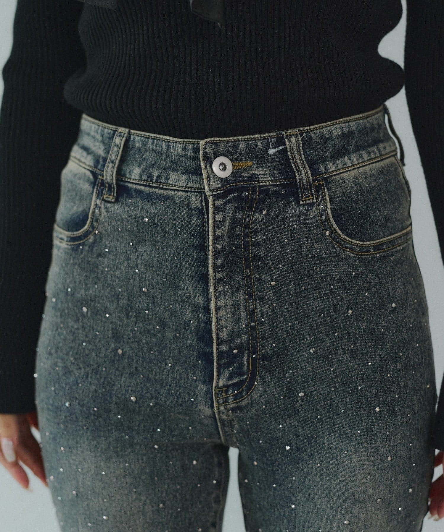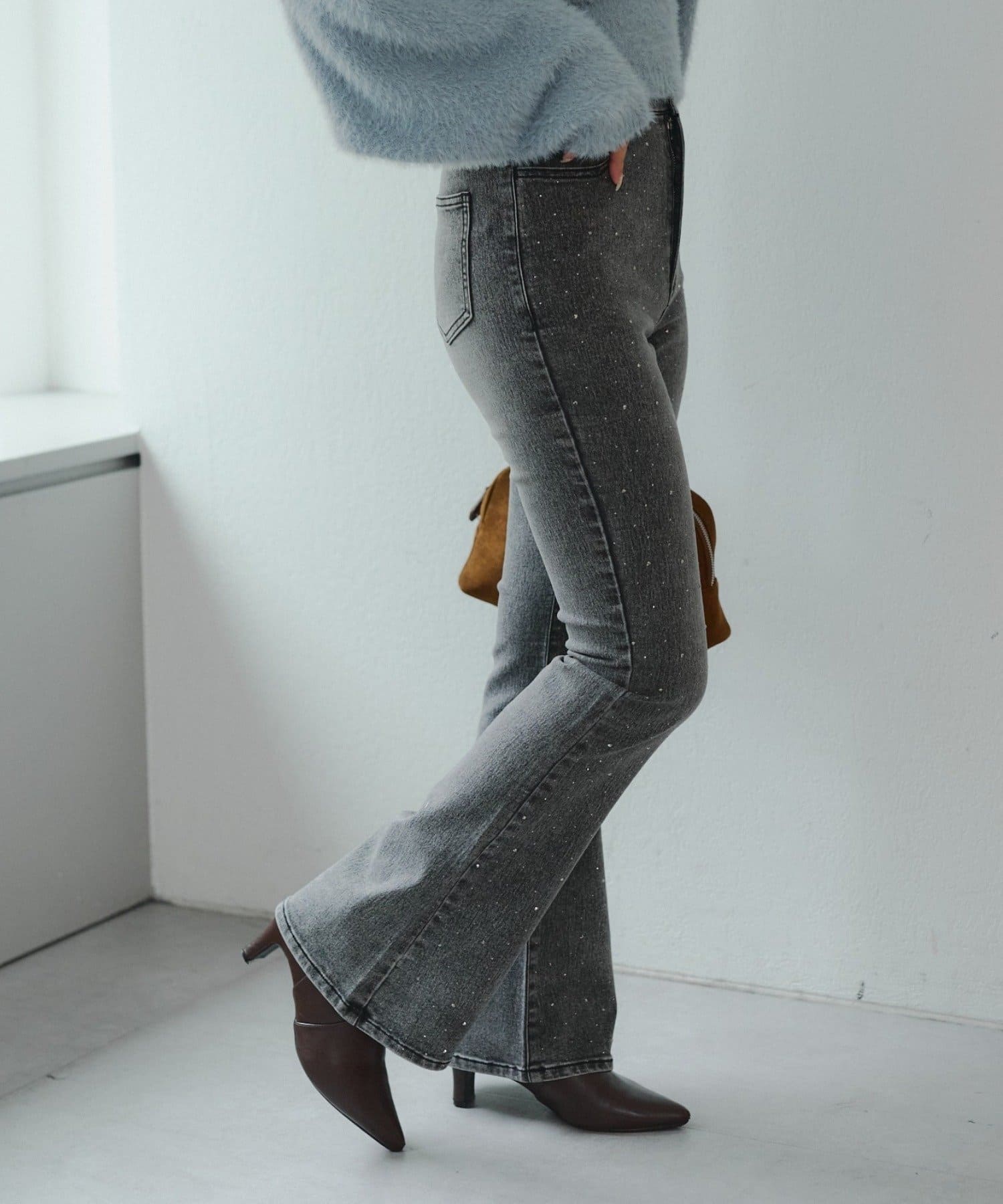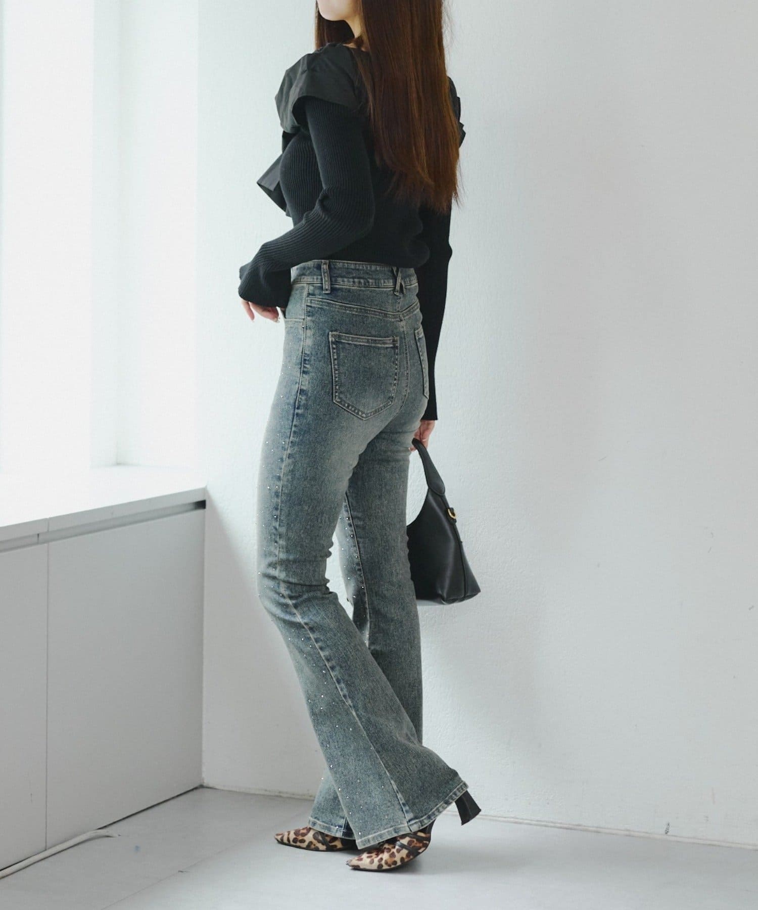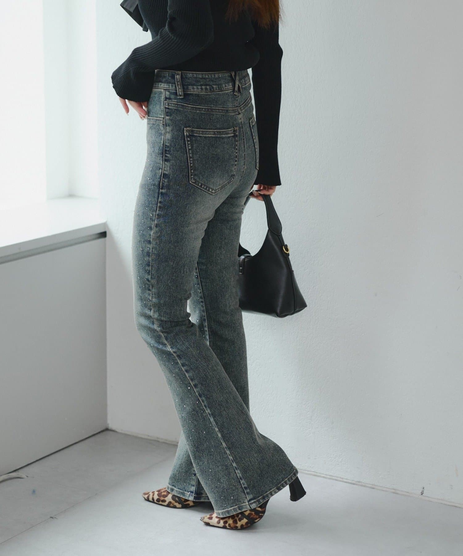 キラキラのビジューが散りばめられたトレンドのセミフレアデニム