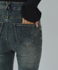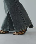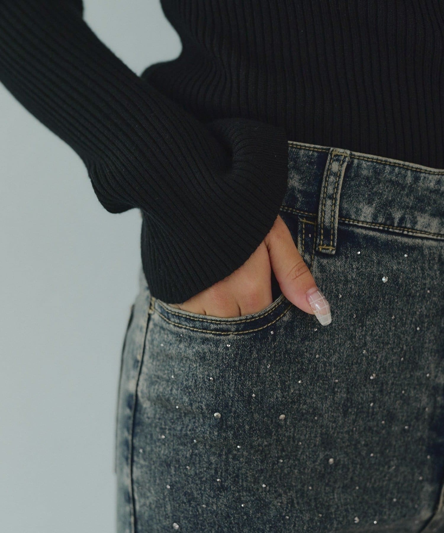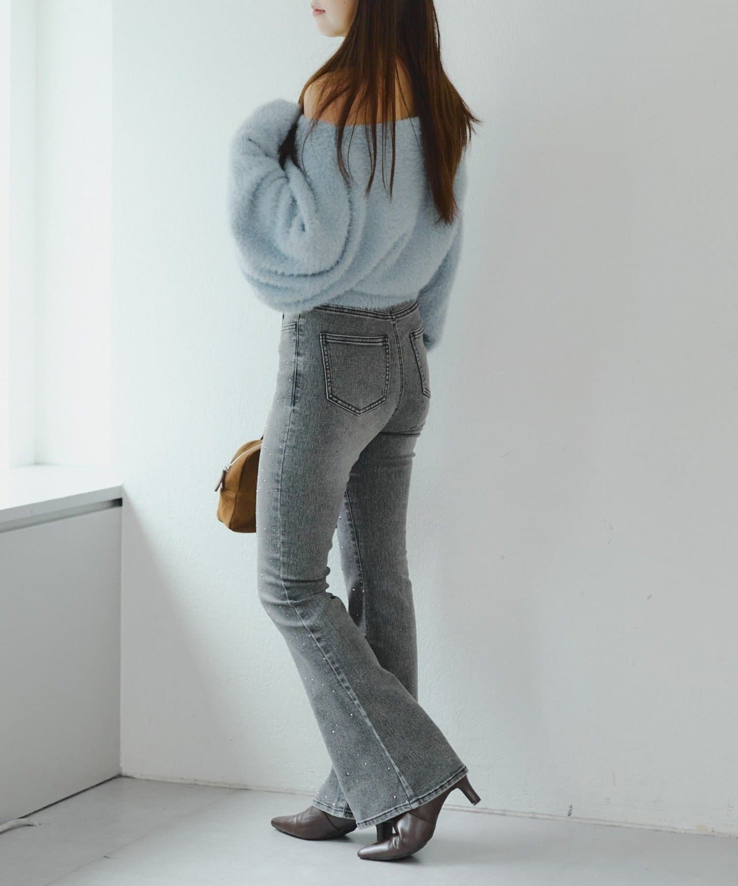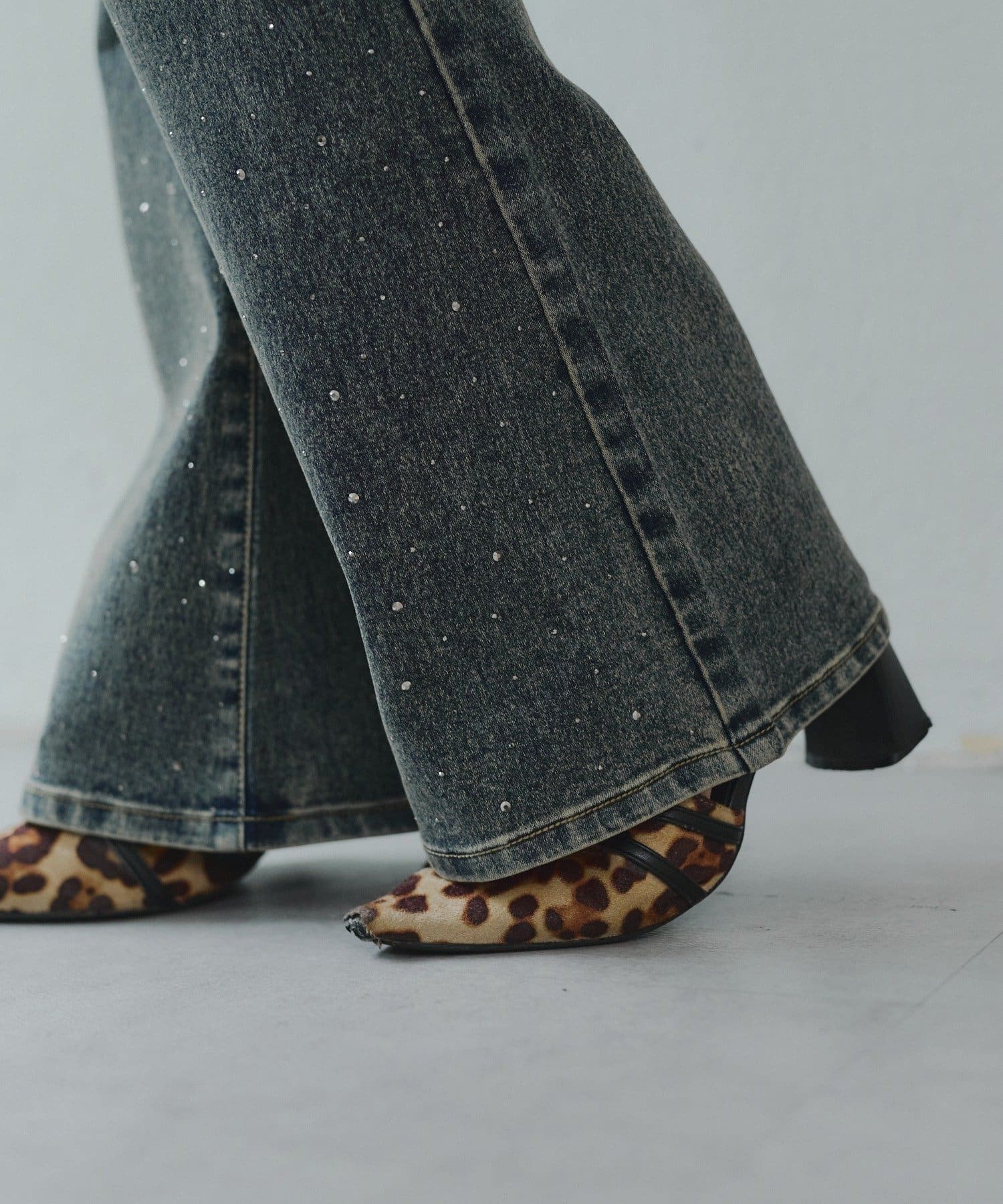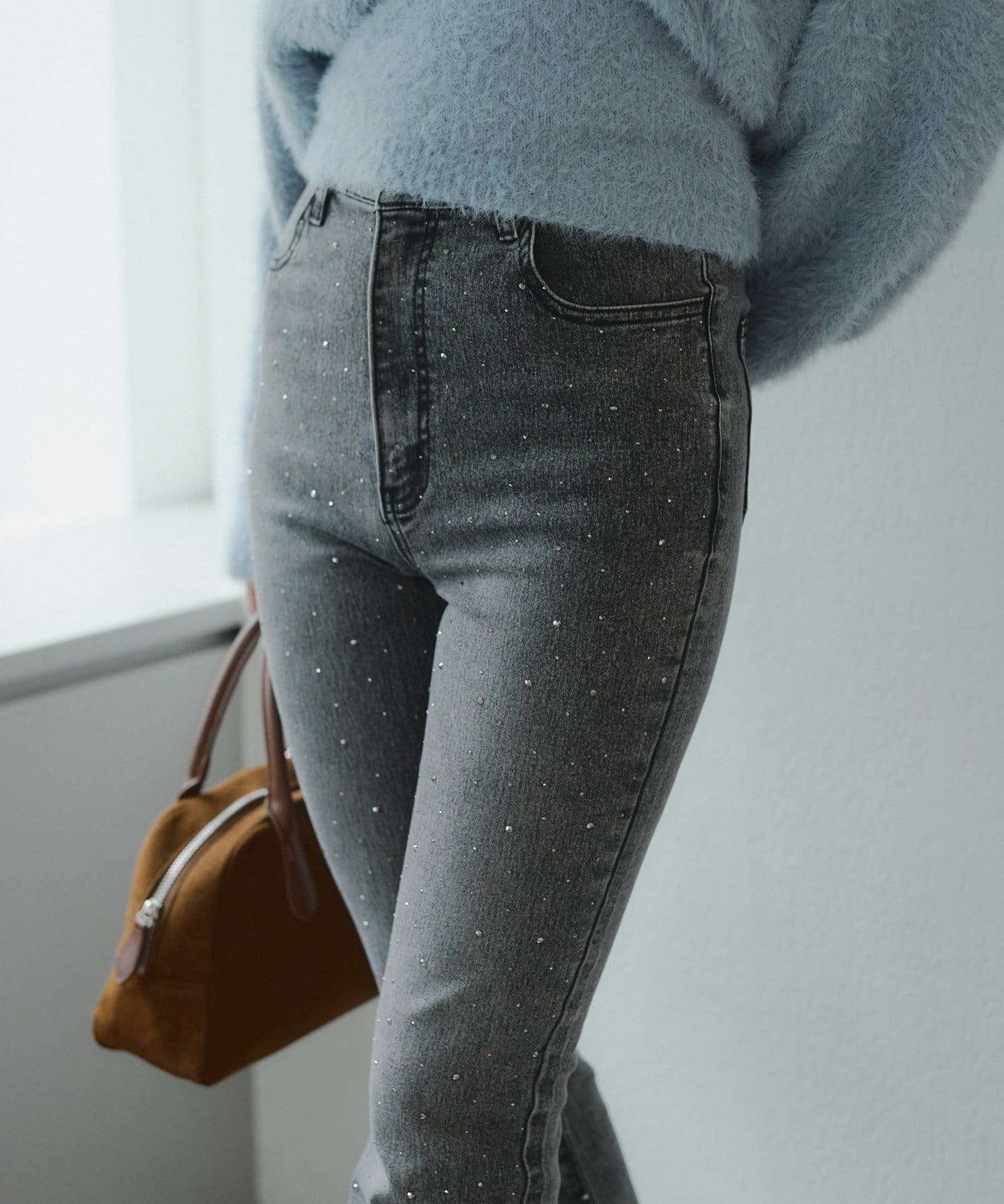 キラキラのビジューが散りばめられたトレンドのセミフレアデニム