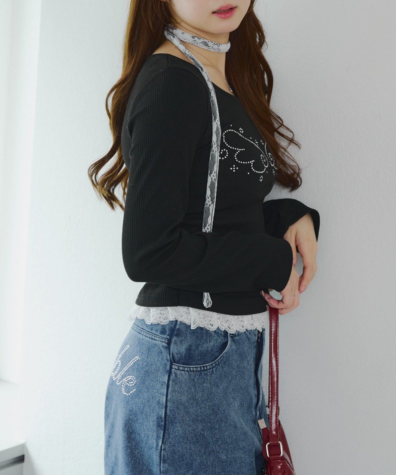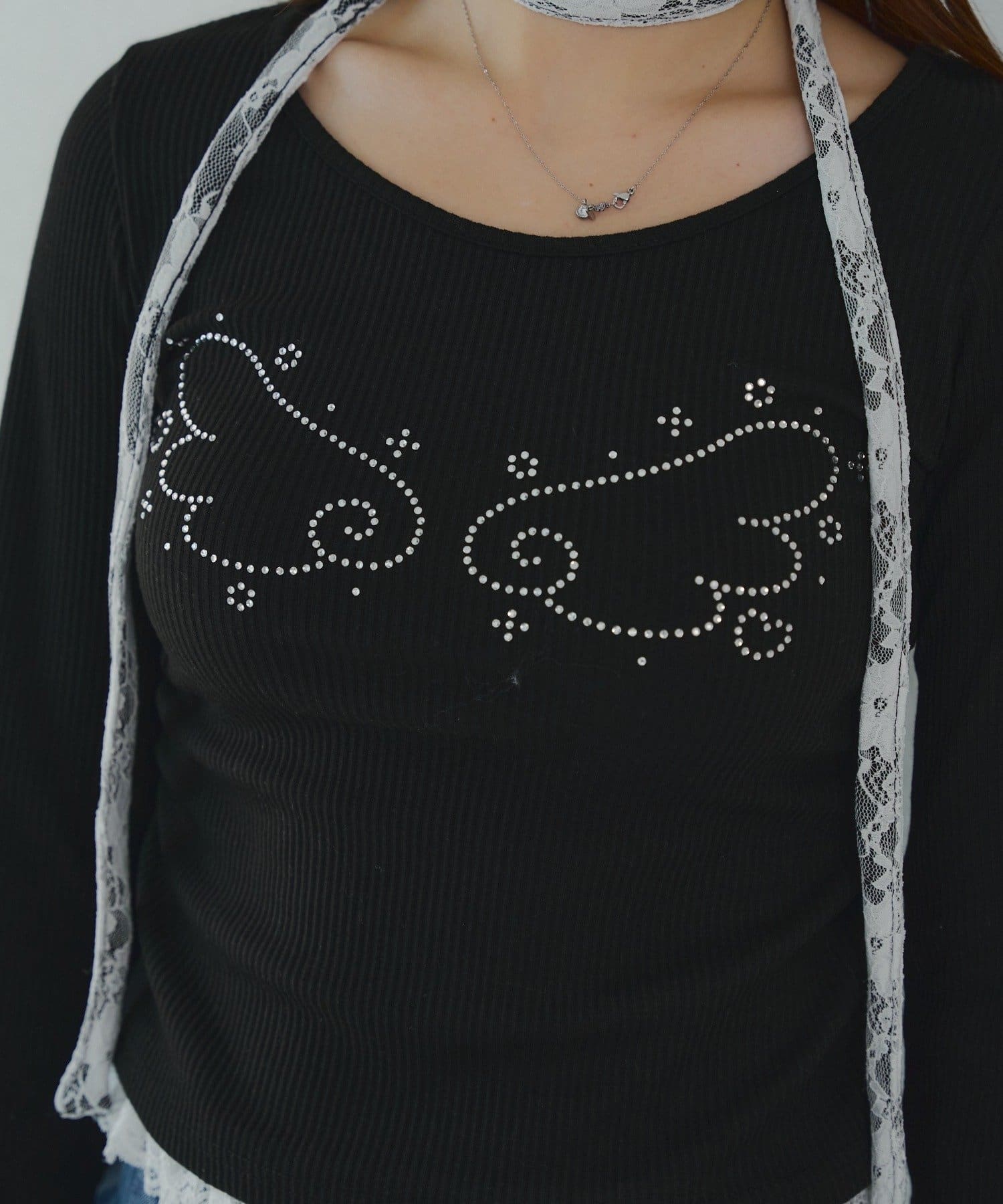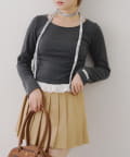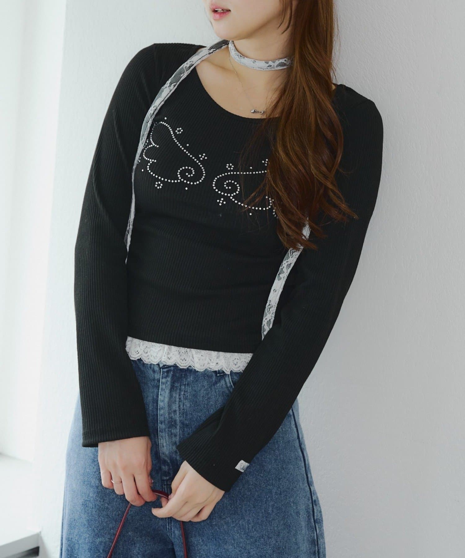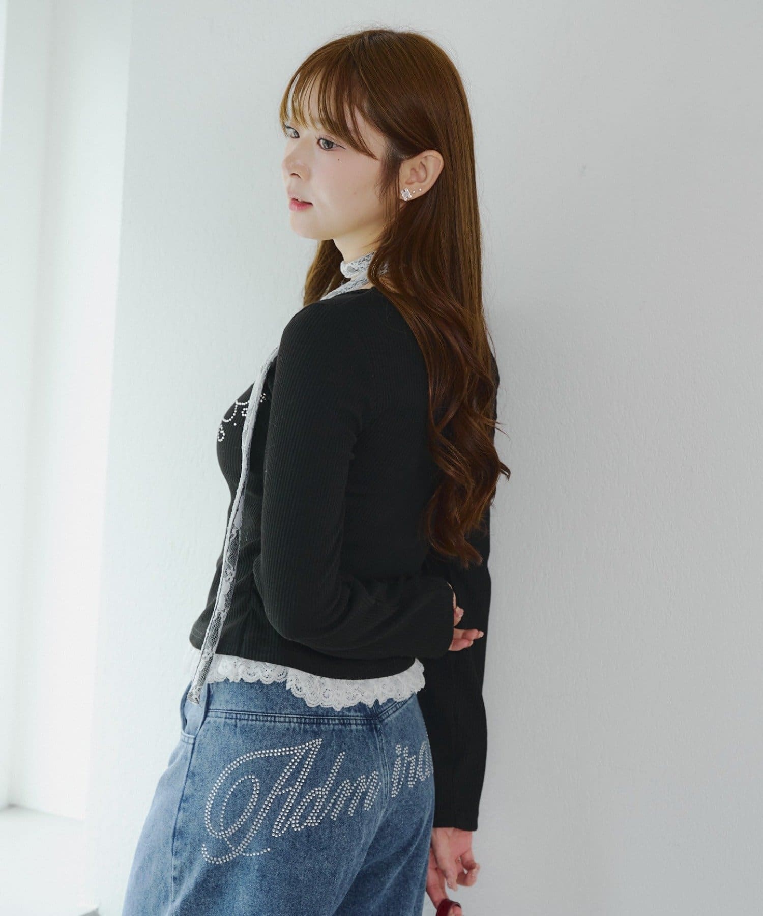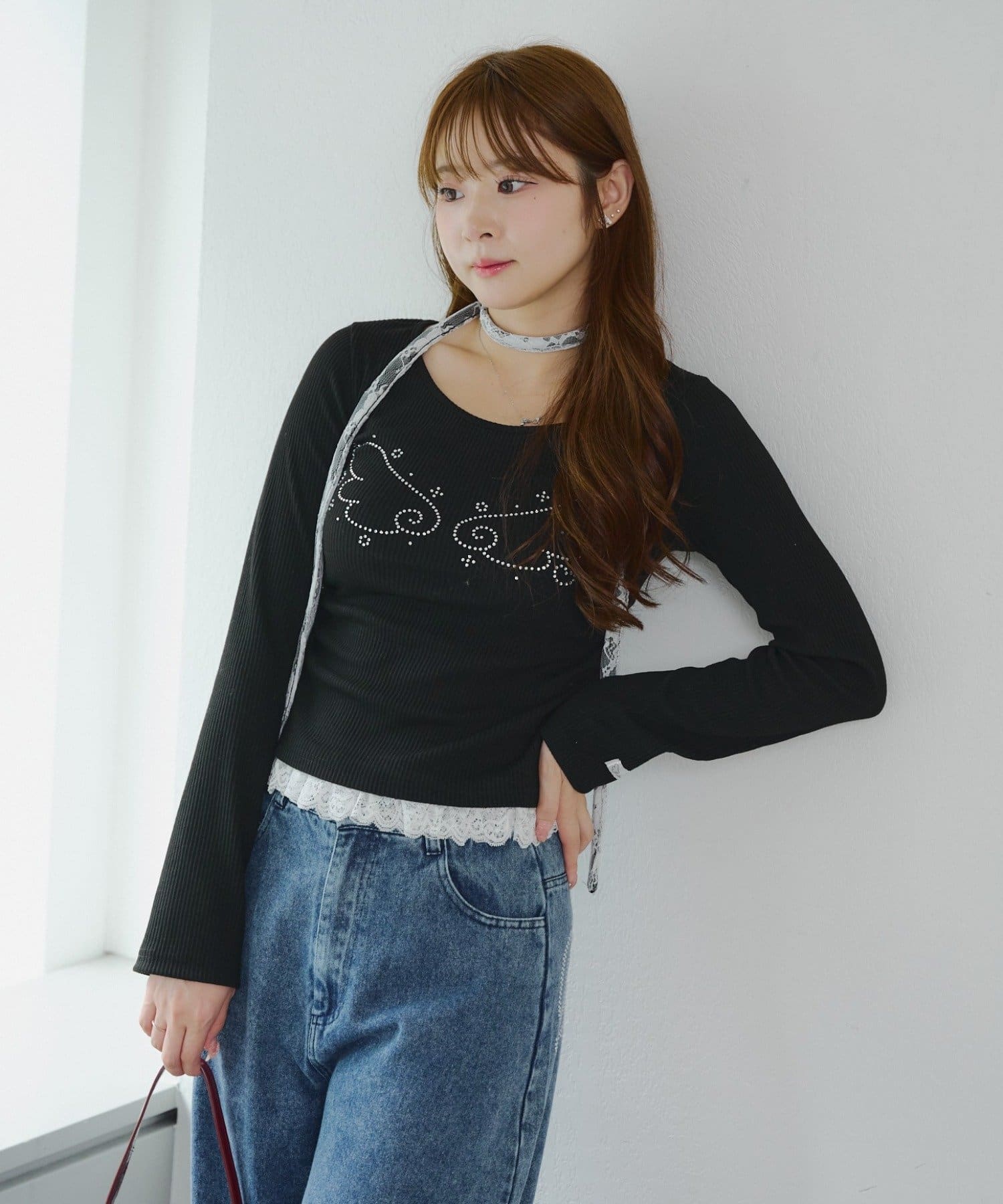 ・胸元の繊細なビジューが目を惹く、大人可愛いリブトップス