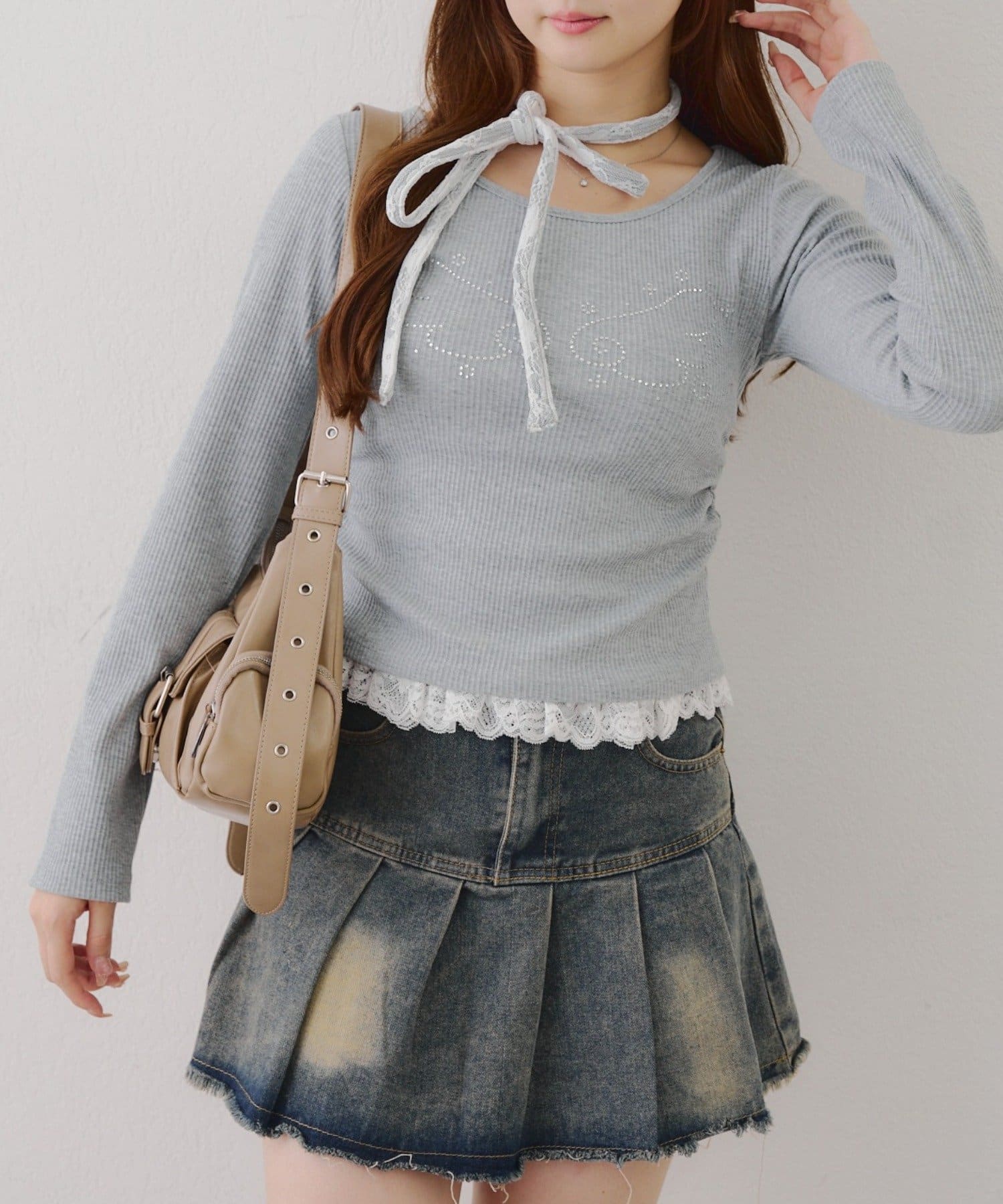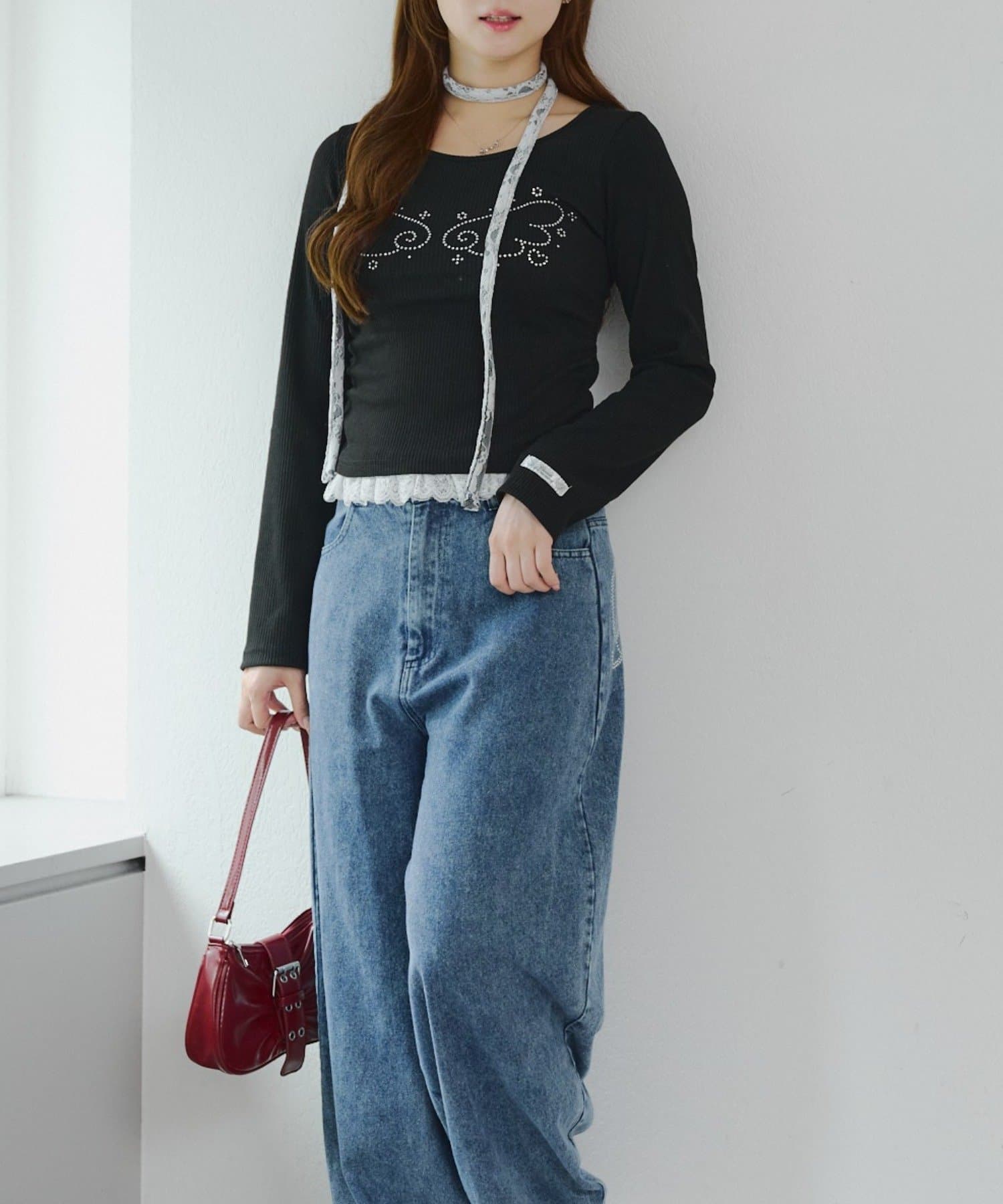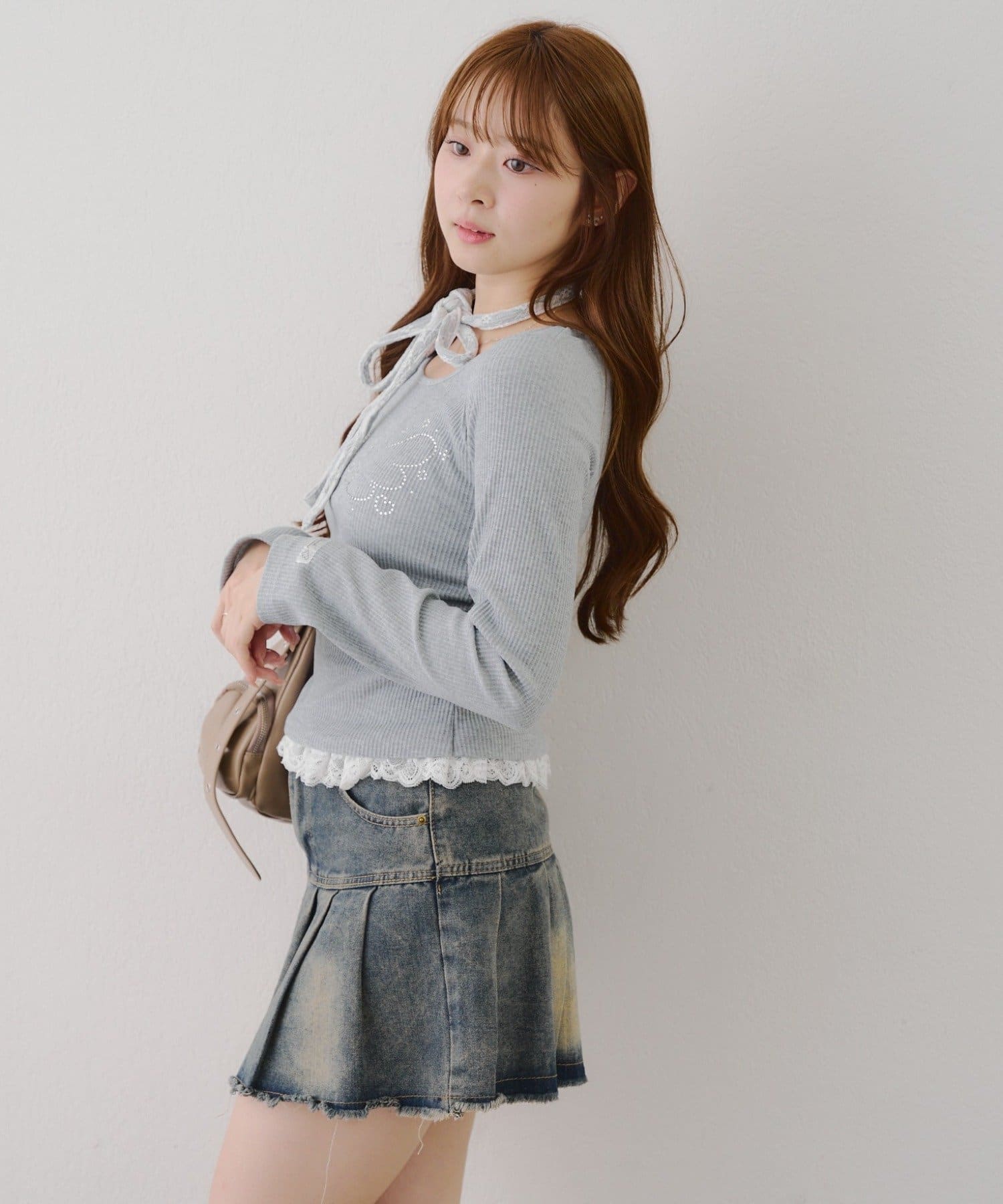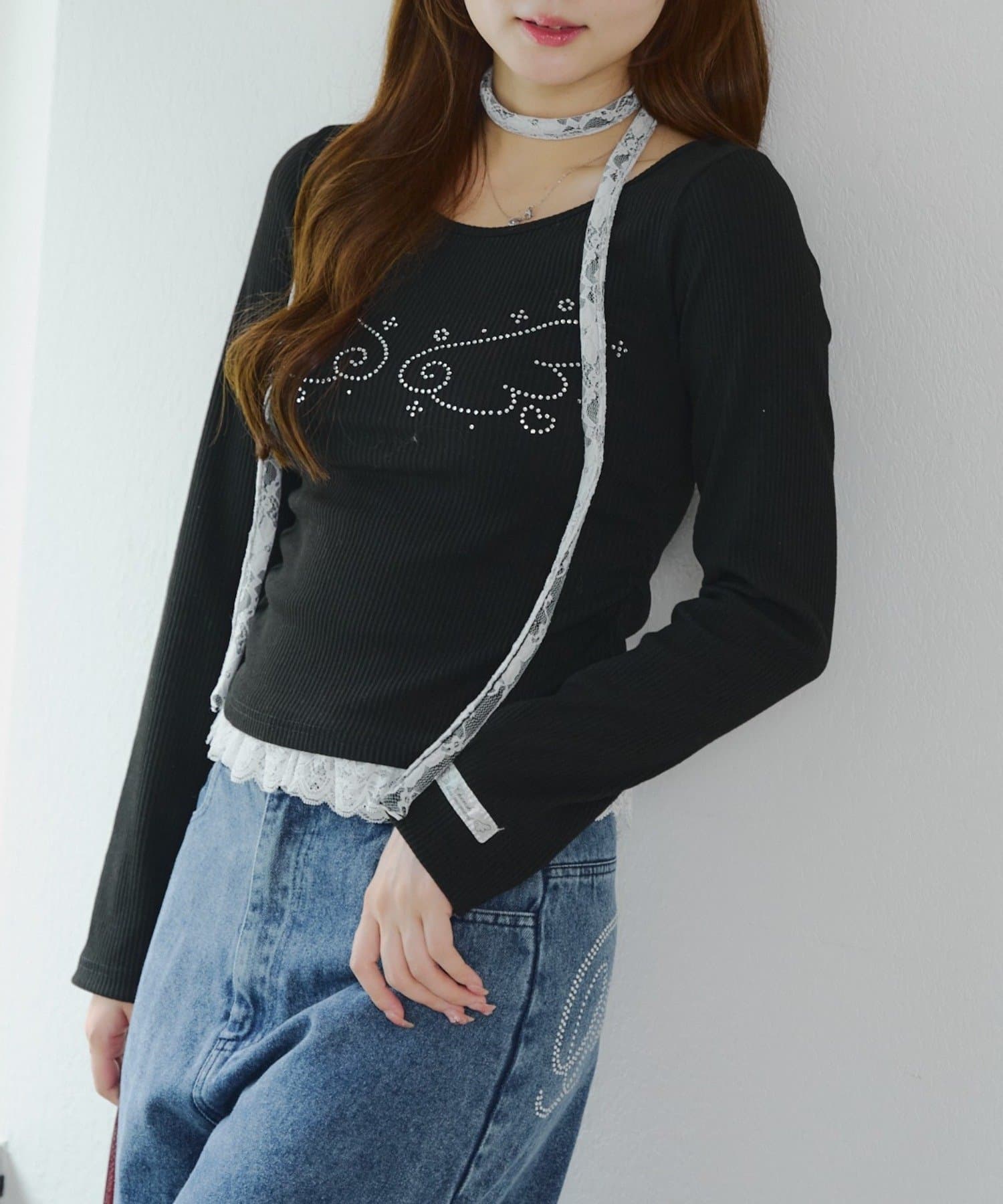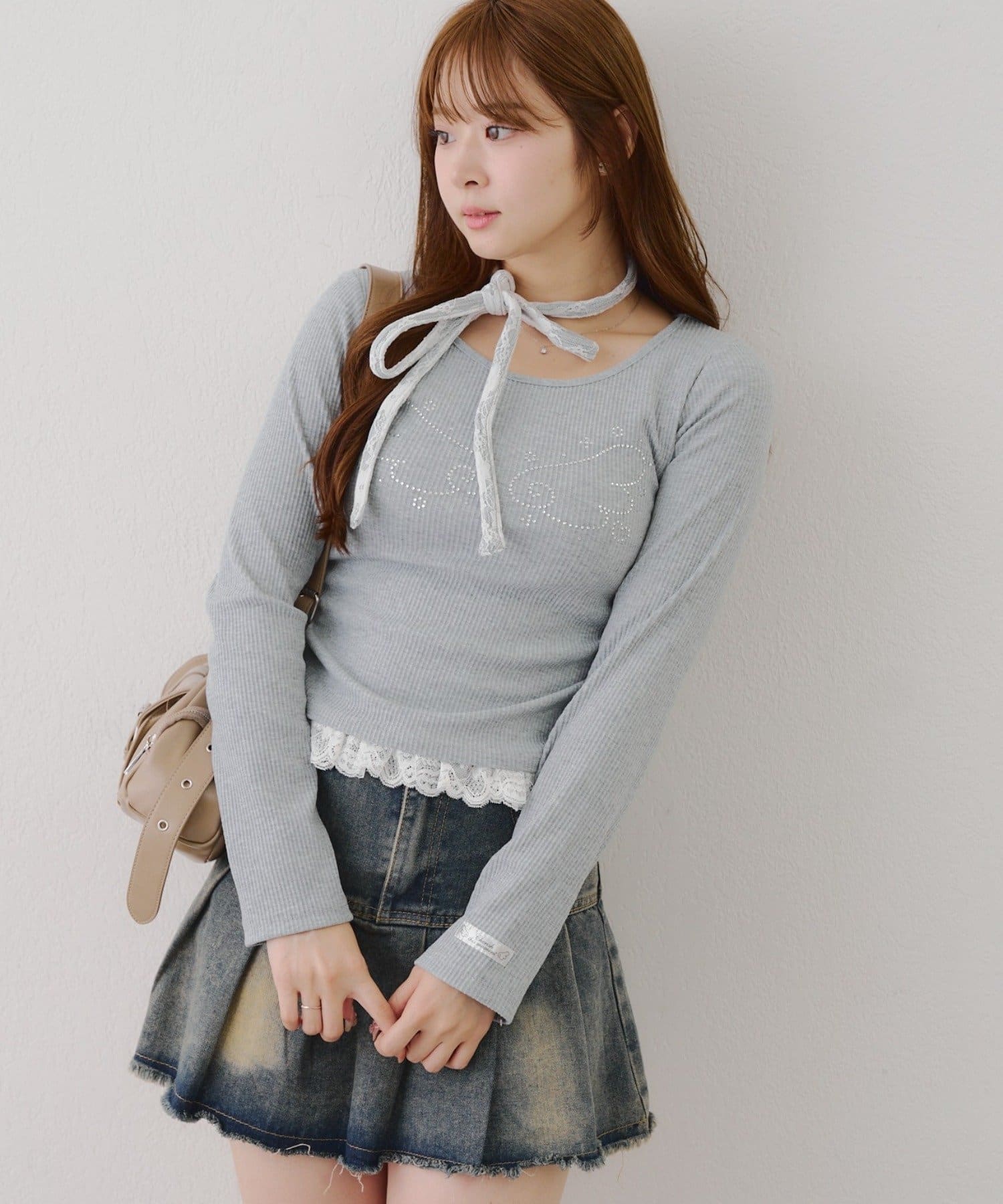 ・胸元の繊細なビジューが目を惹く、大人可愛いリブトップス