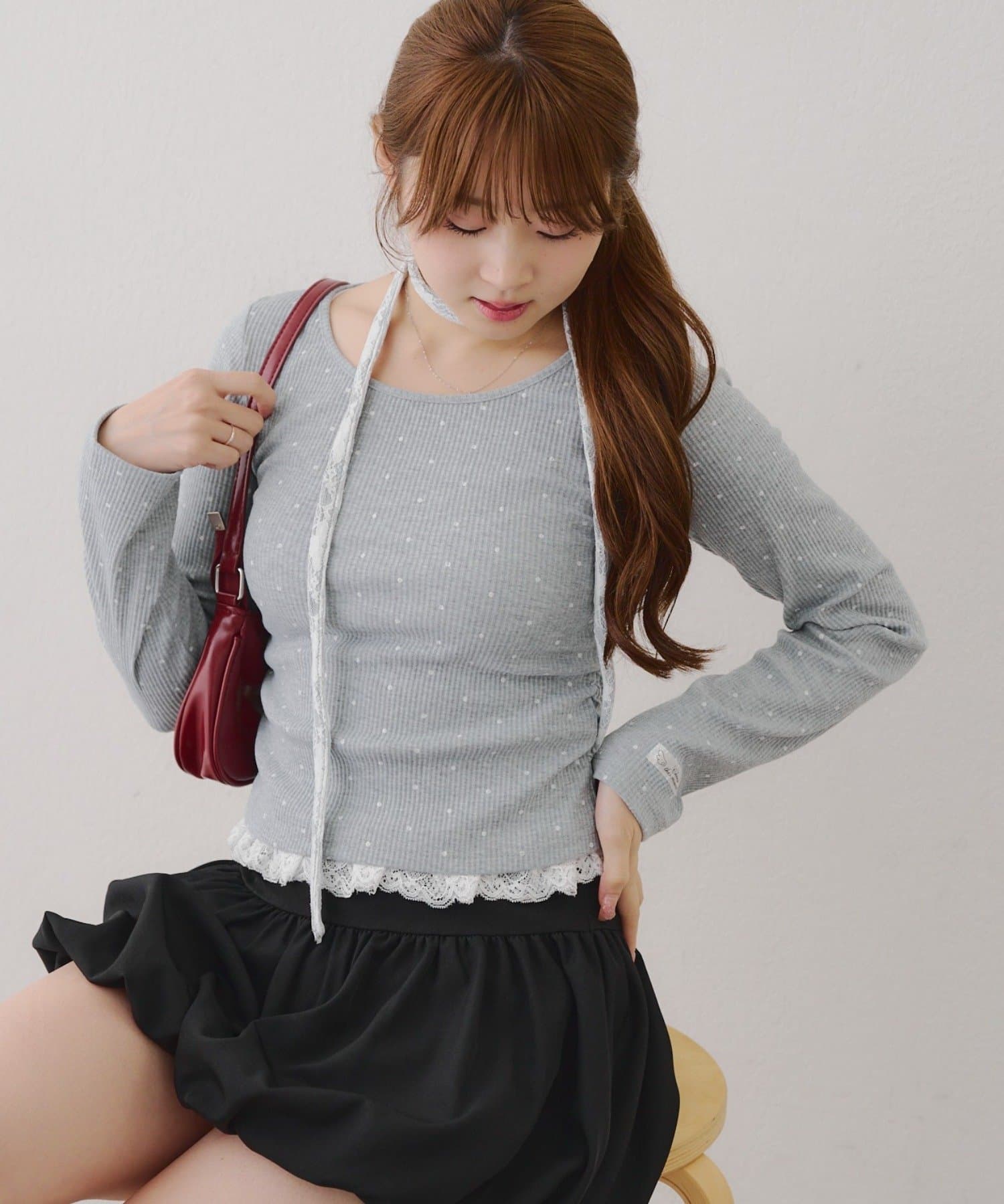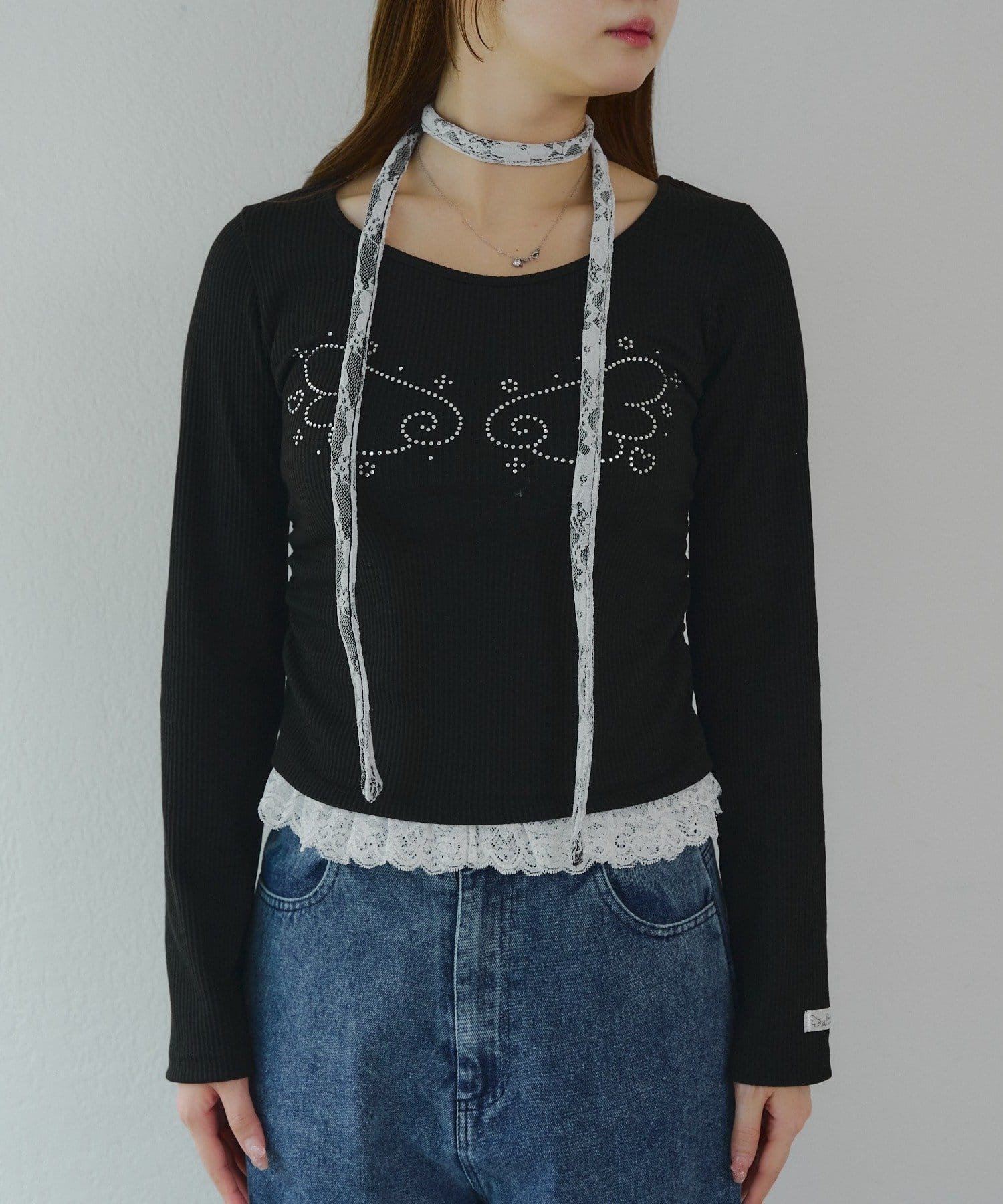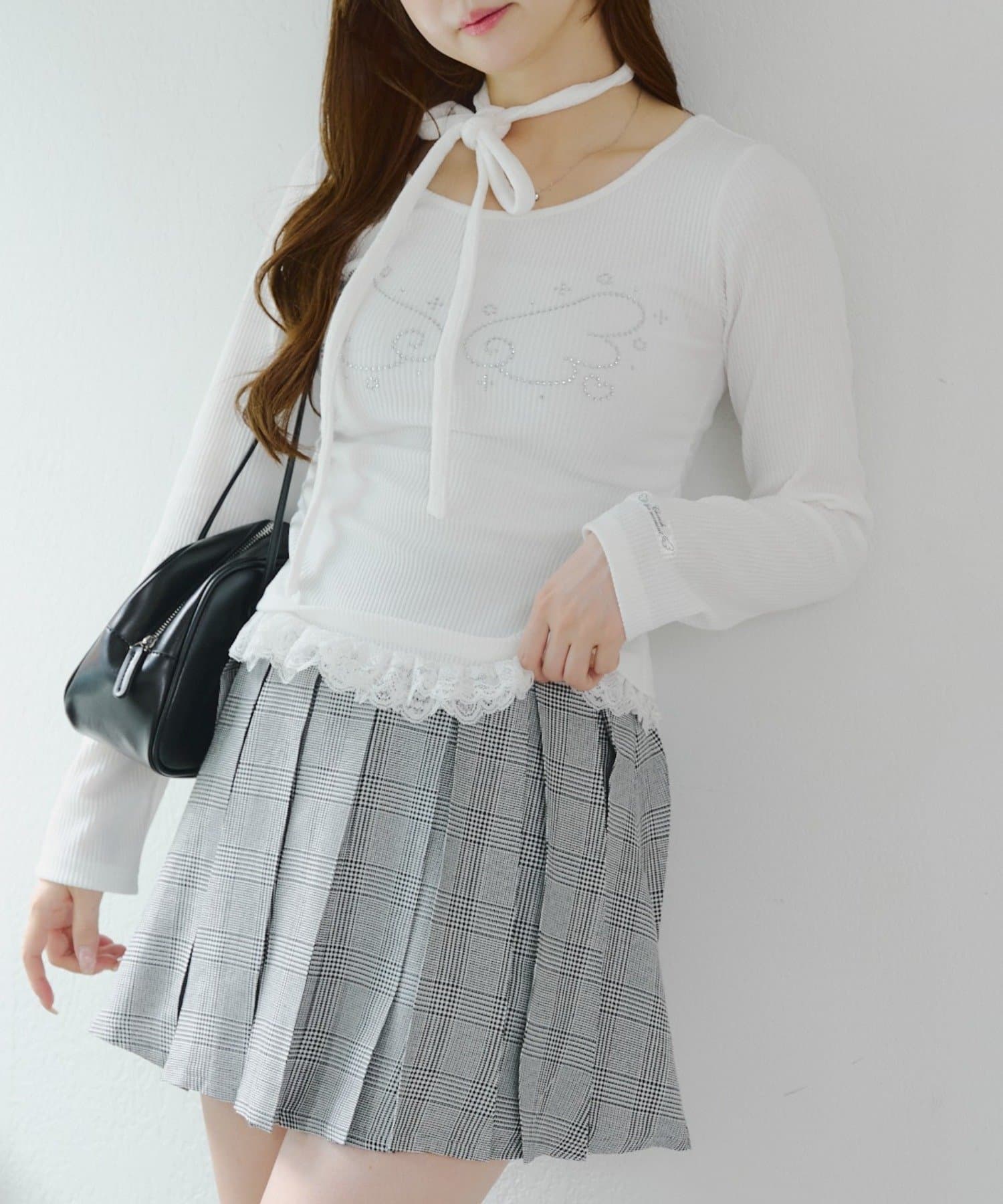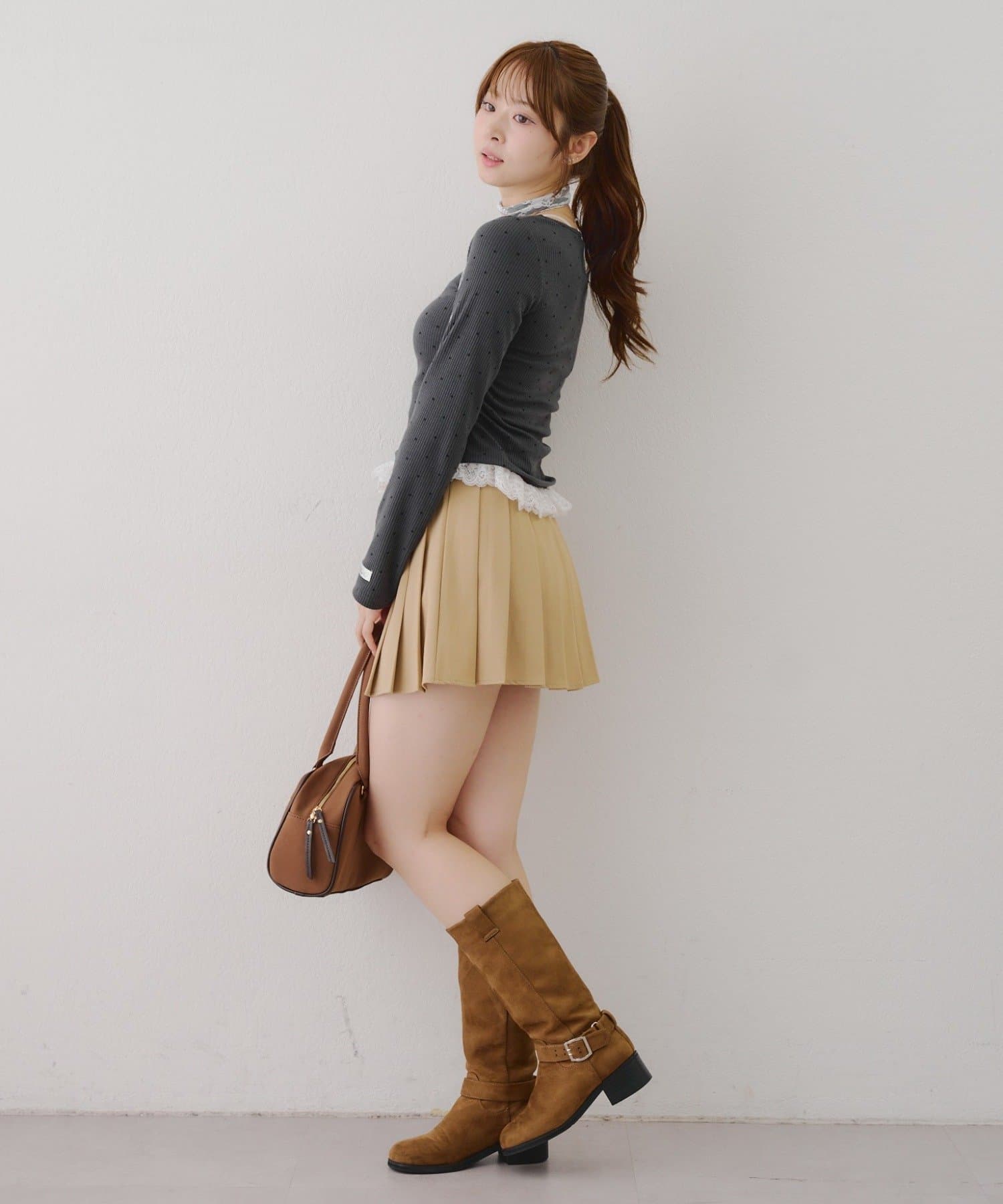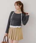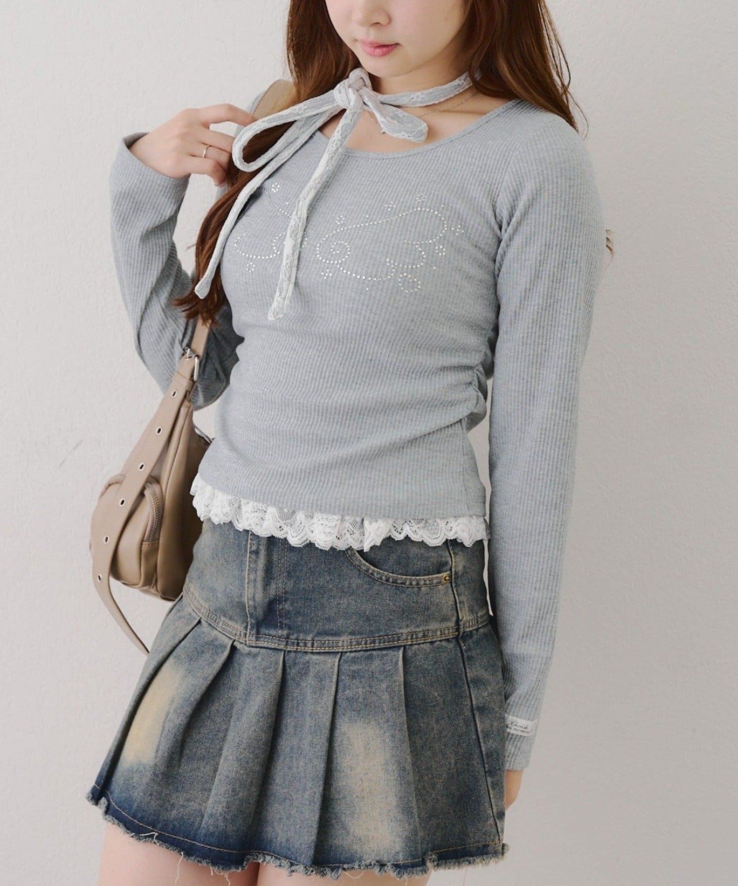 ・胸元の繊細なビジューが目を惹く、大人可愛いリブトップス