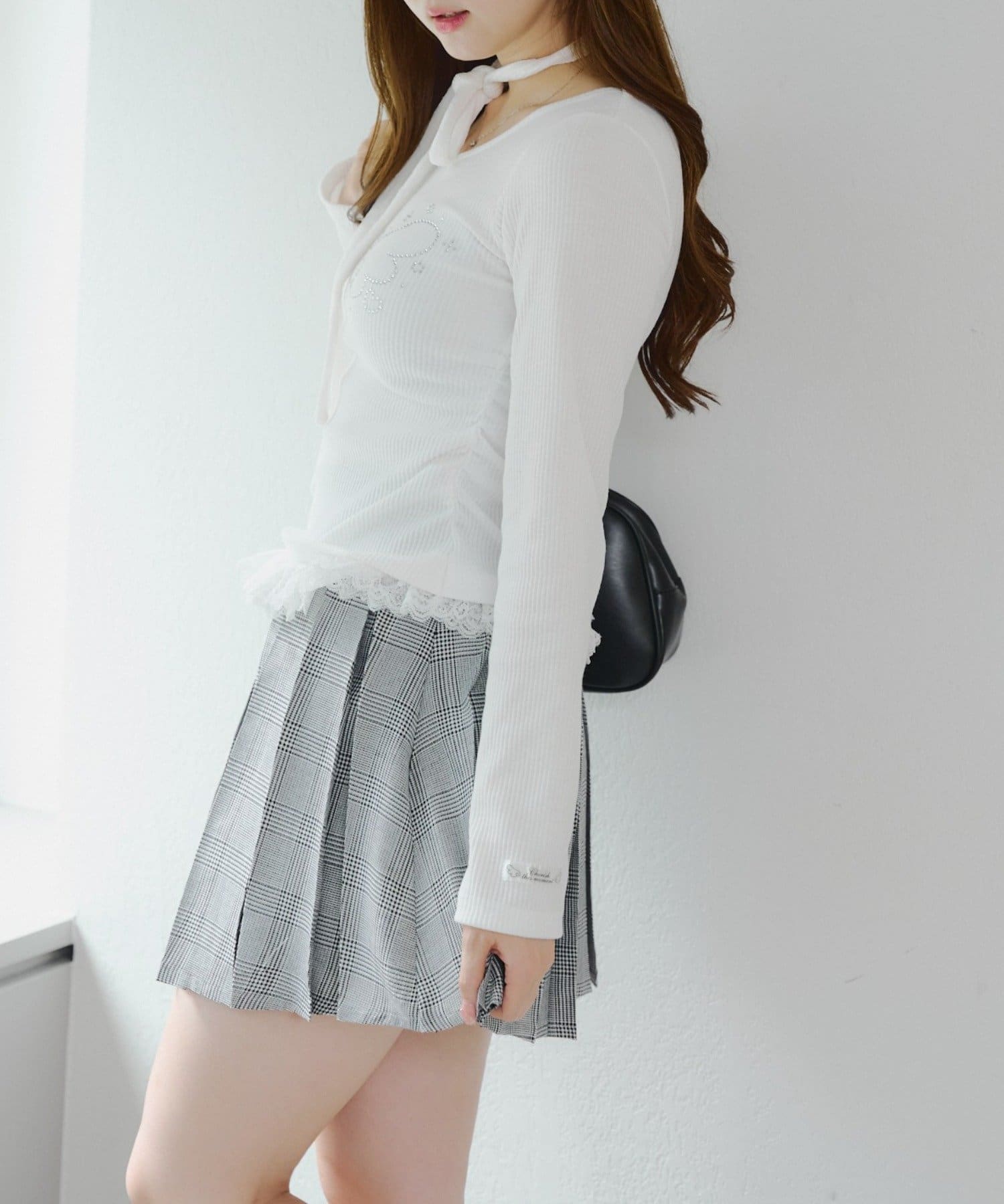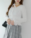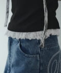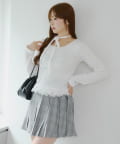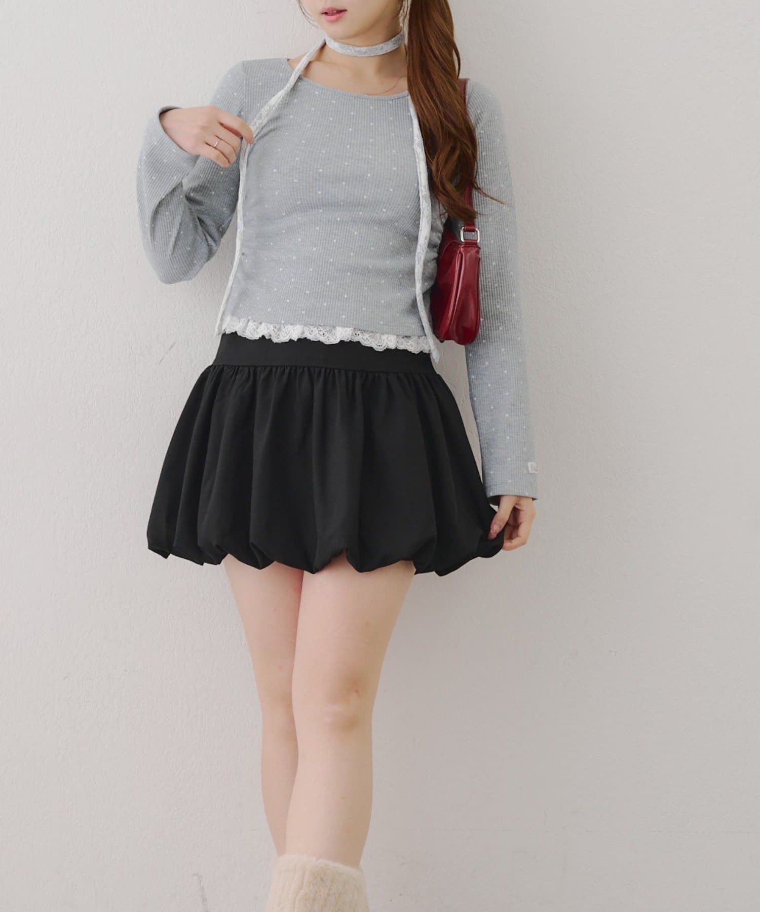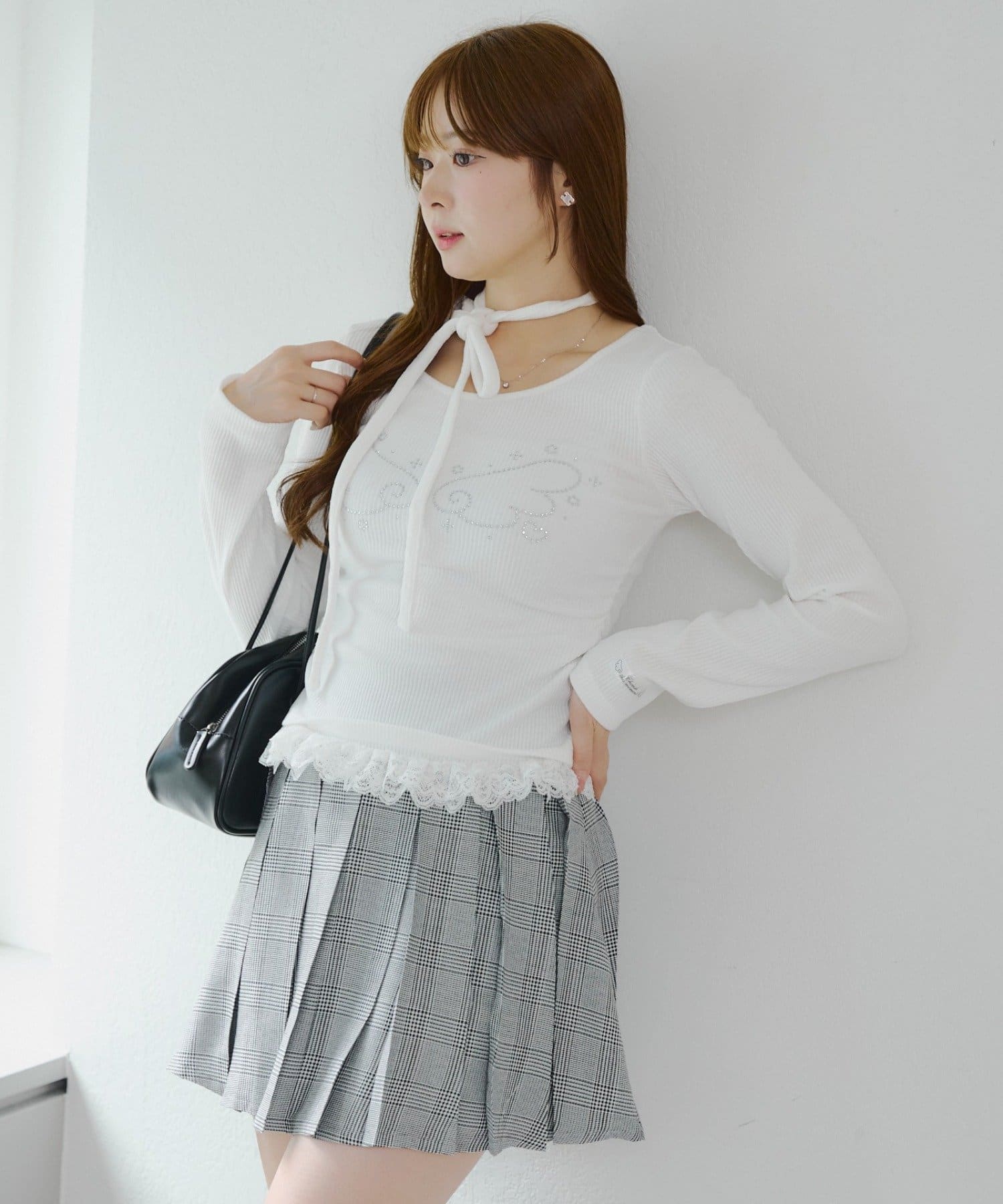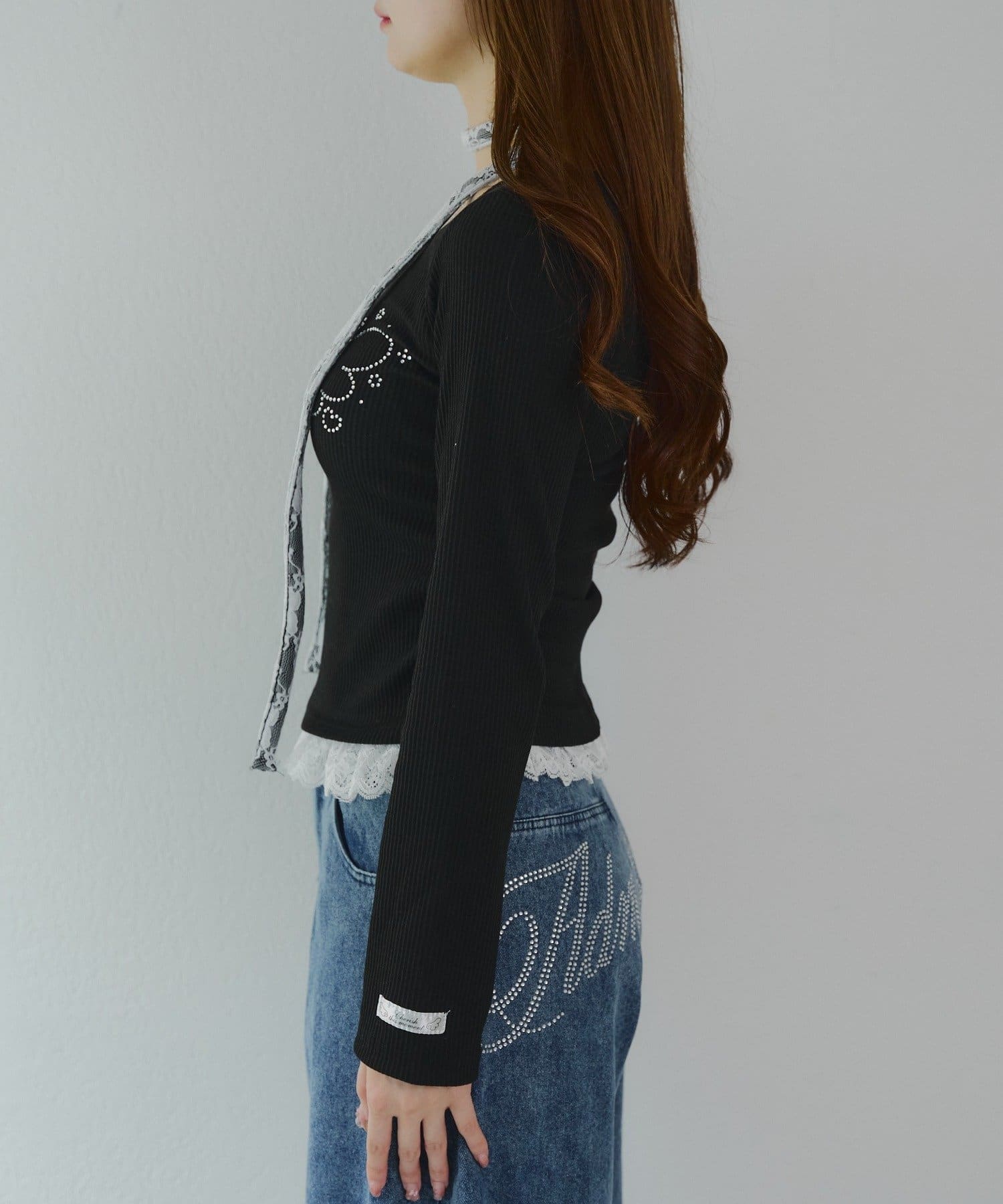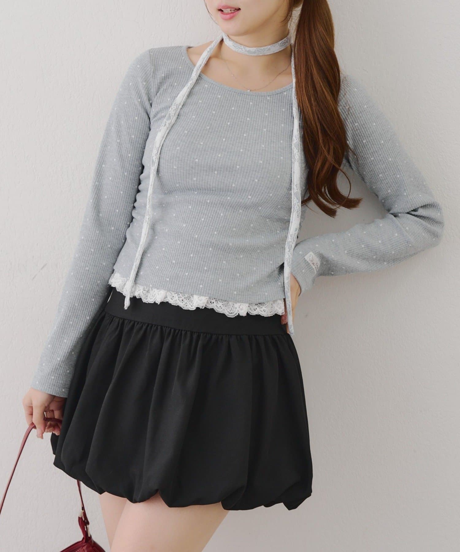 ・胸元の繊細なビジューが目を惹く、大人可愛いリブトップス