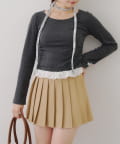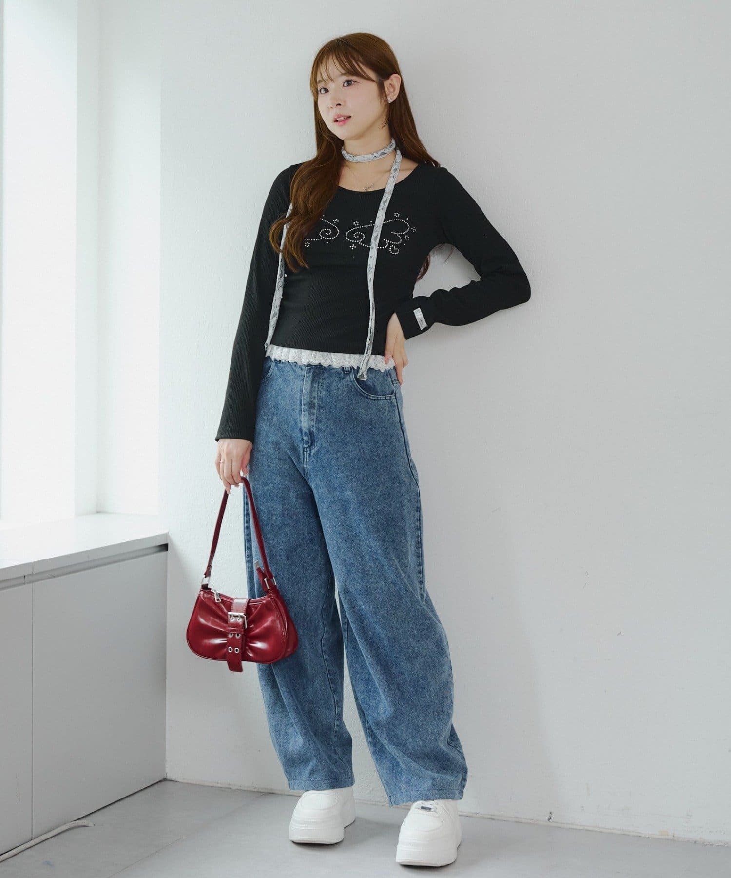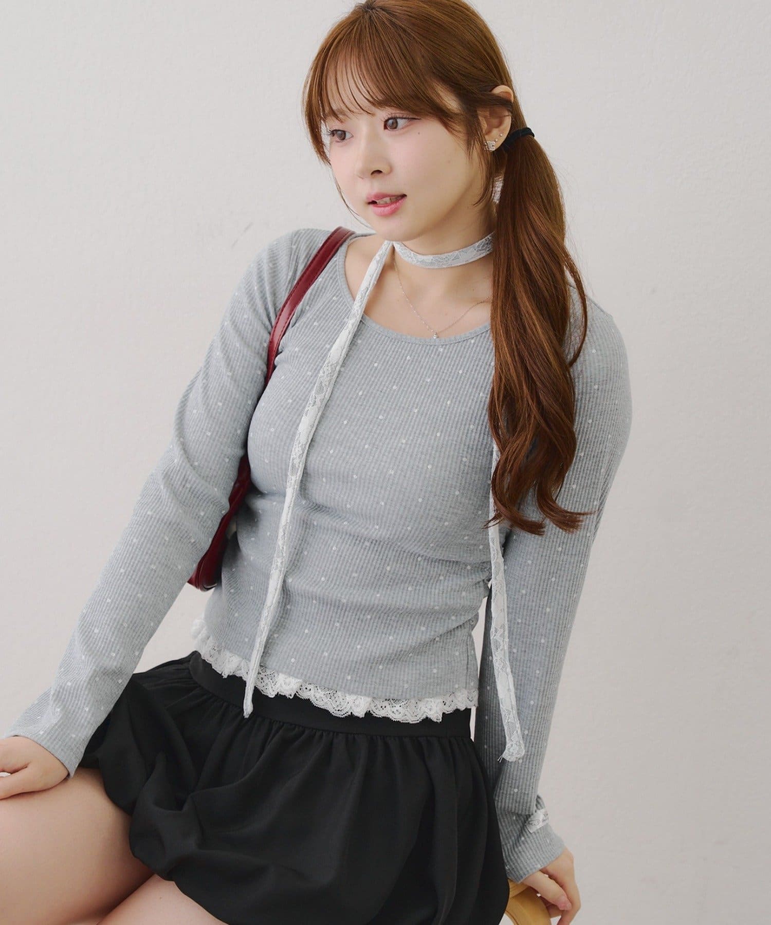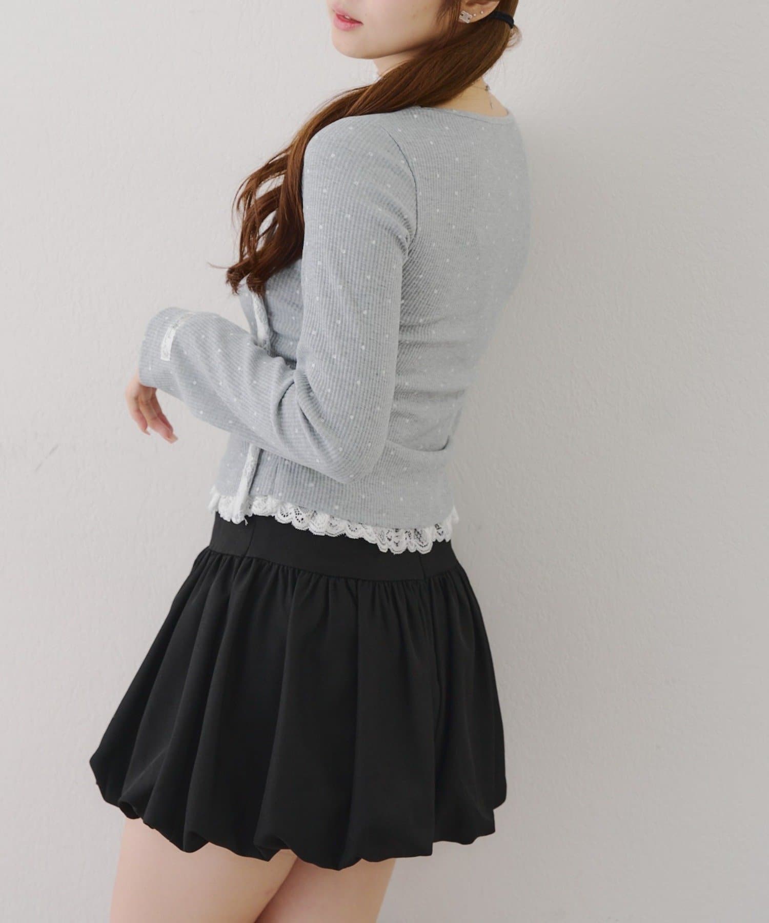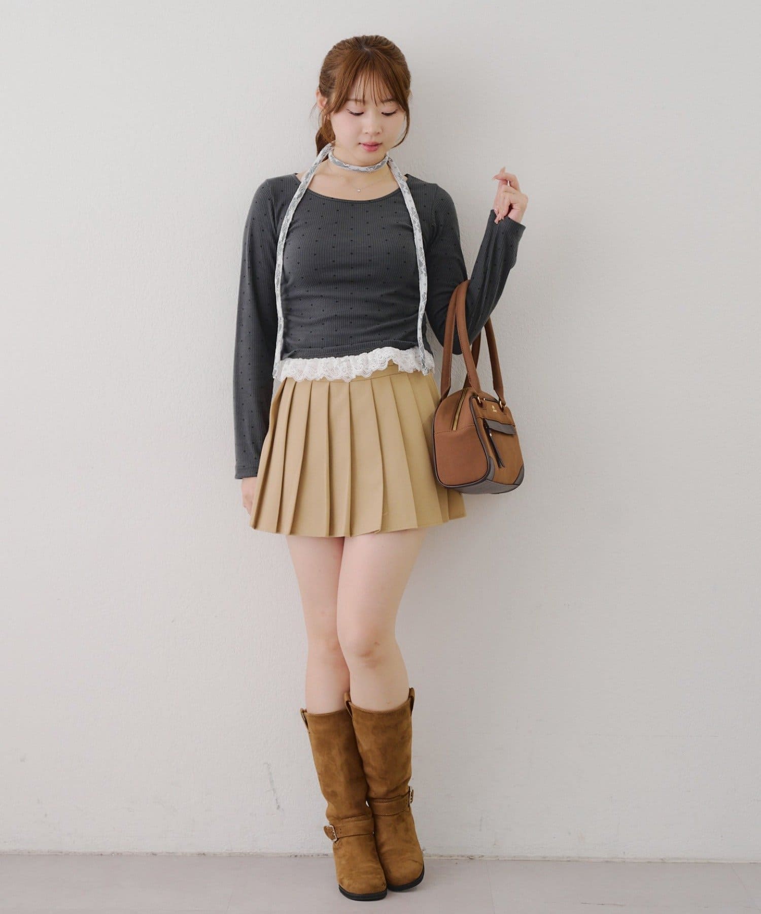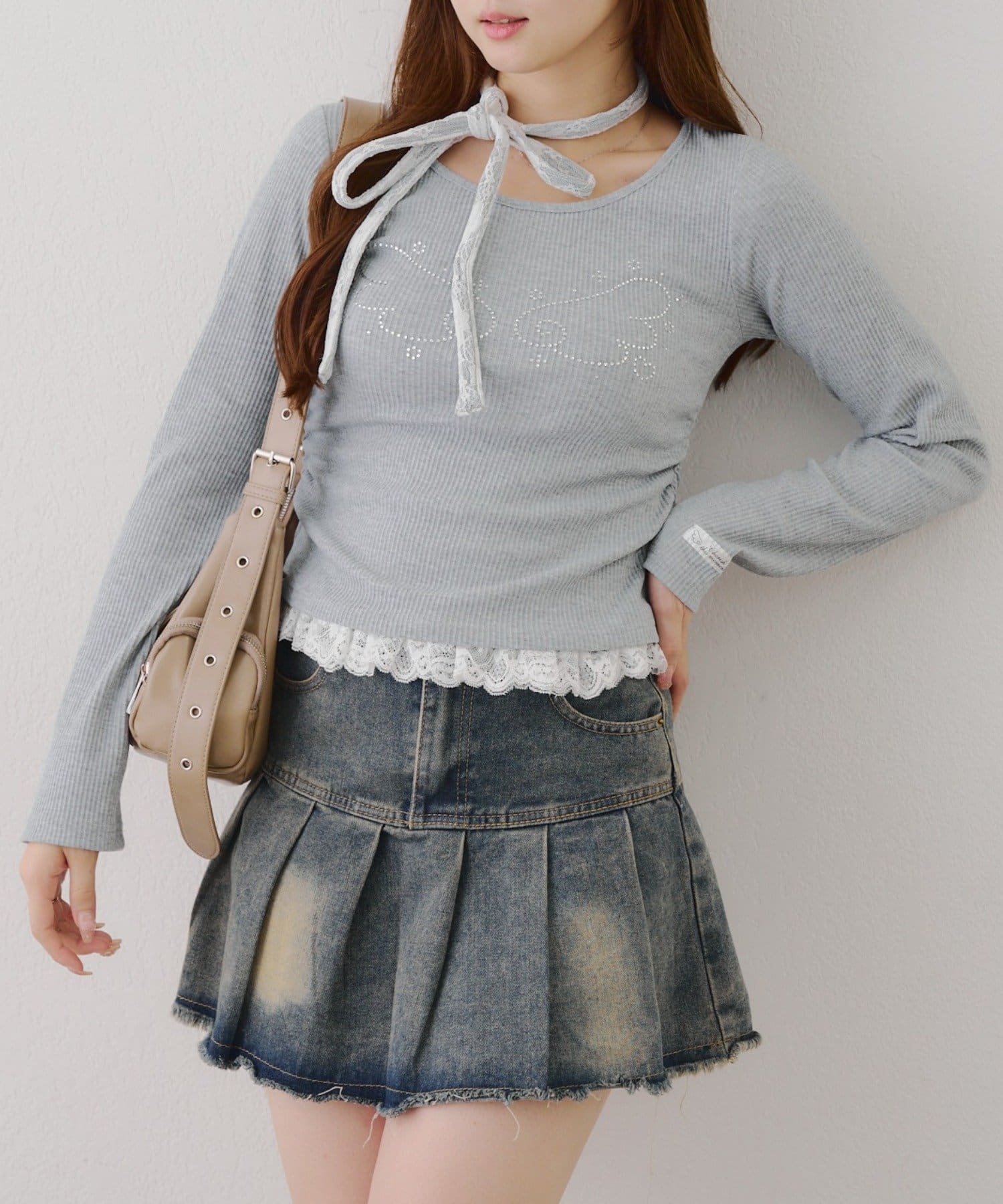 ・胸元の繊細なビジューが目を惹く、大人可愛いリブトップス