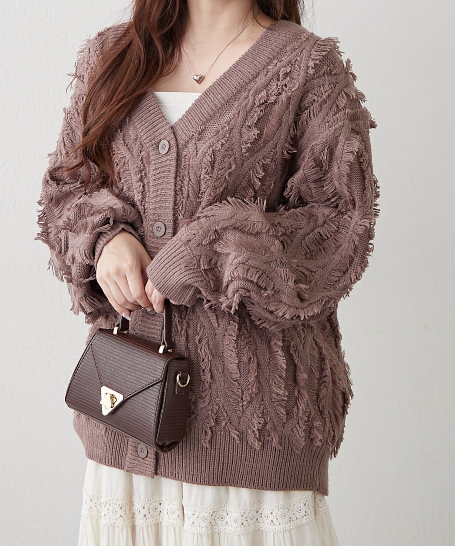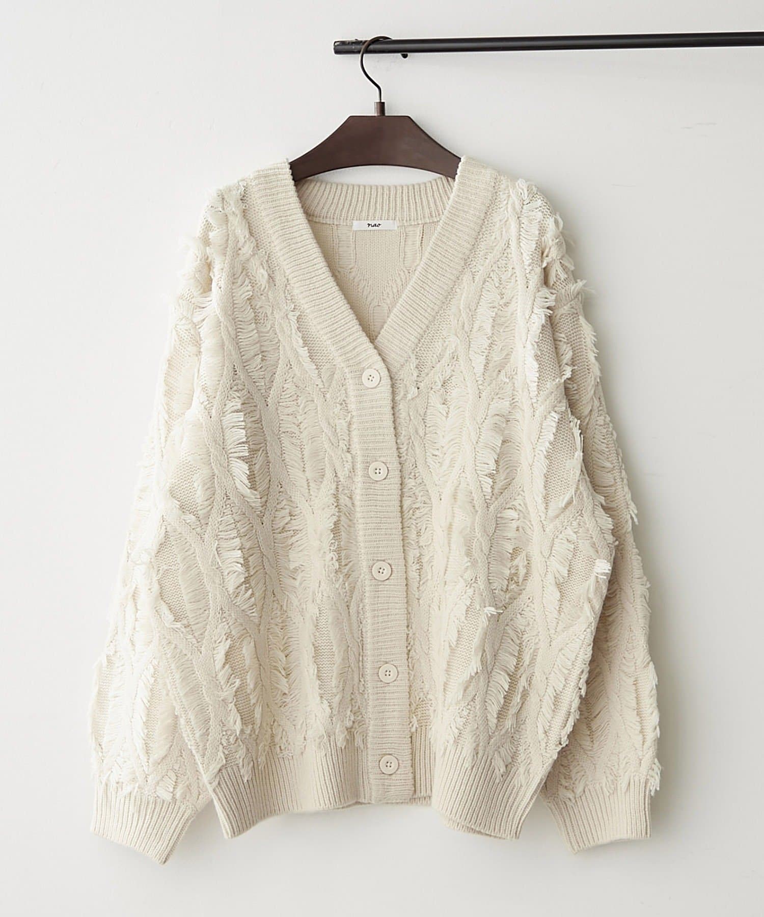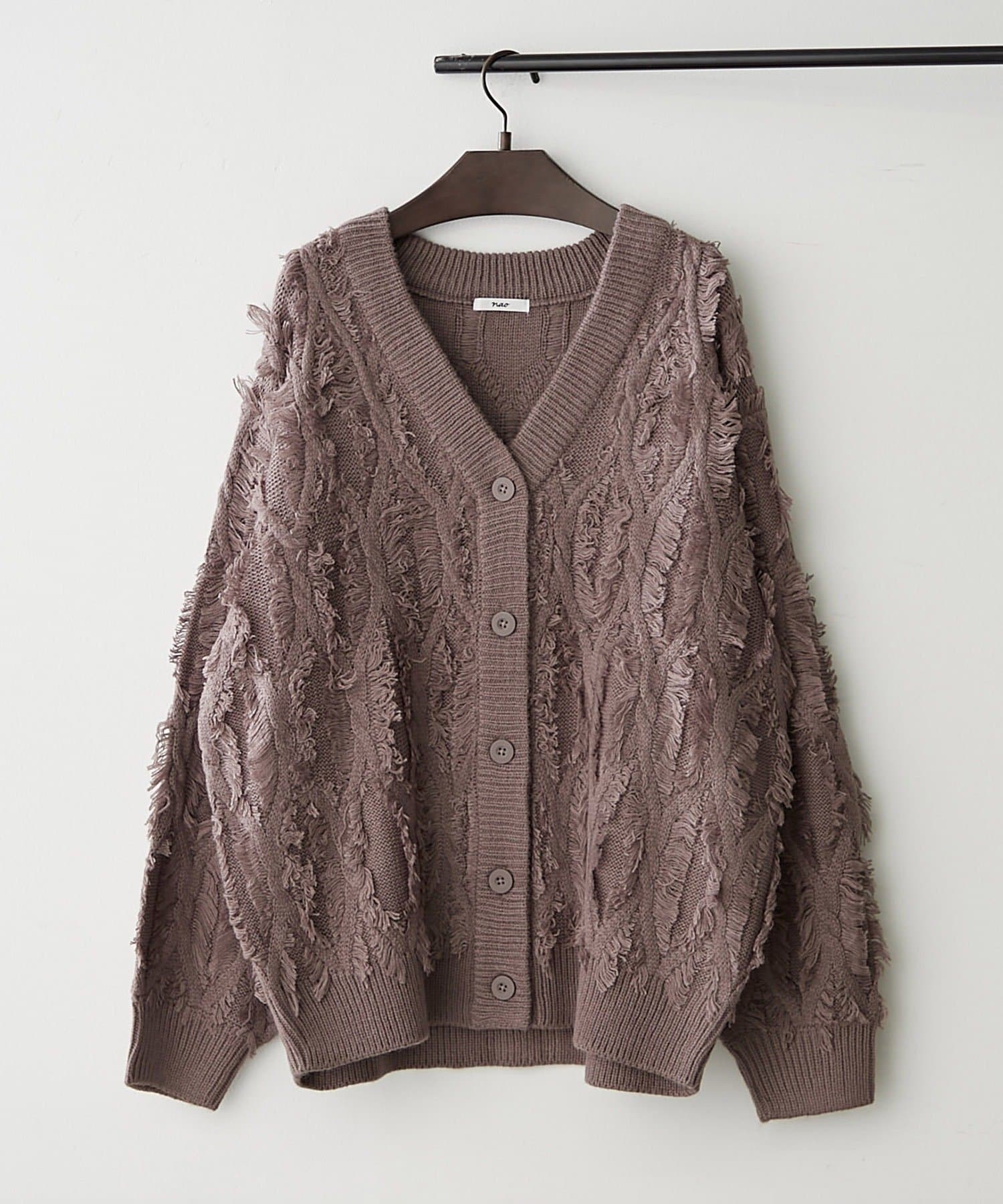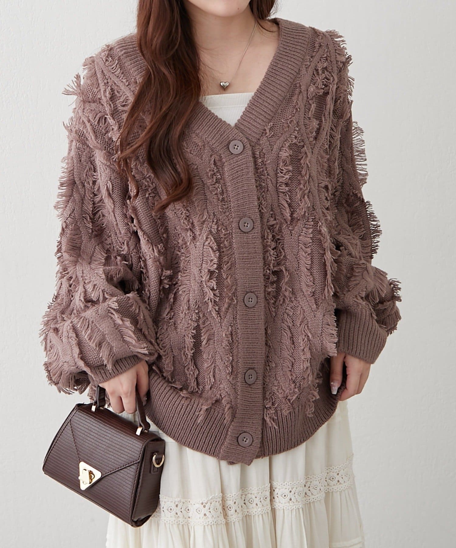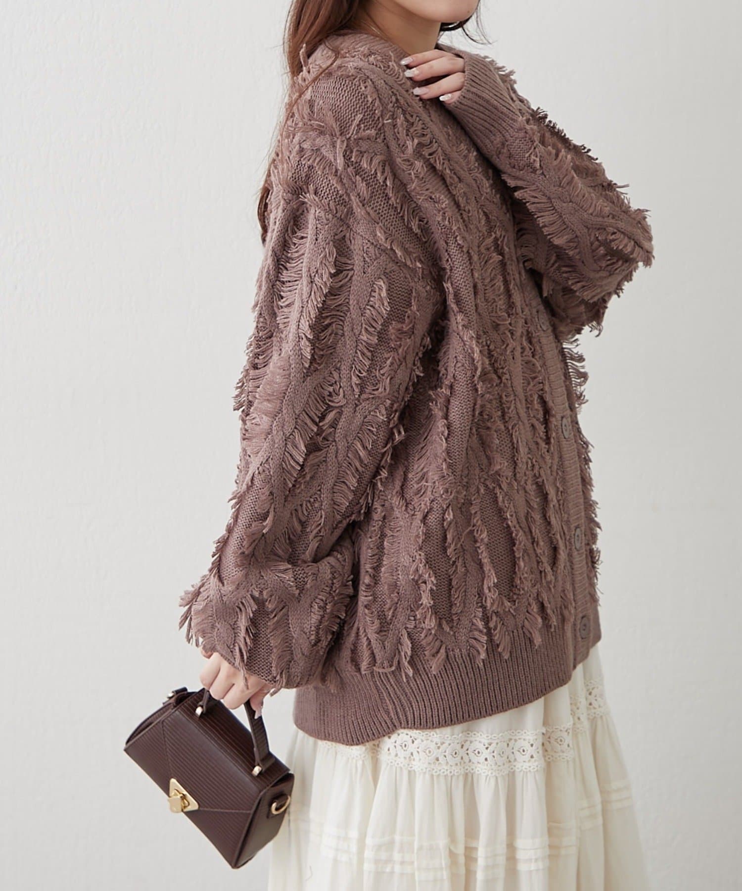 ・ざっくりとしたケーブル編みに、大胆なフリンジをあしらったニットカーディガン