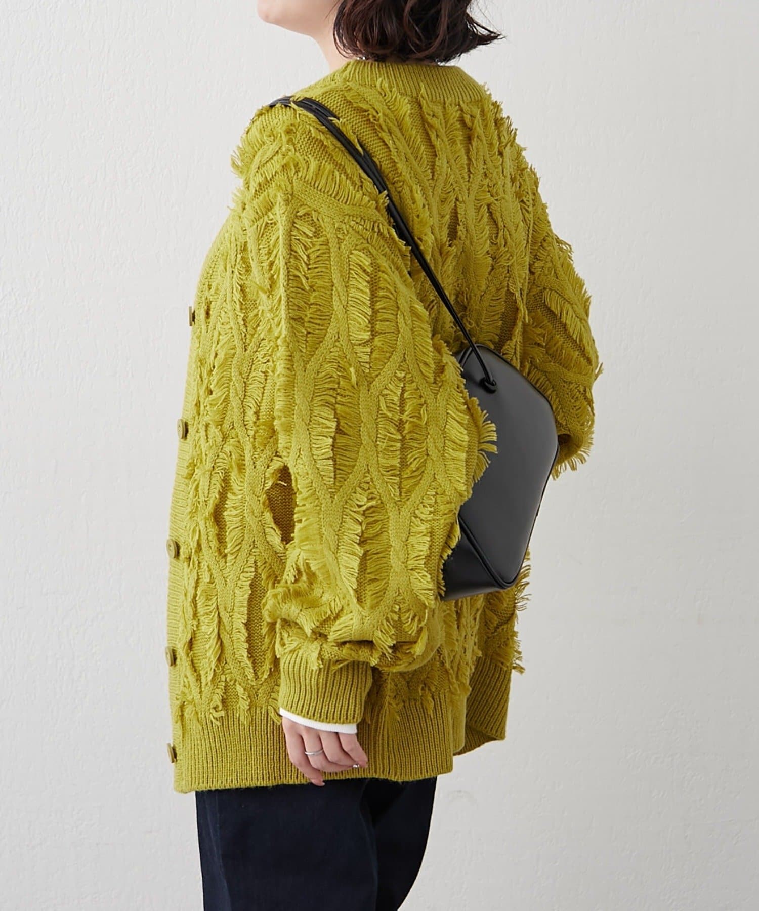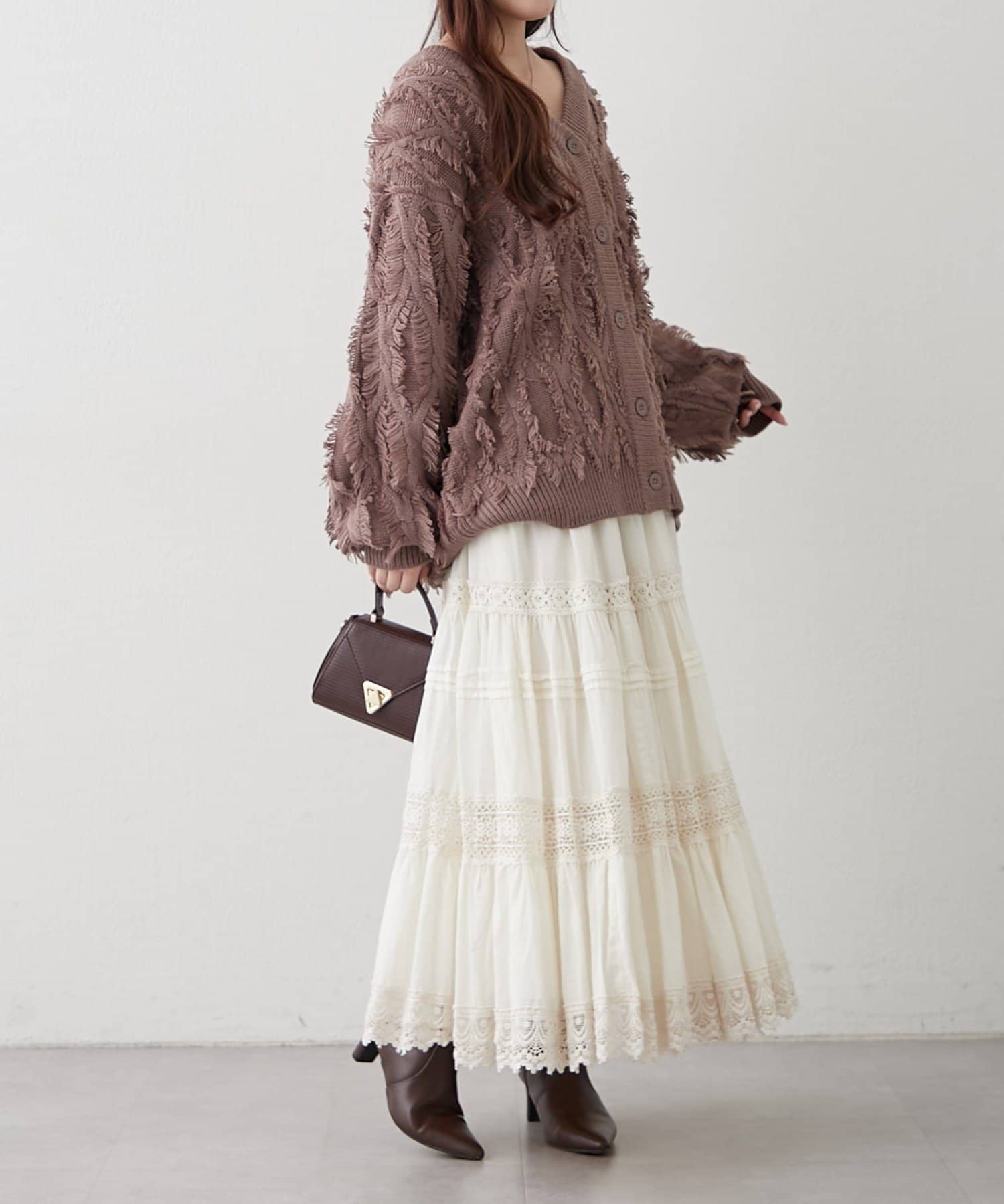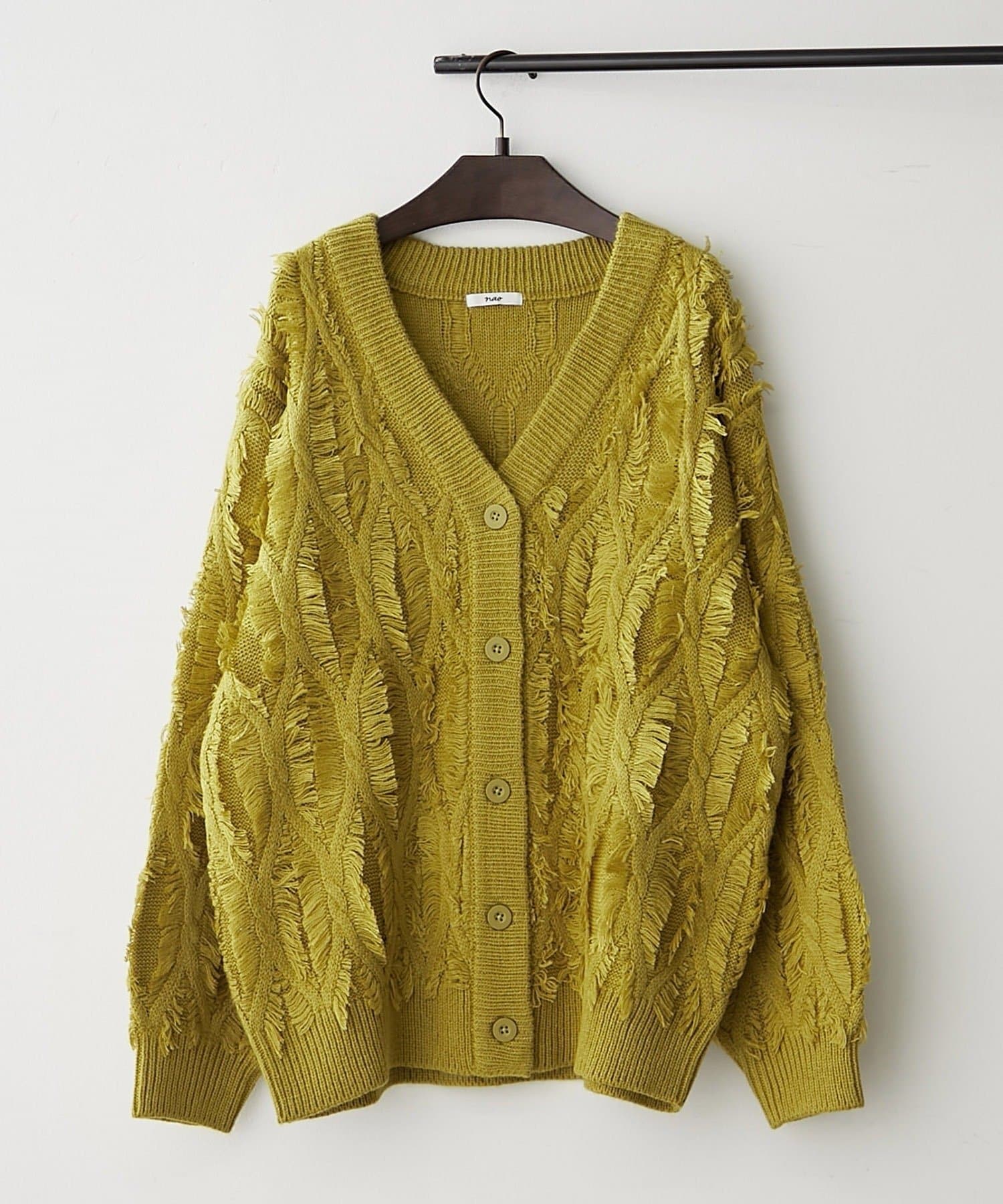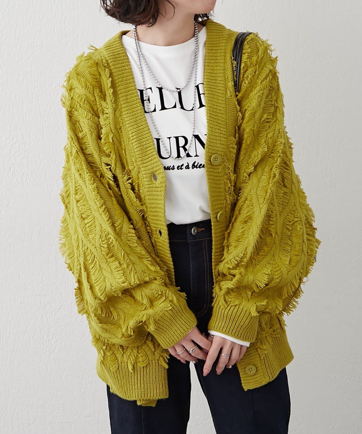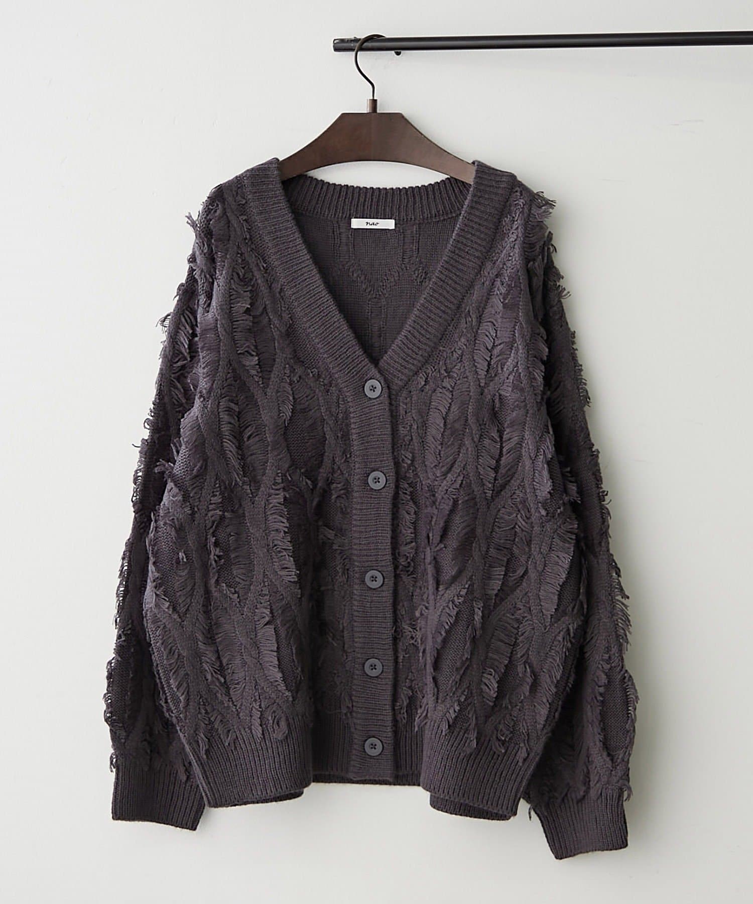 ・ざっくりとしたケーブル編みに、大胆なフリンジをあしらったニットカーディガン