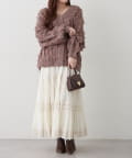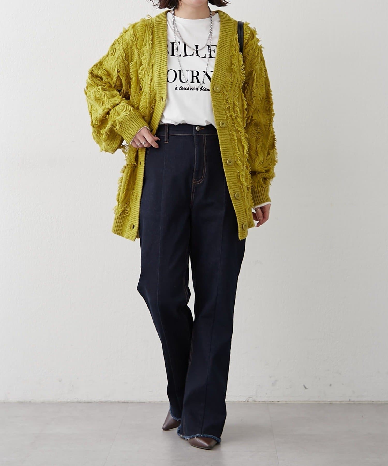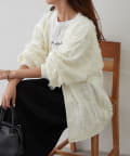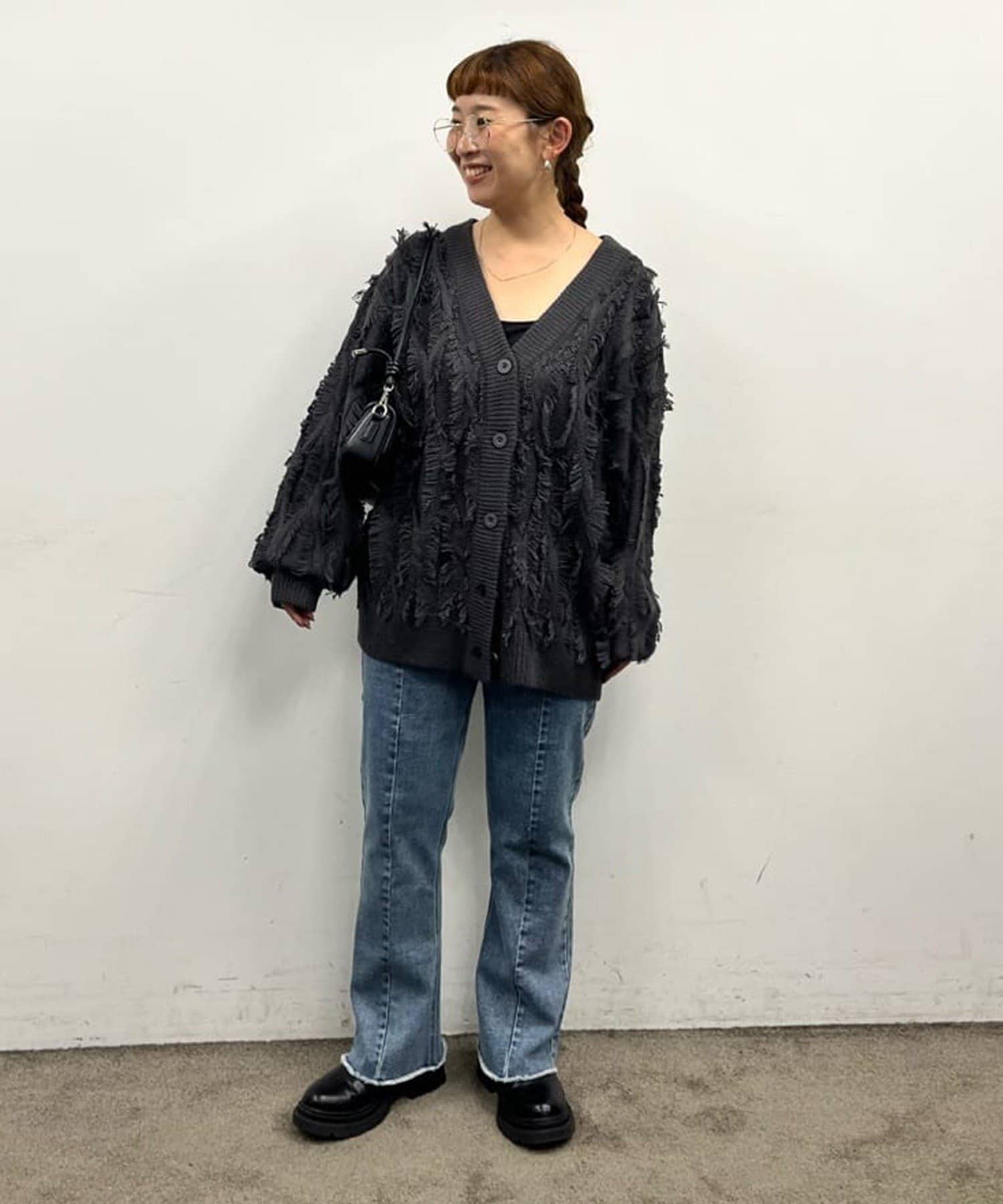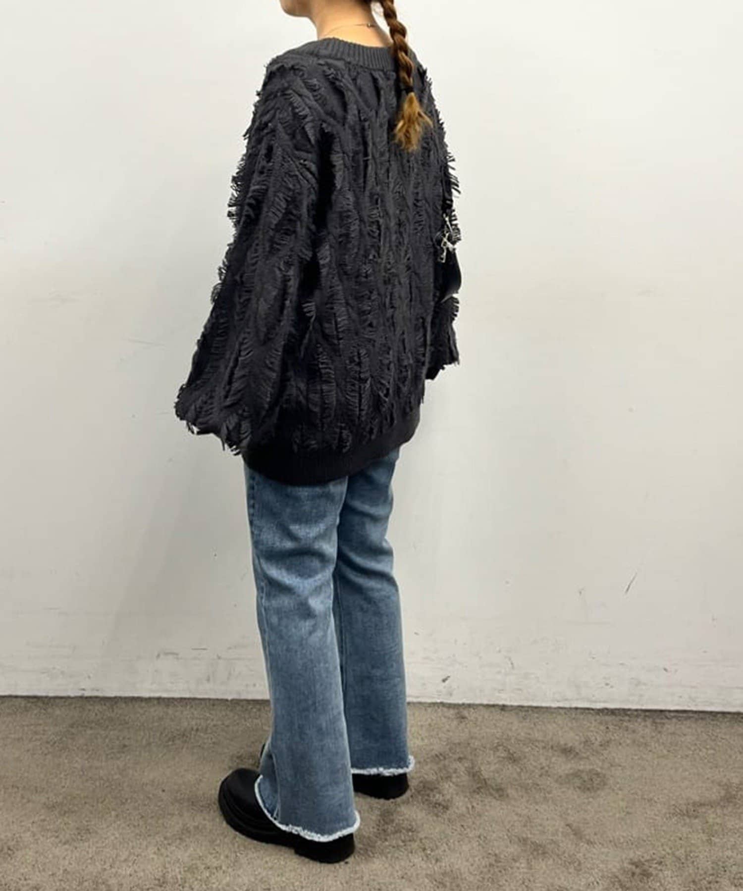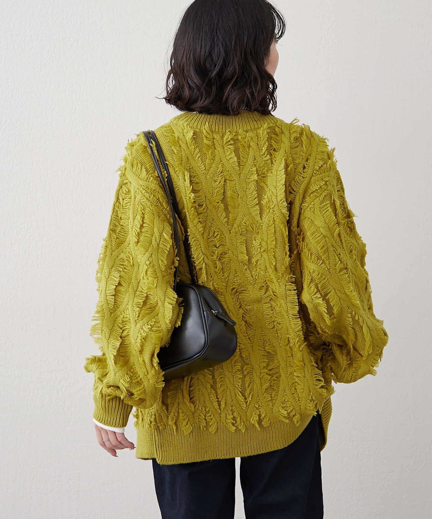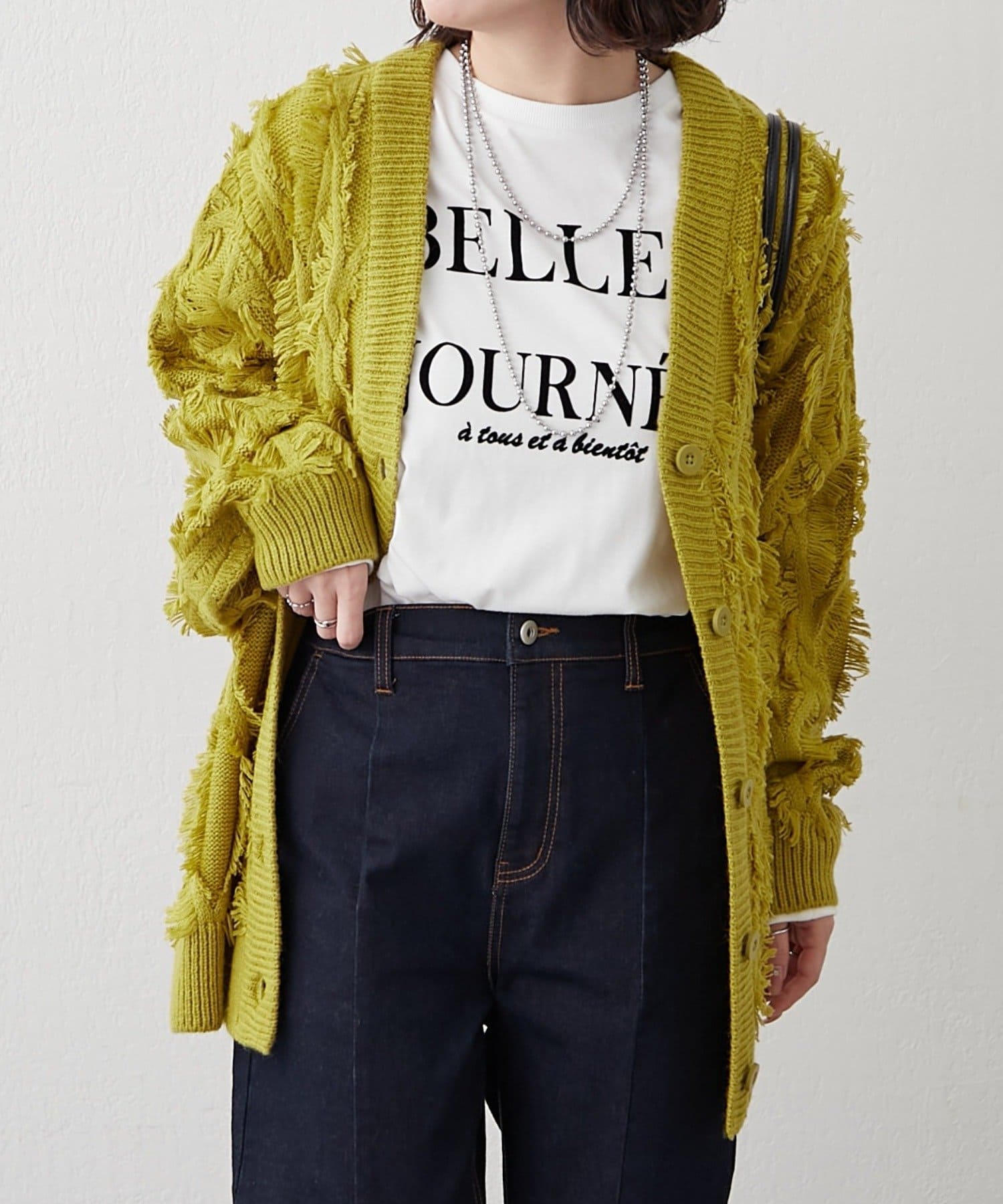 ・ざっくりとしたケーブル編みに、大胆なフリンジをあしらったニットカーディガン