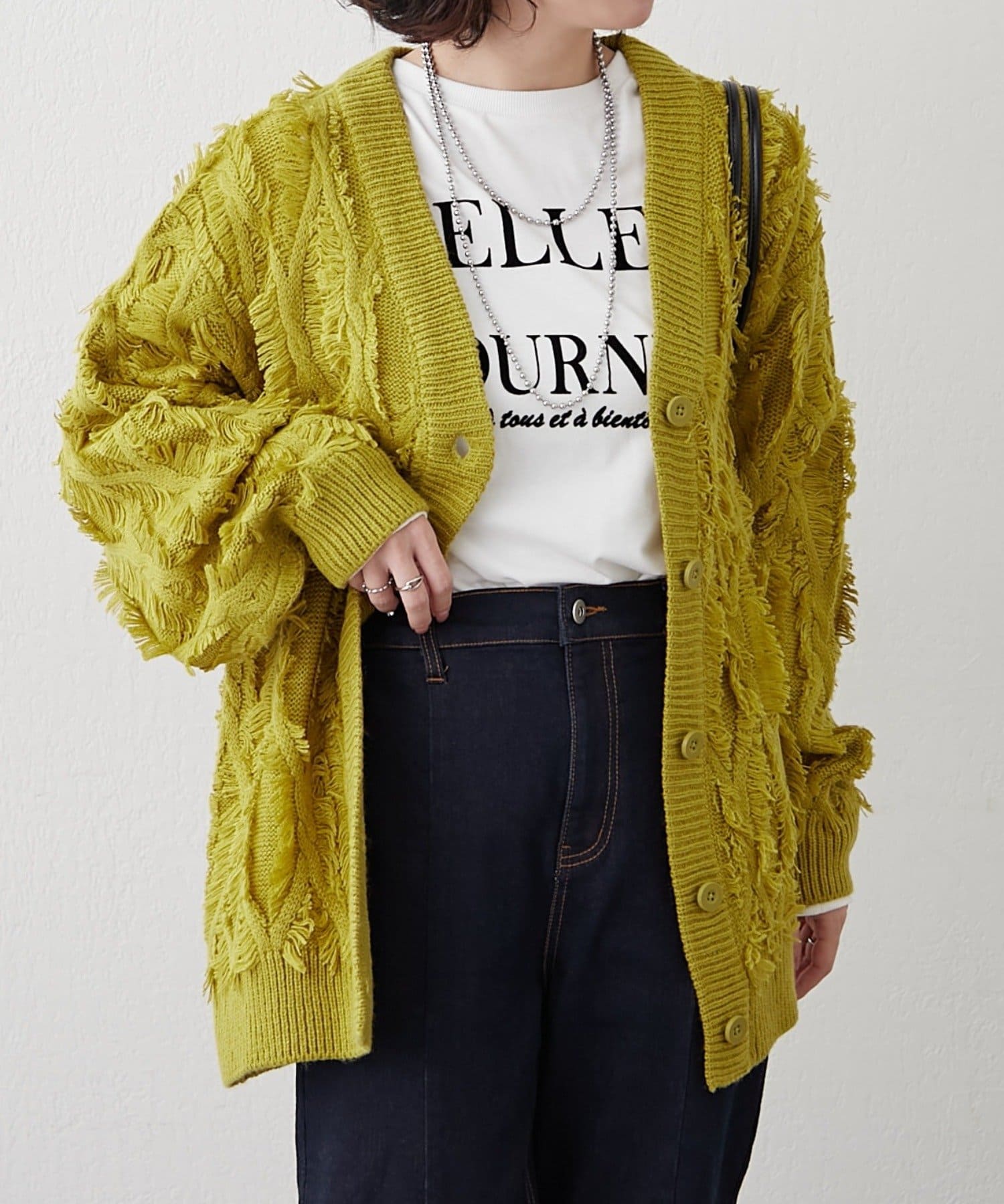 ・ざっくりとしたケーブル編みに、大胆なフリンジをあしらったニットカーディガン