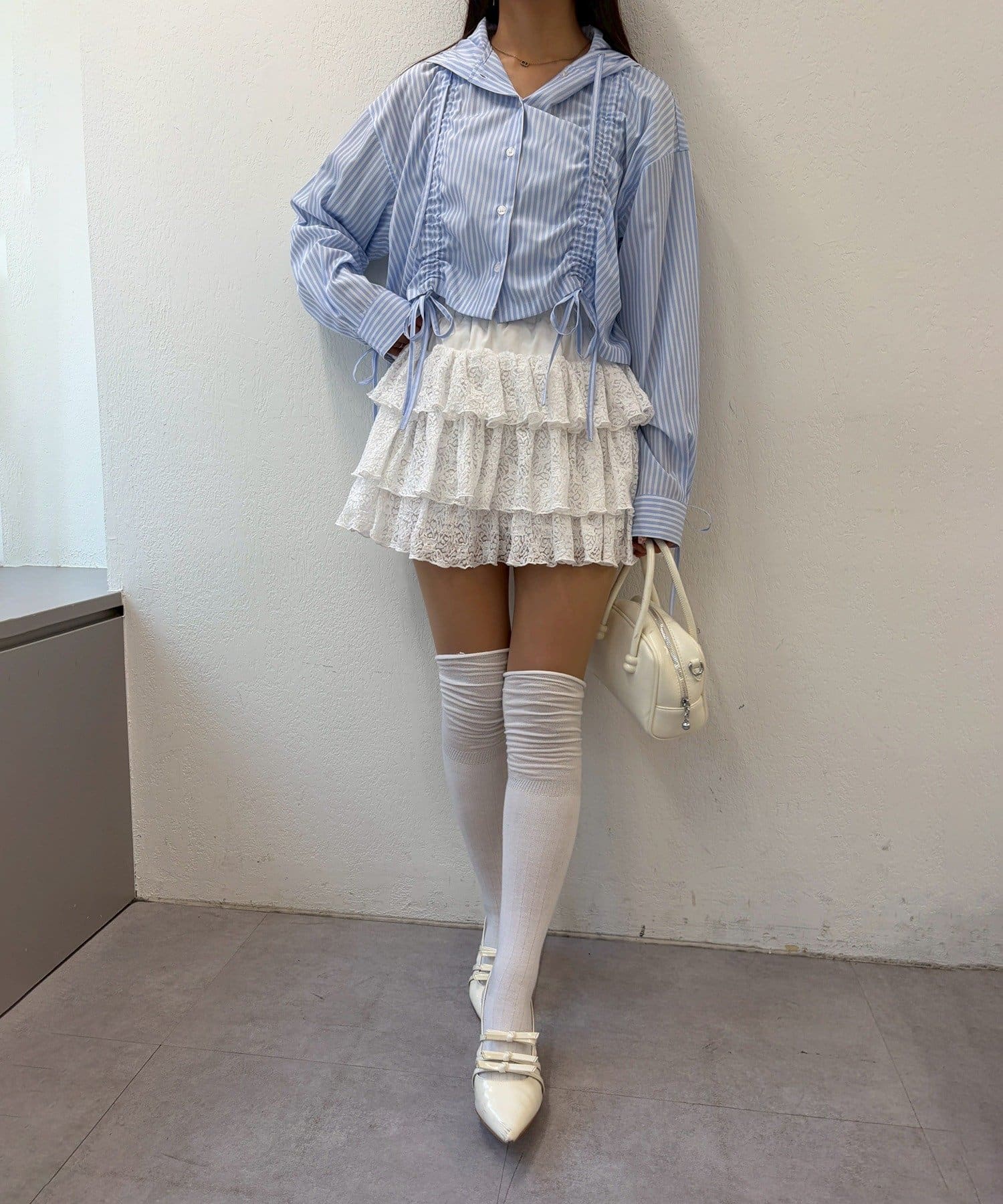 ・白のレーススカート + パステルカラーのニット + スニーカーでカジュアルガーリーな着こなし