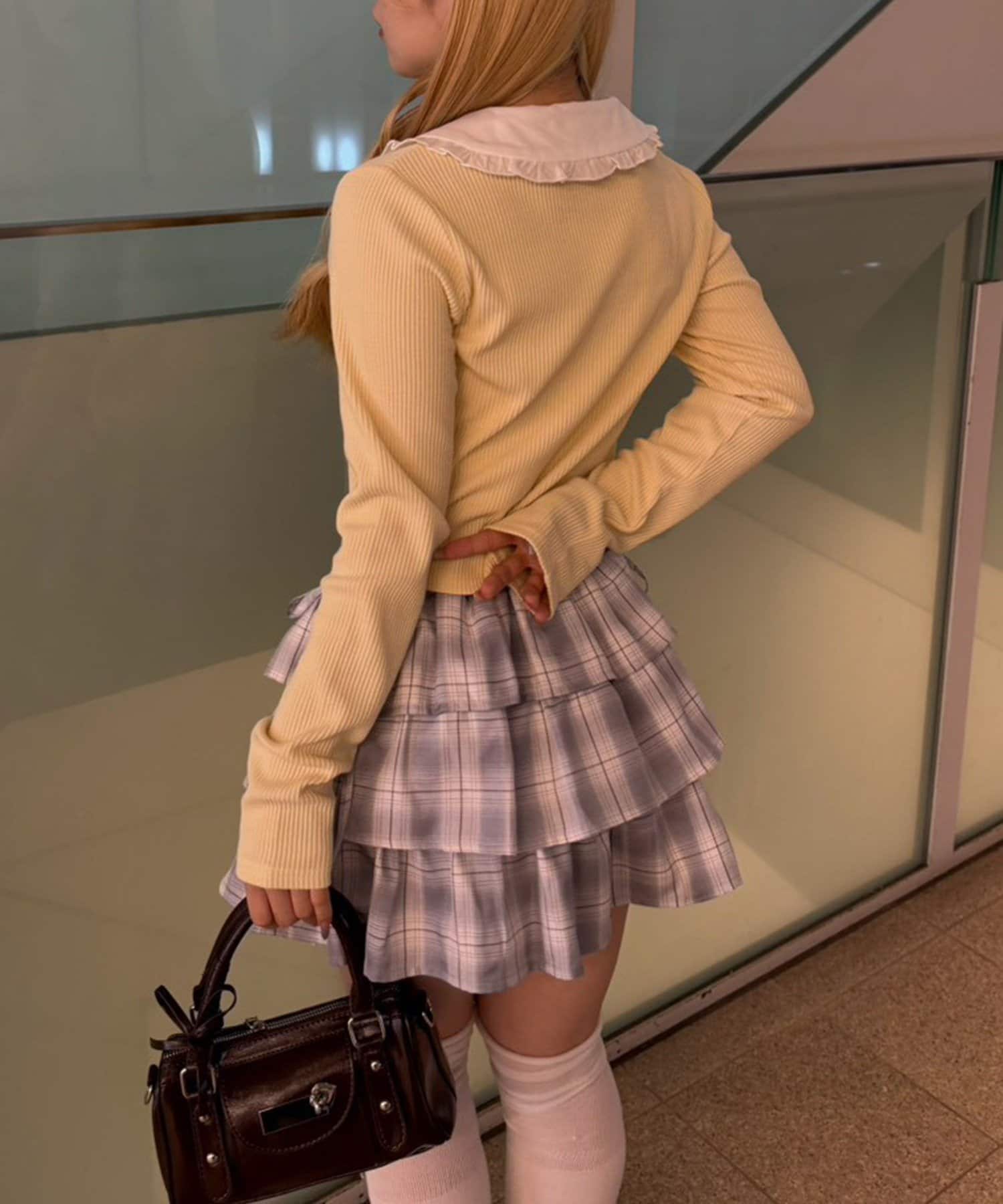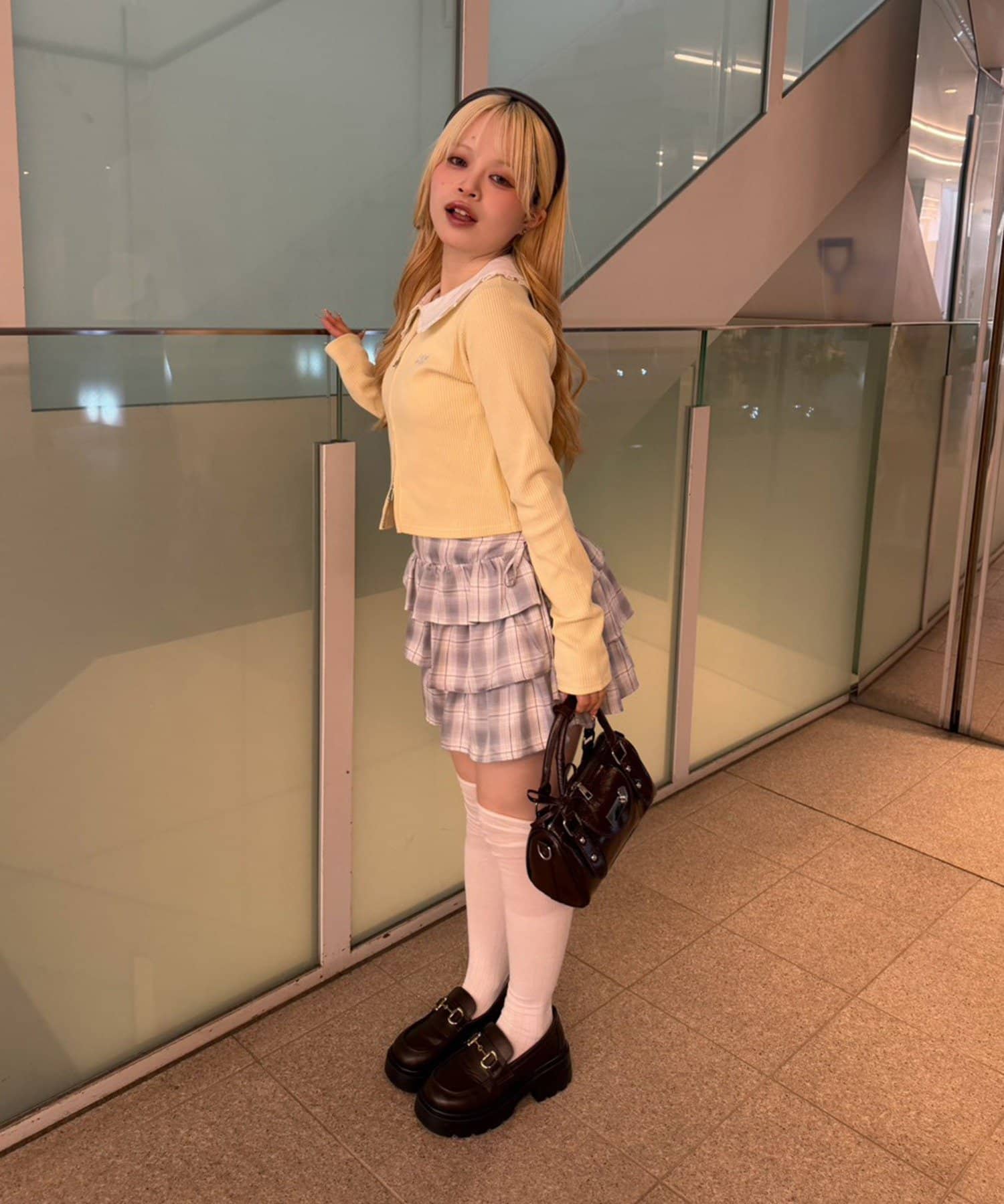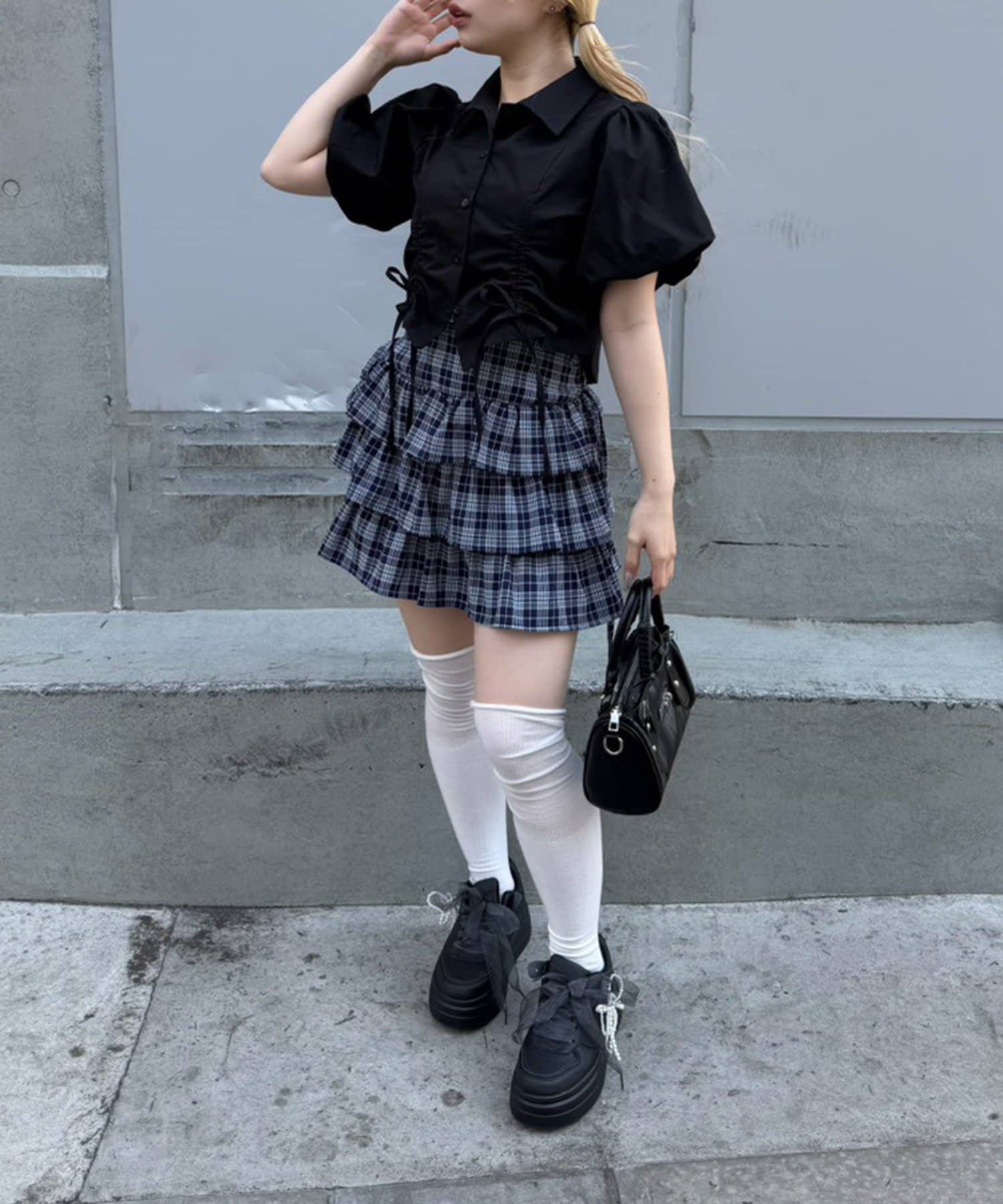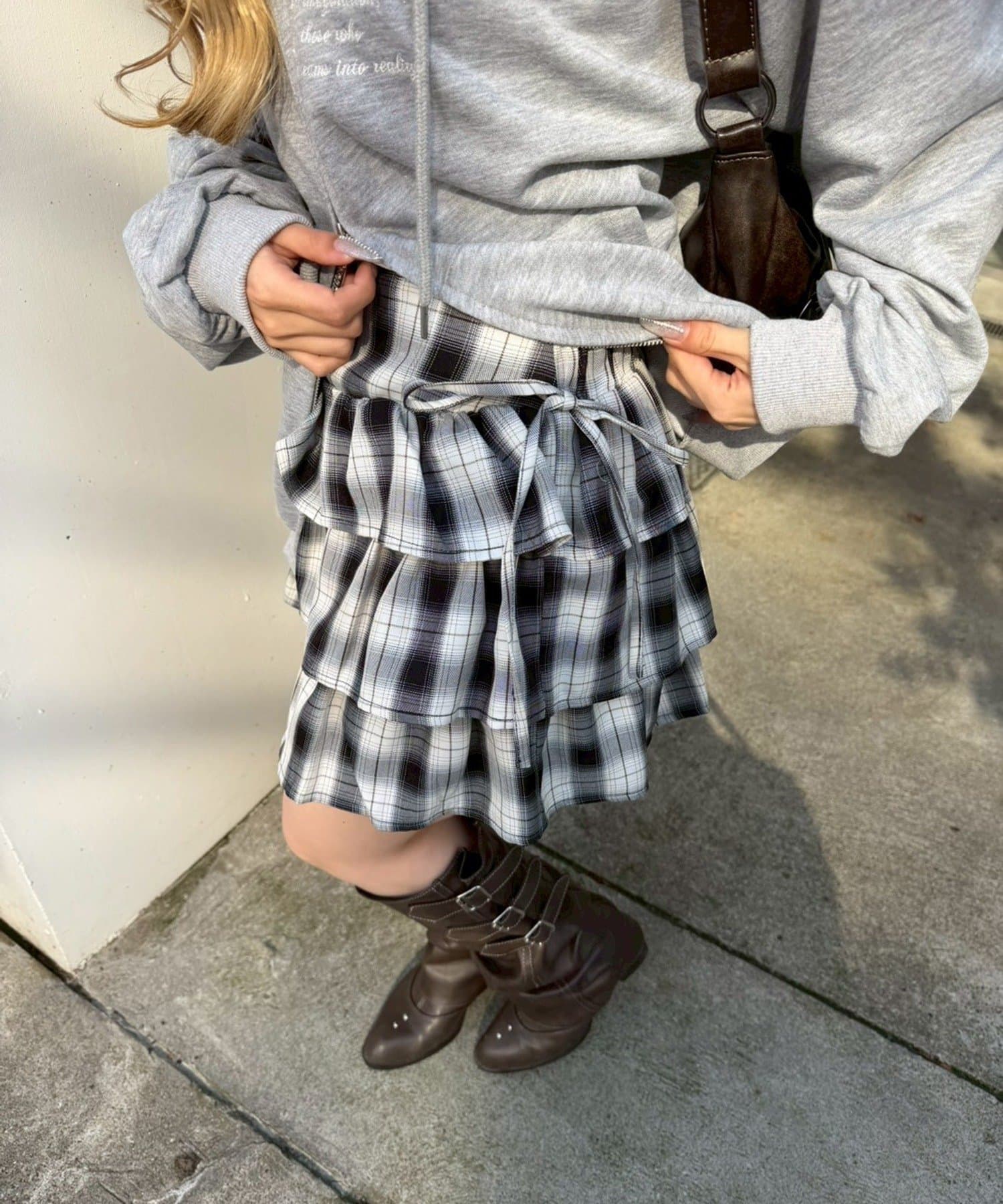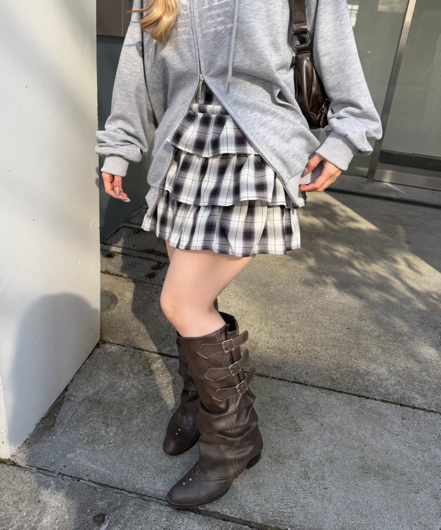 ・オーバーサイズスウェットにチェックスカート、厚底ブーツでまとめるのもイチオシ