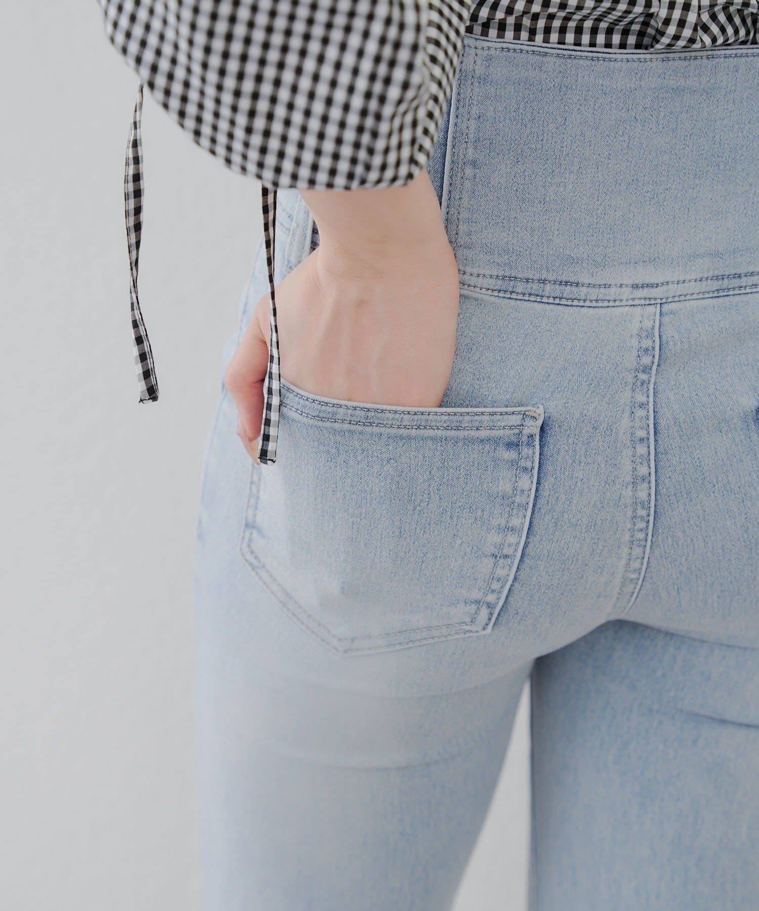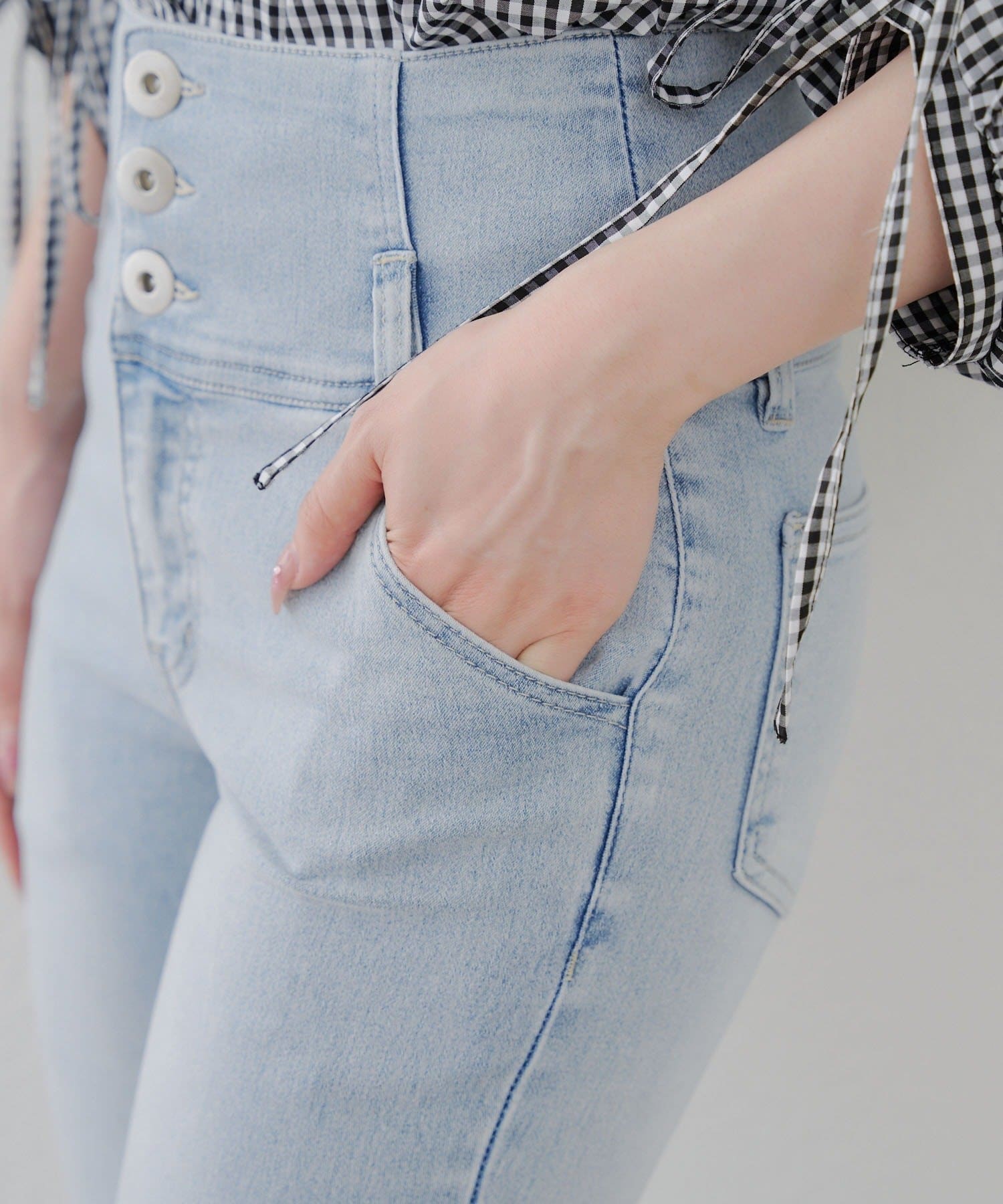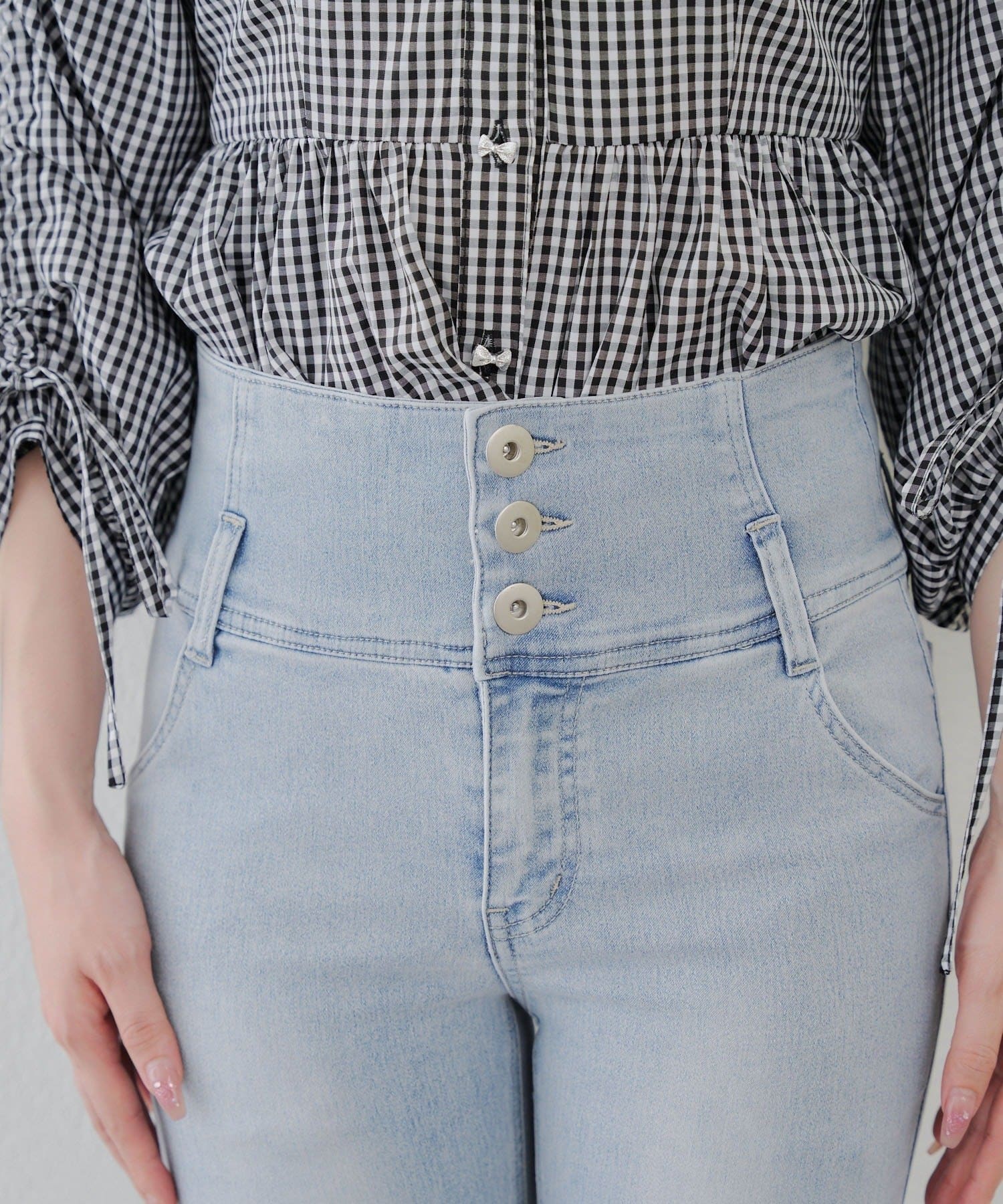 ・ハイウエストとフロントボタンが目を引く、スタイルアップ効果抜群のデニムパンツ