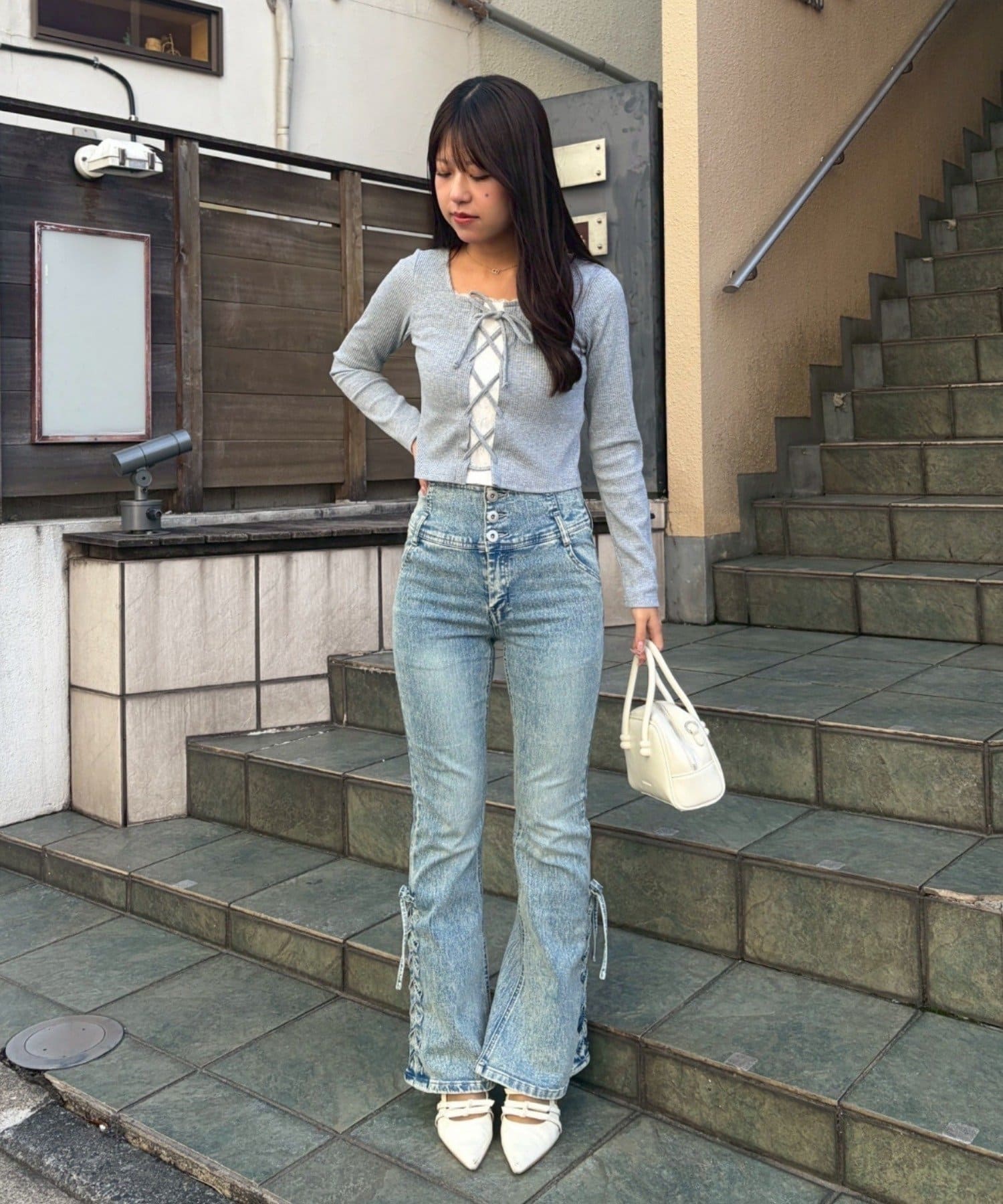• NICE CLAUP / OLIVE des OLIVE OUTLET(ナイスクラップ  / オリーブ デ オリーブ アウトレット) 【ANOTHER BRANCH】【マイナス5㎏見え】サイドレースUPフレアデニム