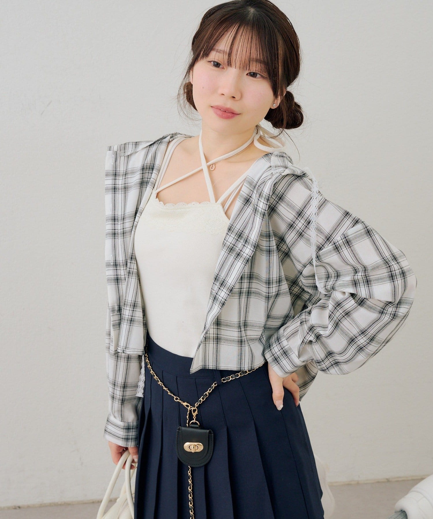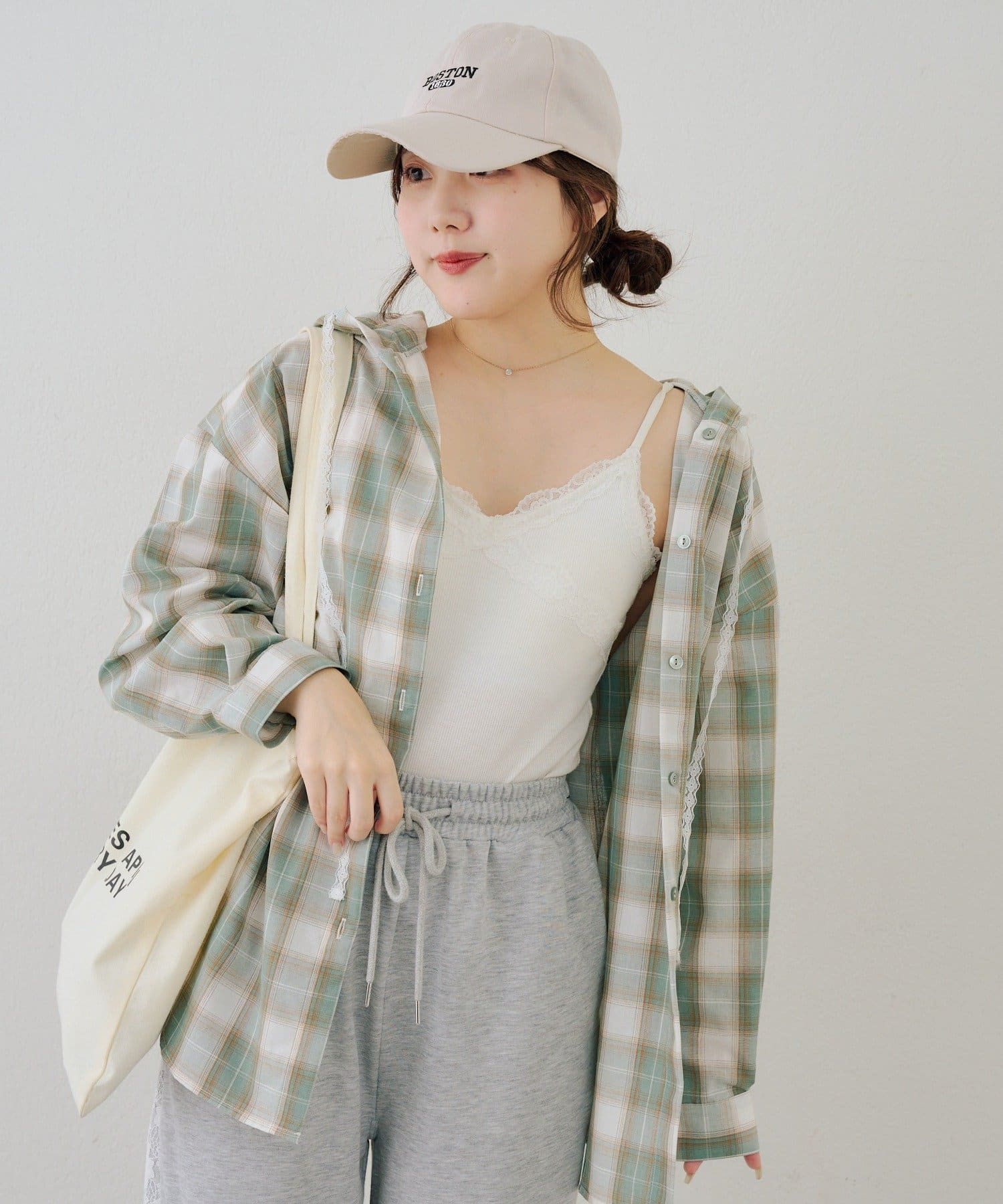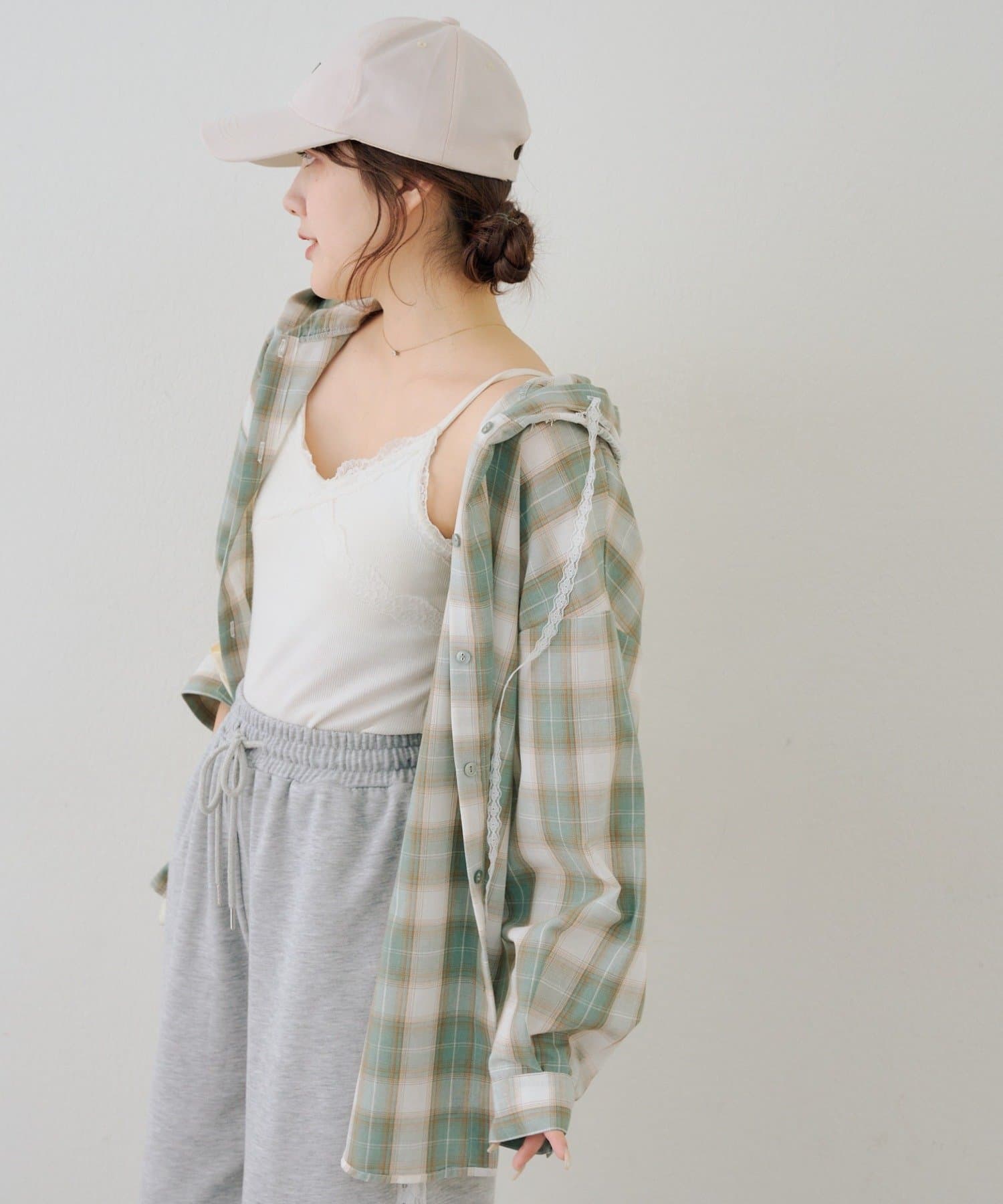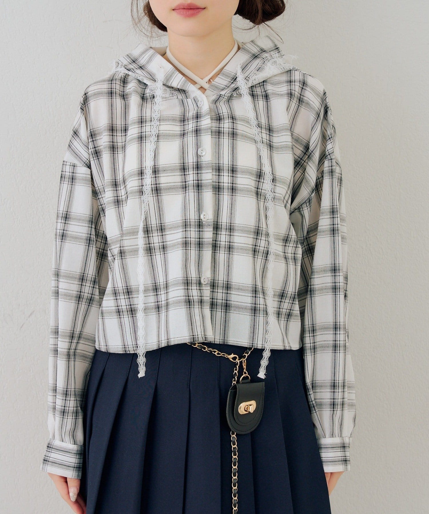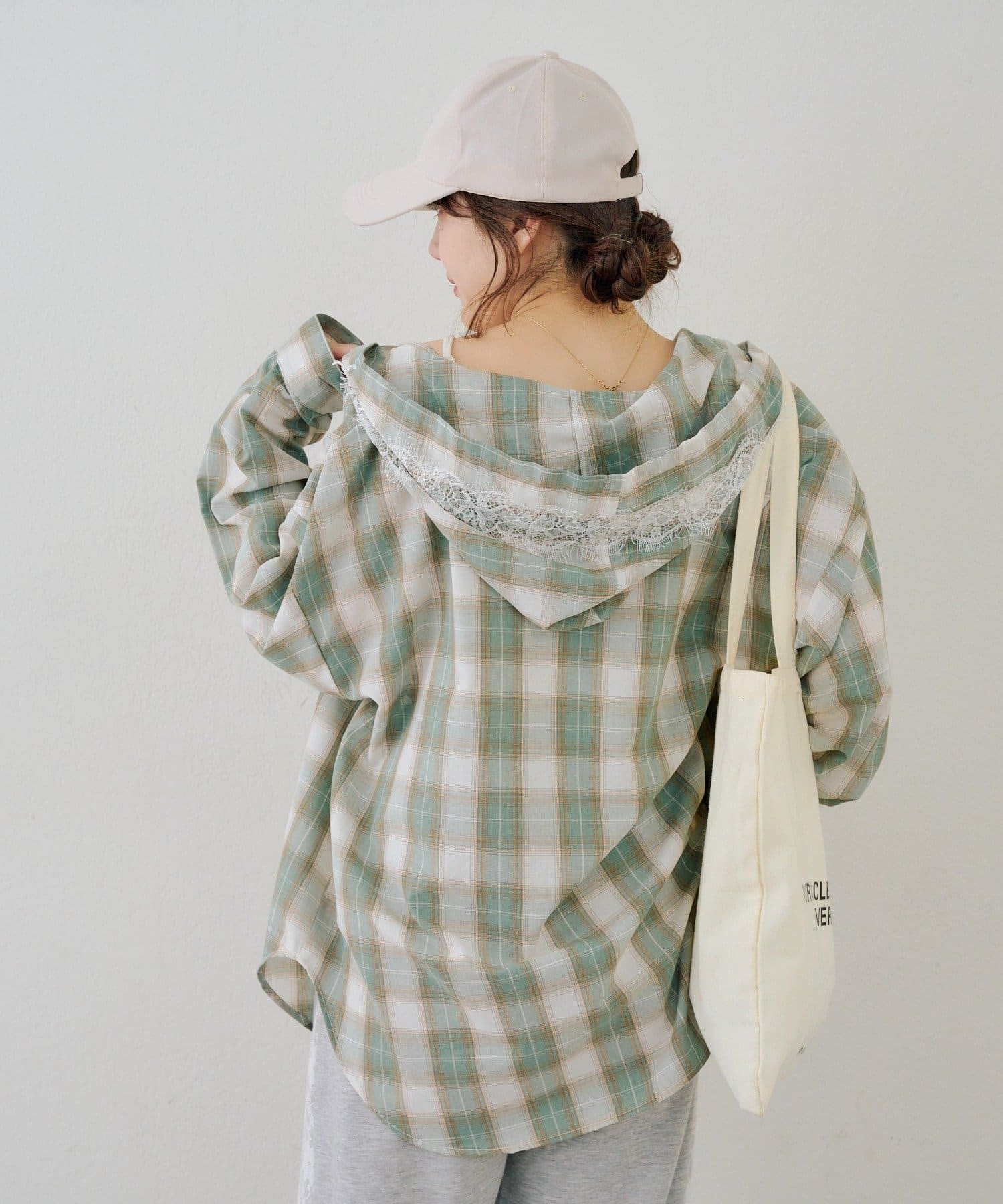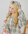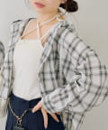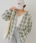 ・コーデのポイントになる、フード付きのチェック柄ブラウス