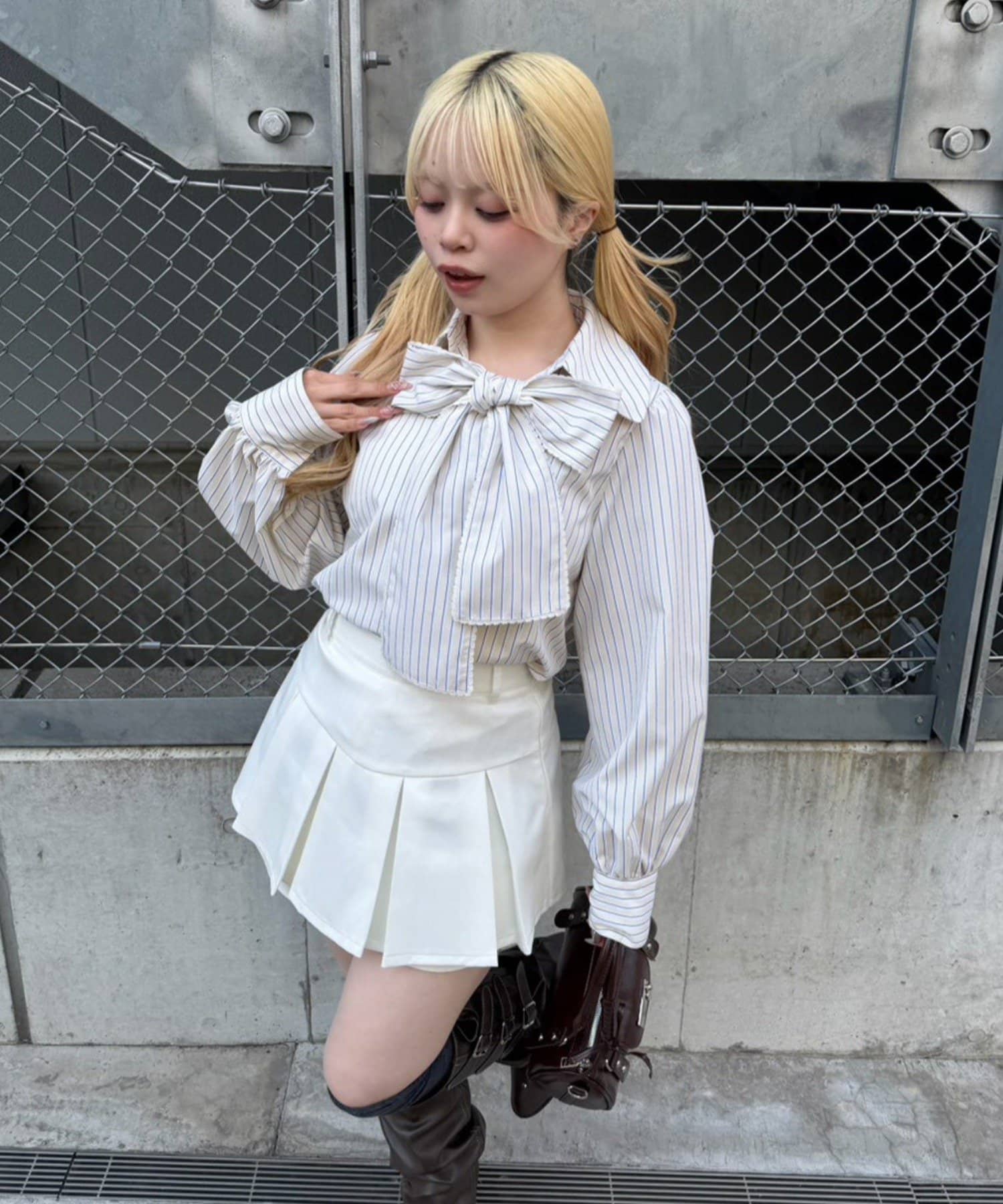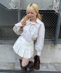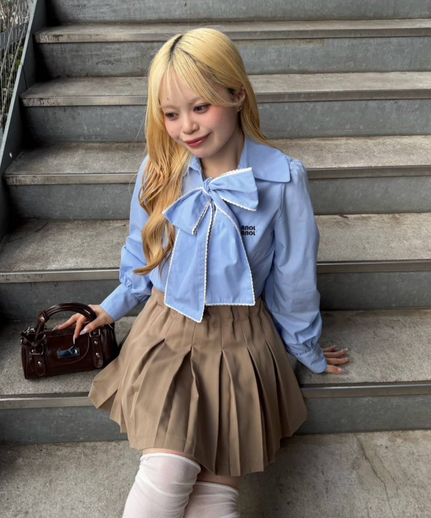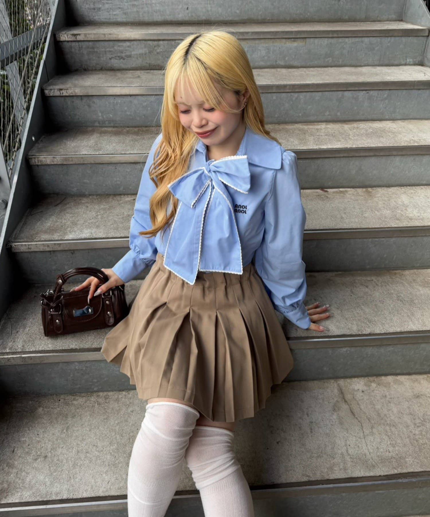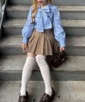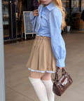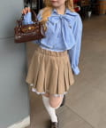・ブラウスにデニムスカートを合わせ、スニーカーでカジュアルダウン