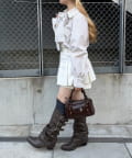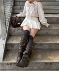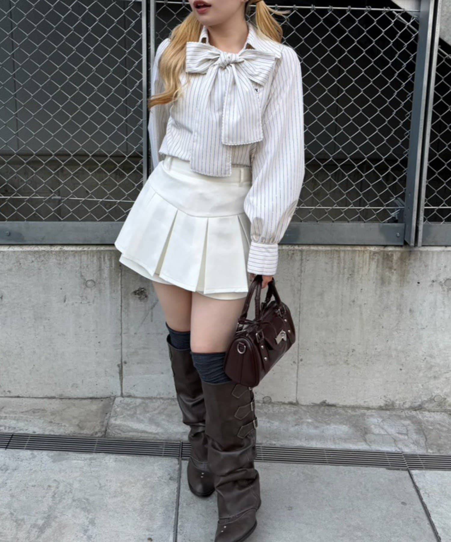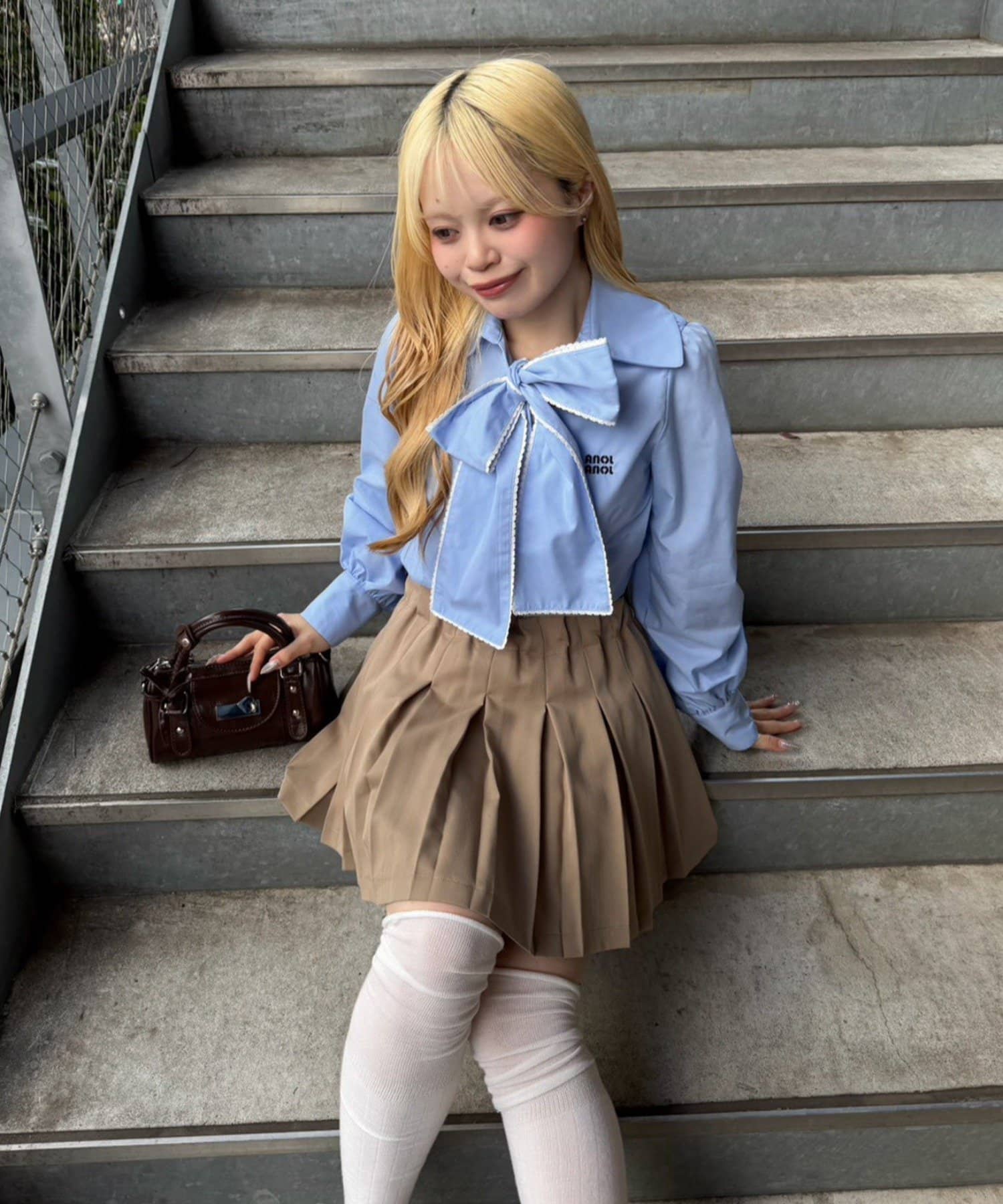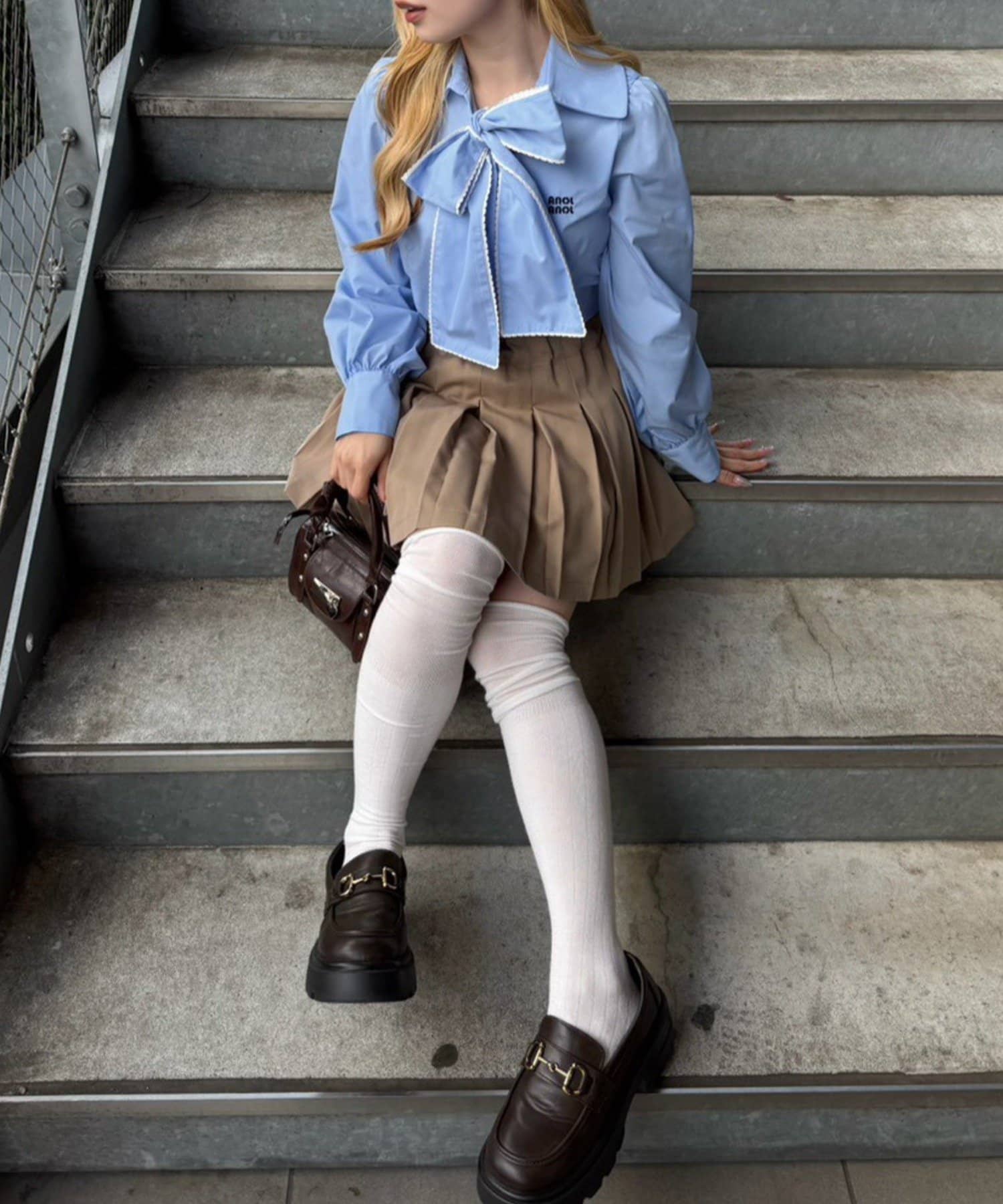 ・ブラウスにデニムスカートを合わせ、スニーカーでカジュアルダウン