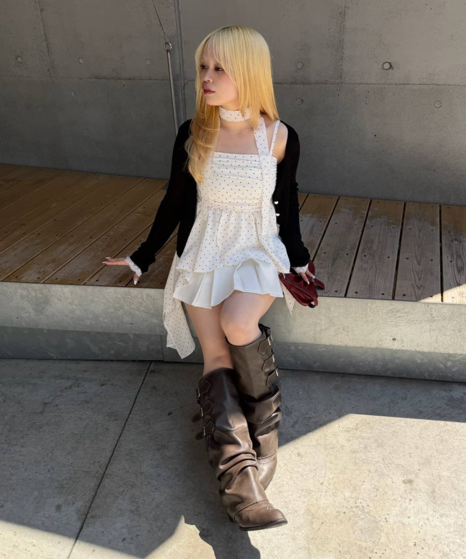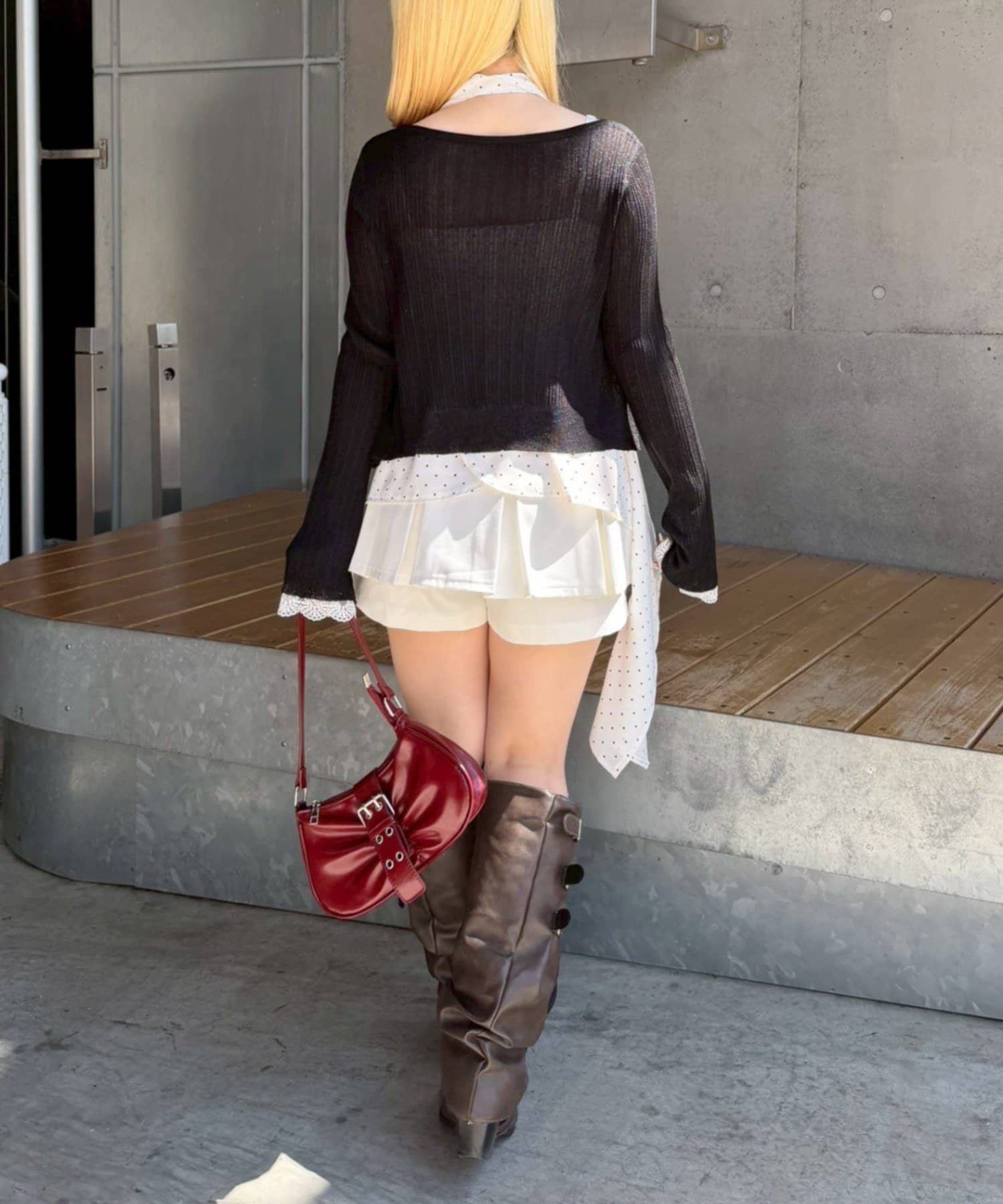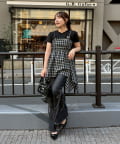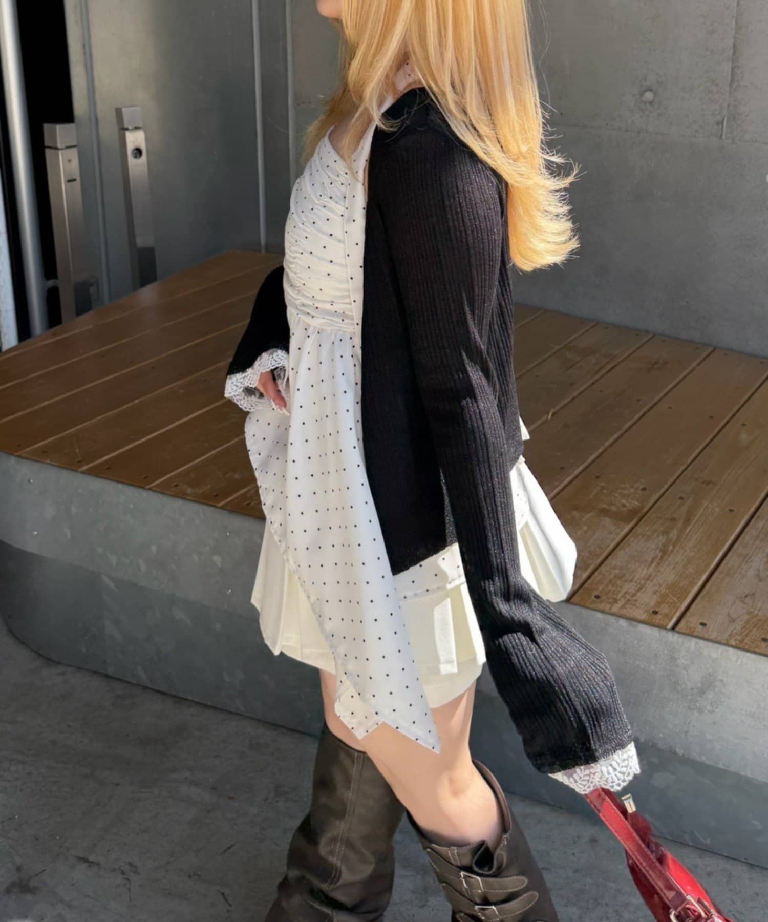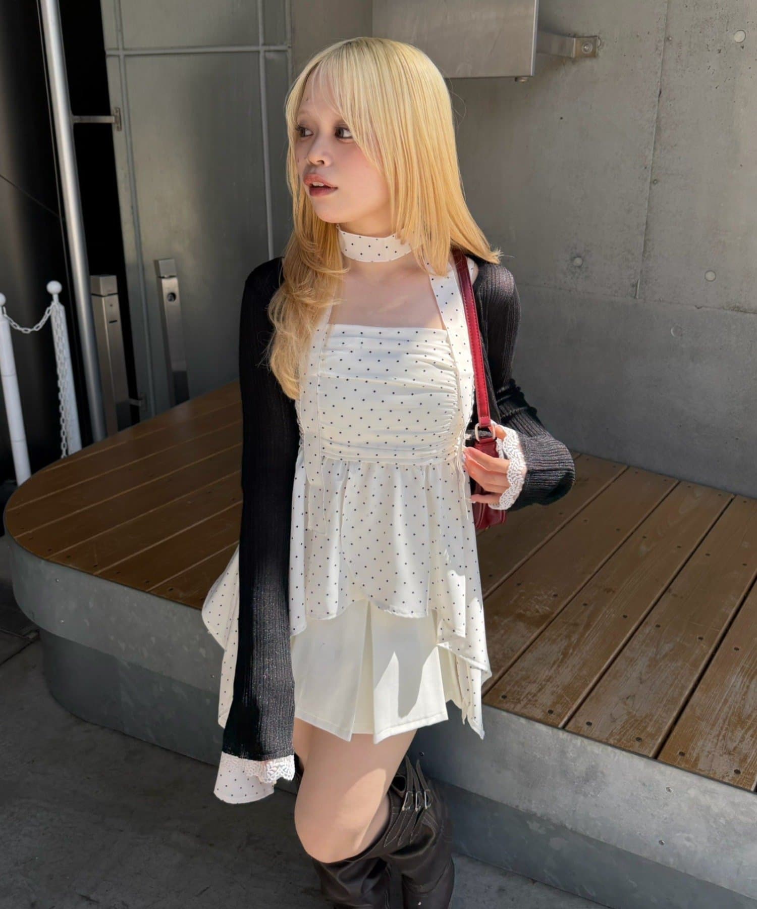 ・胸元のシャーリングがフェミニンな雰囲気をプラス