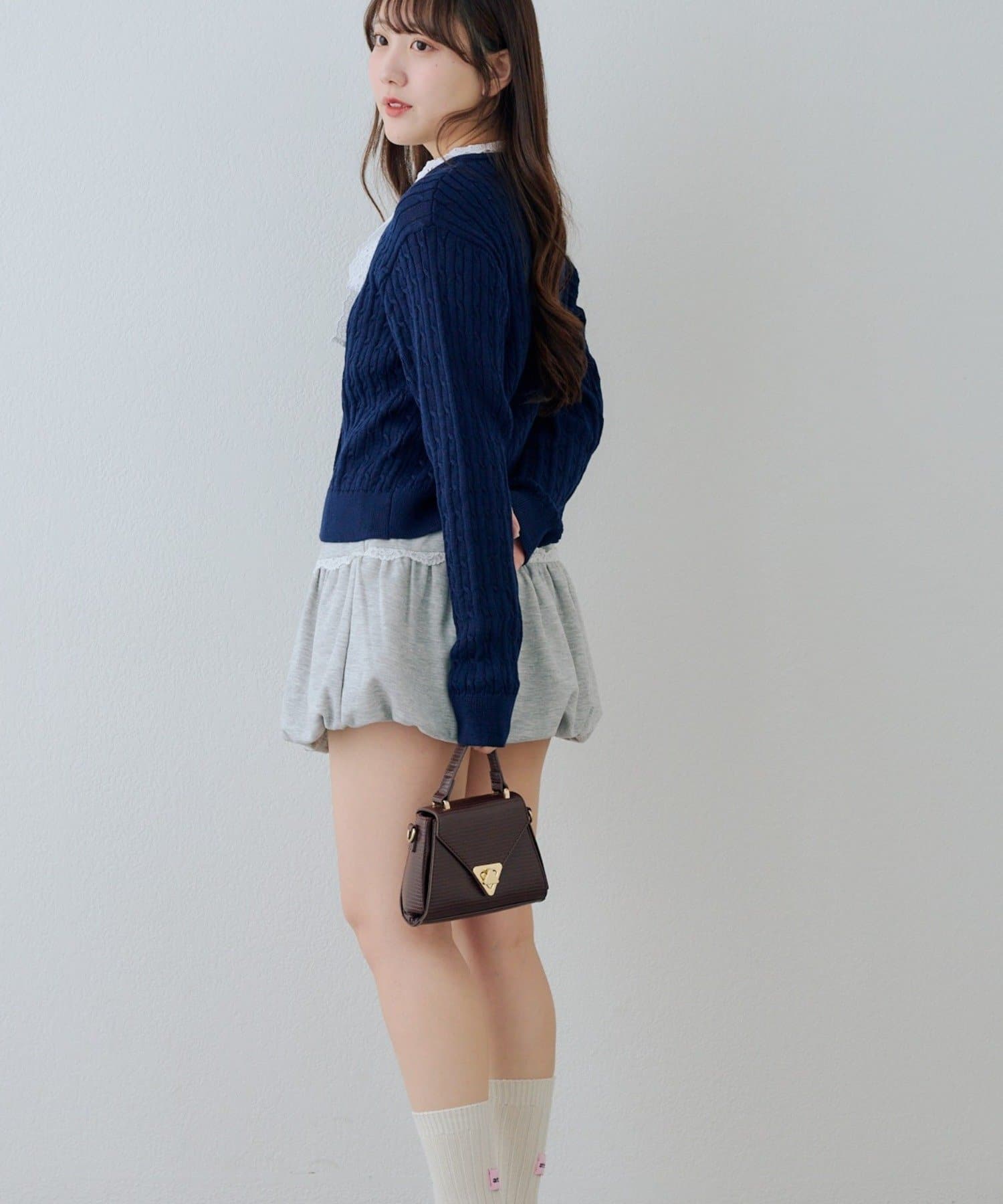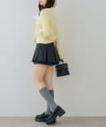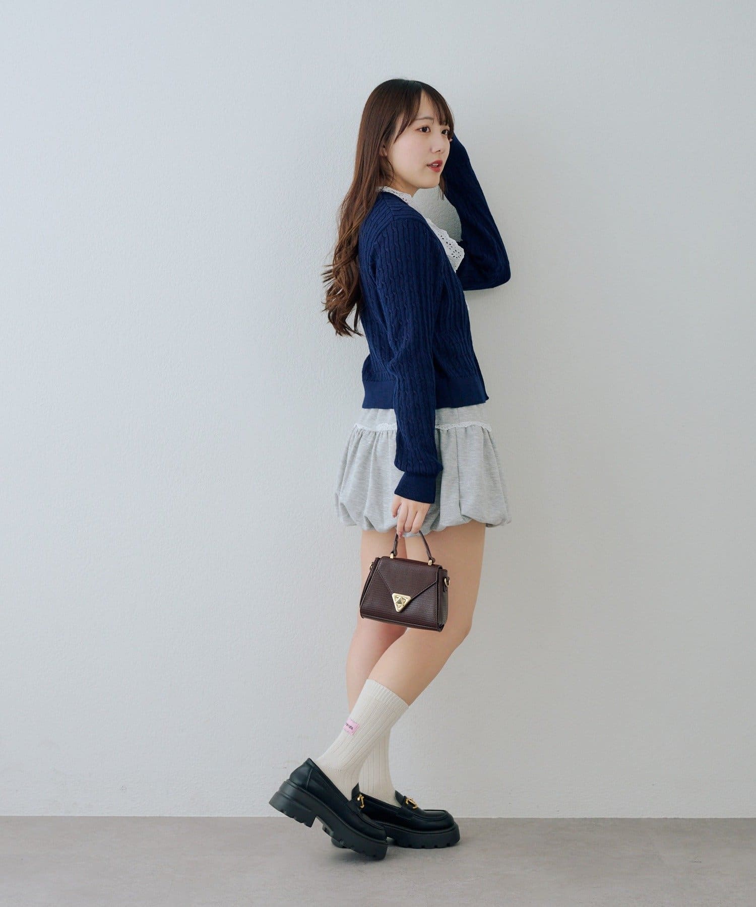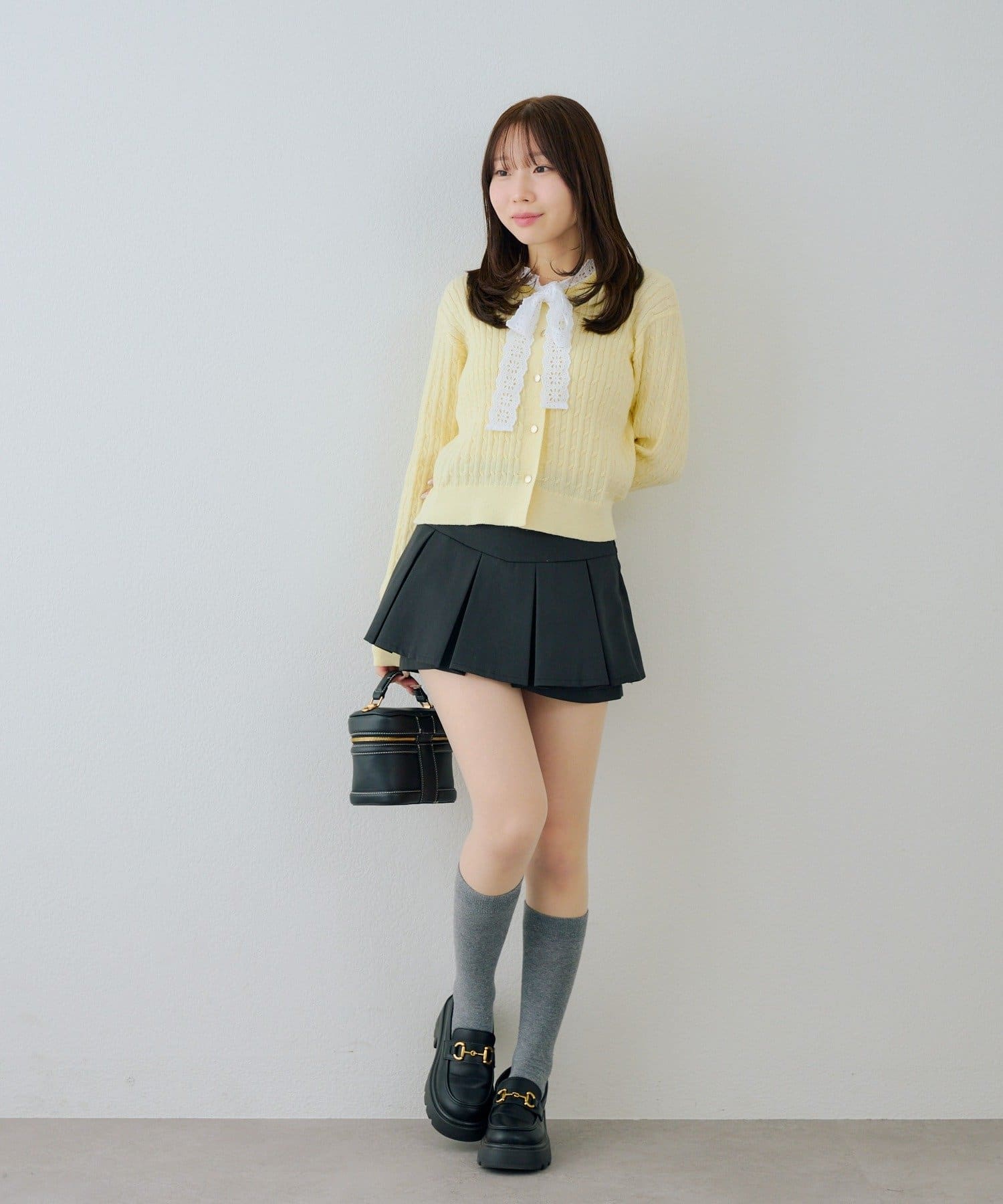 ・カーディガンに淡い色合いのスカートを合わせて、優しい雰囲気に。足元はバレエシューズで軽やかに
