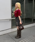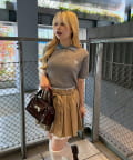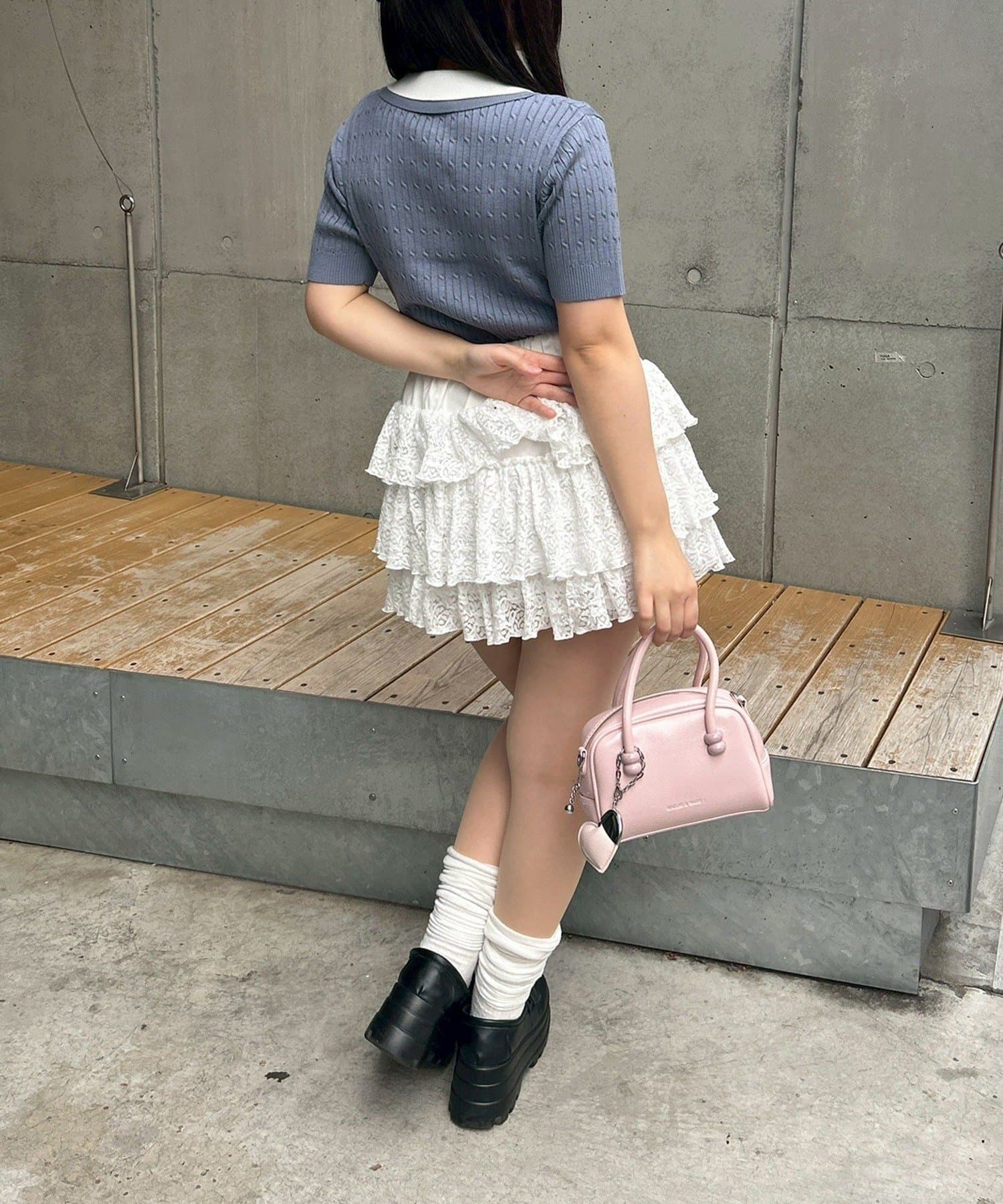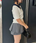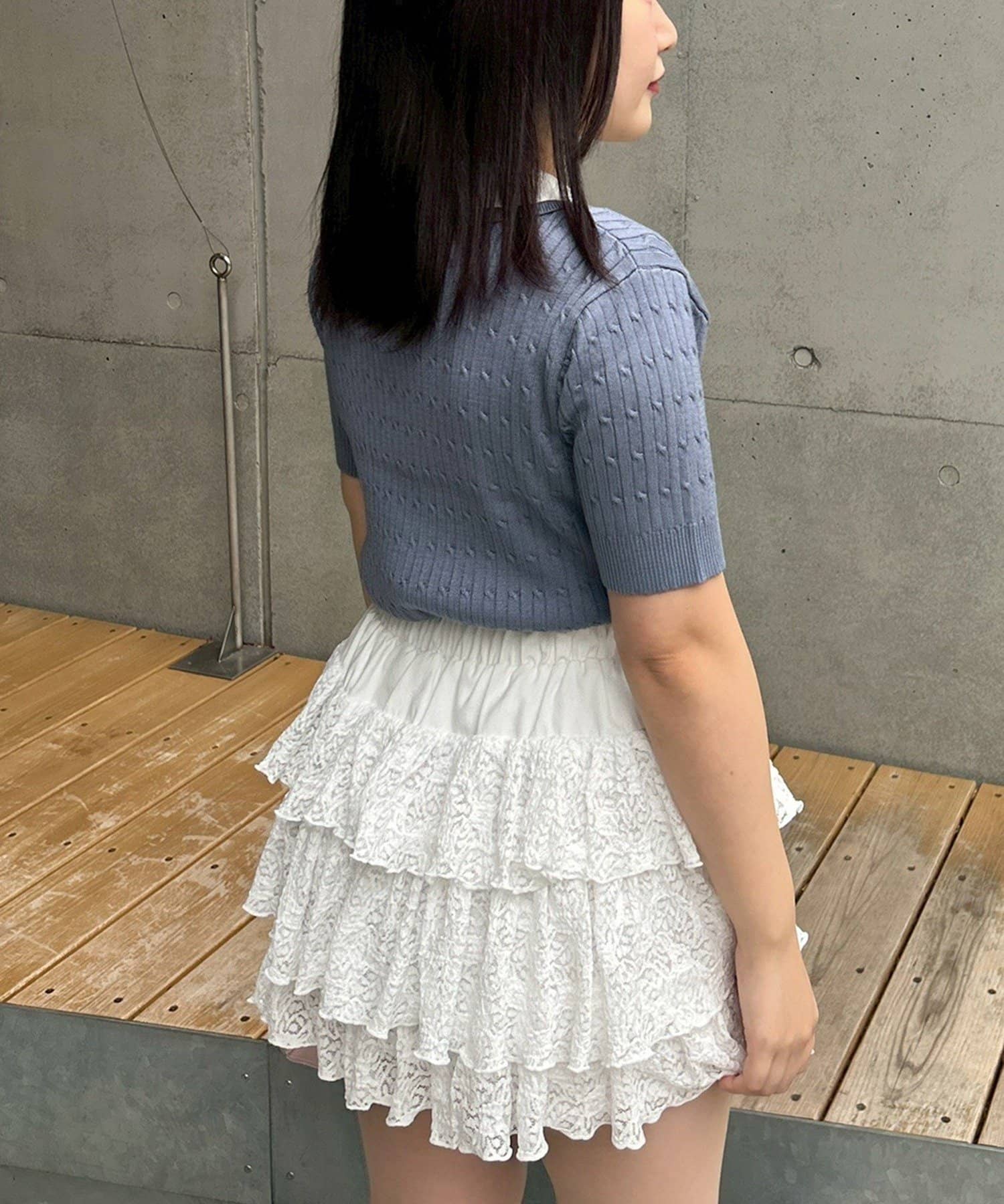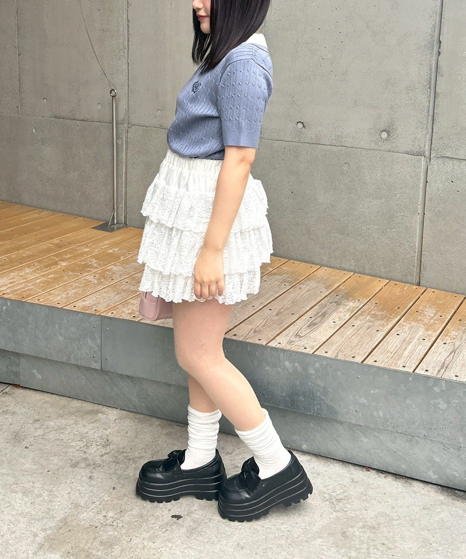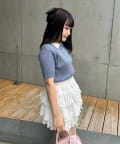 ・フレアスカートと合わせて、上品なフェミニンスタイルに。足元はパンプスでレディライクにまとめて