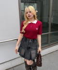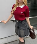 ・襟元の配色とハート型のボタンが、さりげないアクセントに
