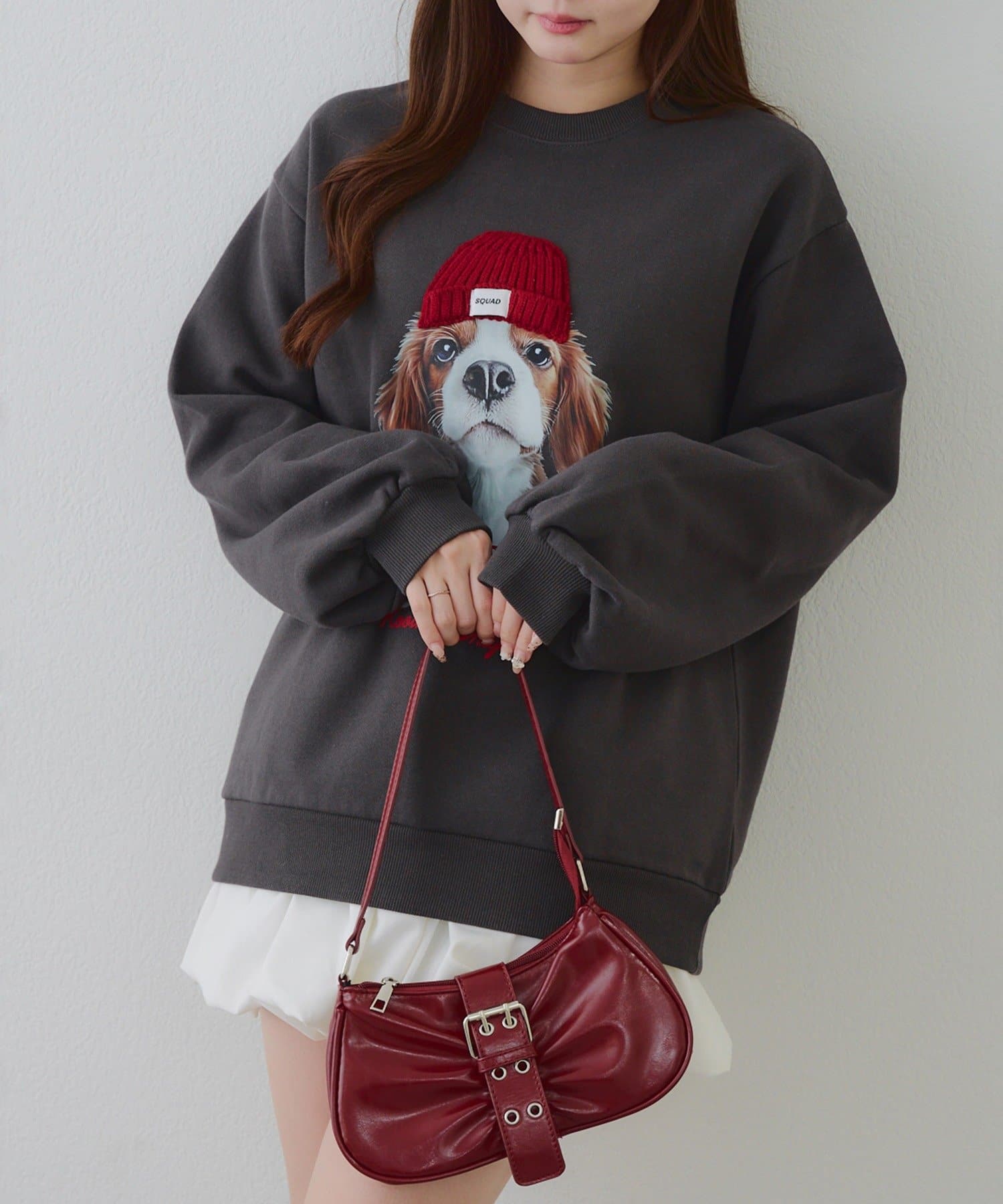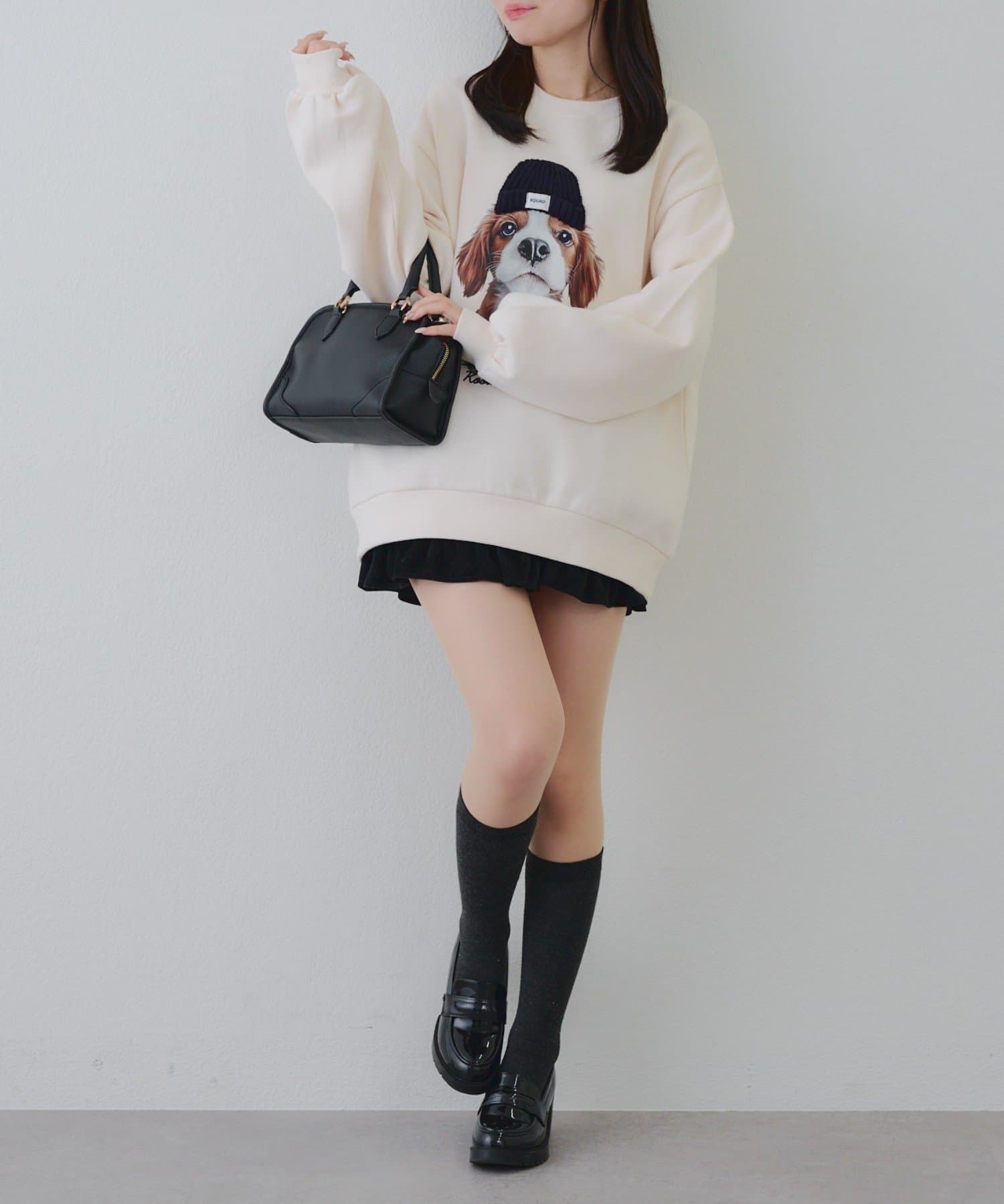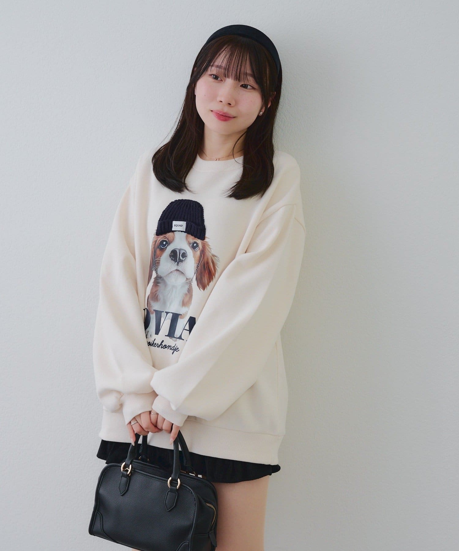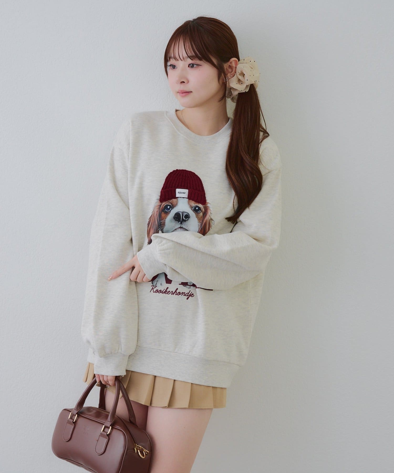 ・本物みたいなニット帽がユニークなデザインの犬プリントスウェット