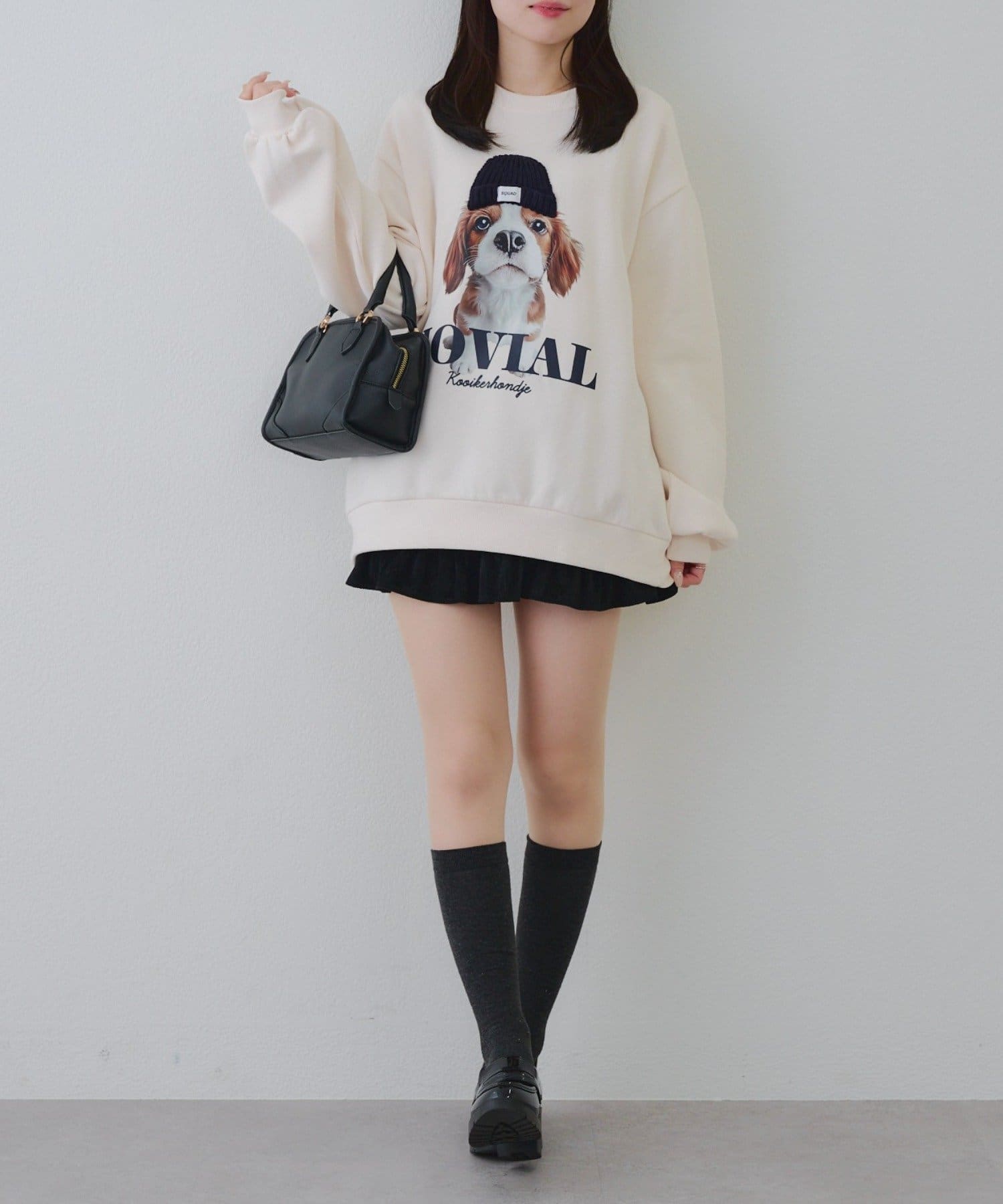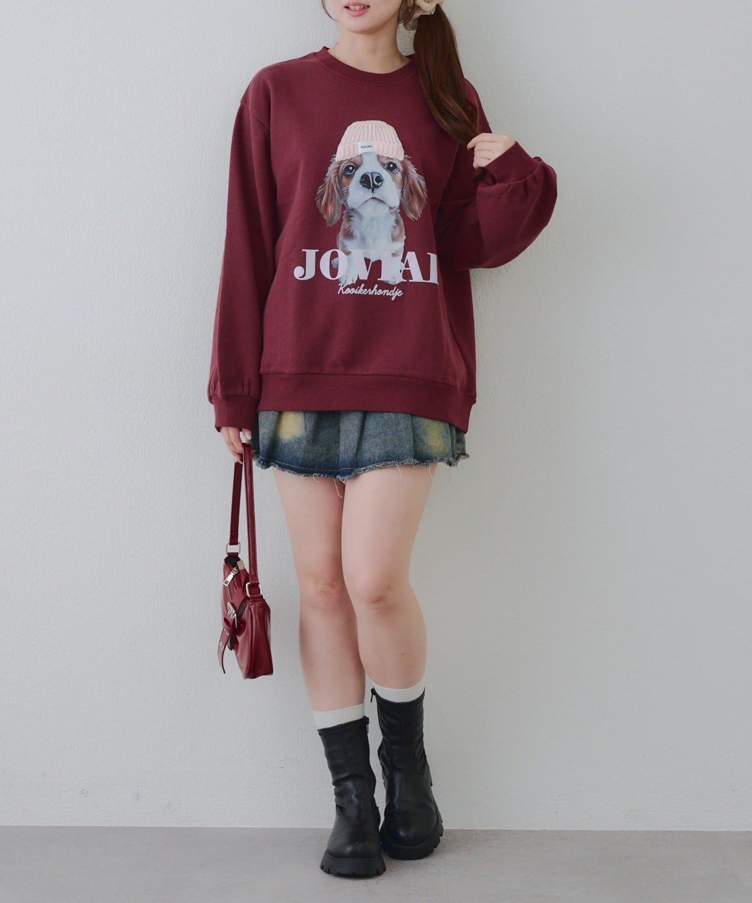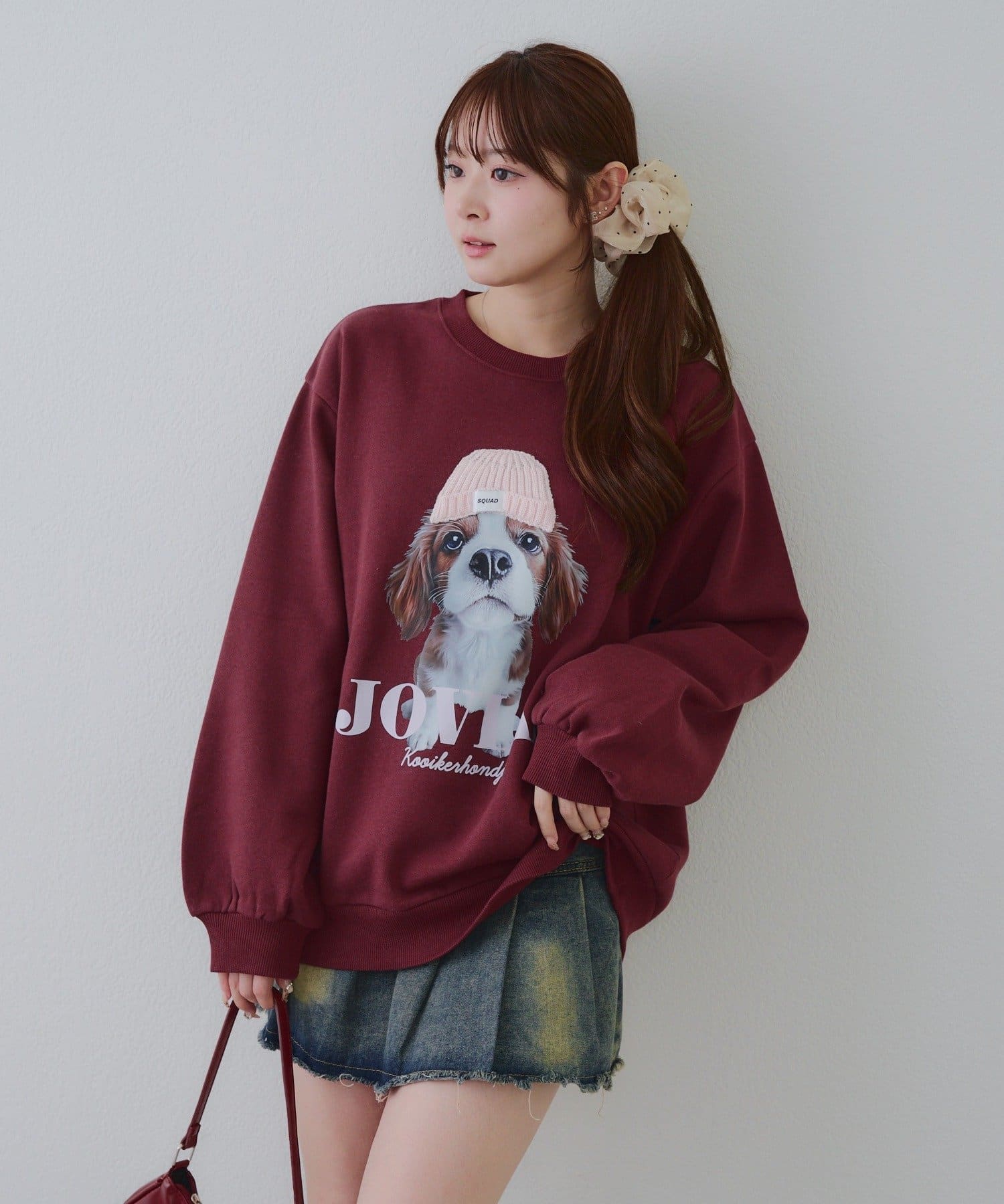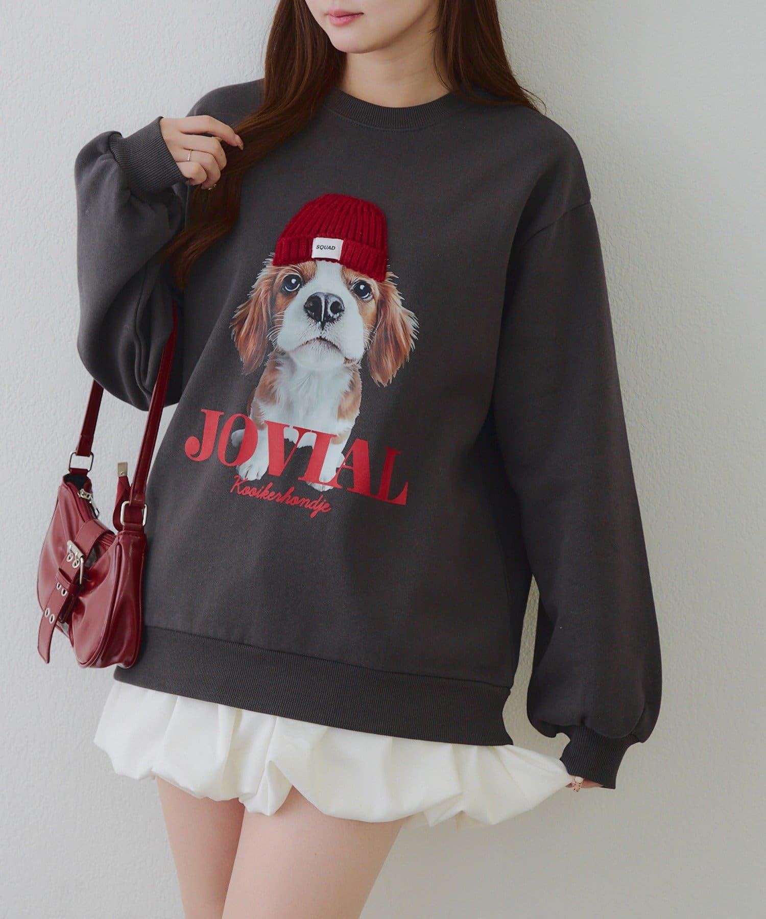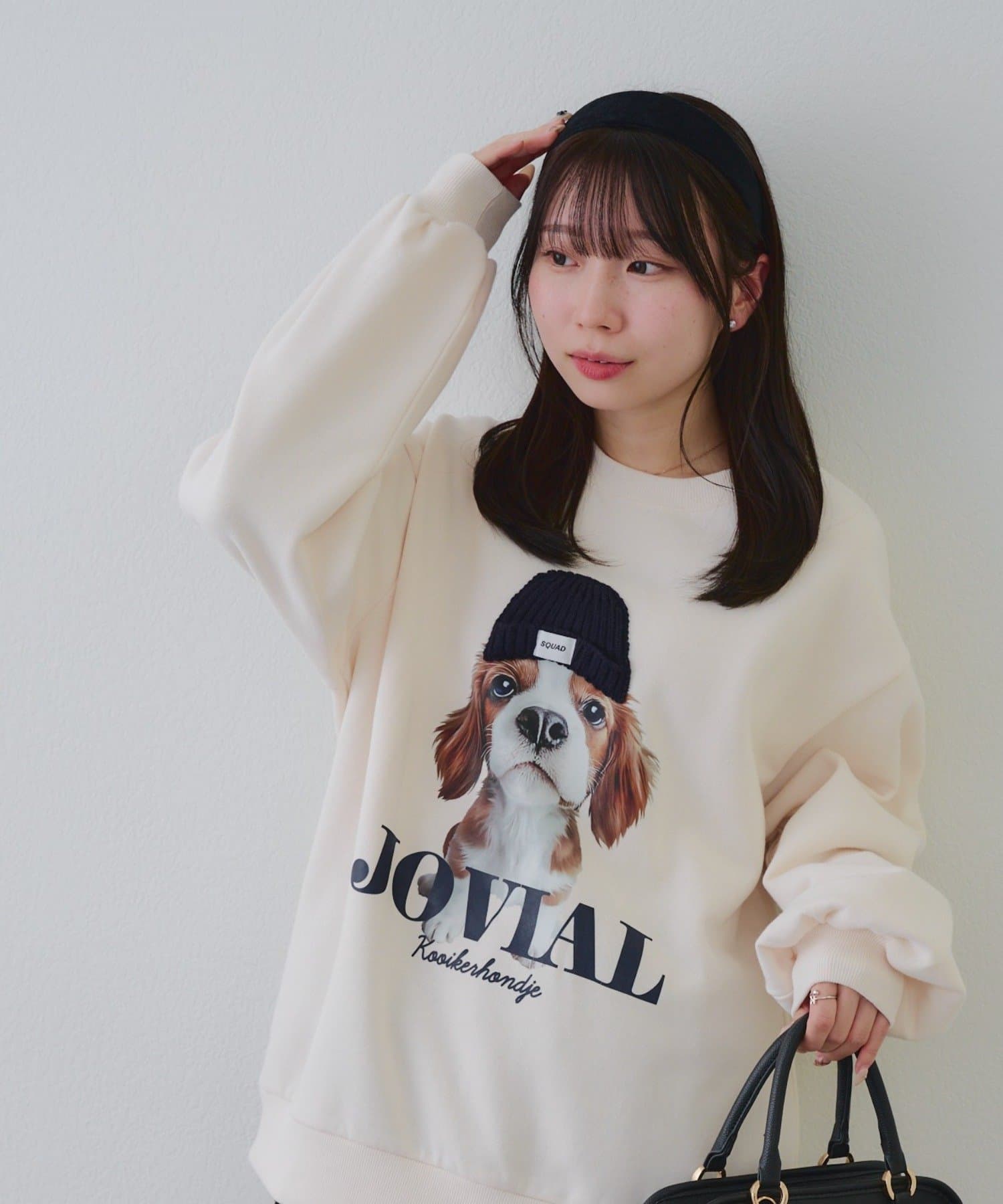 ・本物みたいなニット帽がユニークなデザインの犬プリントスウェット