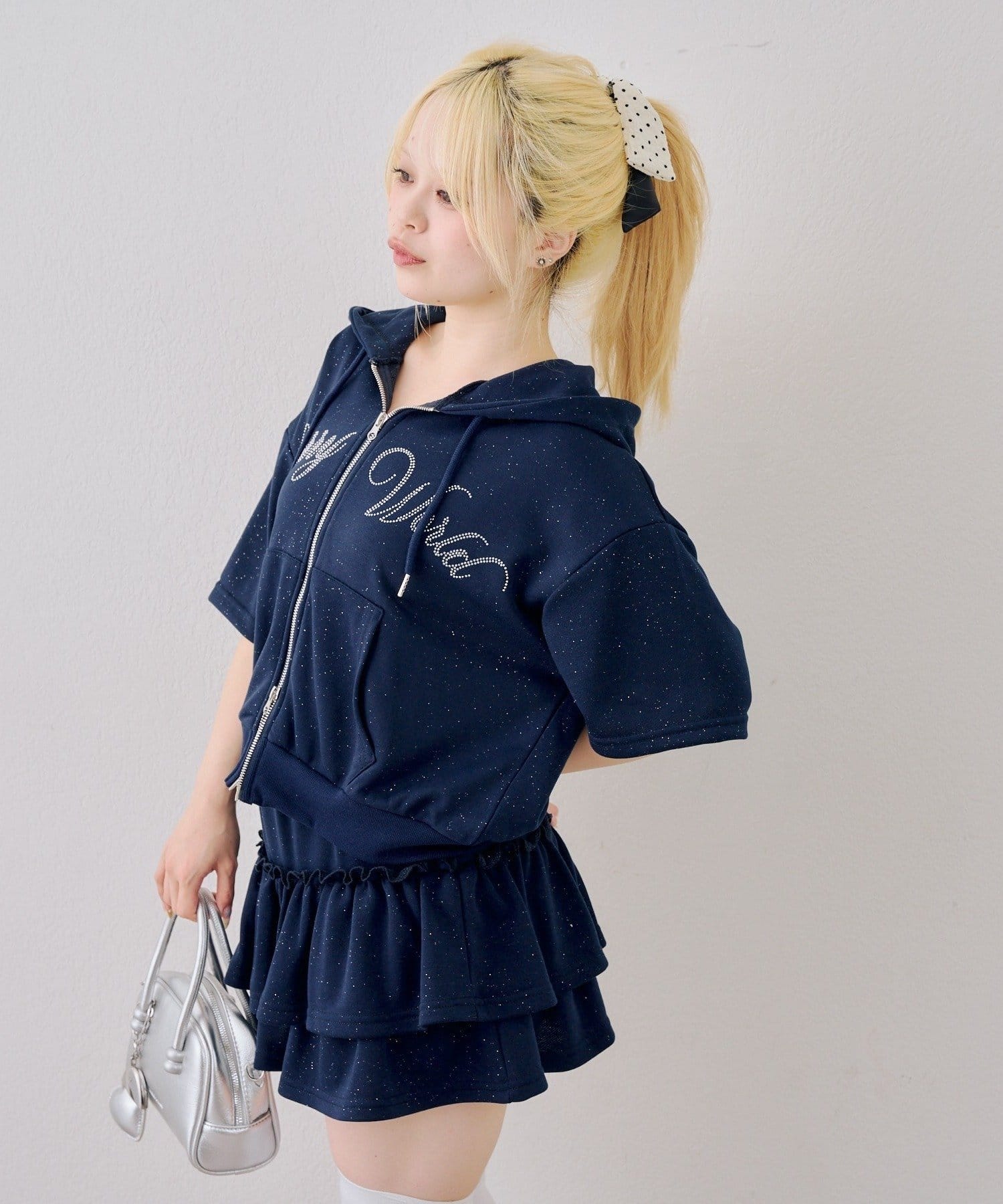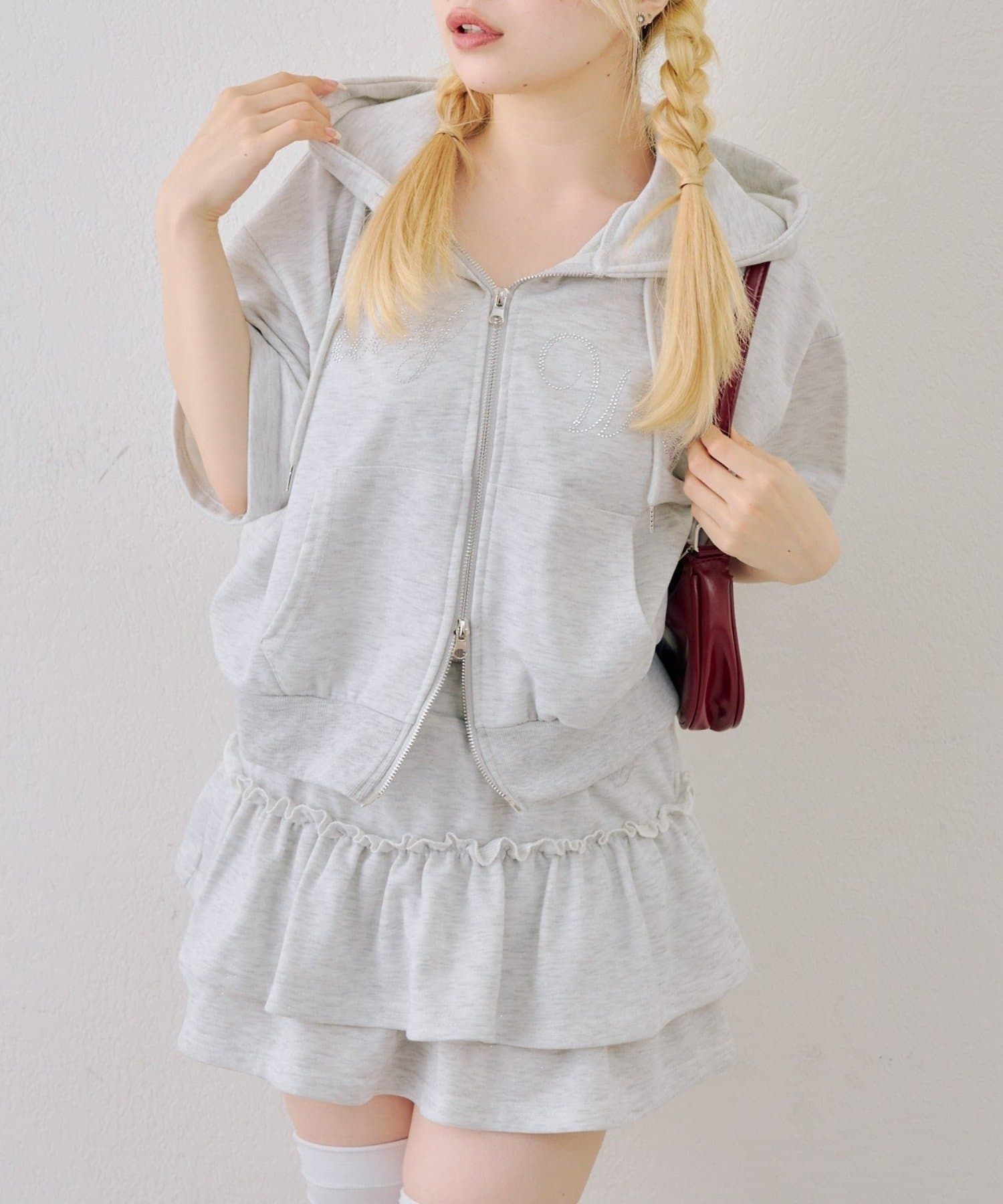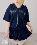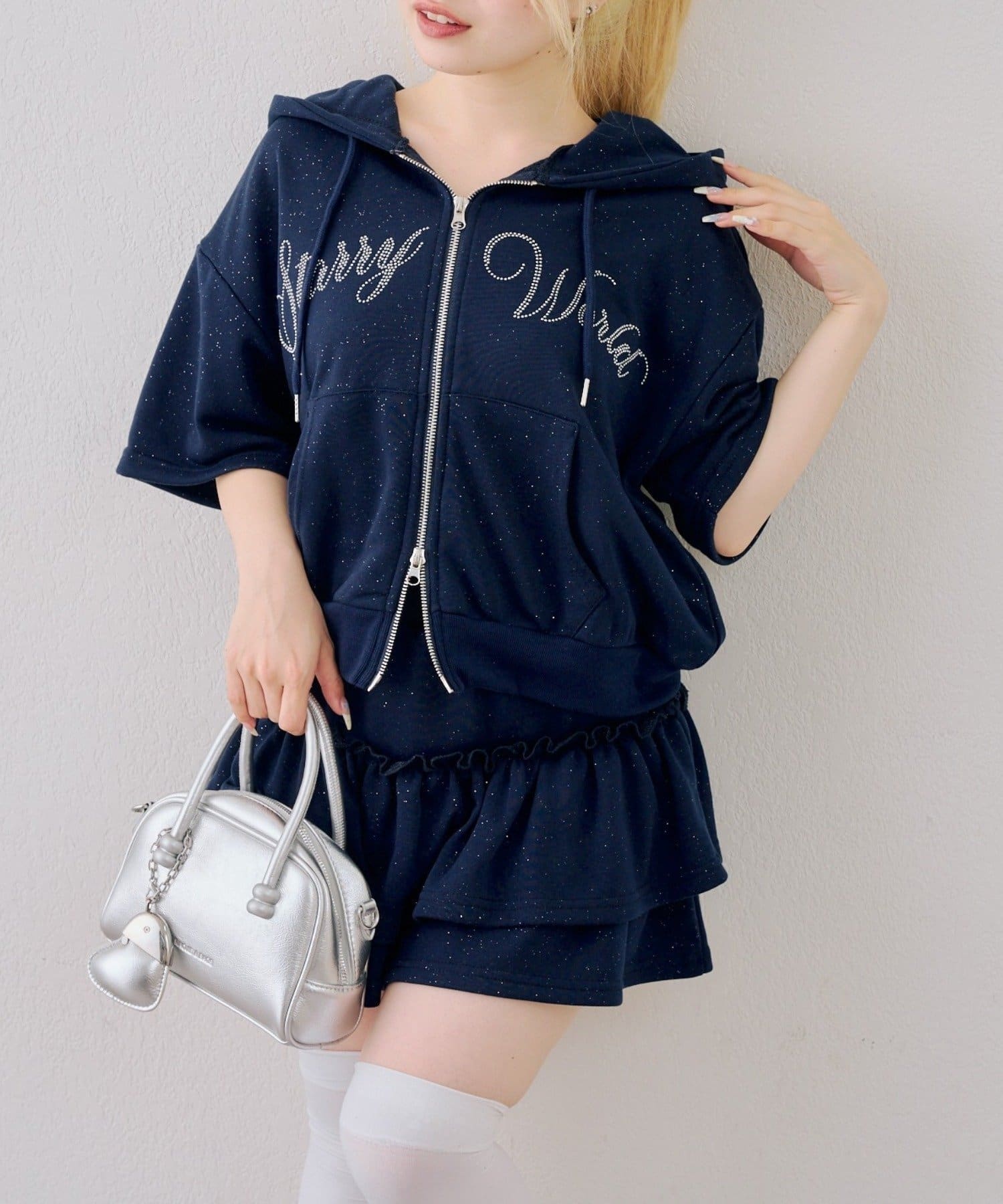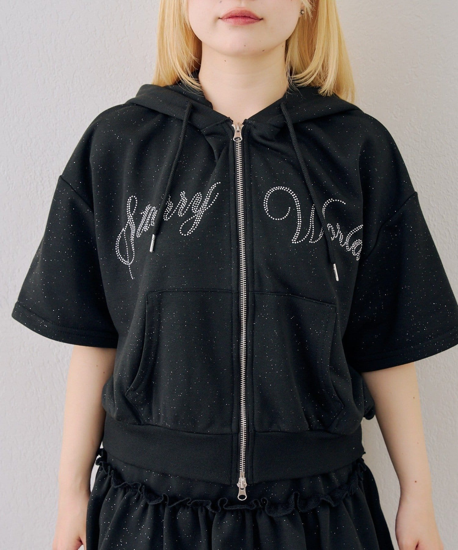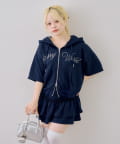 ・フロントのロゴがキラキラと輝き、遊び心と大人っぽさを兼ね備えた半袖スウェットパーカーとスカートのセット