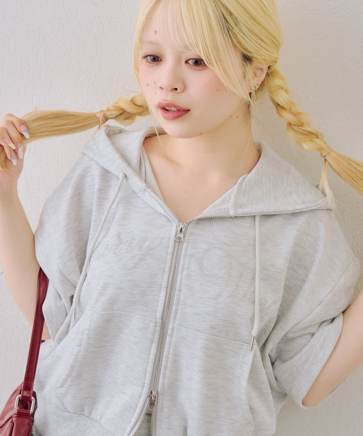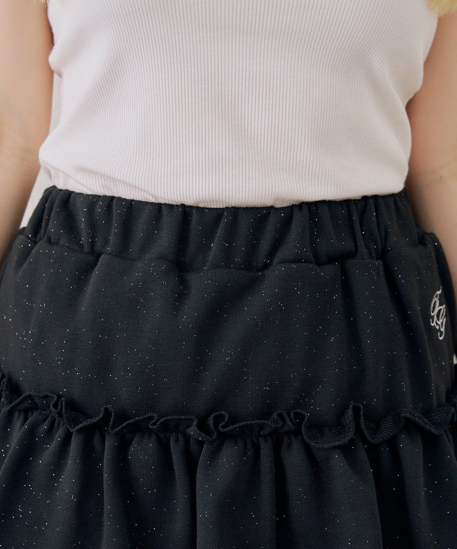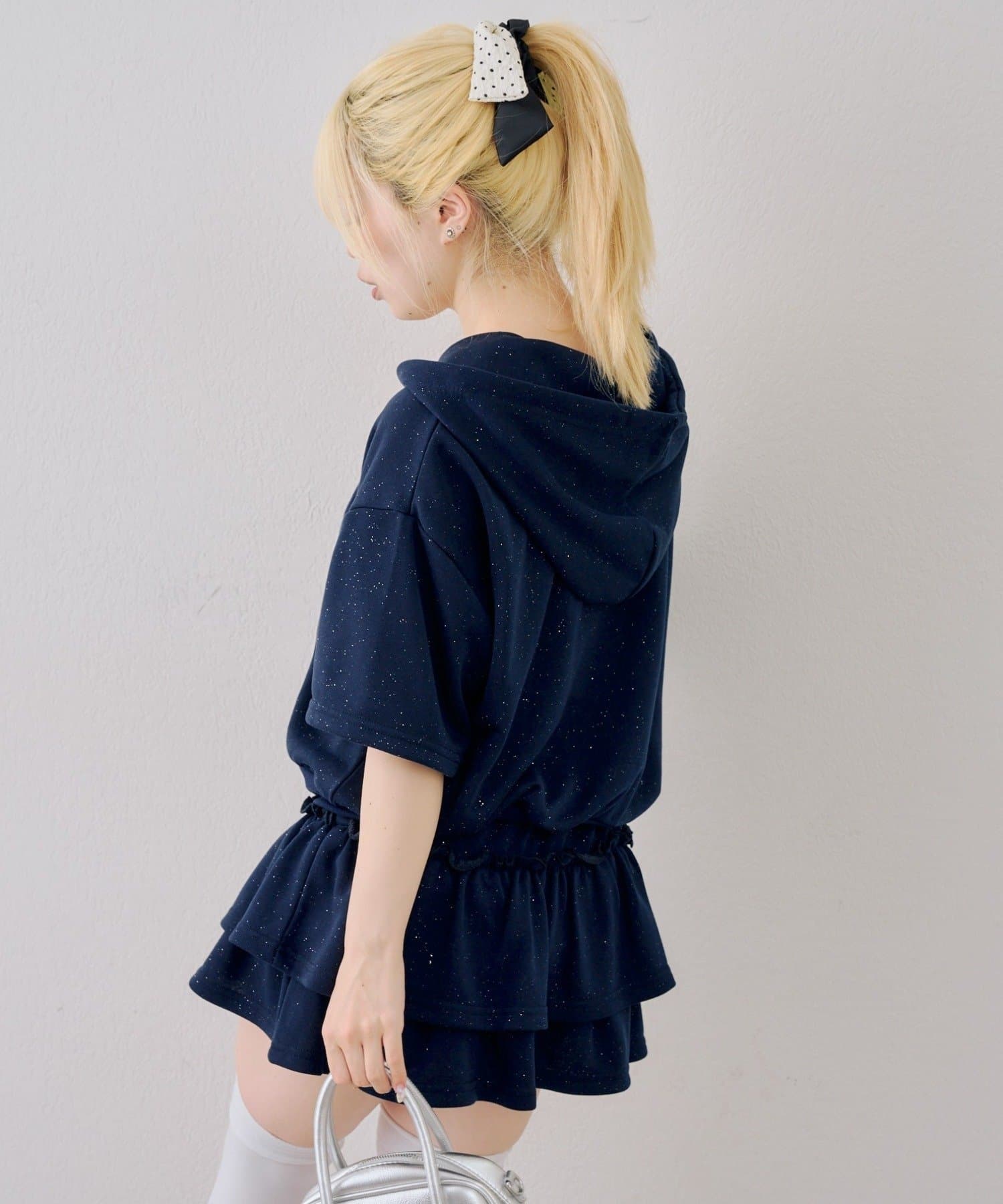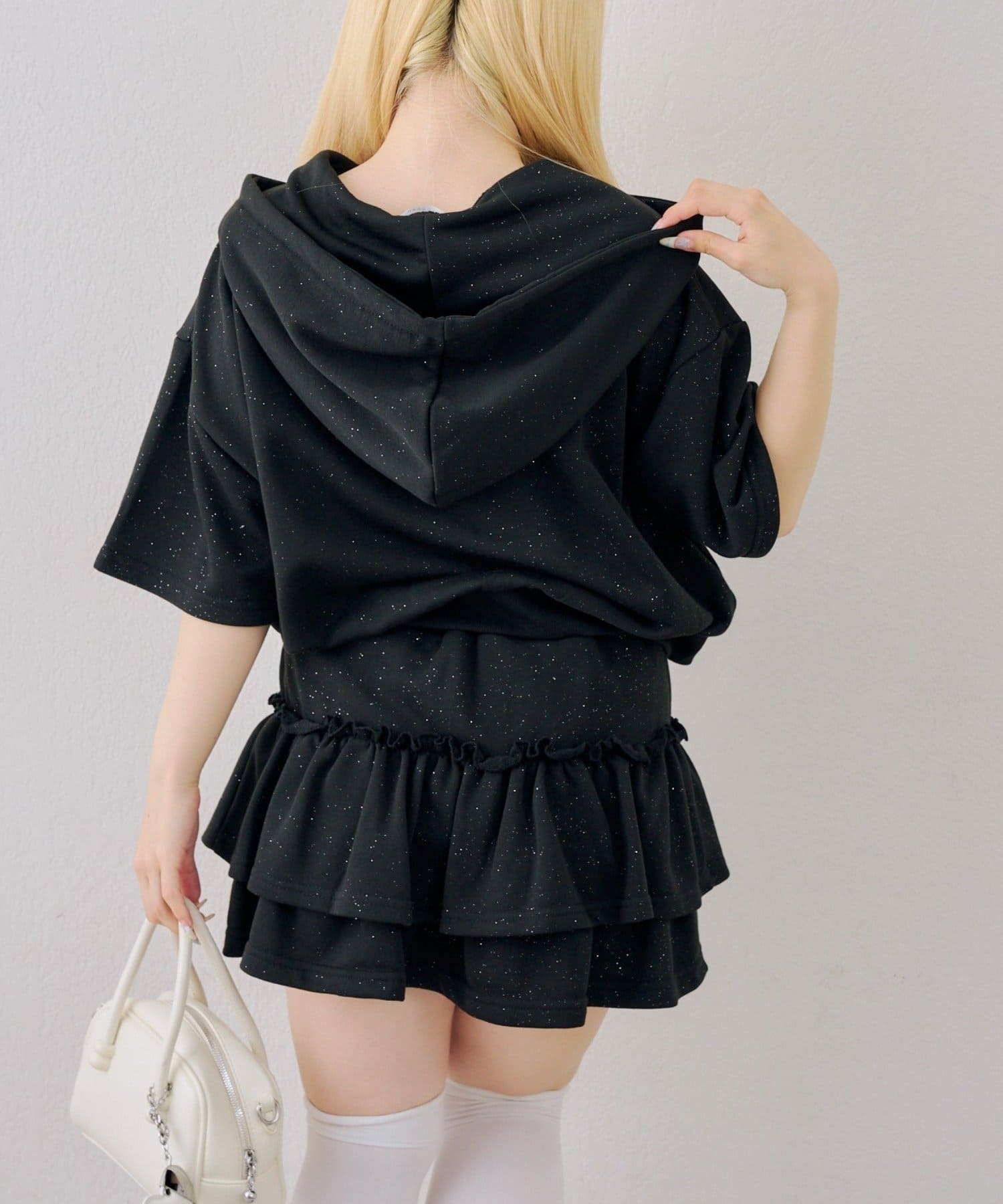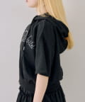 ・フロントのロゴがキラキラと輝き、遊び心と大人っぽさを兼ね備えた半袖スウェットパーカーとスカートのセット