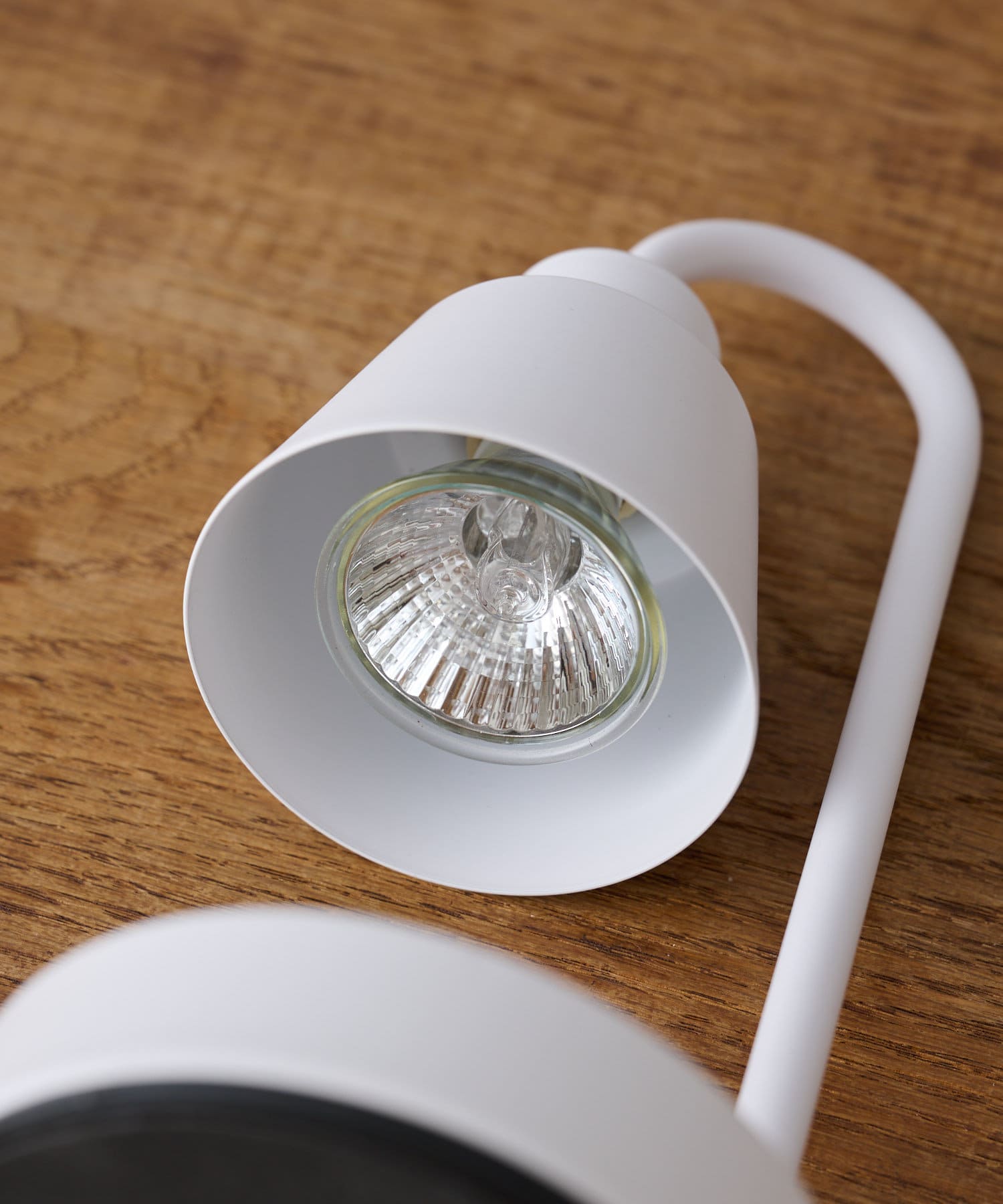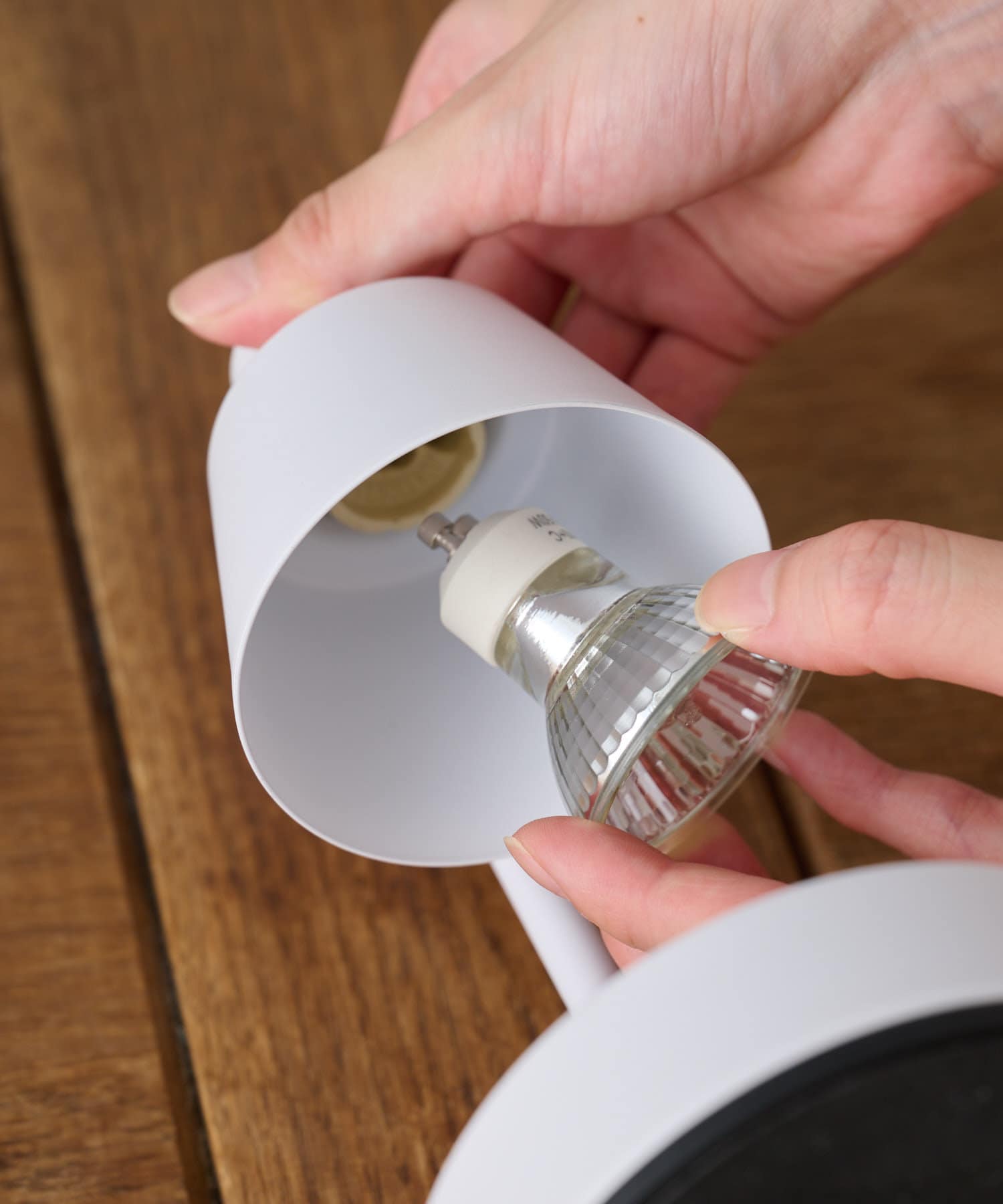 付属のハロゲン電球を本体ソケットに差し込み、右に回してください。