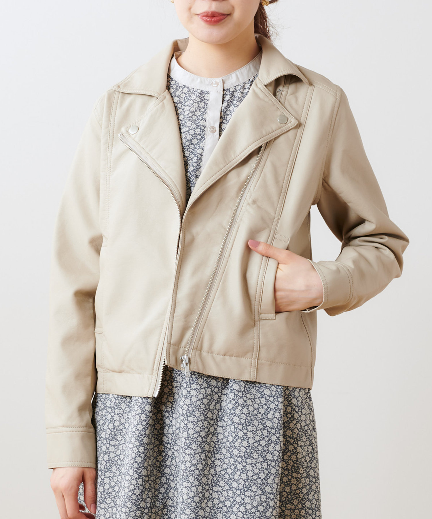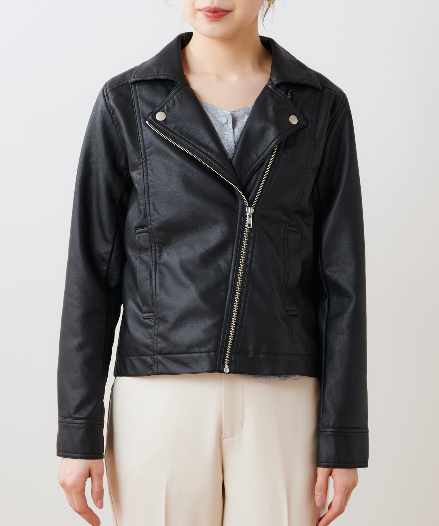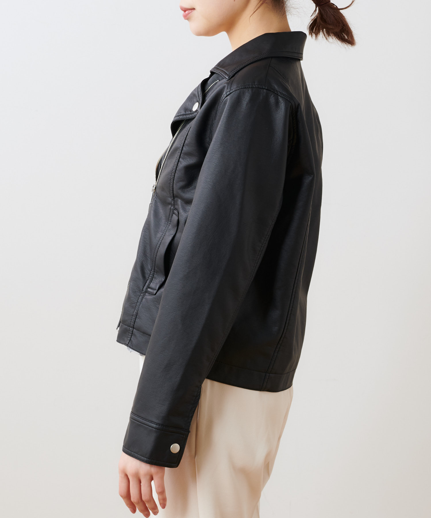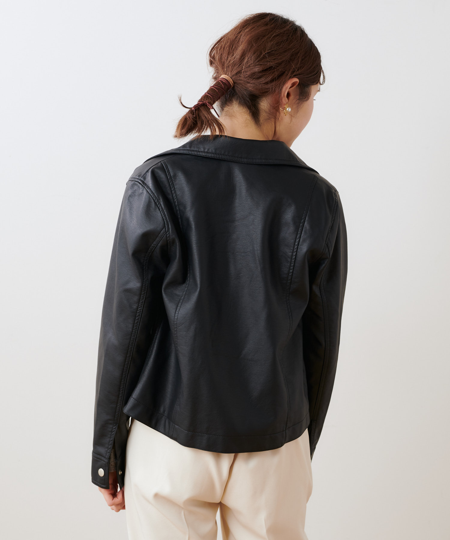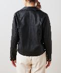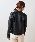 柔らかい肌触りで馴染みのよい質感のフェイクレザーを使用。ライトな着心地でオールシーズン着用していただけます。女性らしいコンパクトな着丈にはスタイルアップ効果も◎スタイリングの引き締め役にも最適です。トレンドに左右されない定番アウターのライダースジャケットはワードローブにぜひ一枚持っておきたいアイテムです。