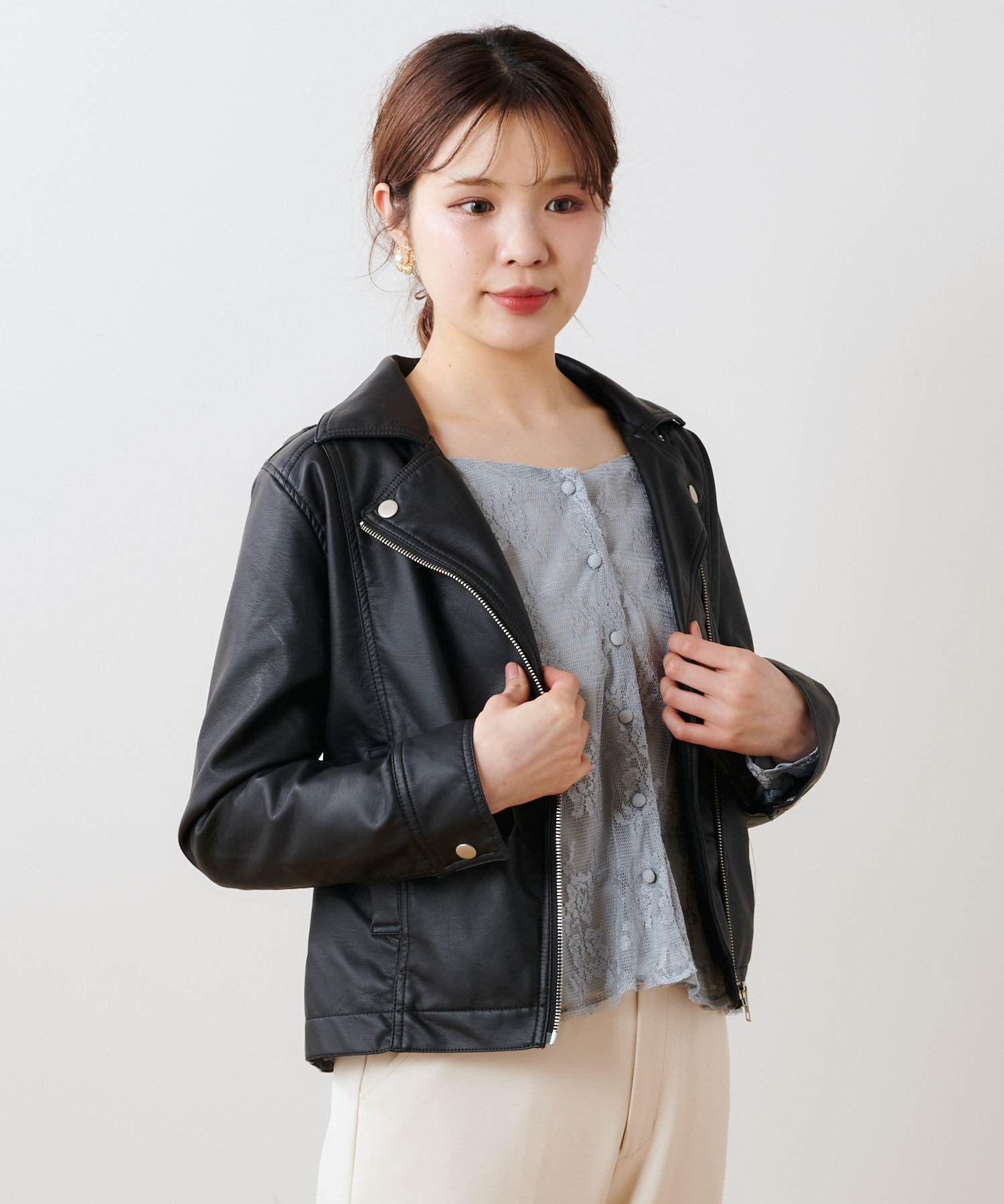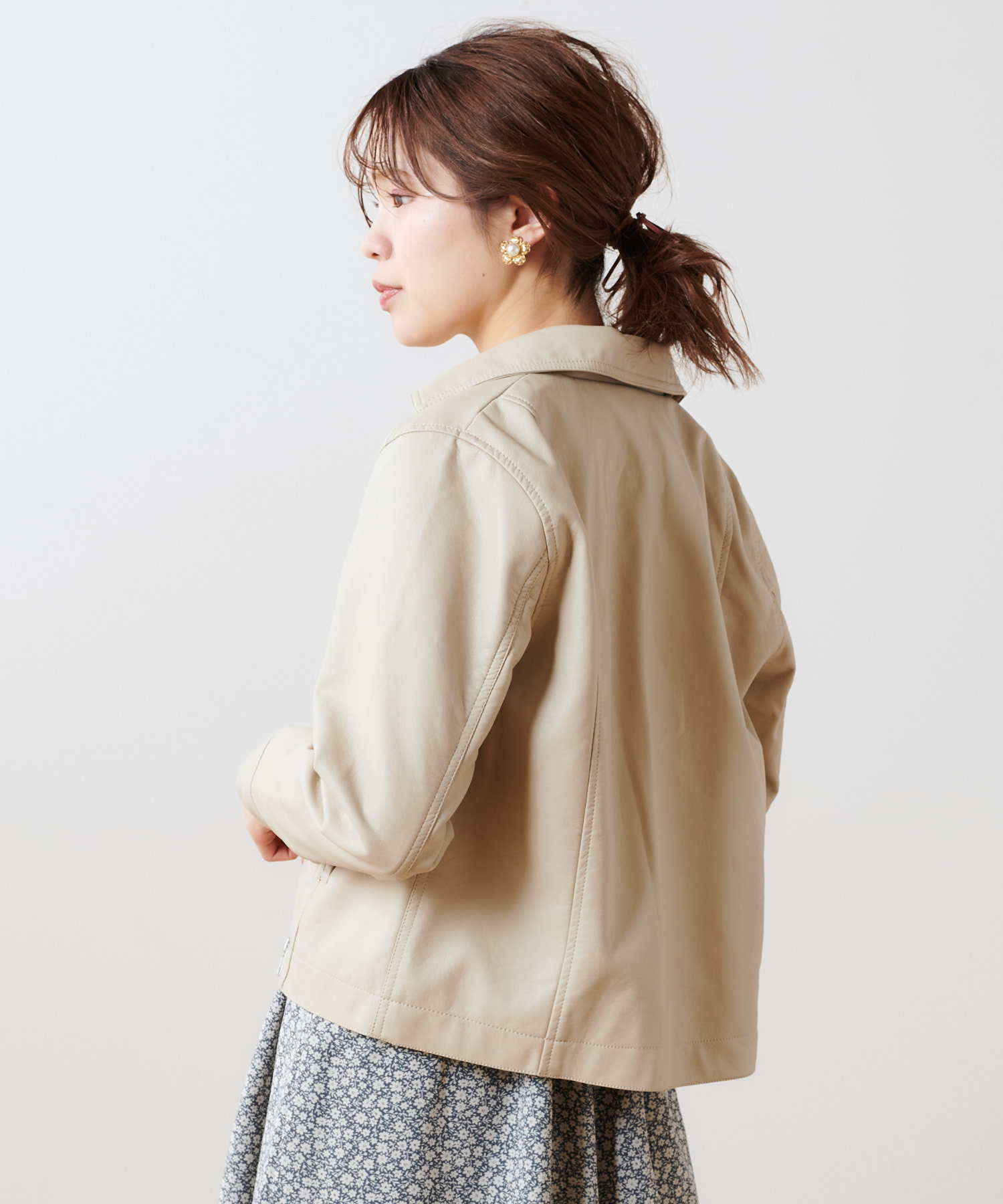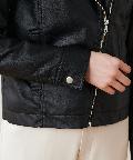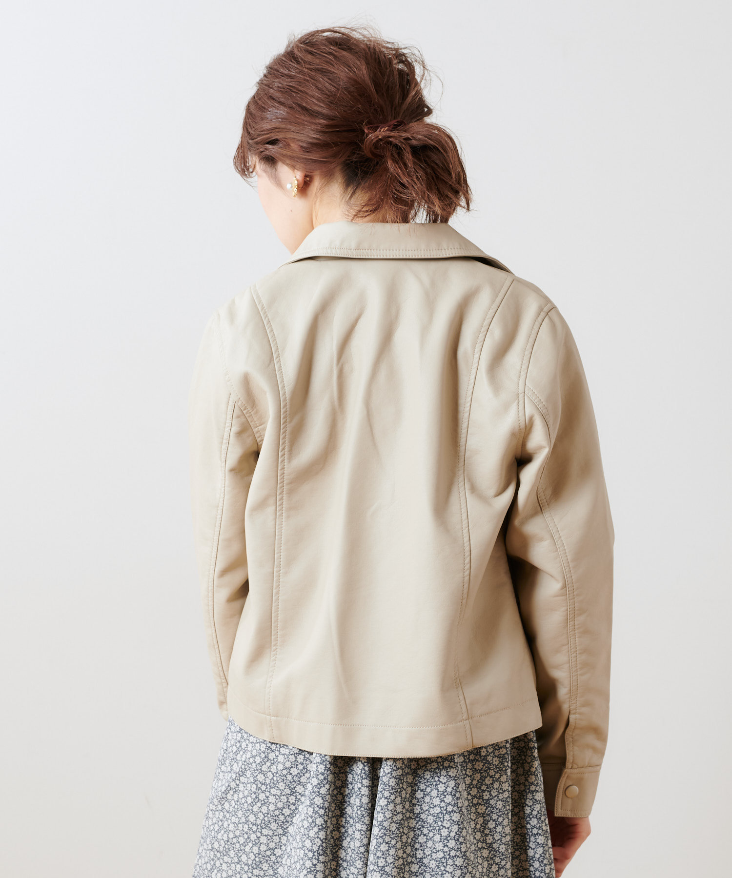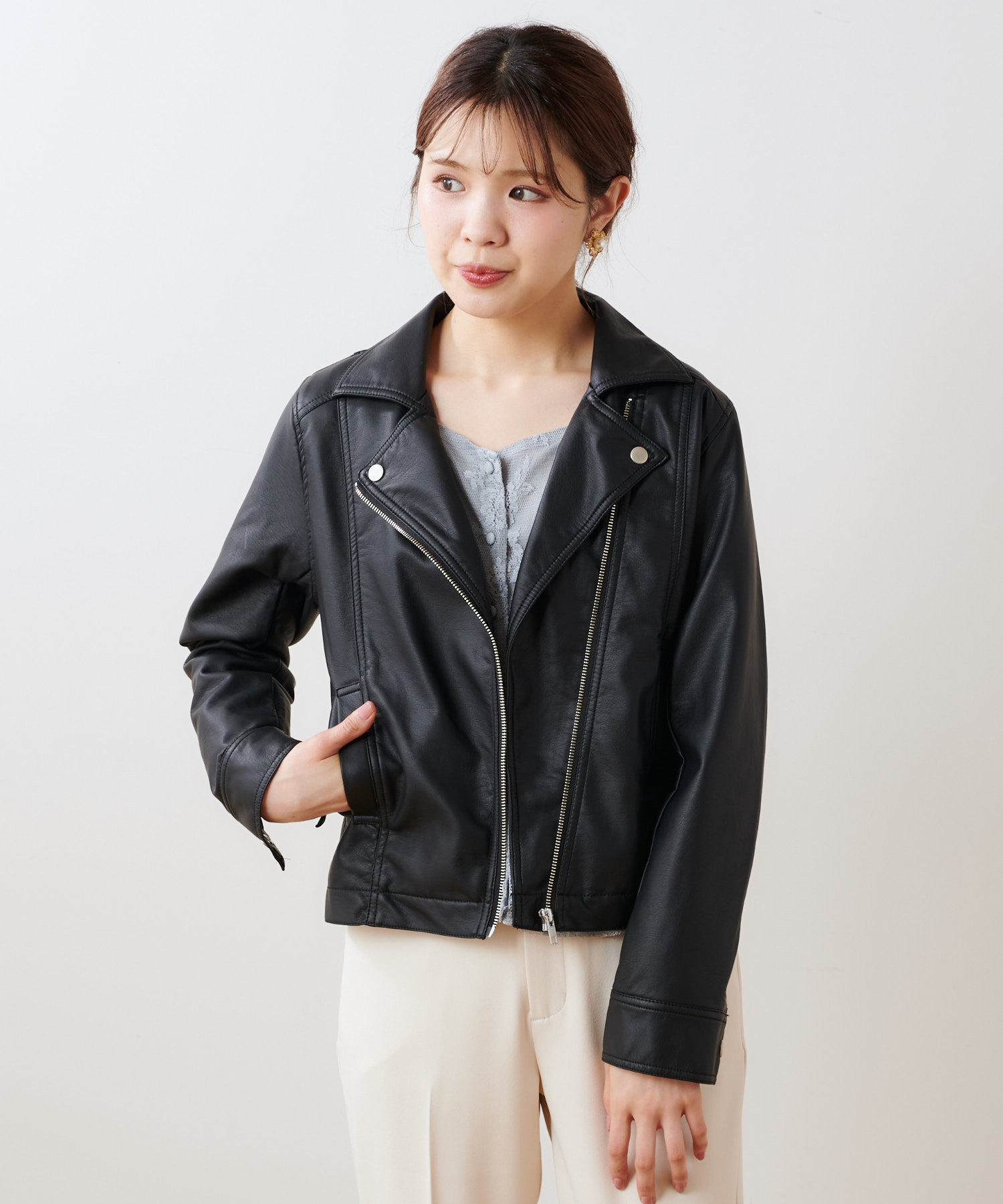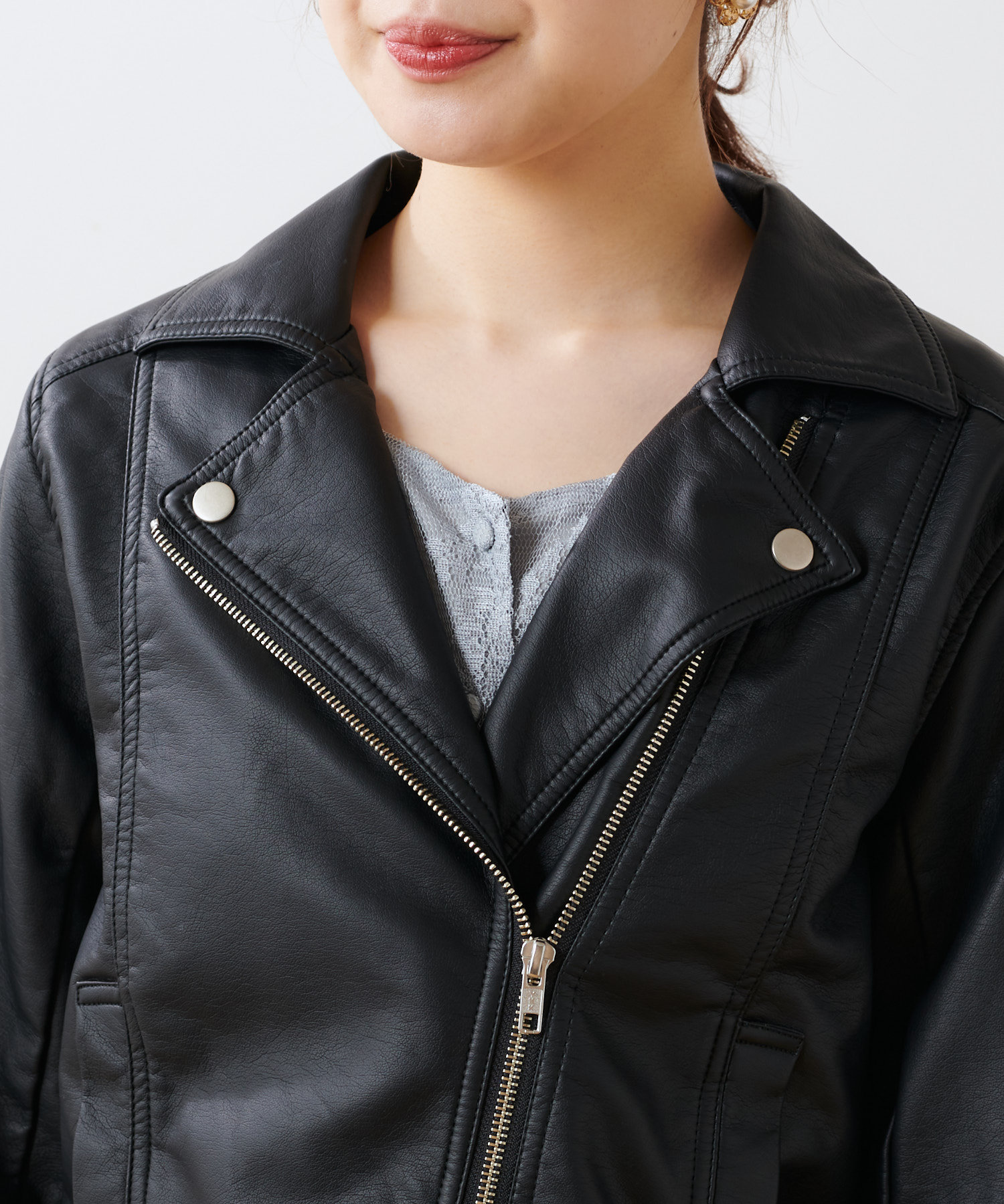 柔らかい肌触りで馴染みのよい質感のフェイクレザーを使用。ライトな着心地でオールシーズン着用していただけます。女性らしいコンパクトな着丈にはスタイルアップ効果も◎スタイリングの引き締め役にも最適です。トレンドに左右されない定番アウターのライダースジャケットはワードローブにぜひ一枚持っておきたいアイテムです。