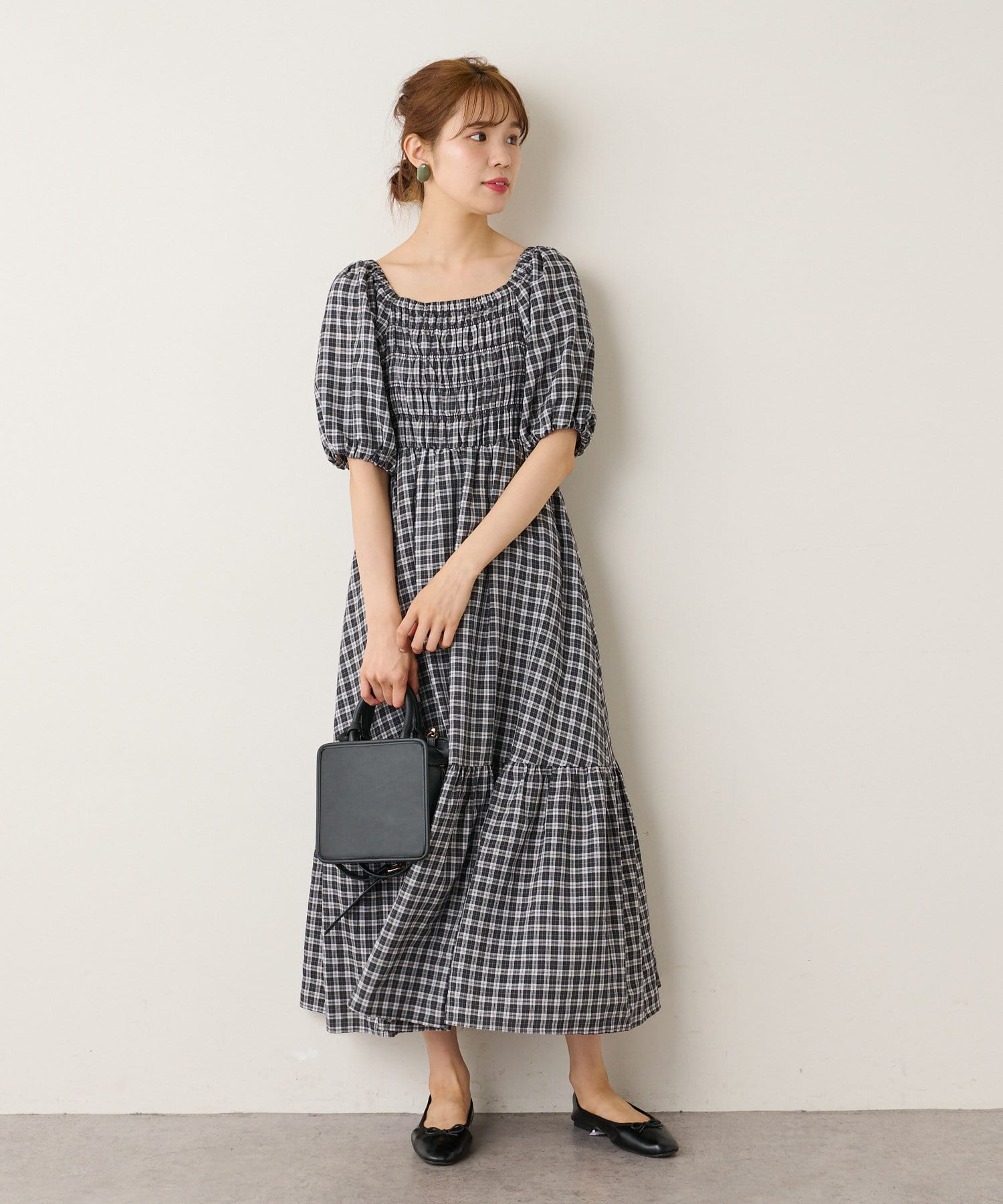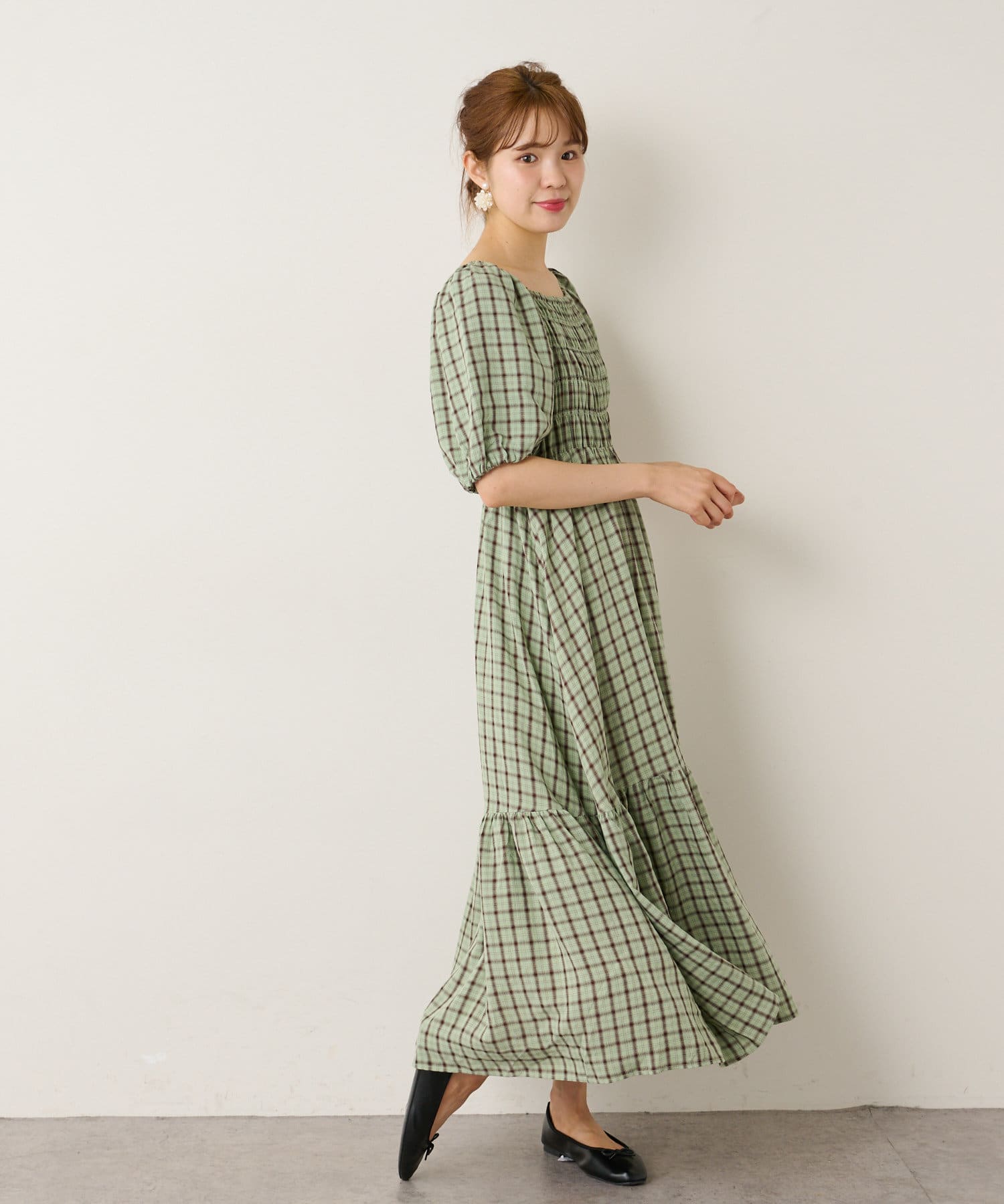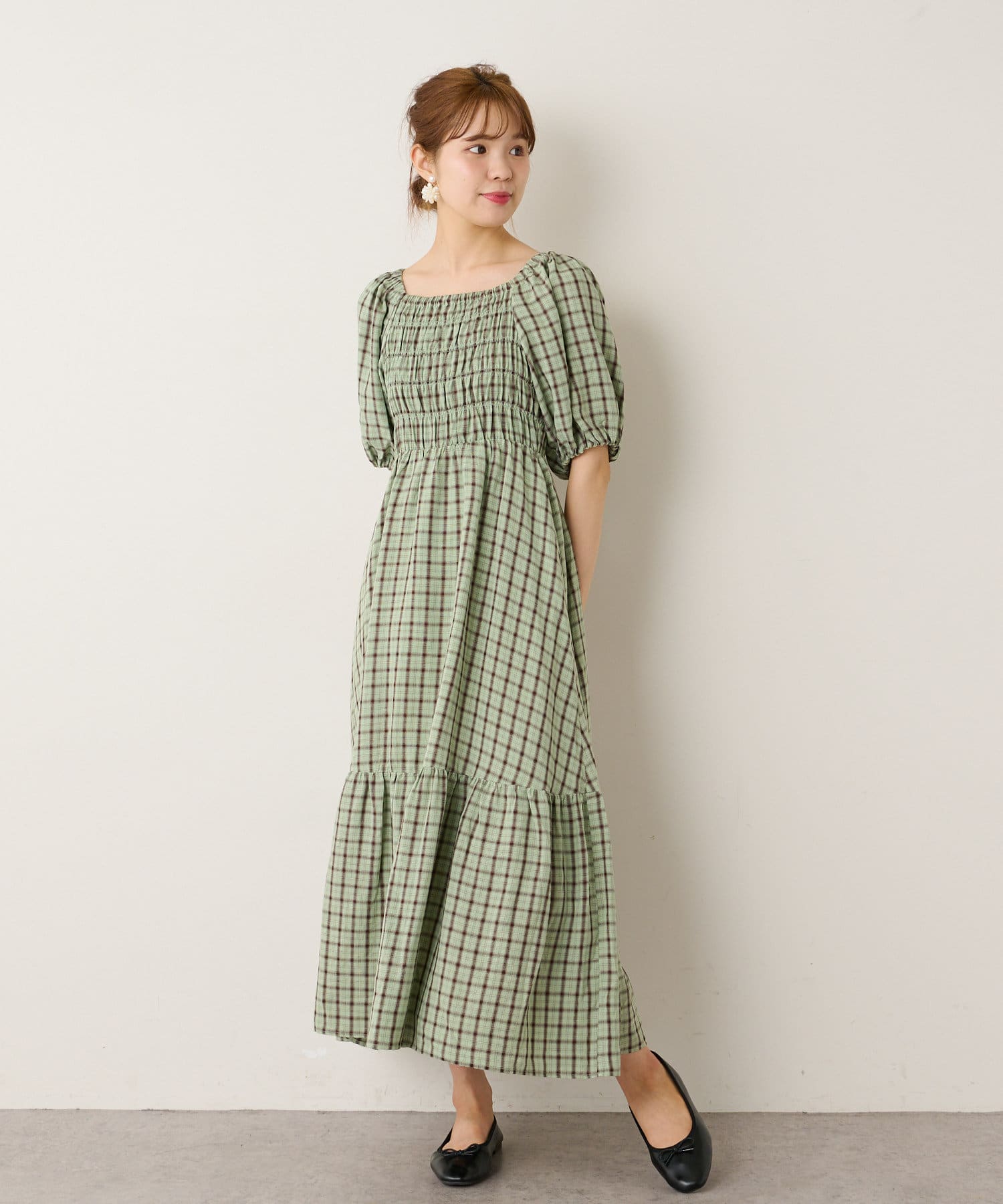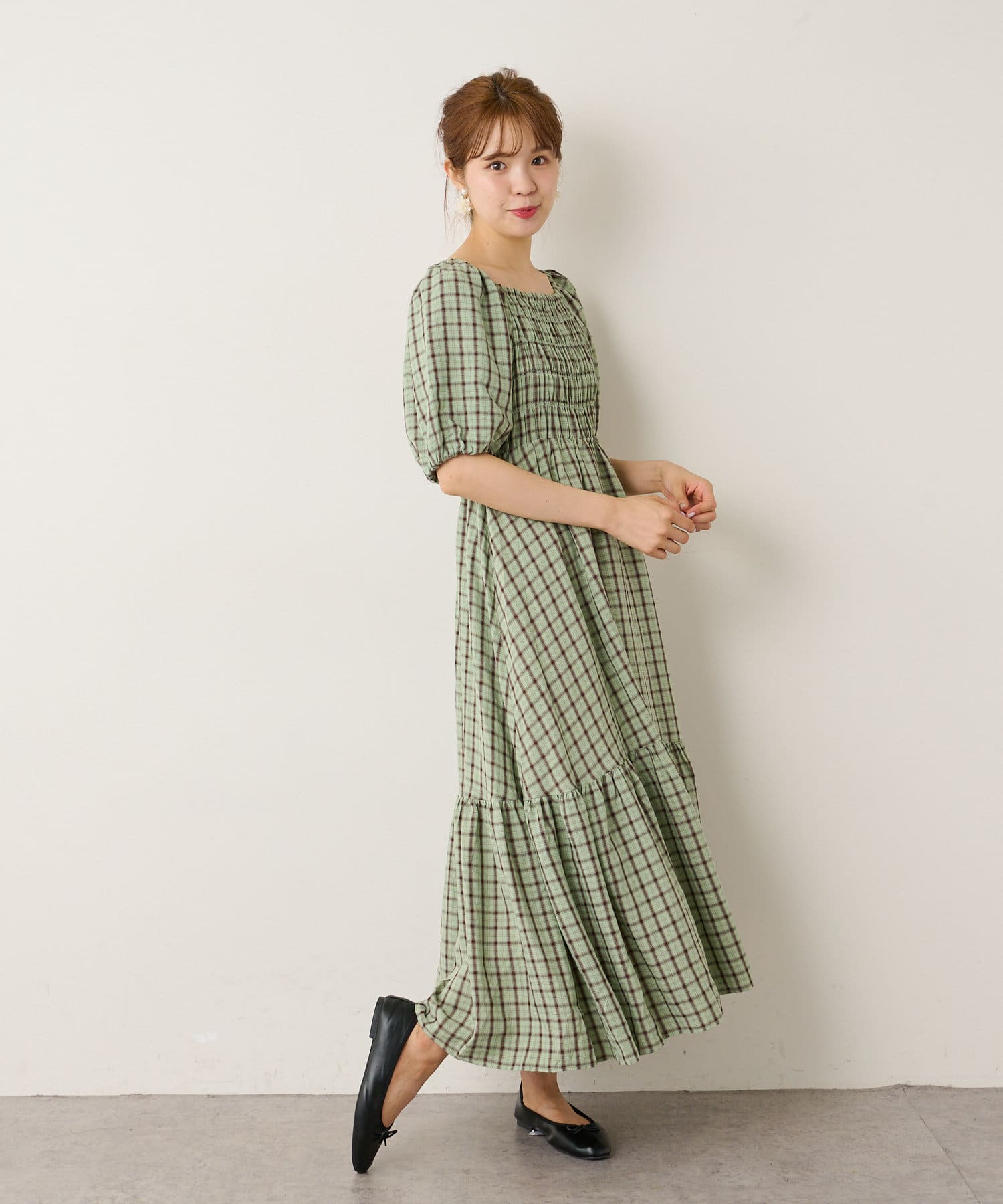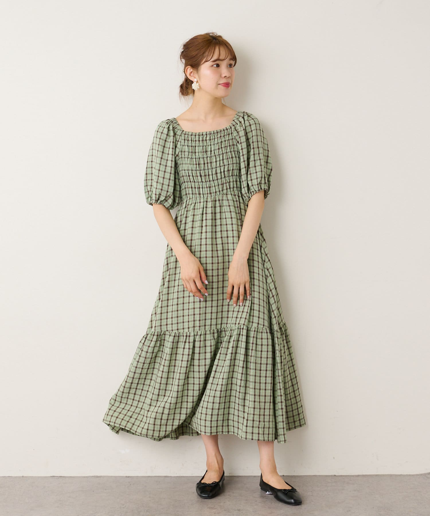 シャーリング部分がフィットするのでボディラインを華奢にすっきり見せてくれるようなシルエットで、裾のフレアスカート部分とのメリハリがつきます。首元がスッキリと開くデザインなのでネックレスや大ぶりなピアスなどで小物使いを楽しむのがオススメです。