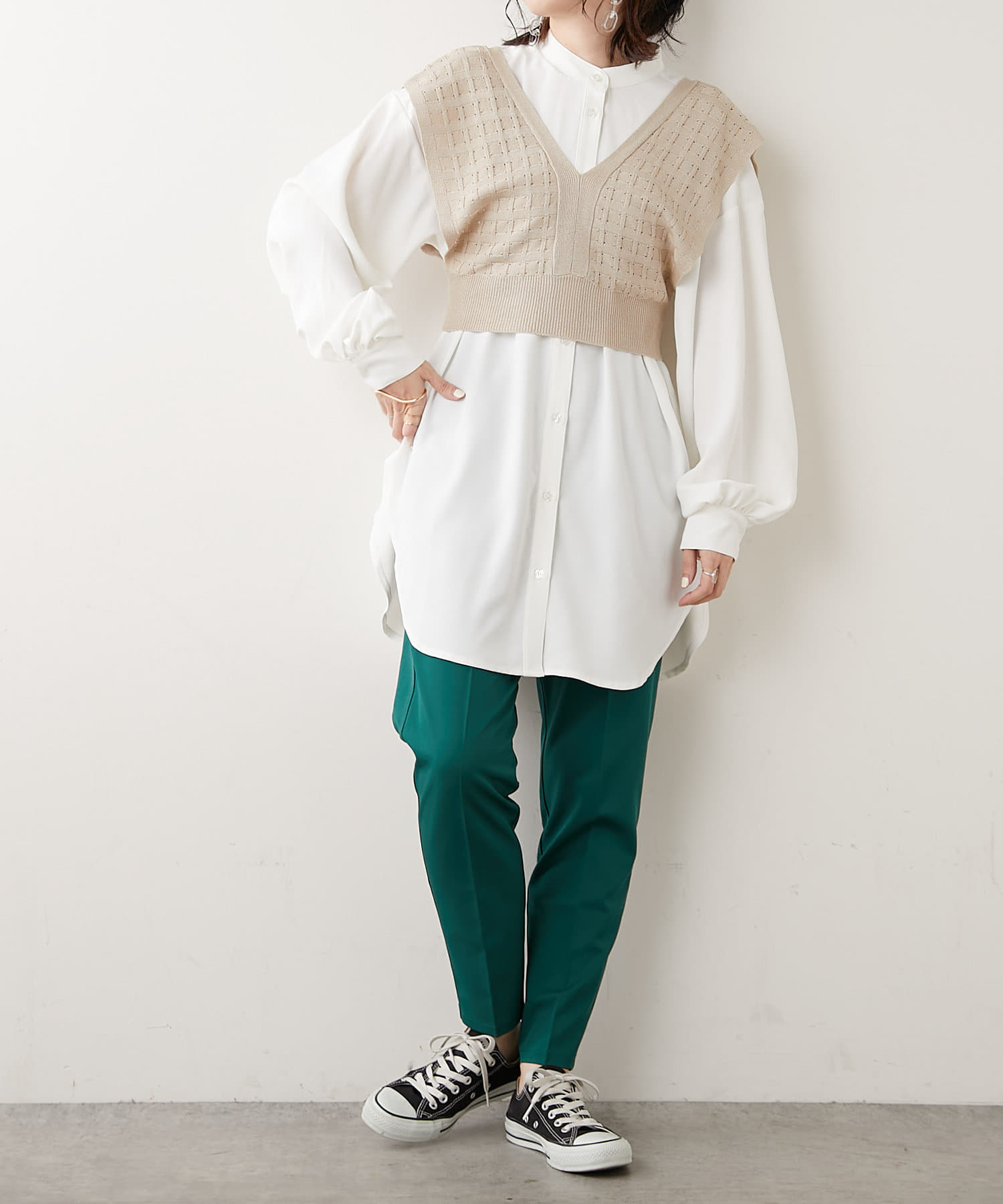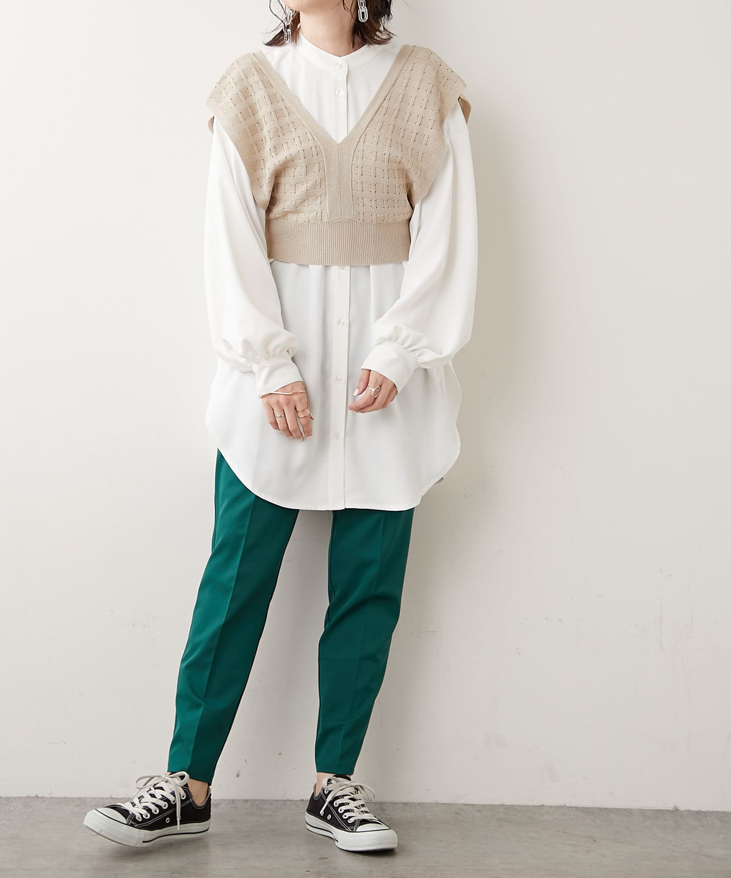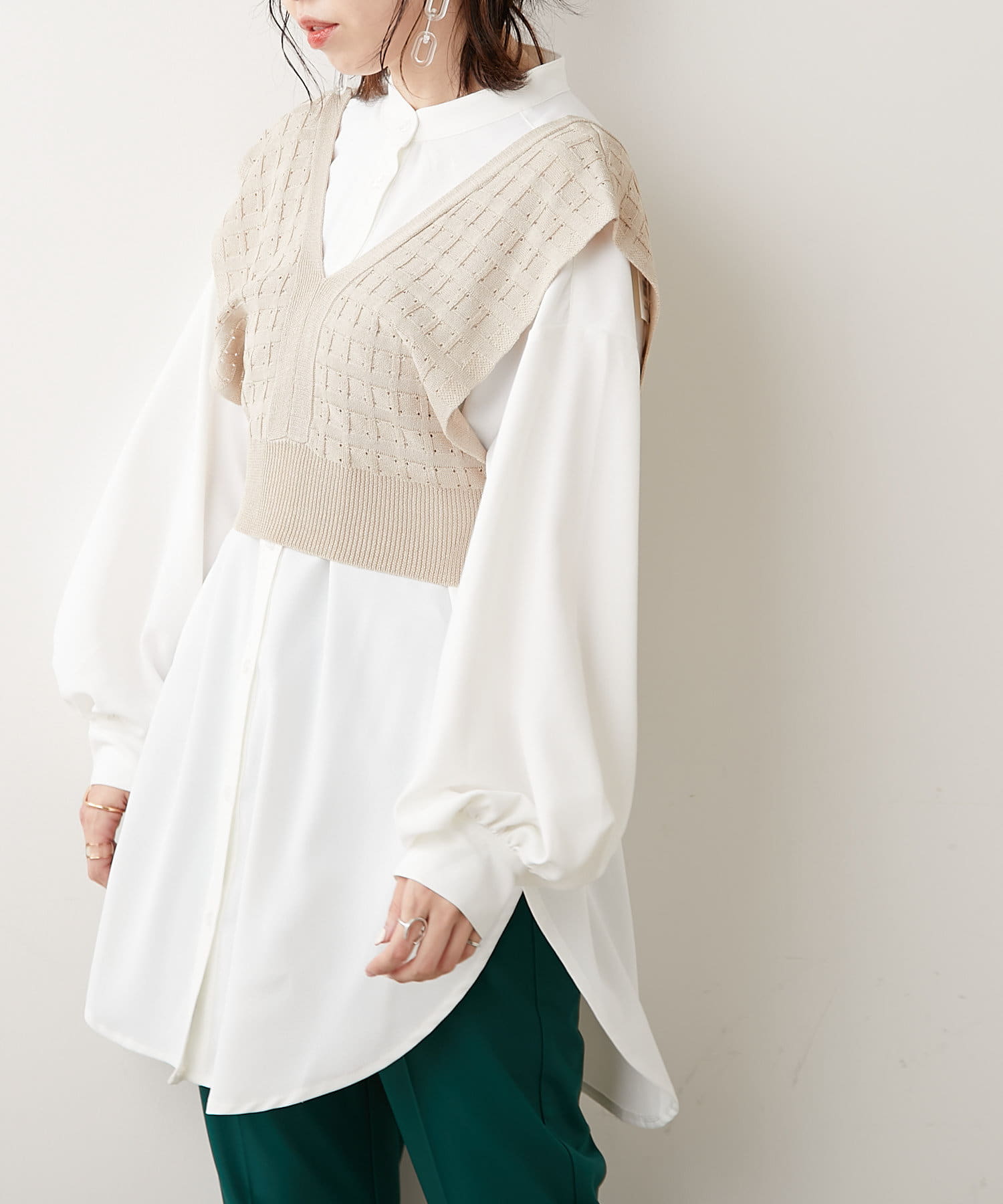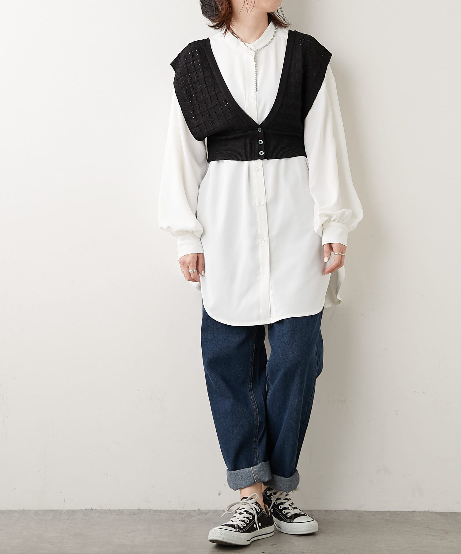 秋冬は長袖カットソーやシャツワンピース、夏はノースリーブカットソーを重ねるなど、インナーを変えれば一年中使えるアイテムです。