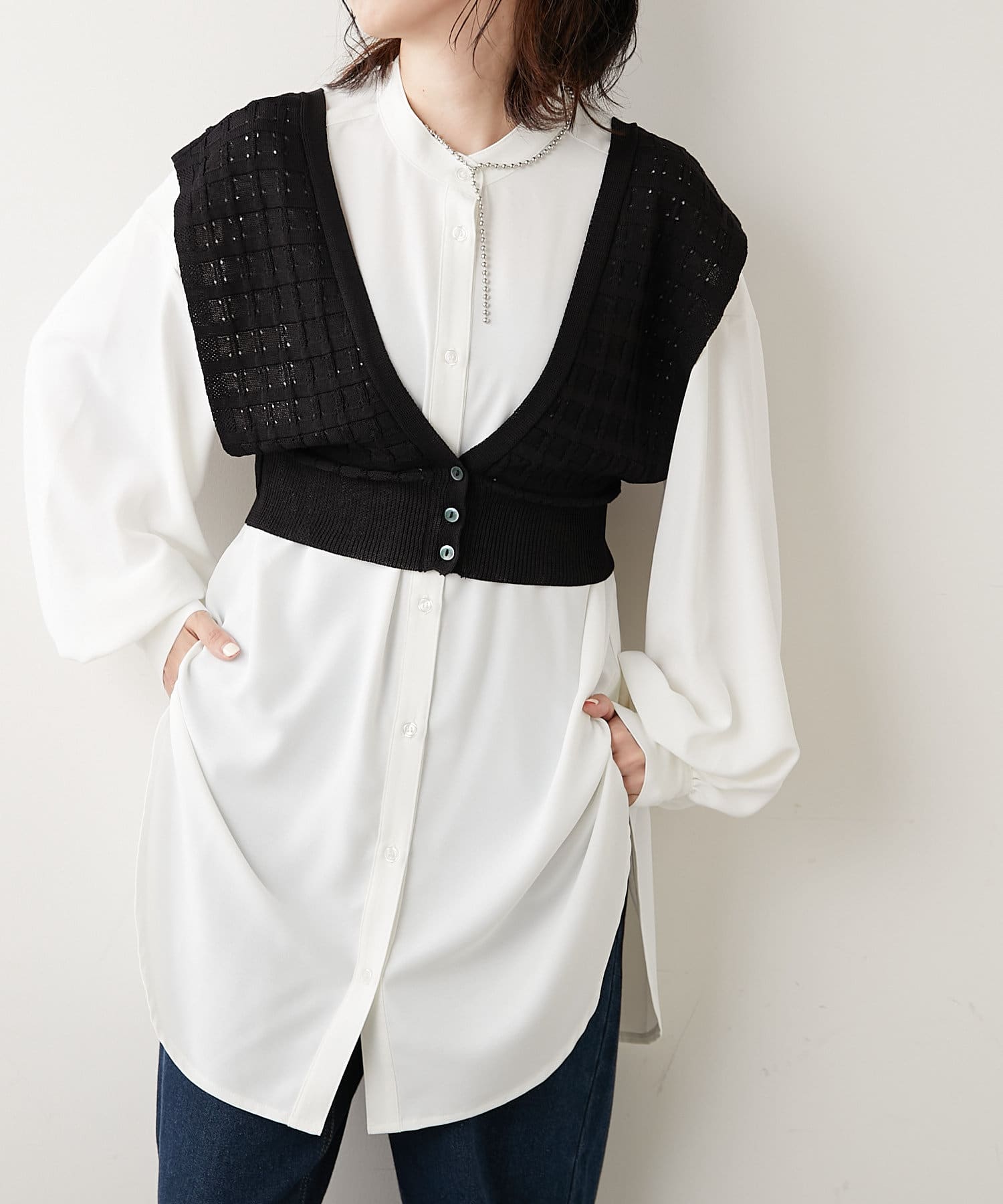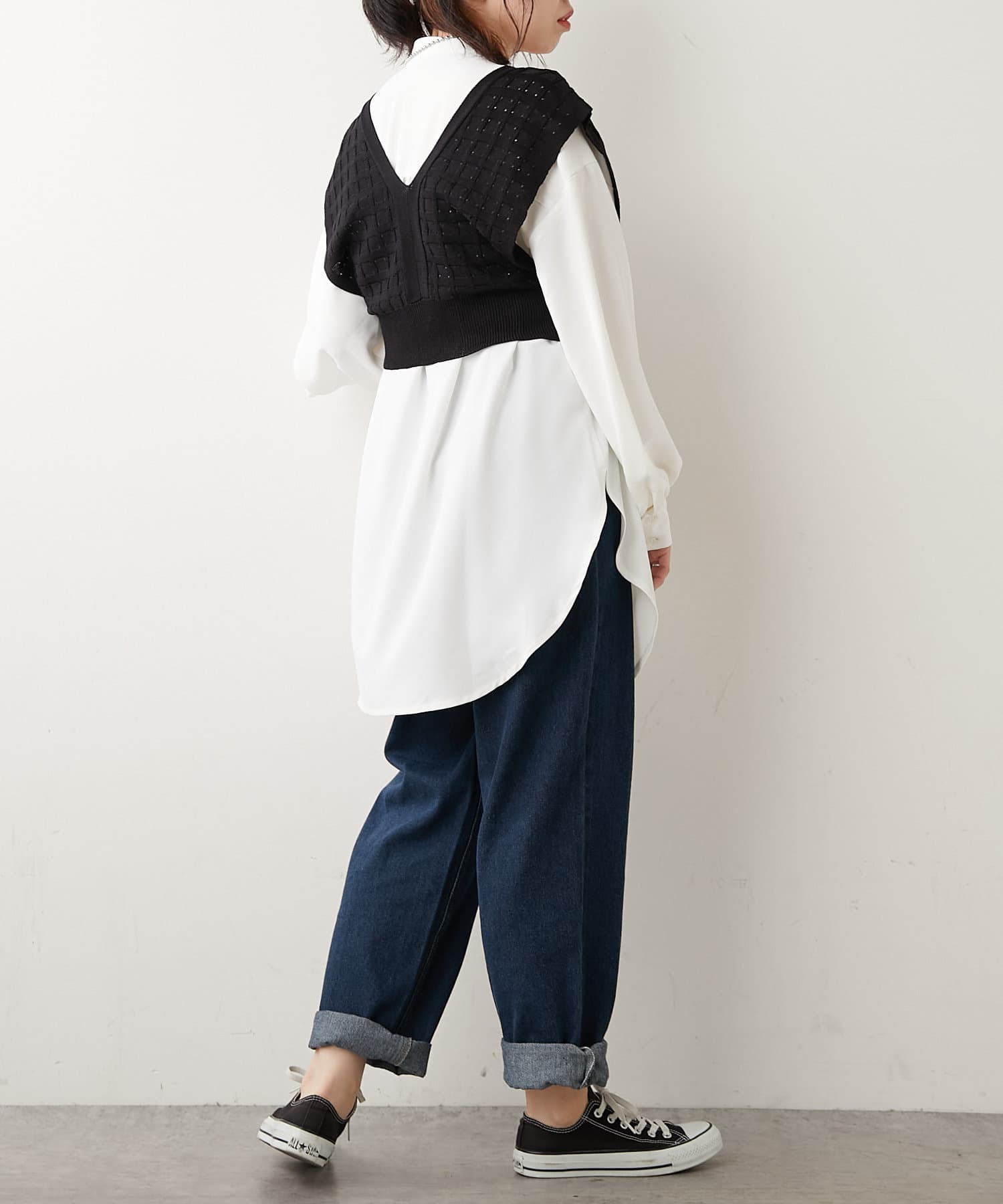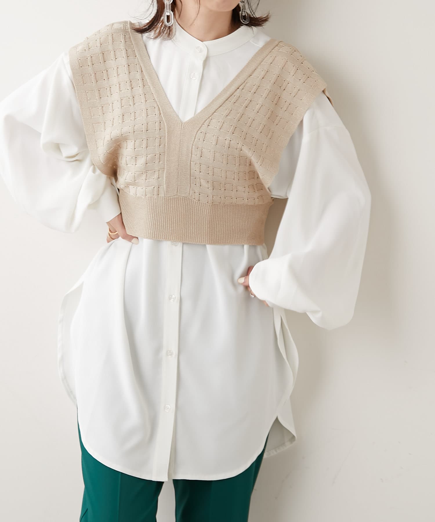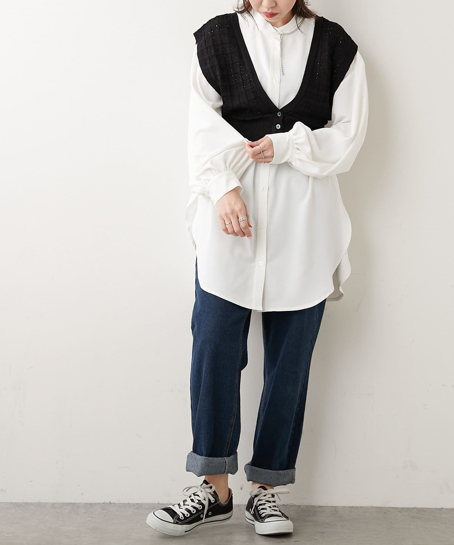 秋冬は長袖カットソーやシャツワンピース、夏はノースリーブカットソーを重ねるなど、インナーを変えれば一年中使えるアイテムです。