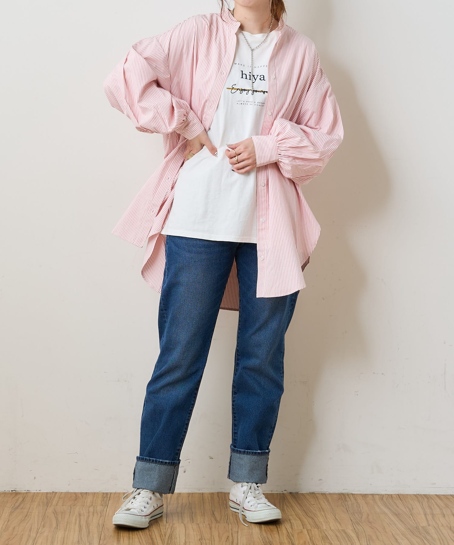 オフは、素材がさらっとしているので、綺麗めなスタイルによく合う!