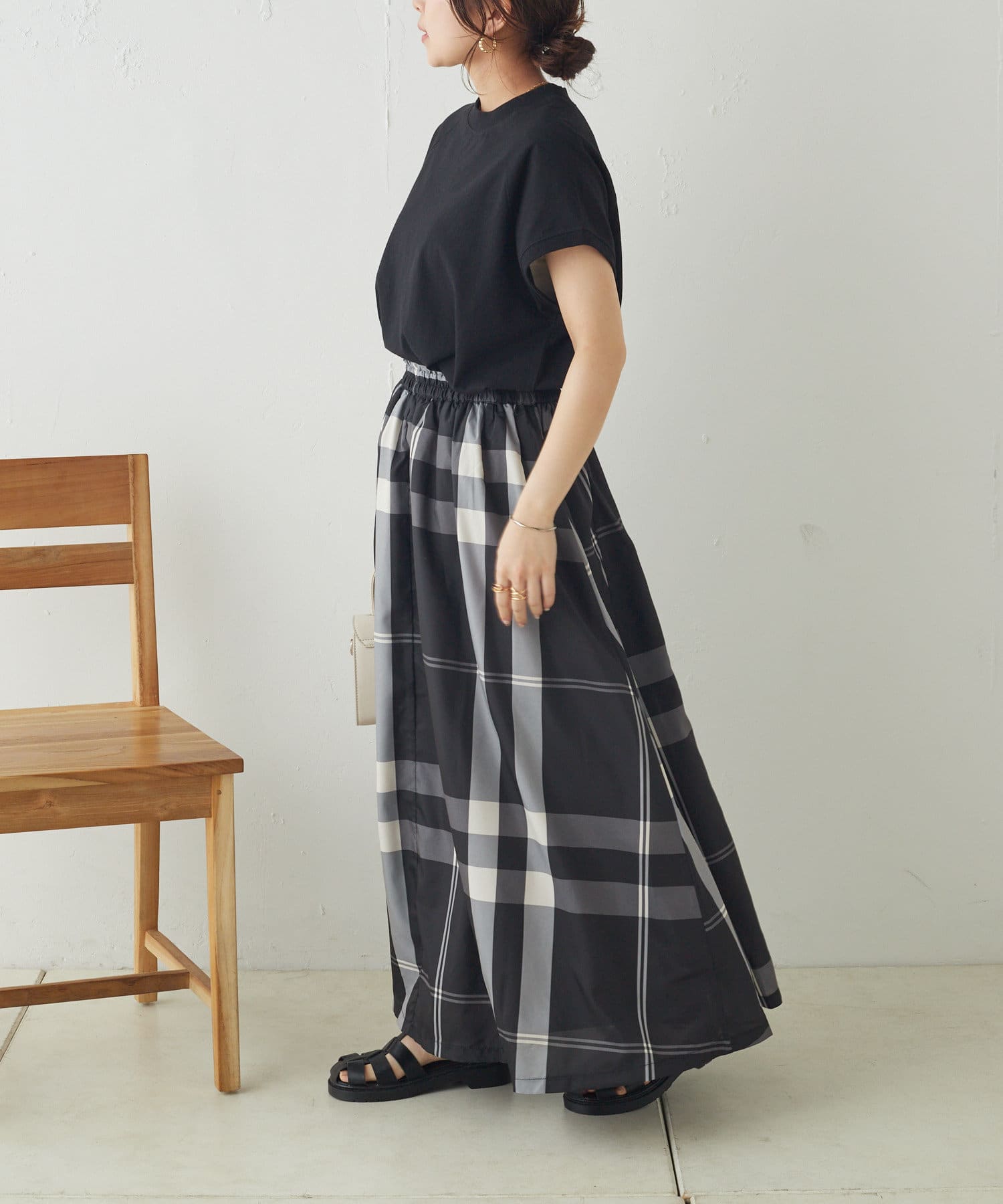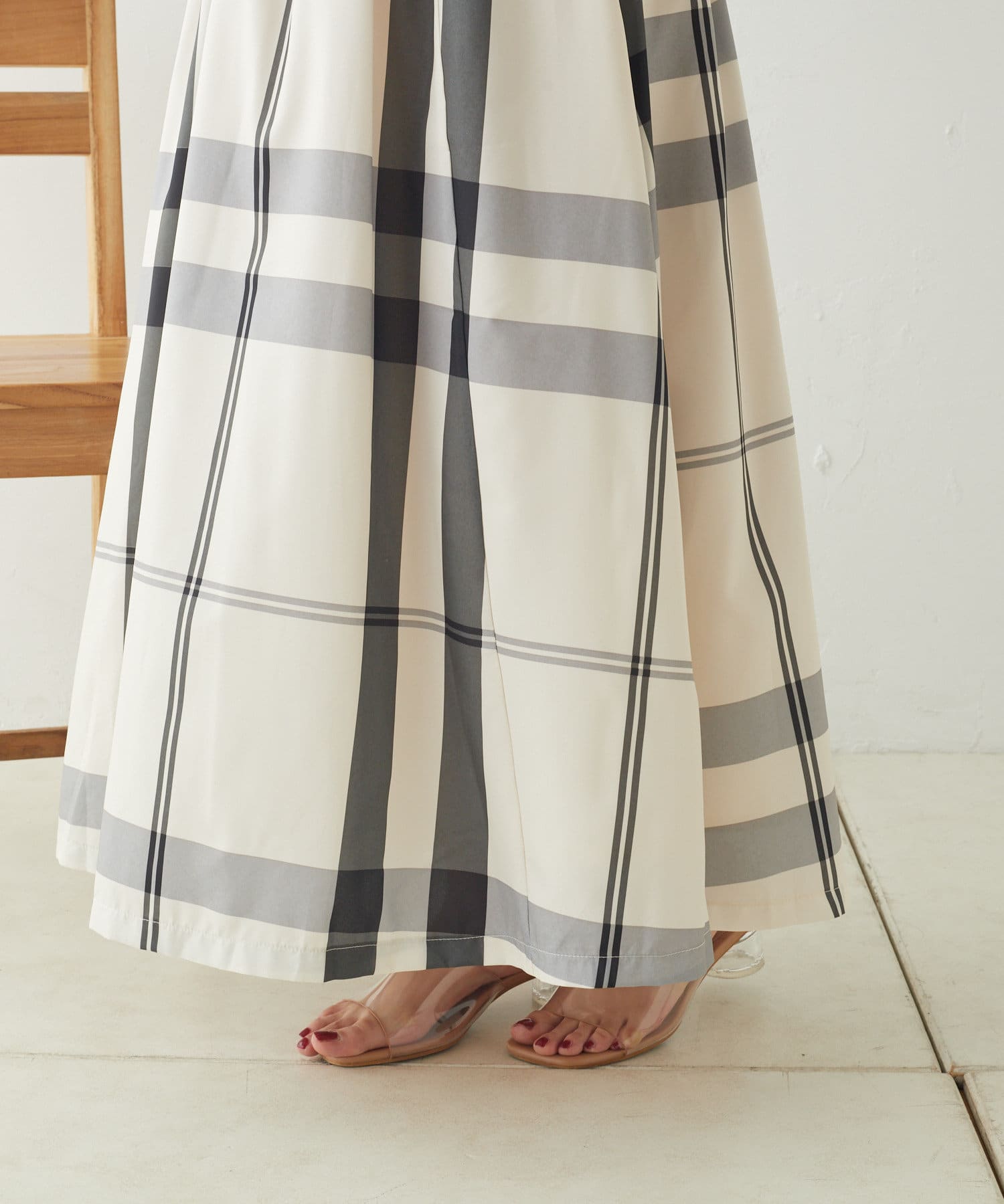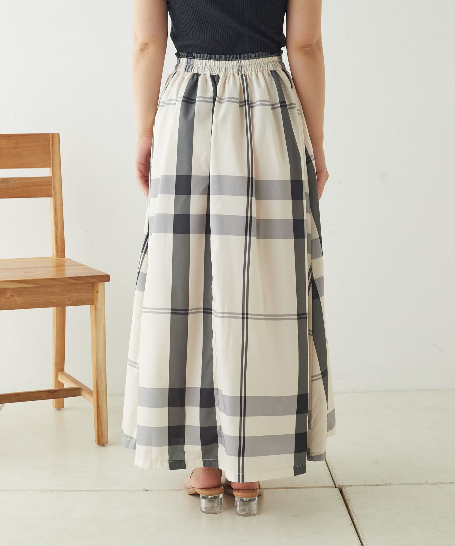 ・目を惹くチェック柄を使用しているのでトップスはシンプルなアイテムを合わせるのがおすすめです。フレアのボリュームがありウエストの細見え効果抜群です。