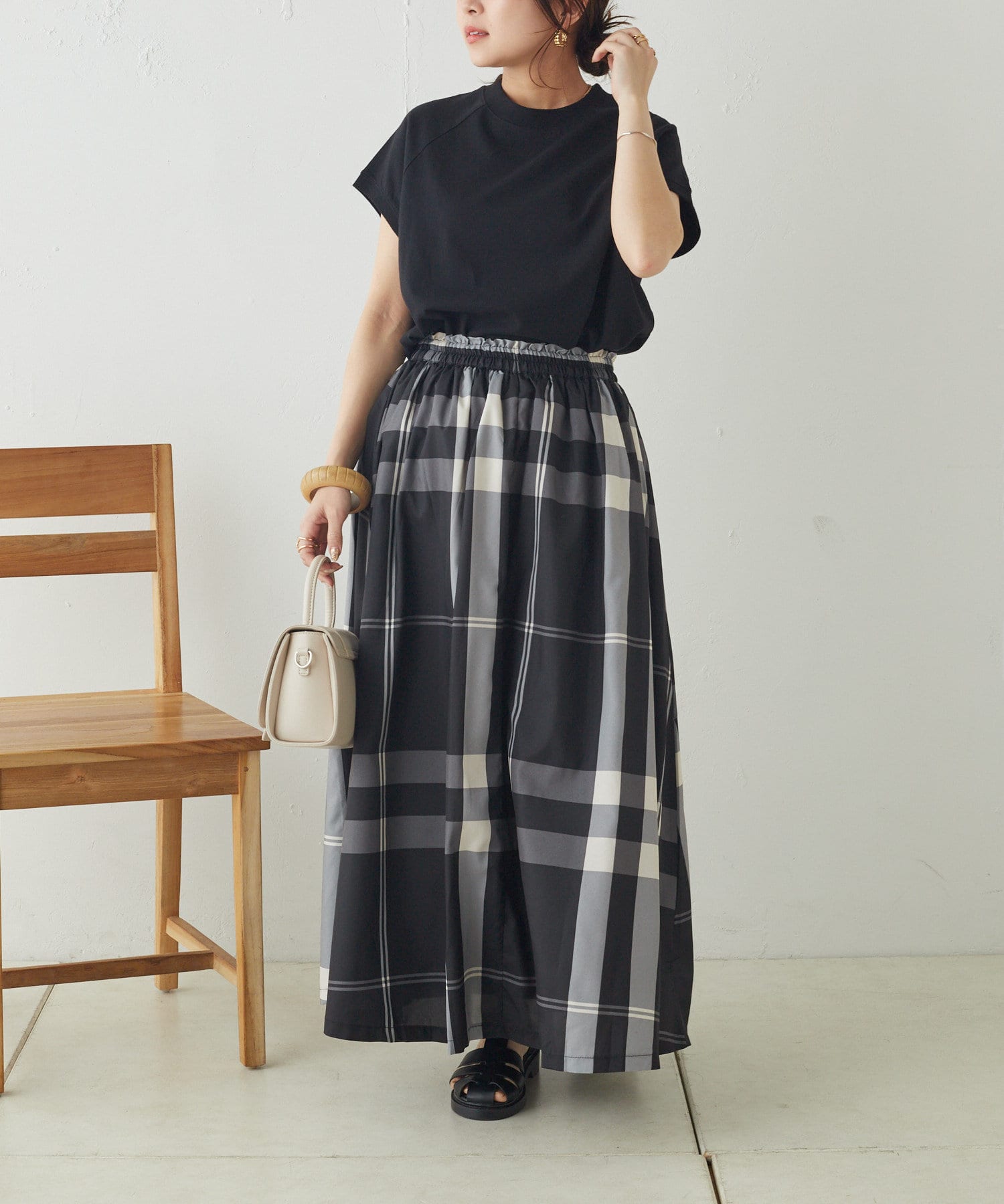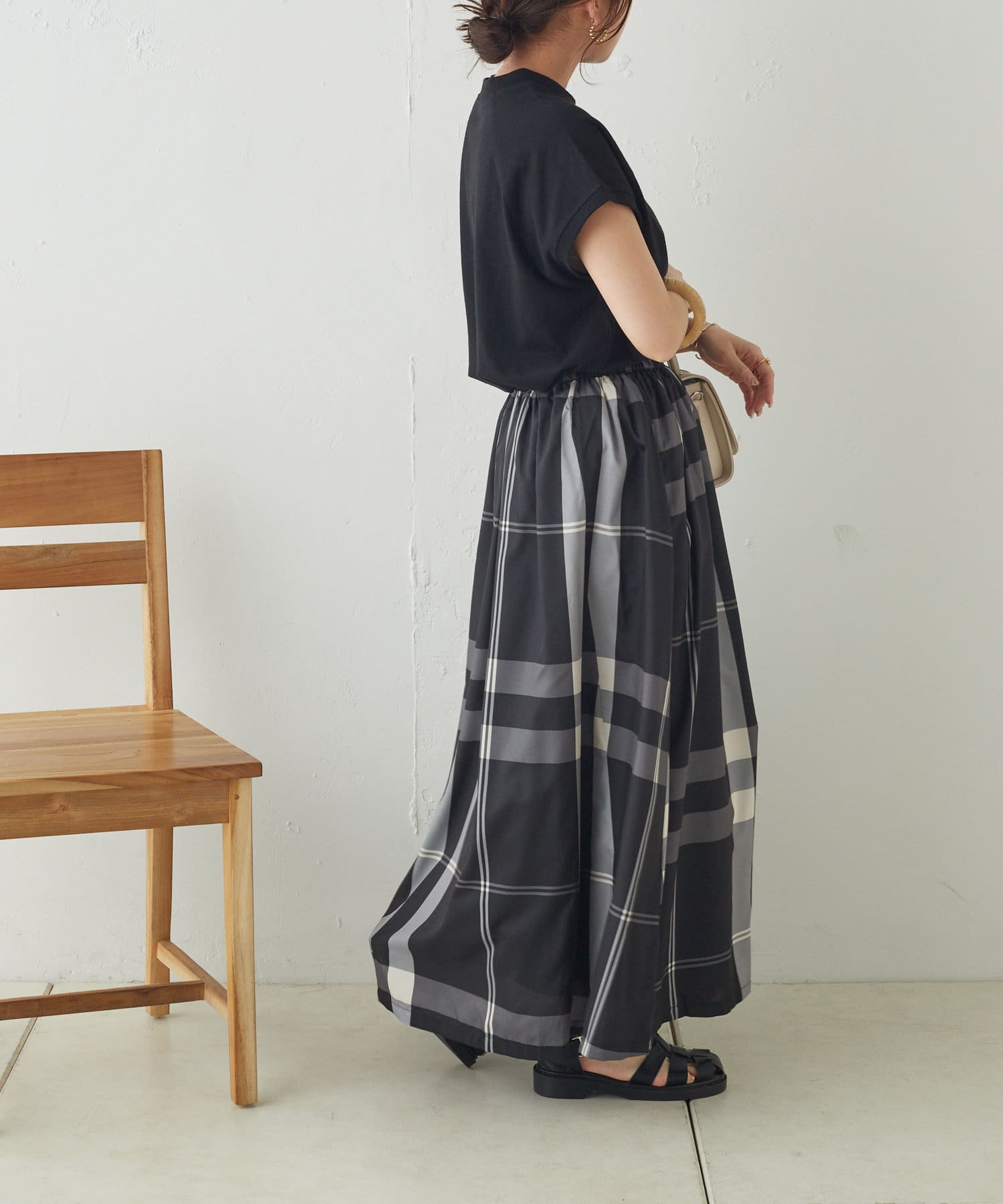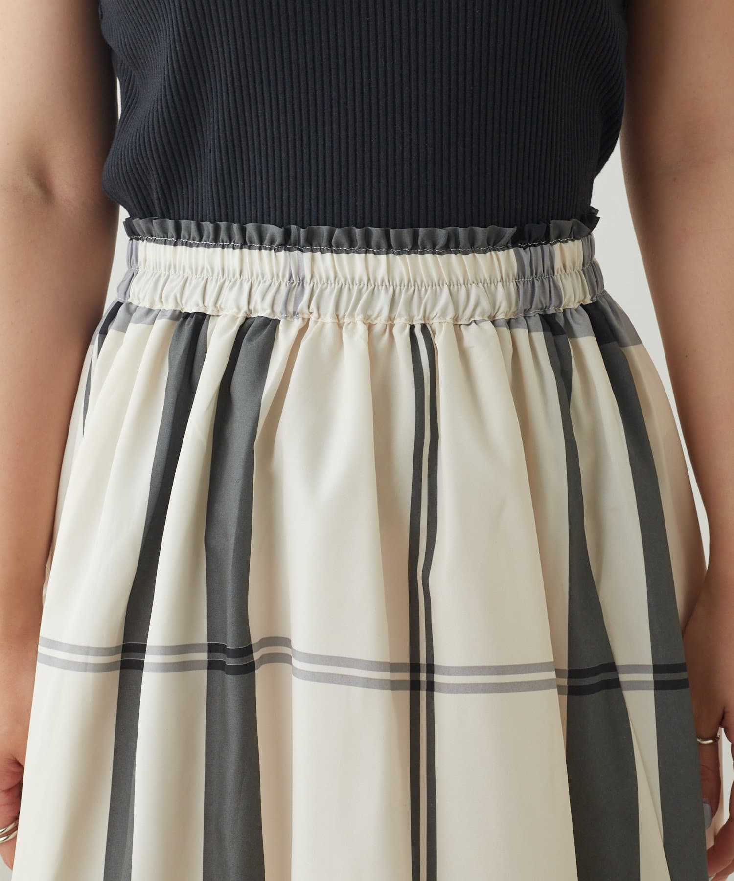 ・目を惹くチェック柄を使用しているのでトップスはシンプルなアイテムを合わせるのがおすすめです。フレアのボリュームがありウエストの細見え効果抜群です。