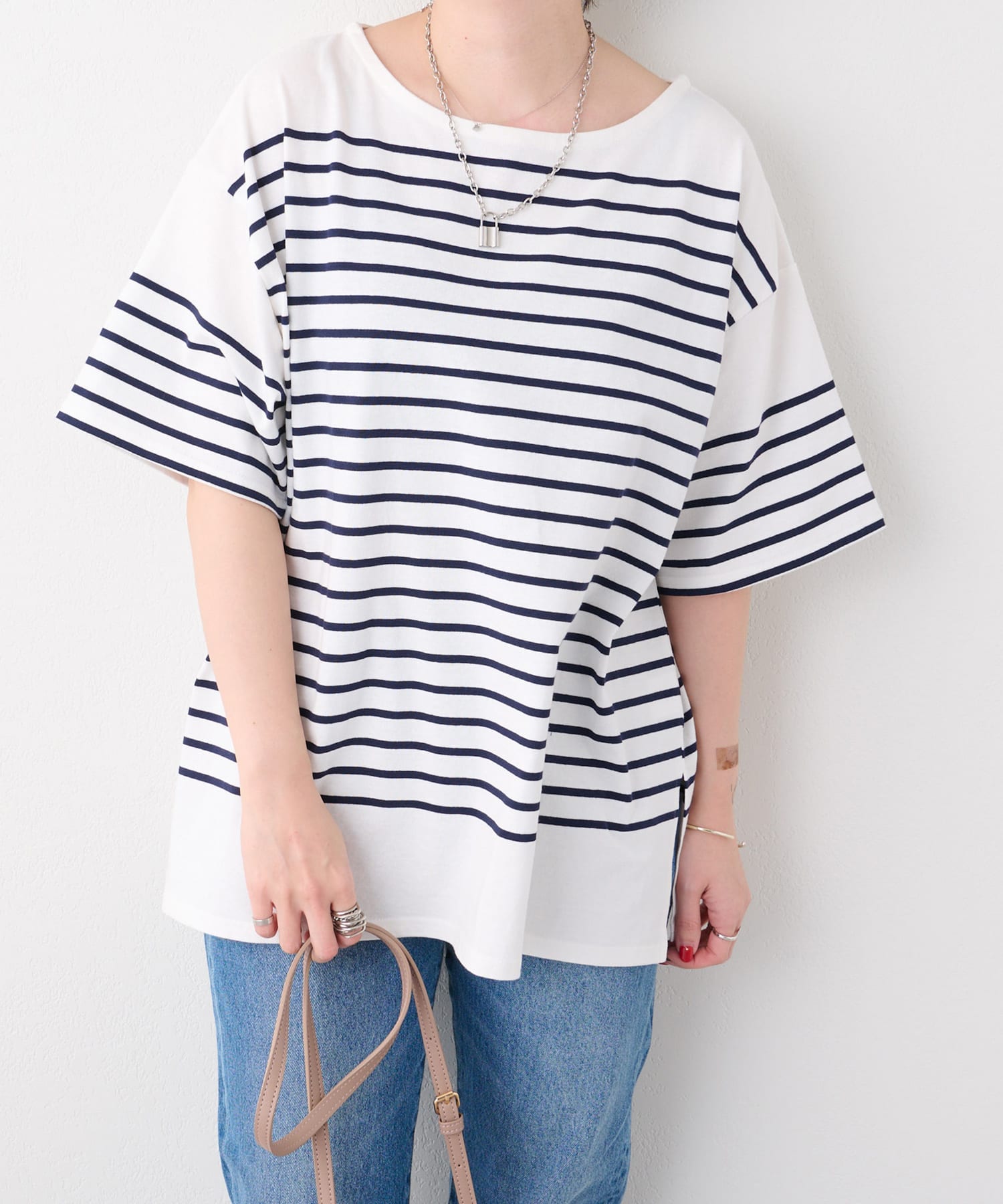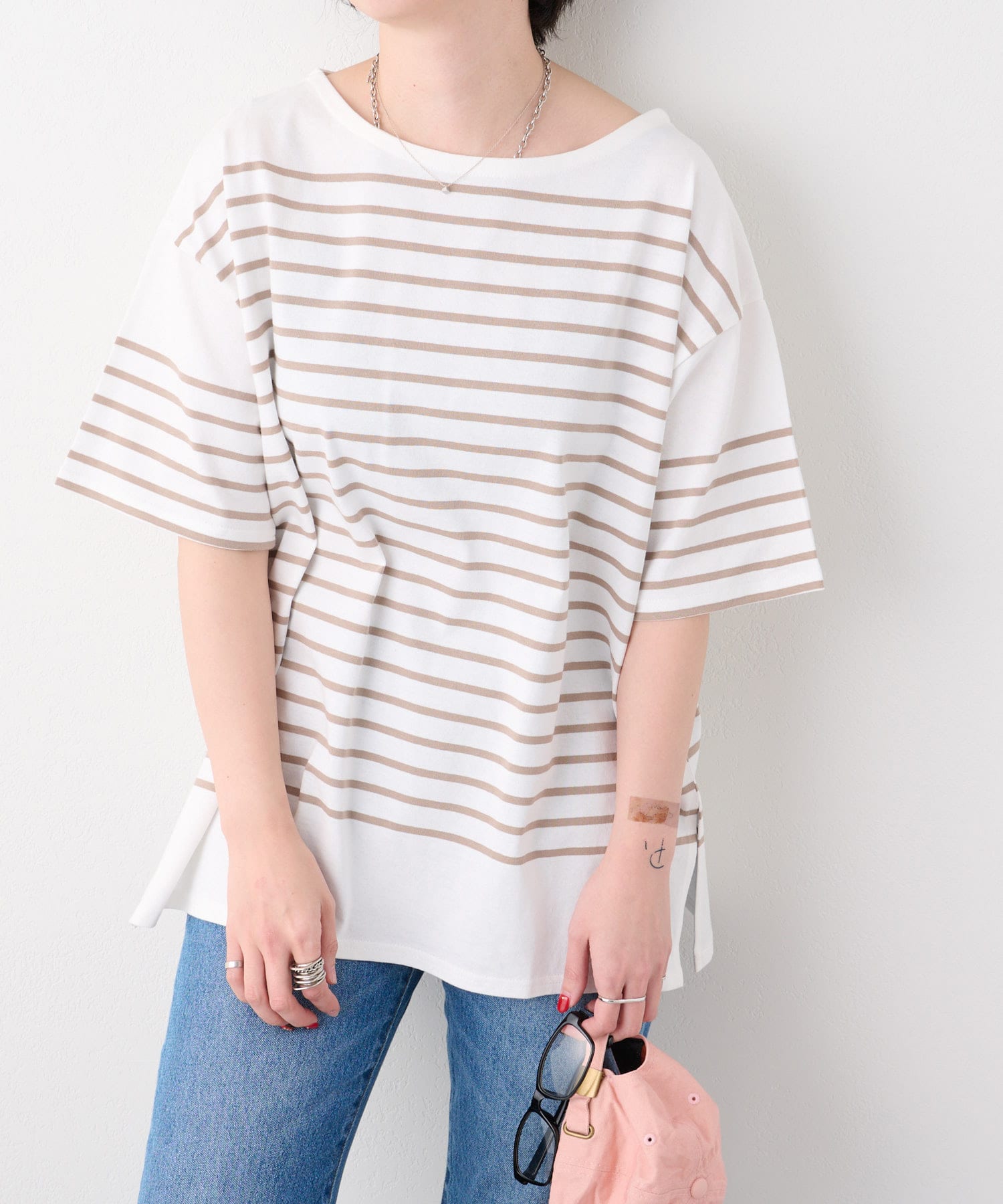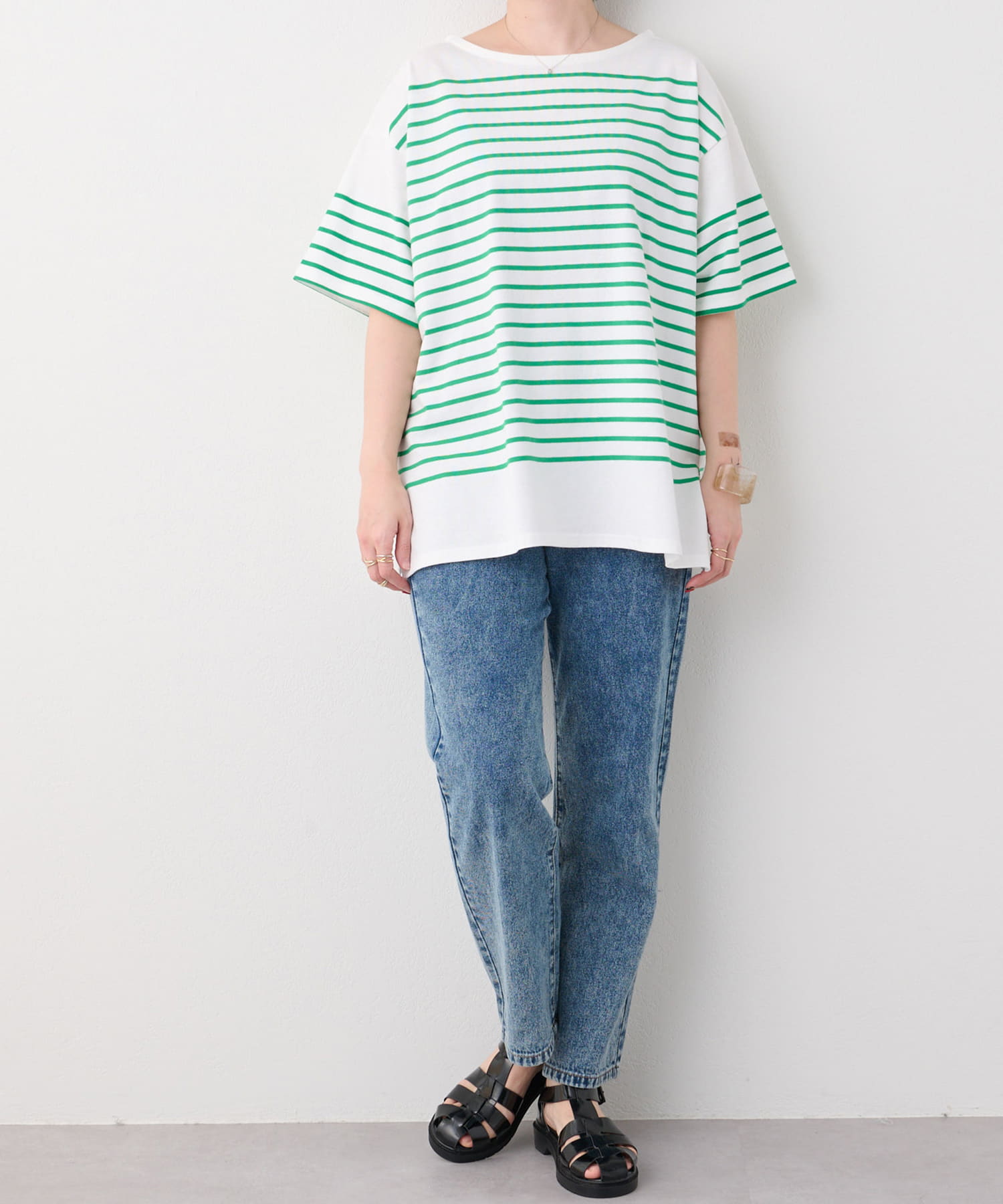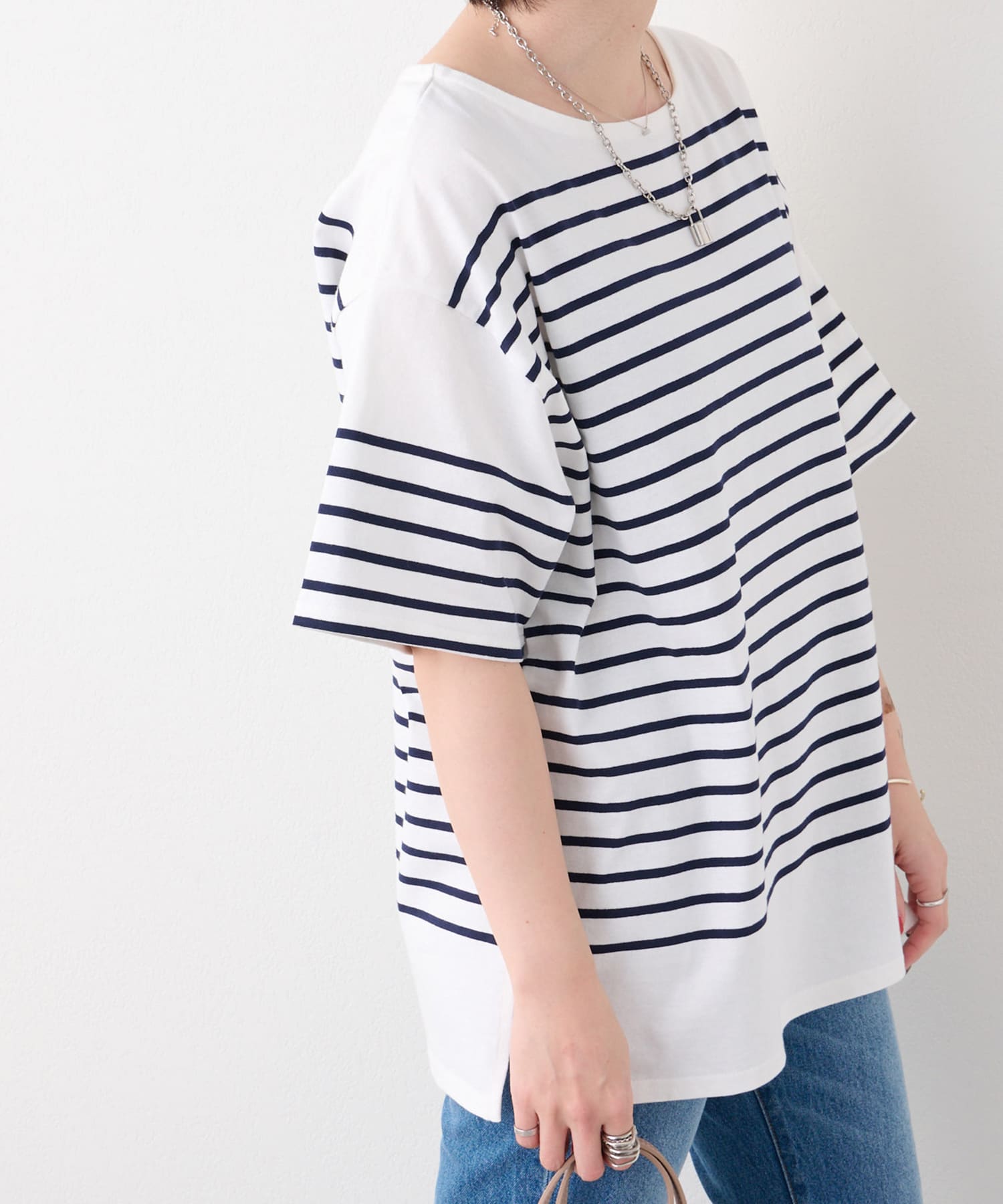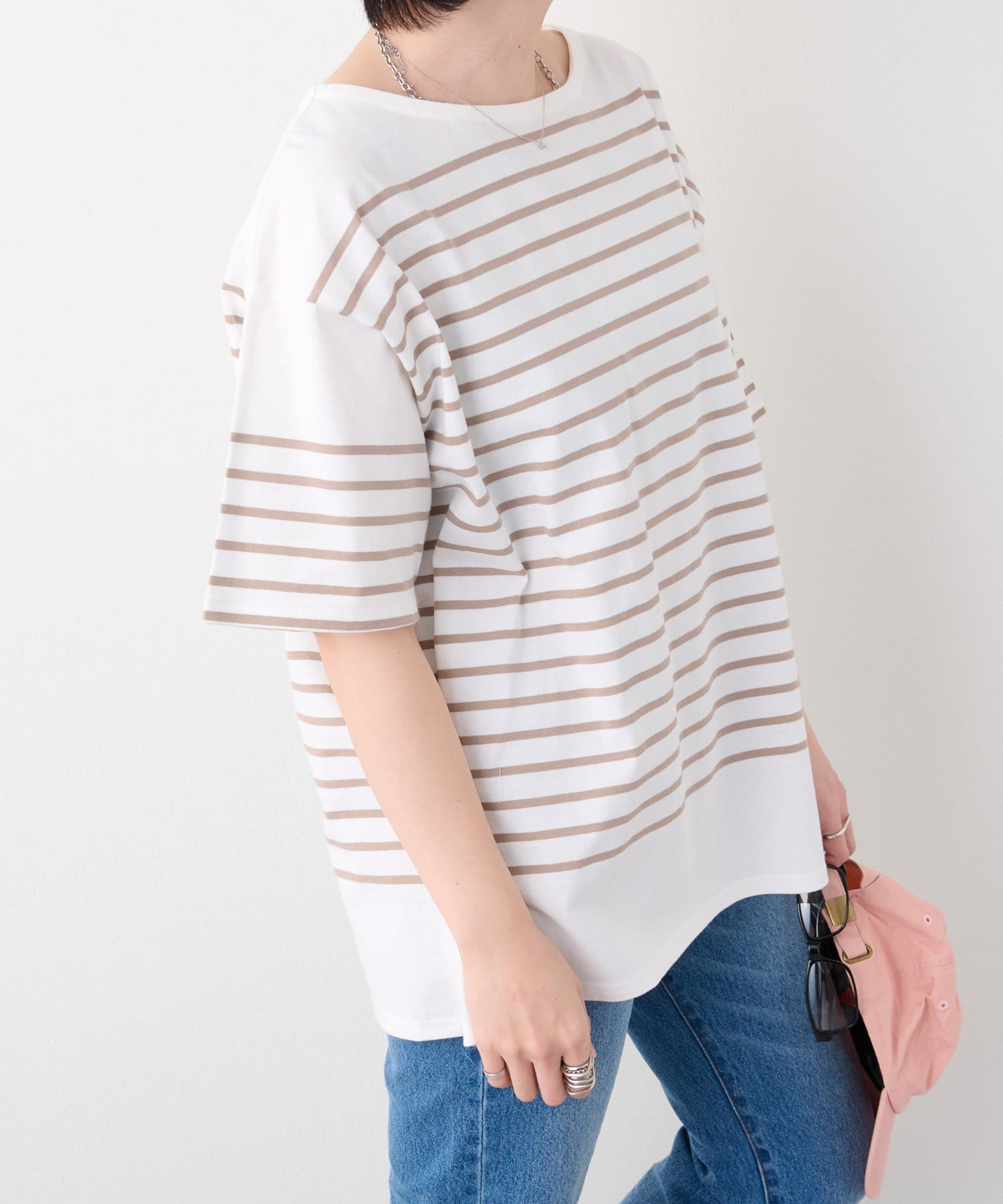 ・すっきりとしたボートネックと細めのボーダーで大人のカジュアルスタイルにマッチします。
