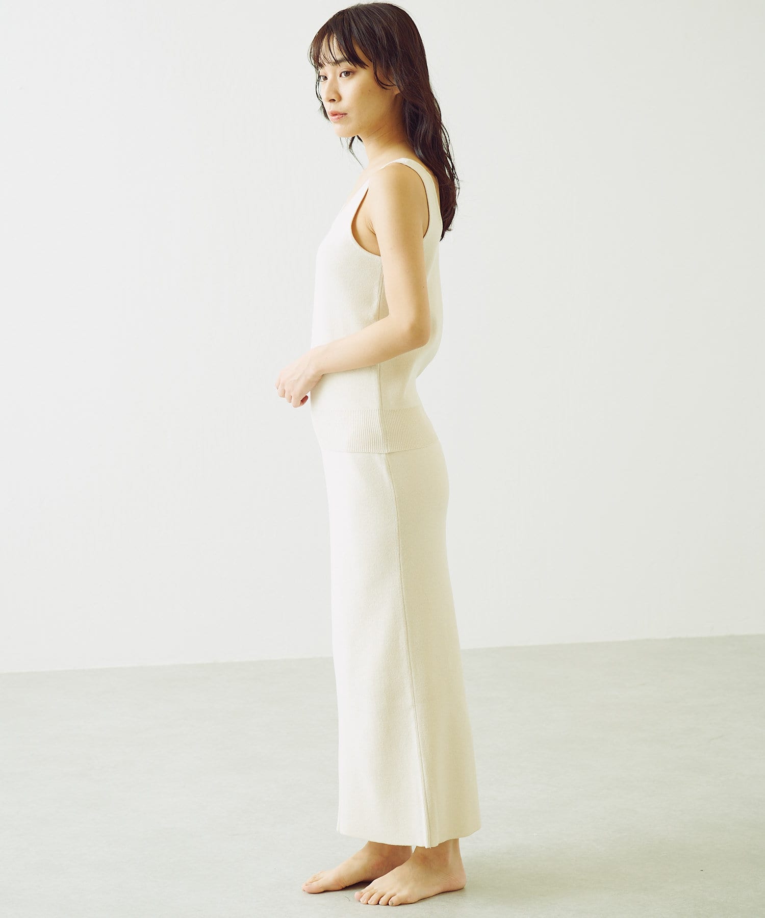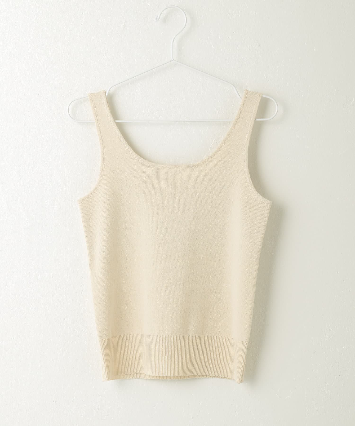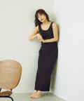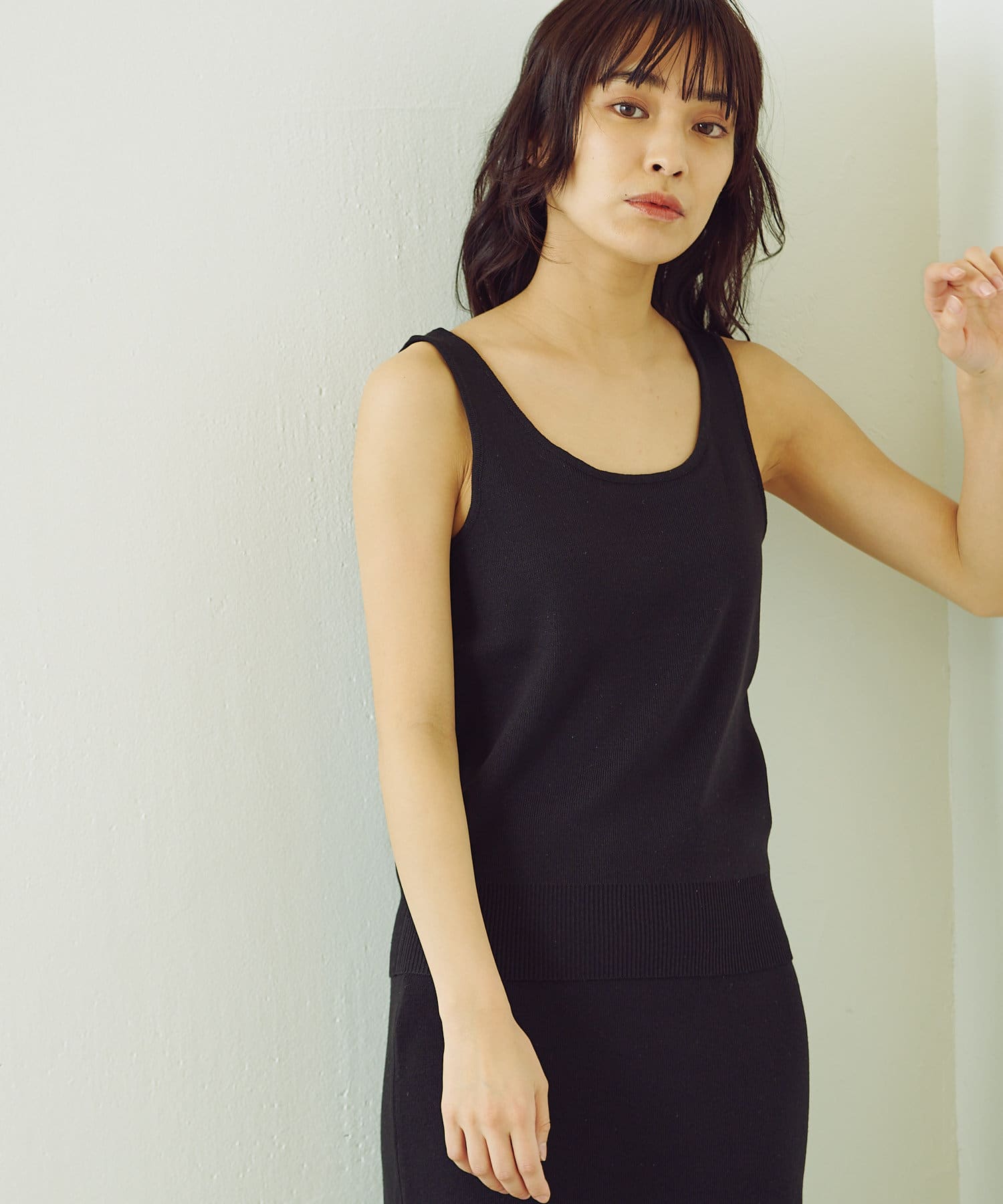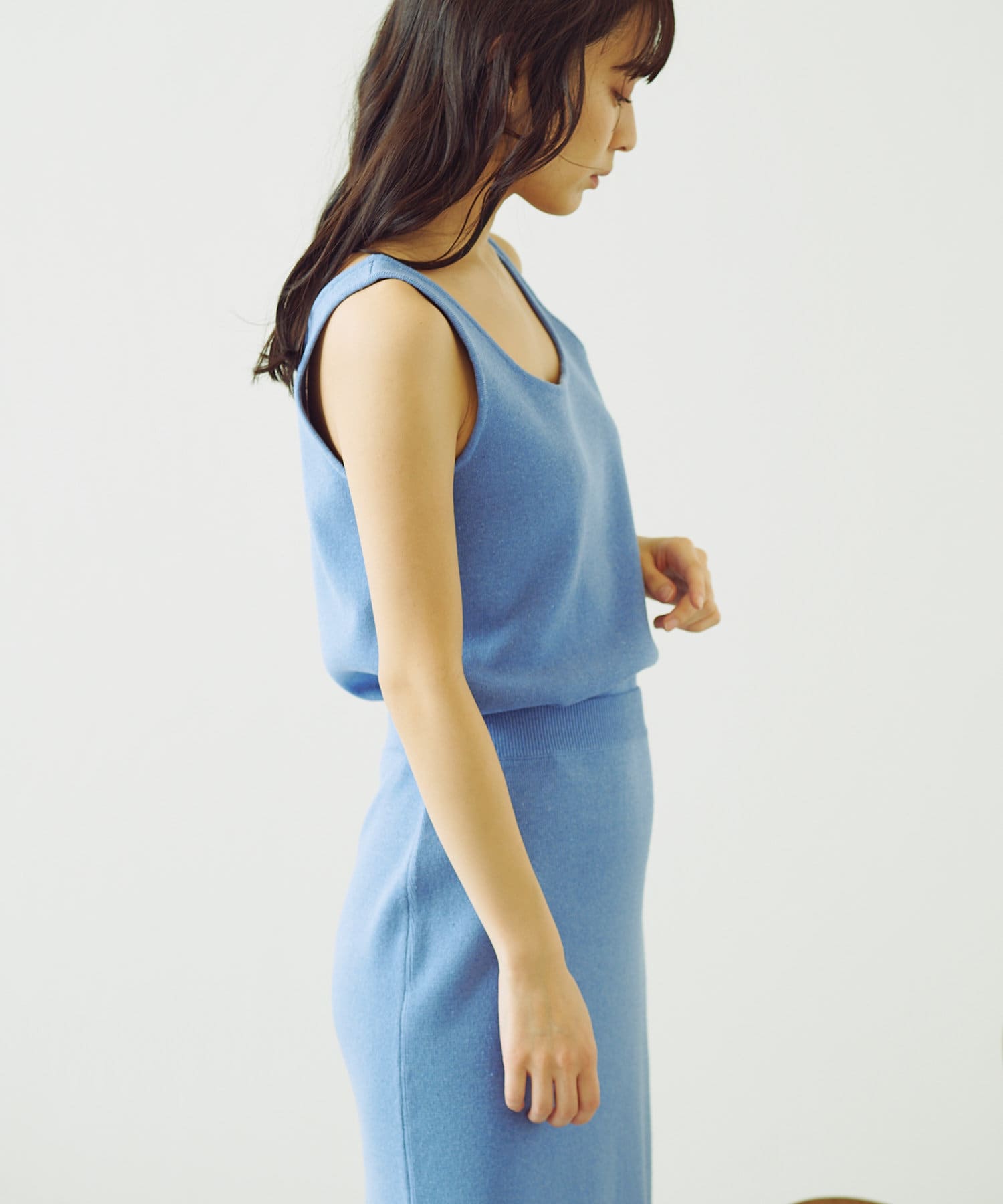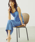 トップスのタンクトップは、程よい胸元の開きがポイント。