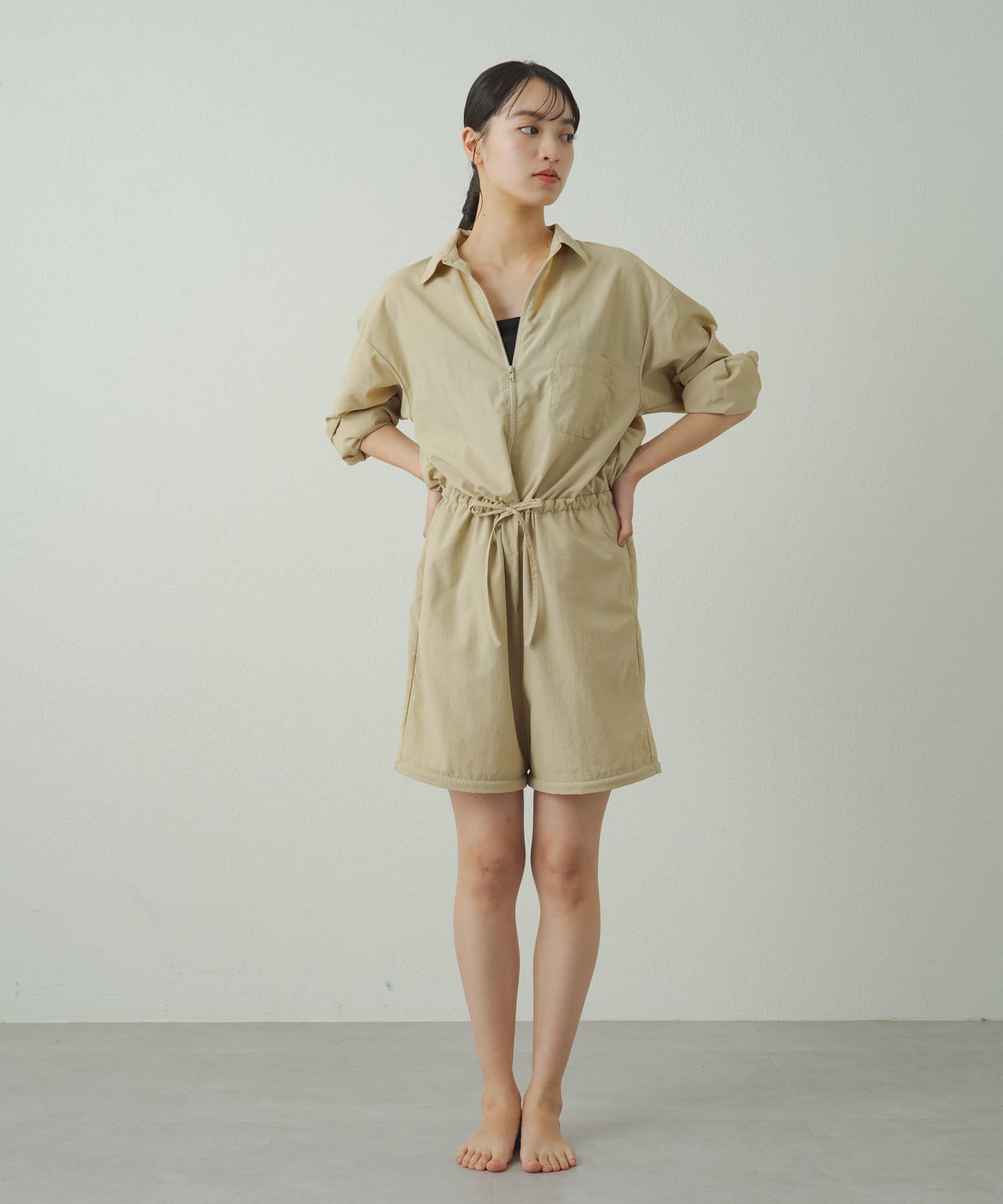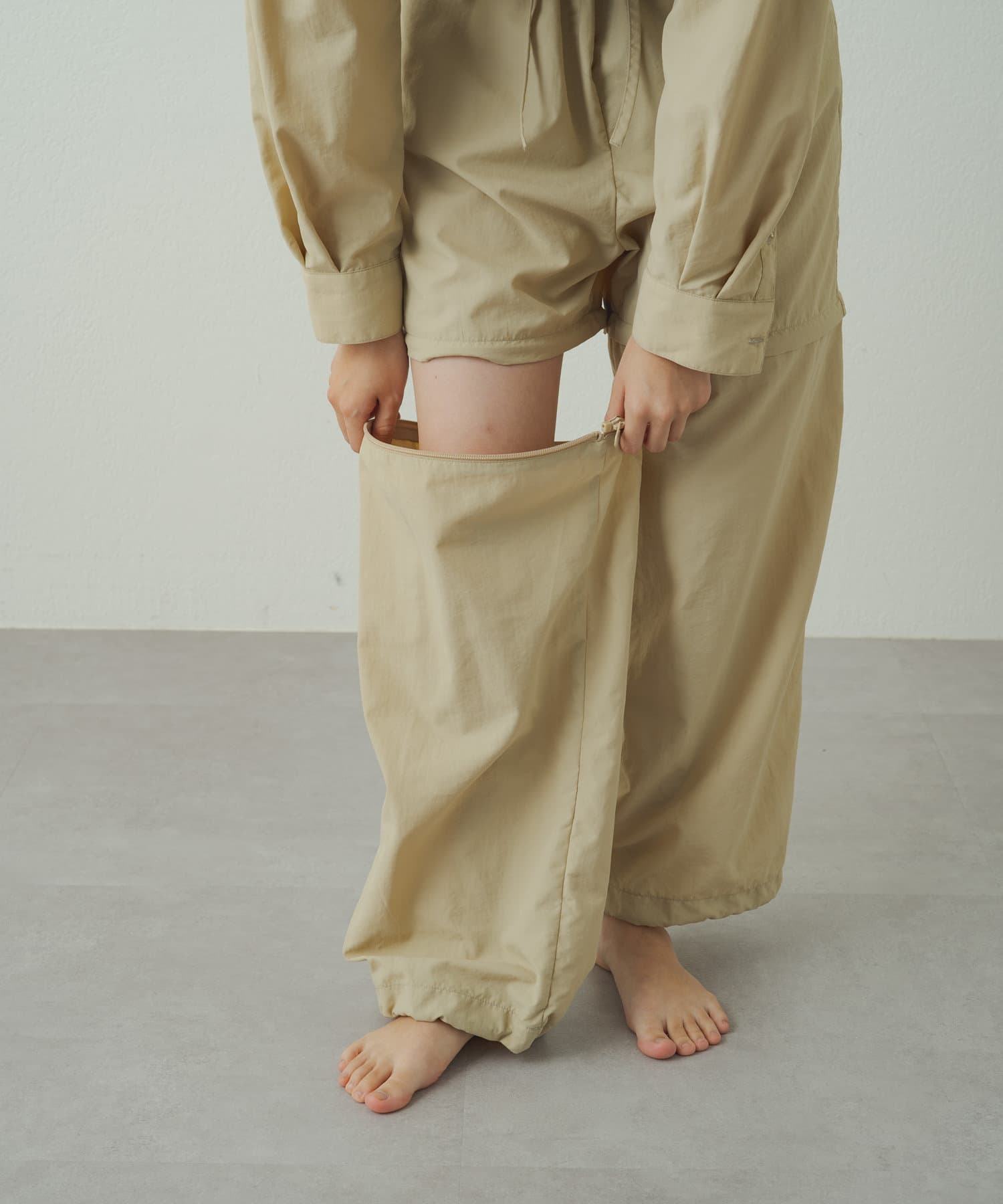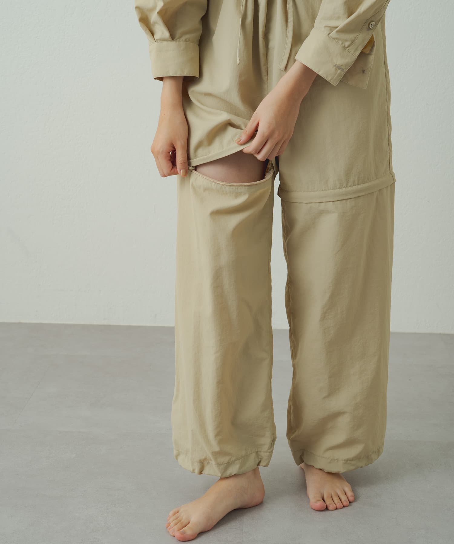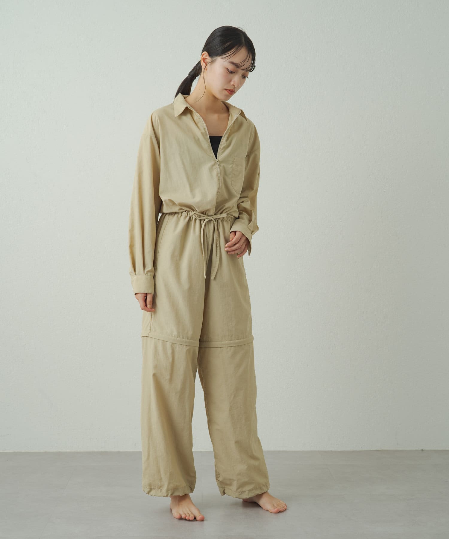 膝上にあるファスナーで裾が取り外し可能でハーフパンツの丈に変化するオールインワン