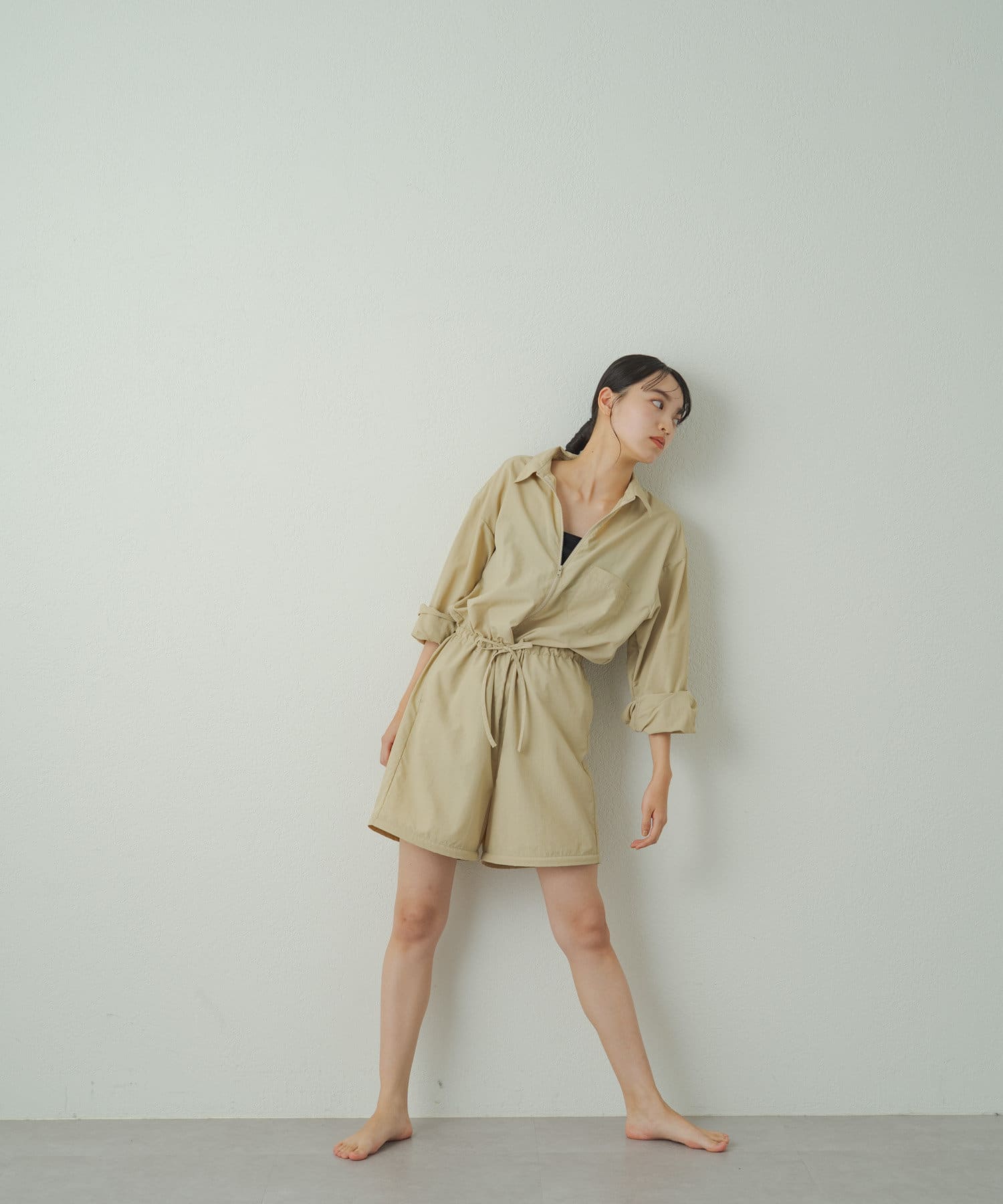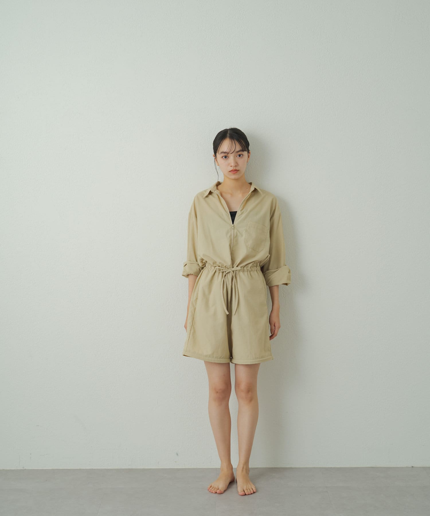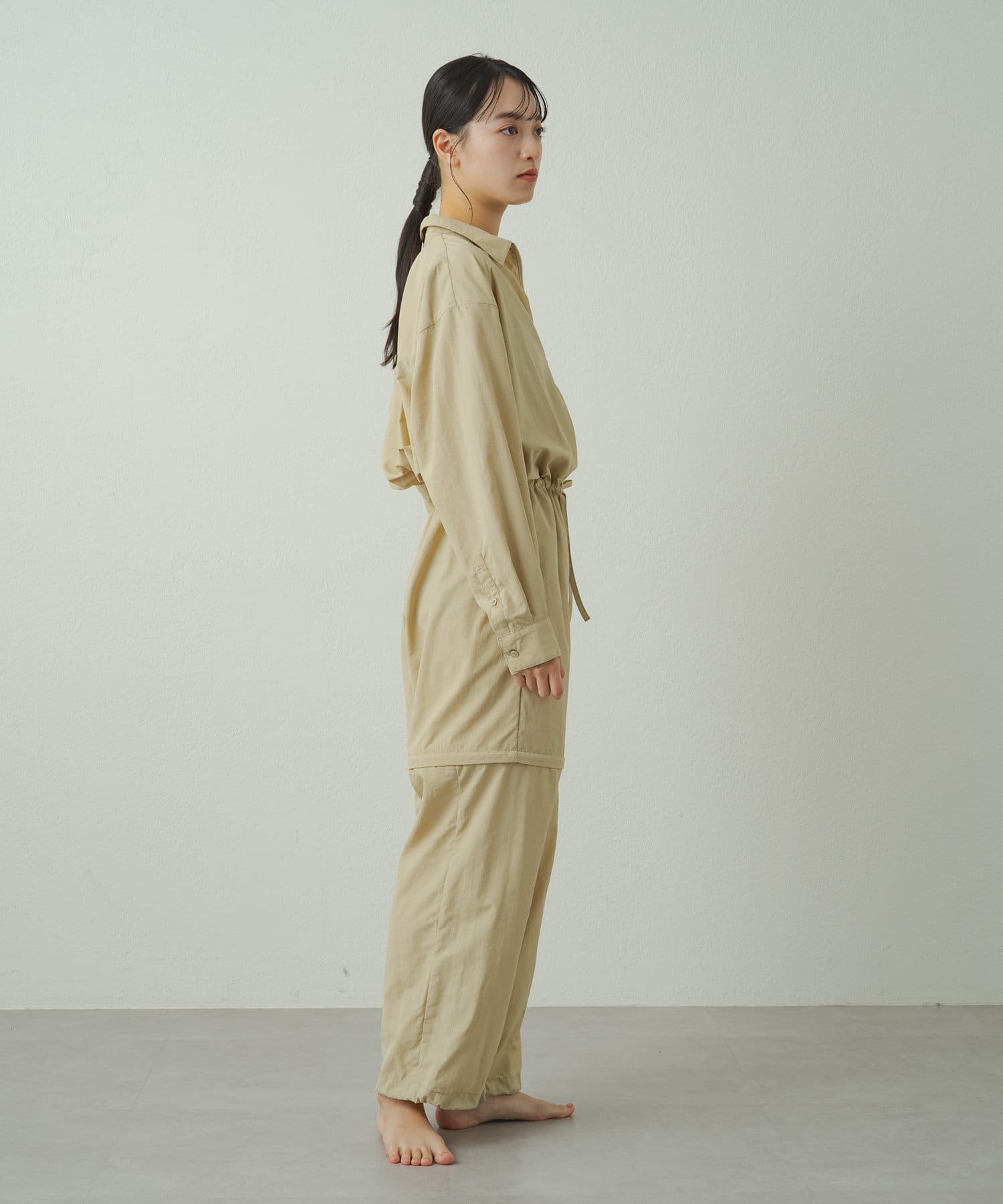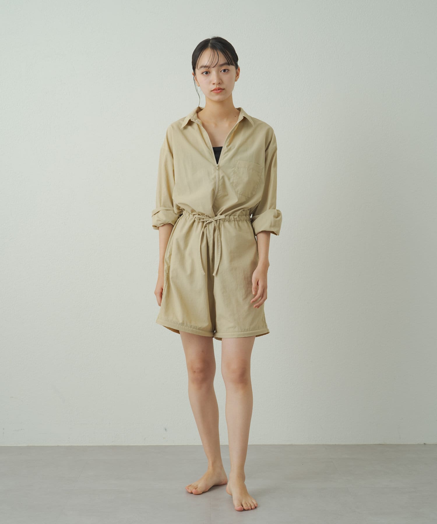 膝上にあるファスナーで裾が取り外し可能でハーフパンツの丈に変化するオールインワン