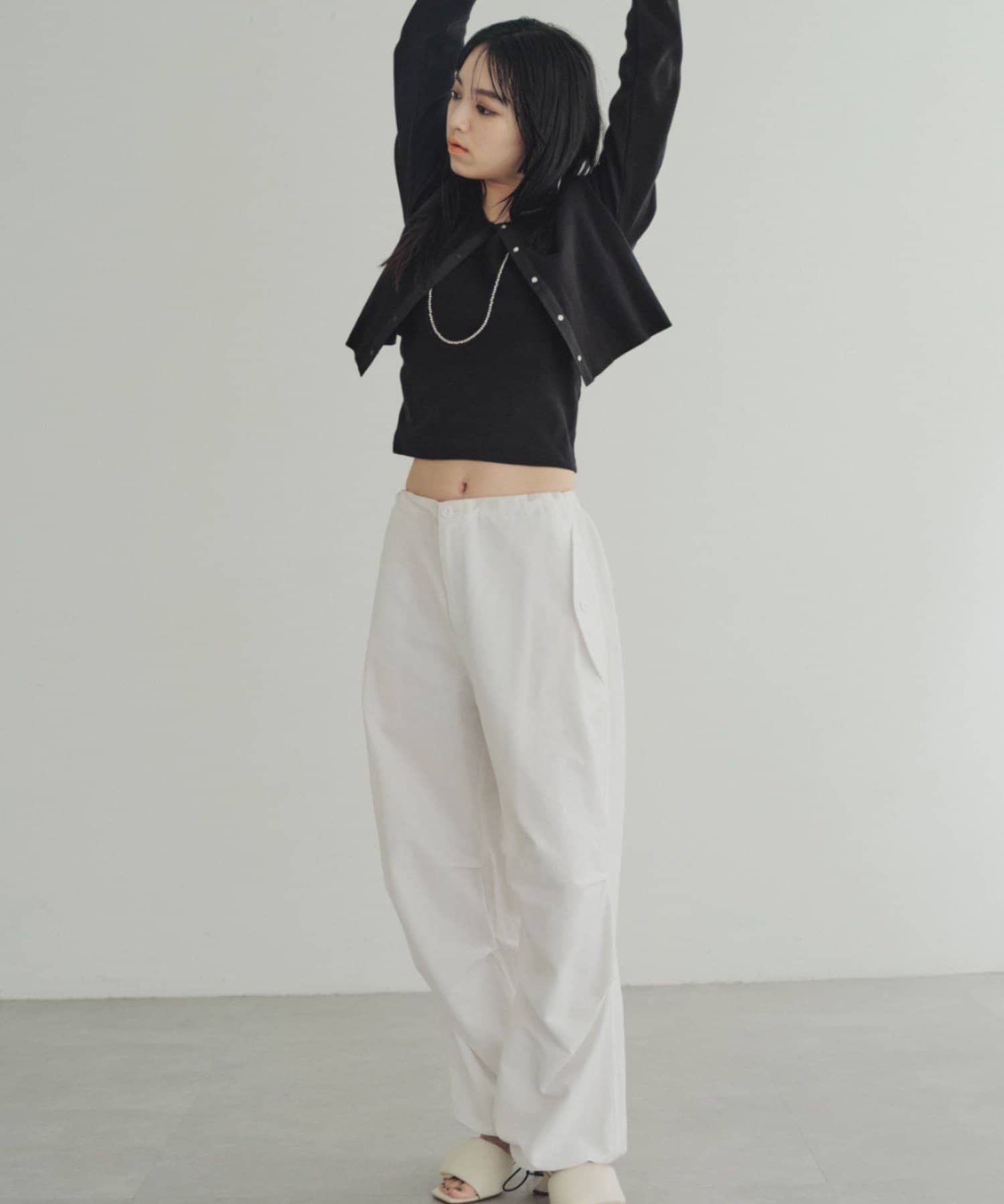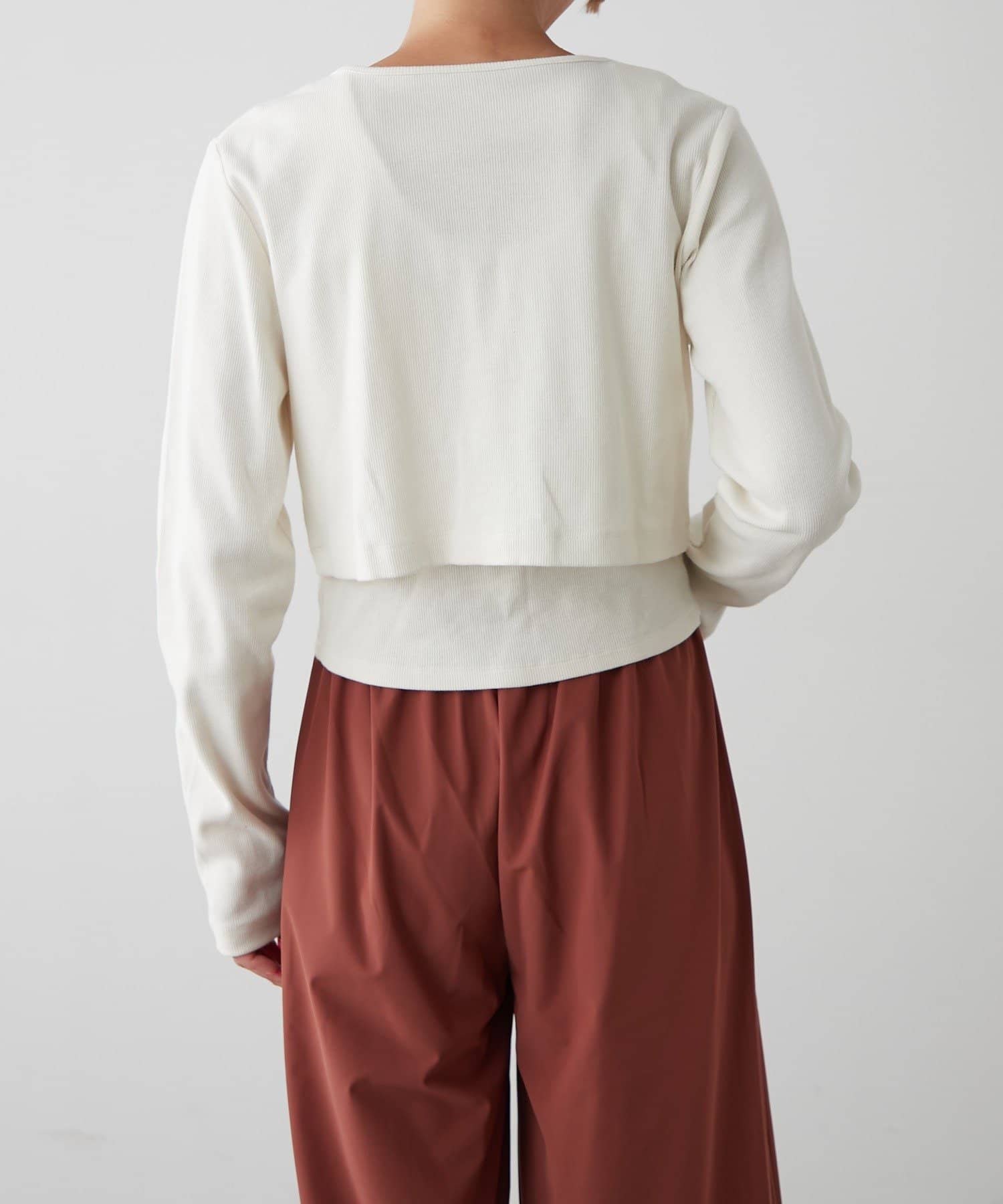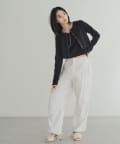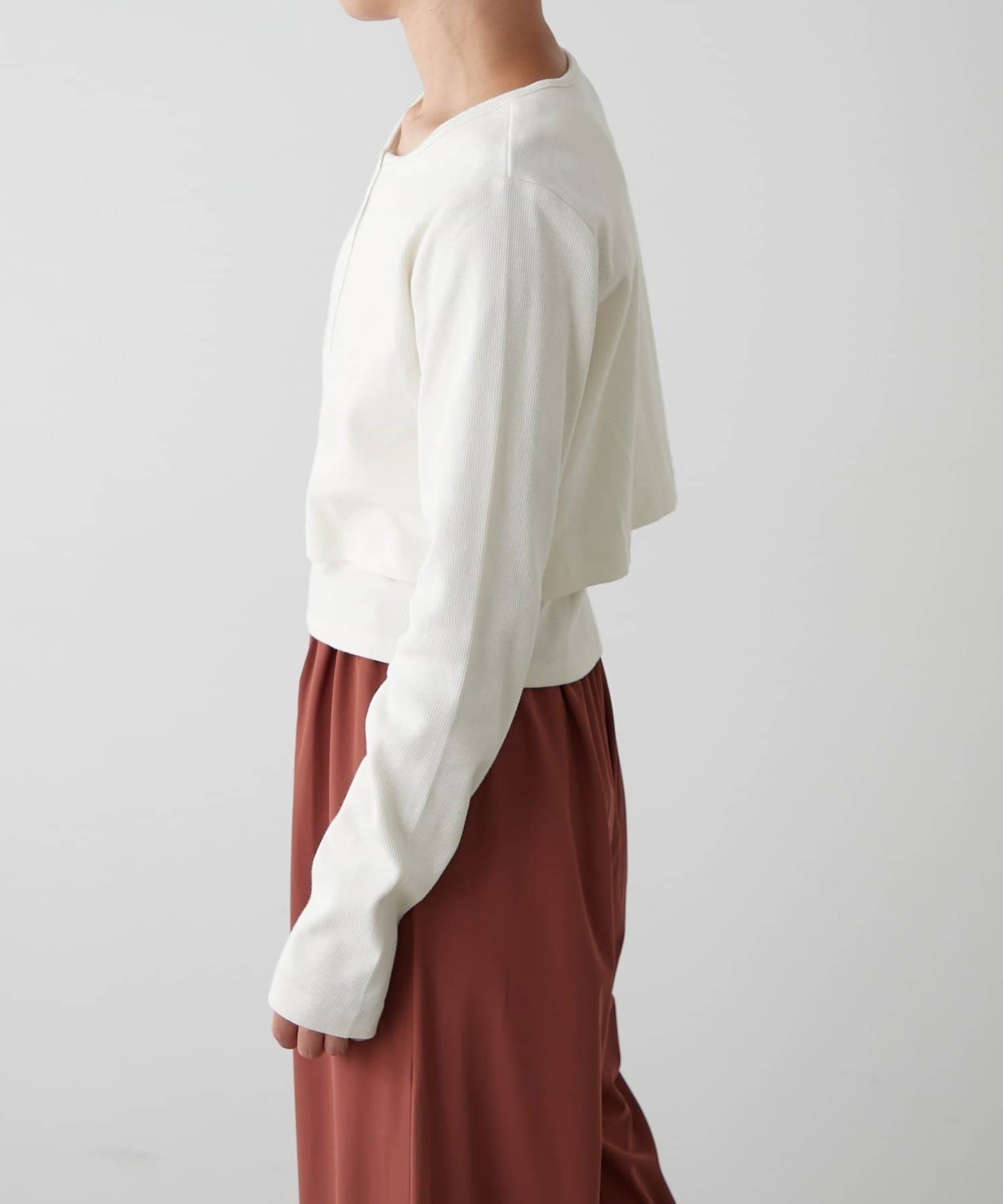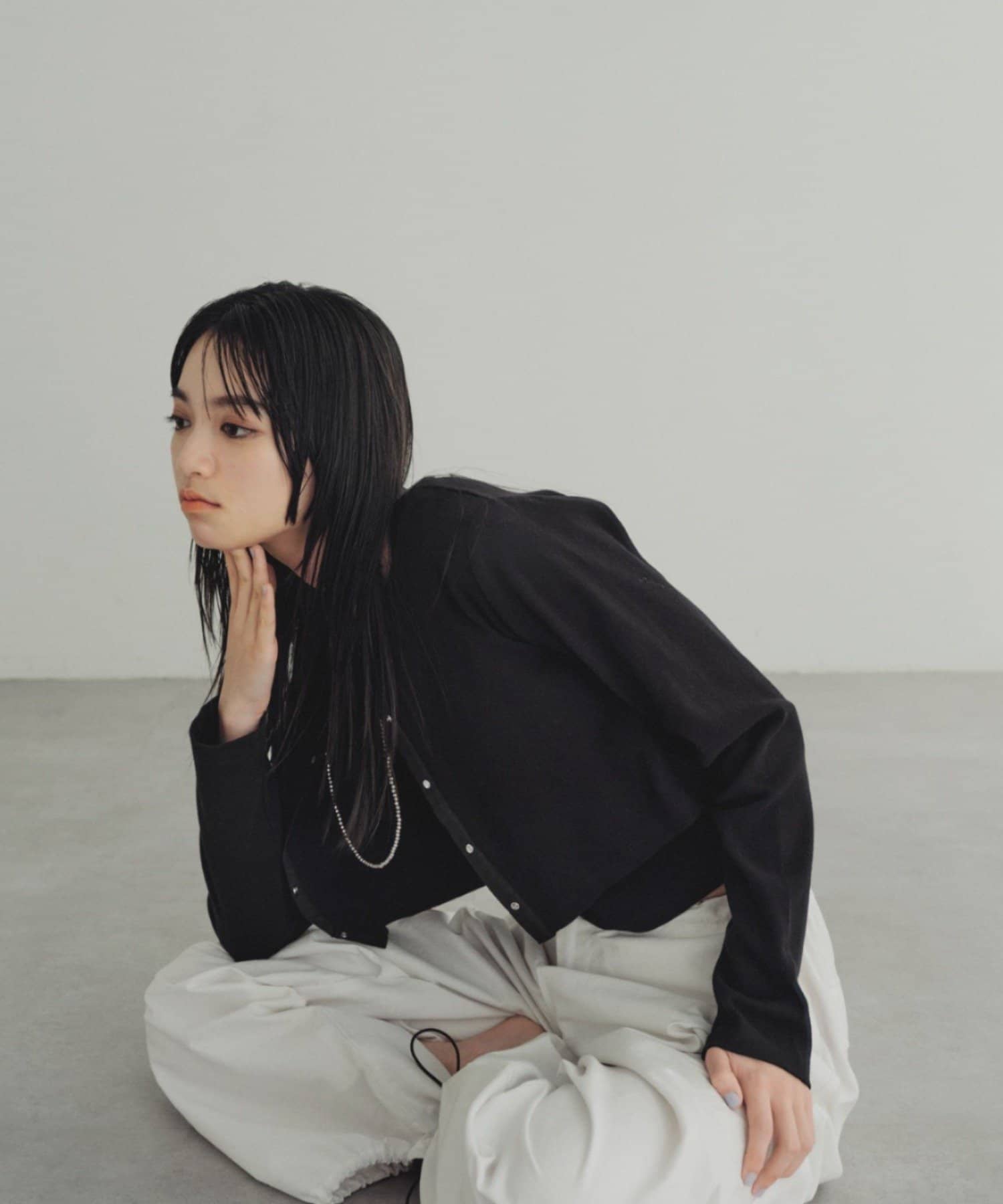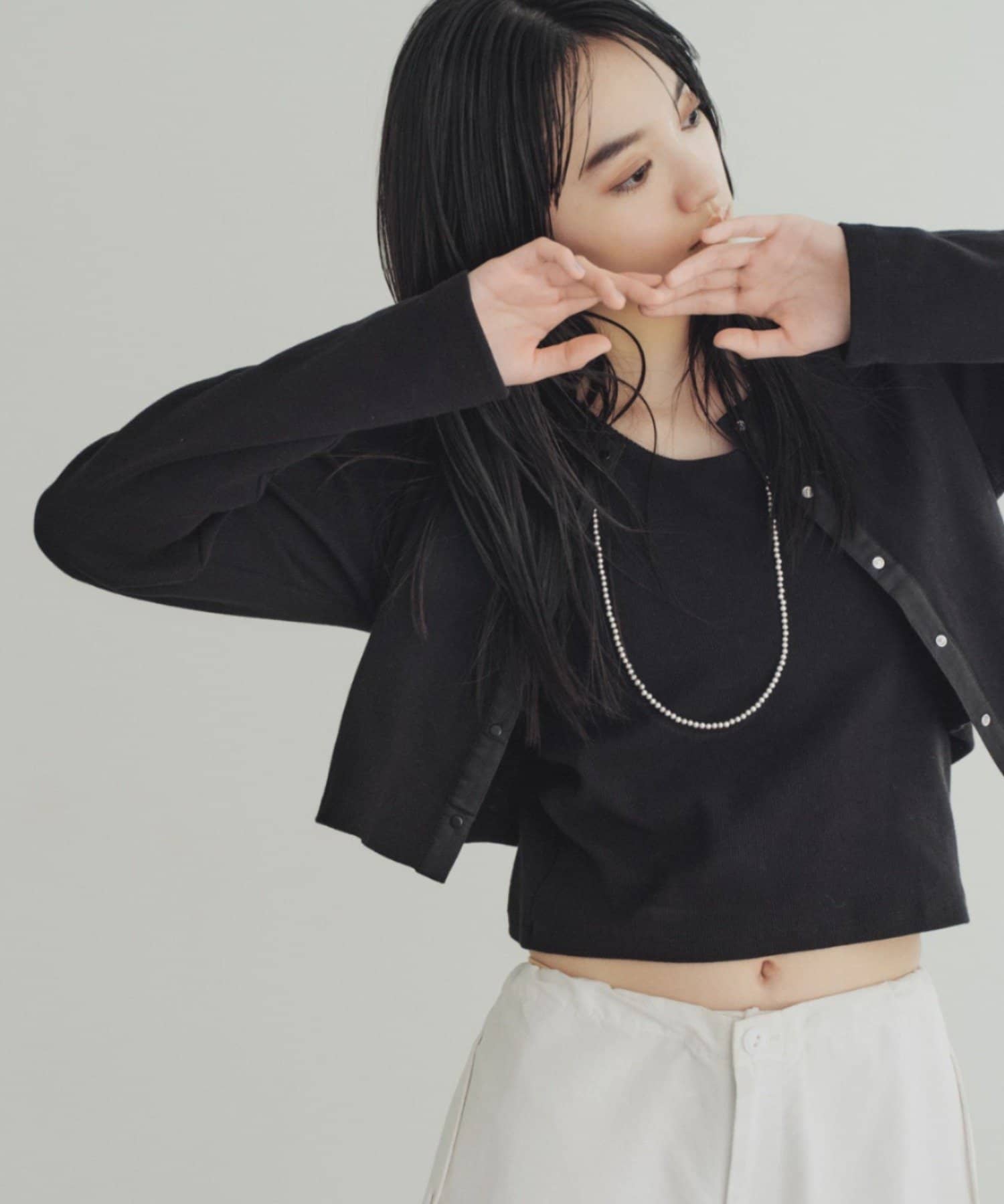 ・ジャスト丈でややコンパクトなサイズ感ですが身体のラインを拾いにくいリブ素材で、細見えする一枚。