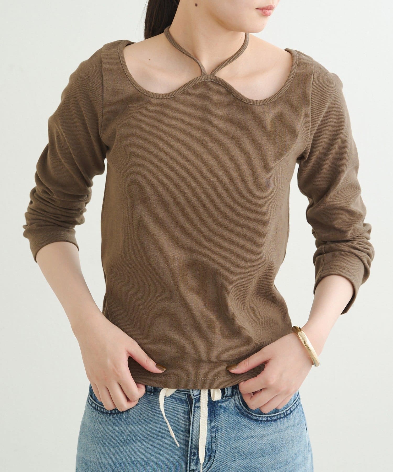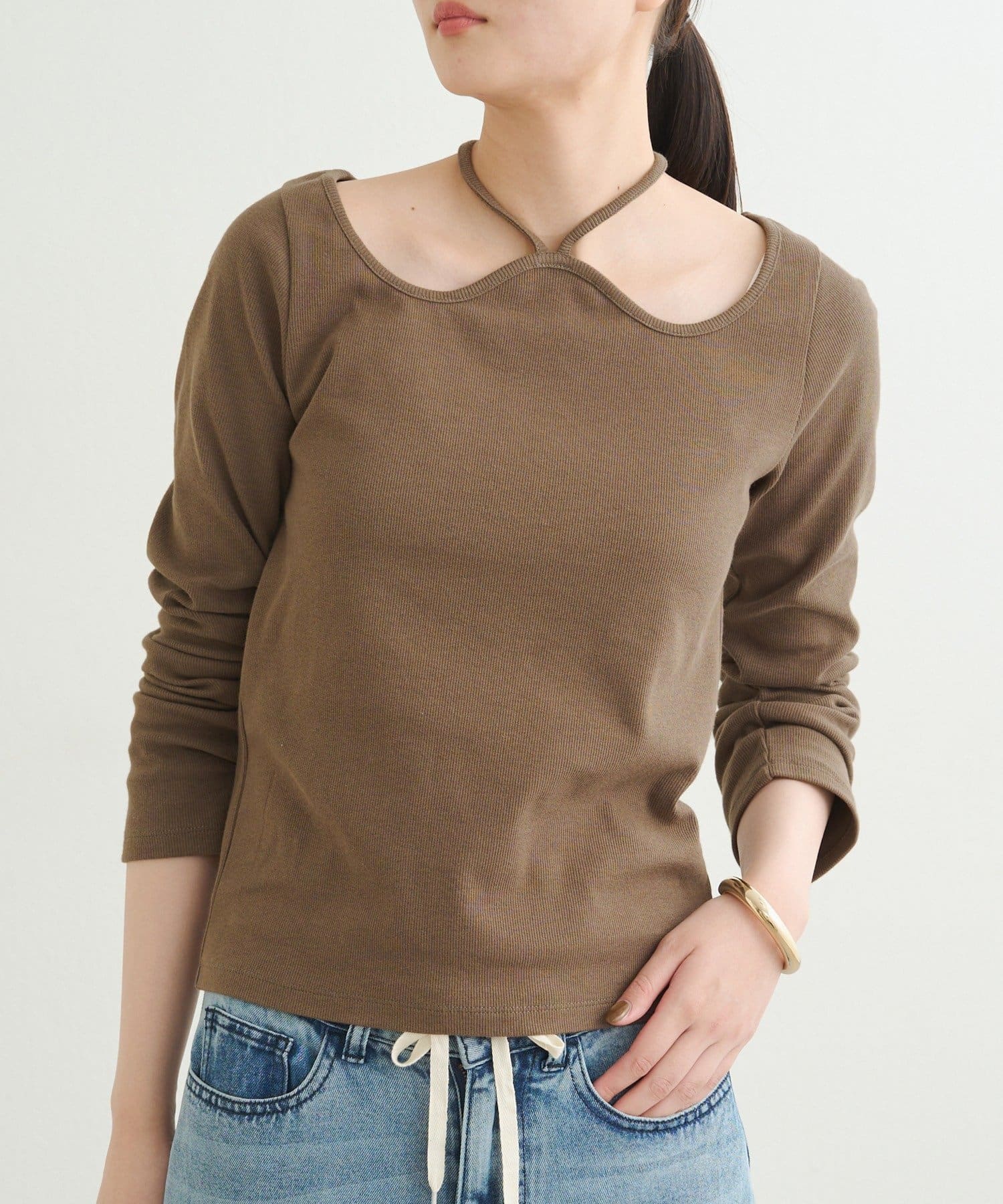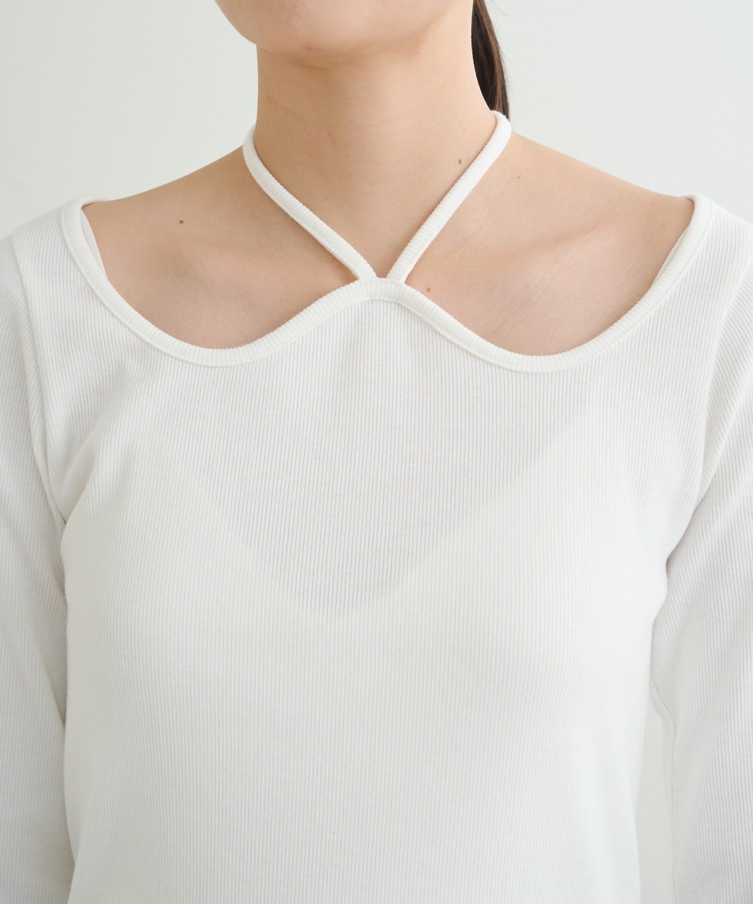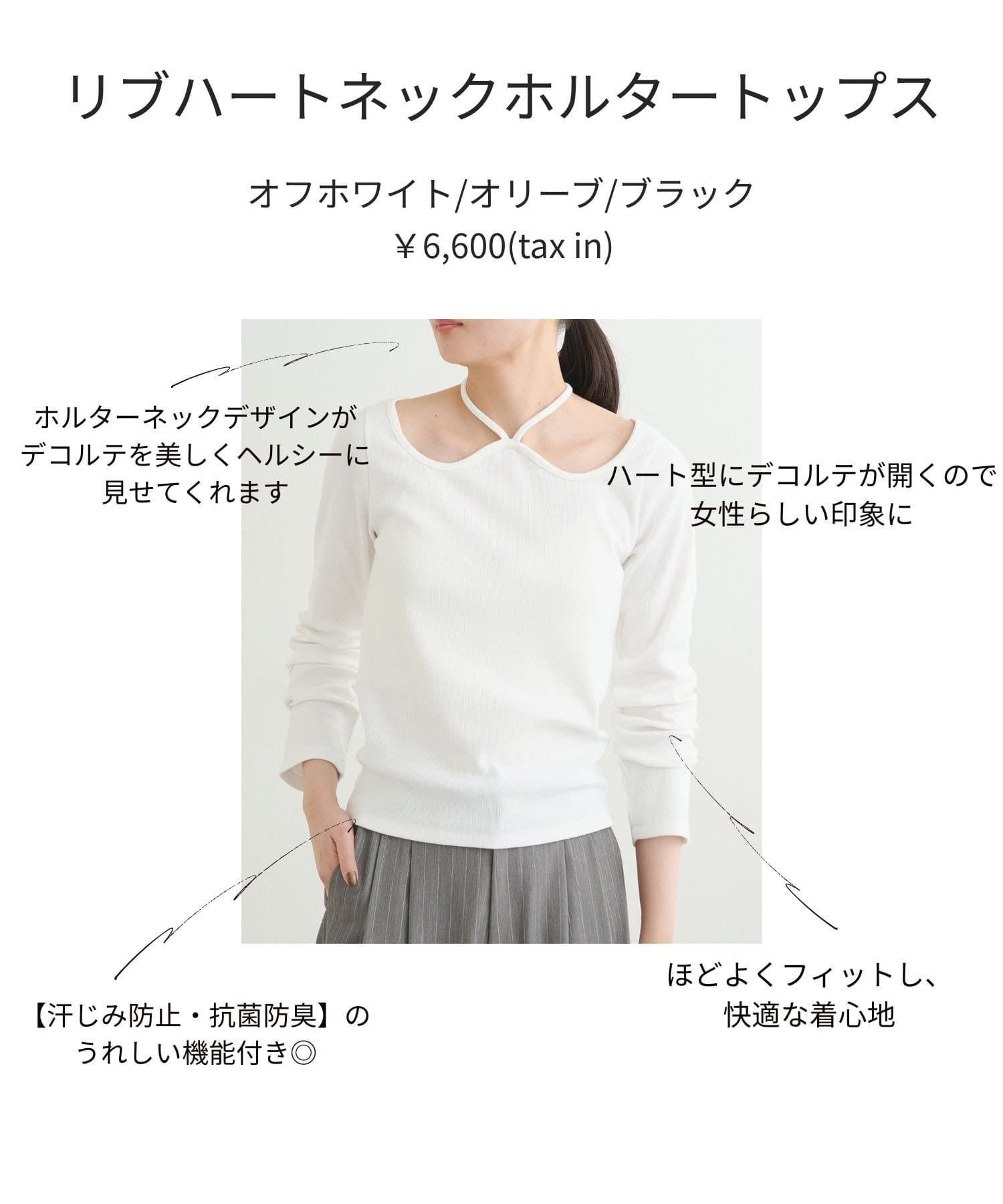 ヘルシーな肌見せのリブハートネックホルタートップス