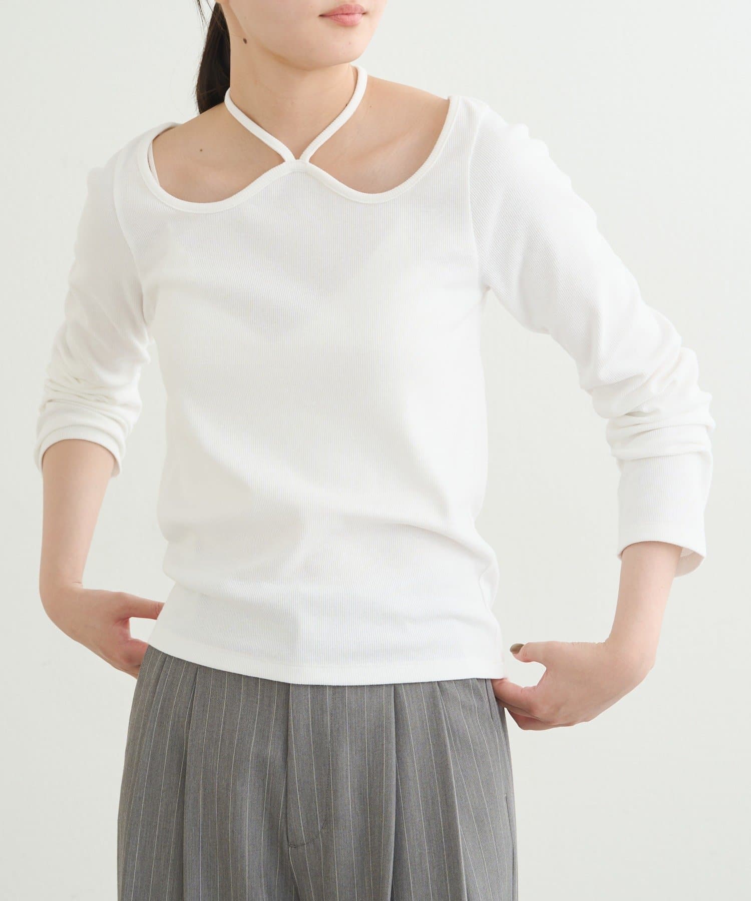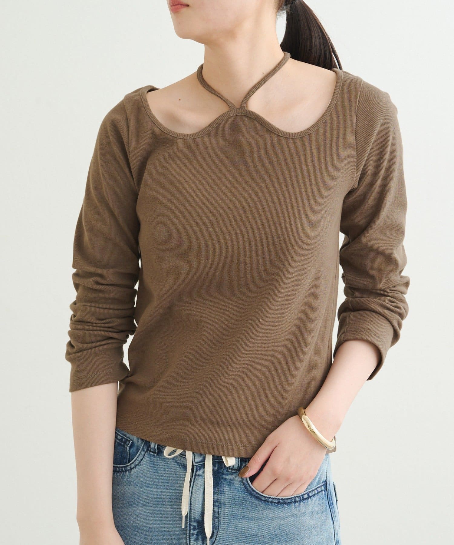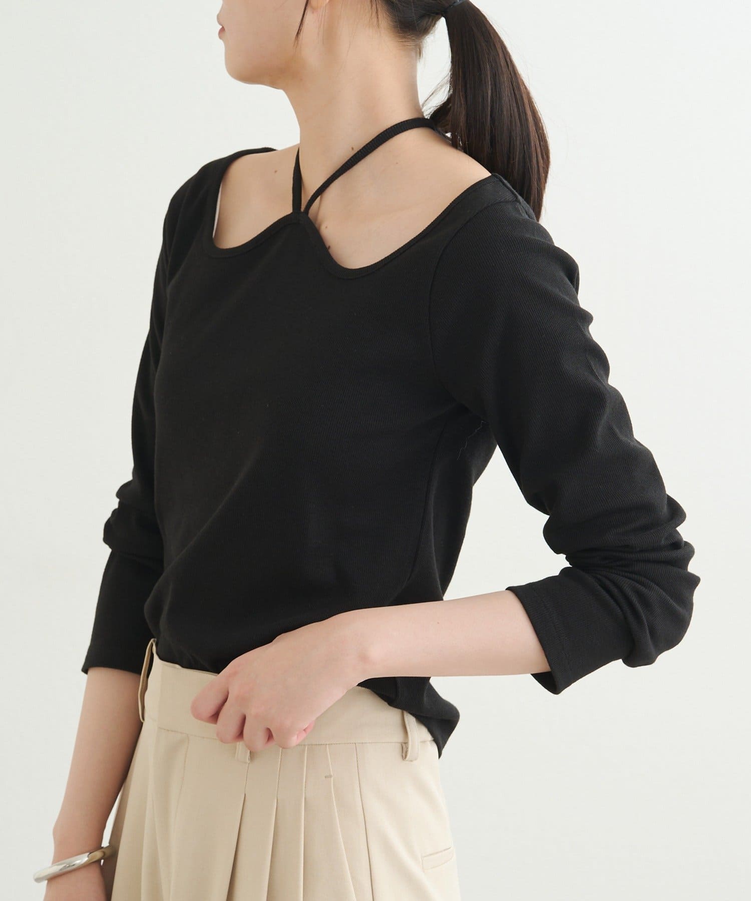 ヘルシーな肌見せのリブハートネックホルタートップス