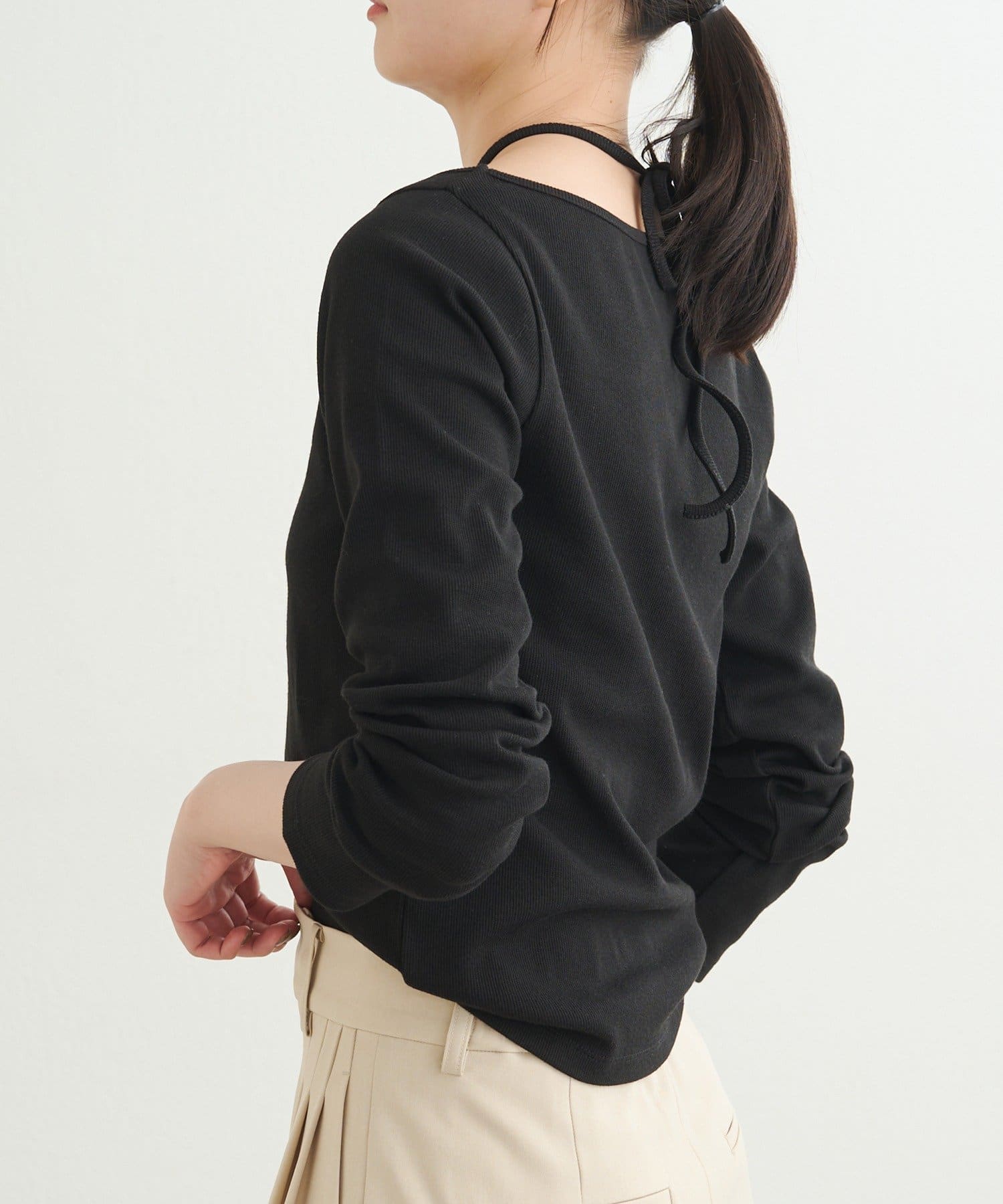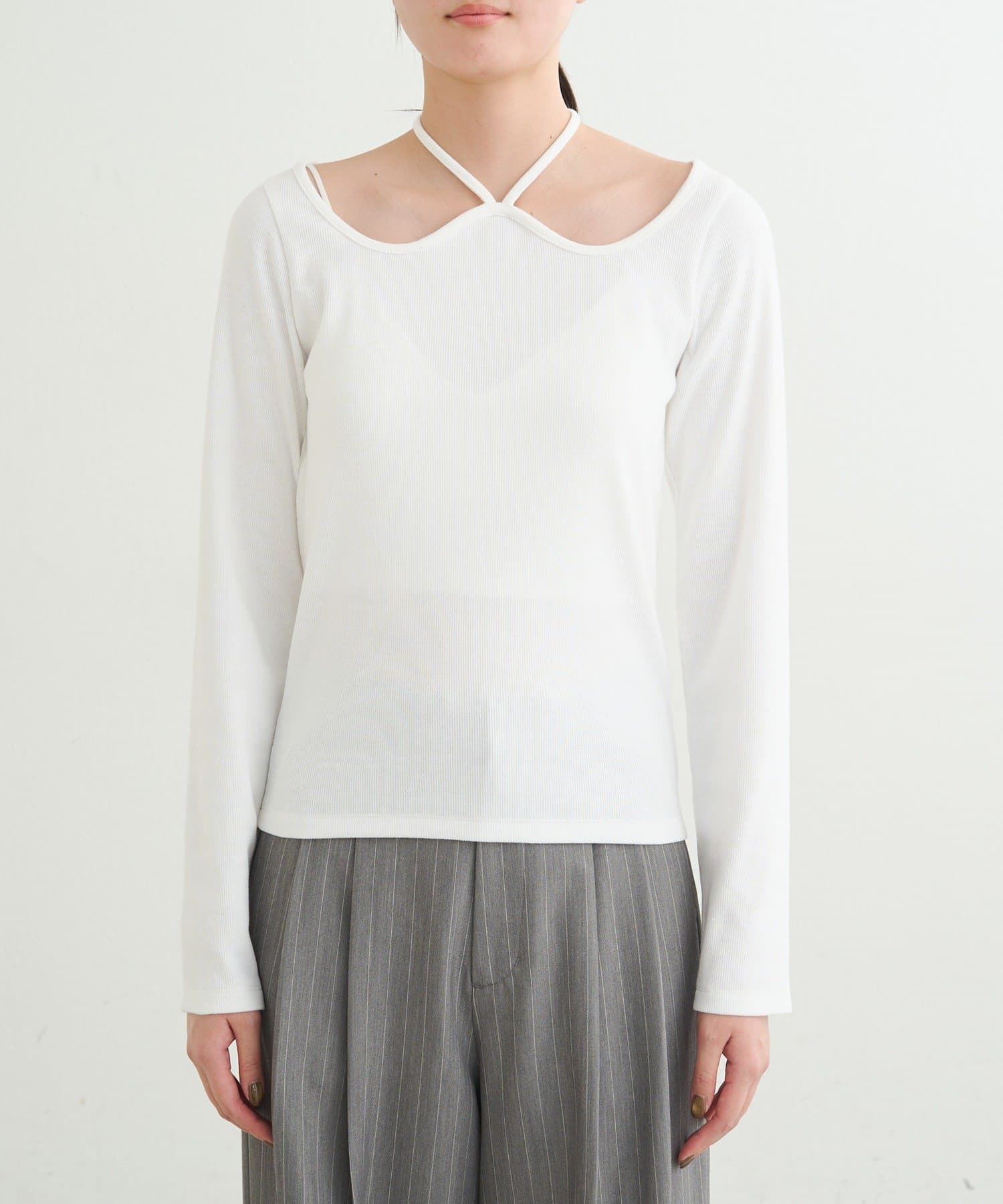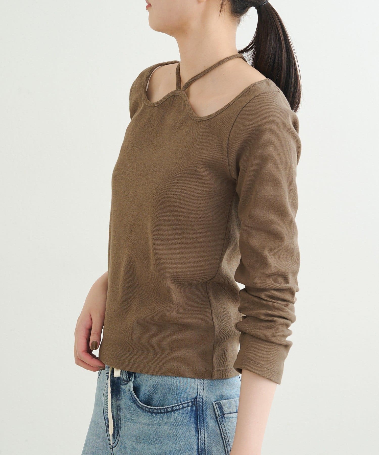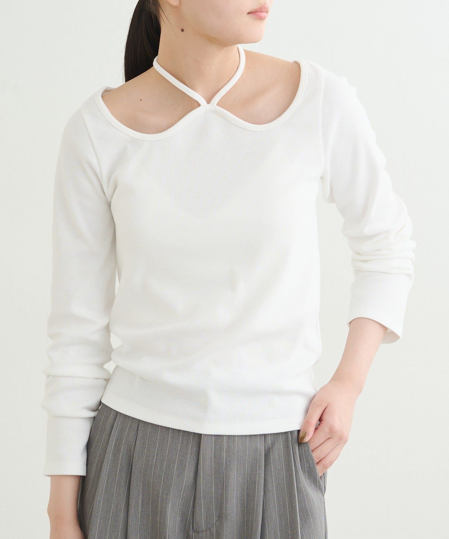 ヘルシーな肌見せのリブハートネックホルタートップス