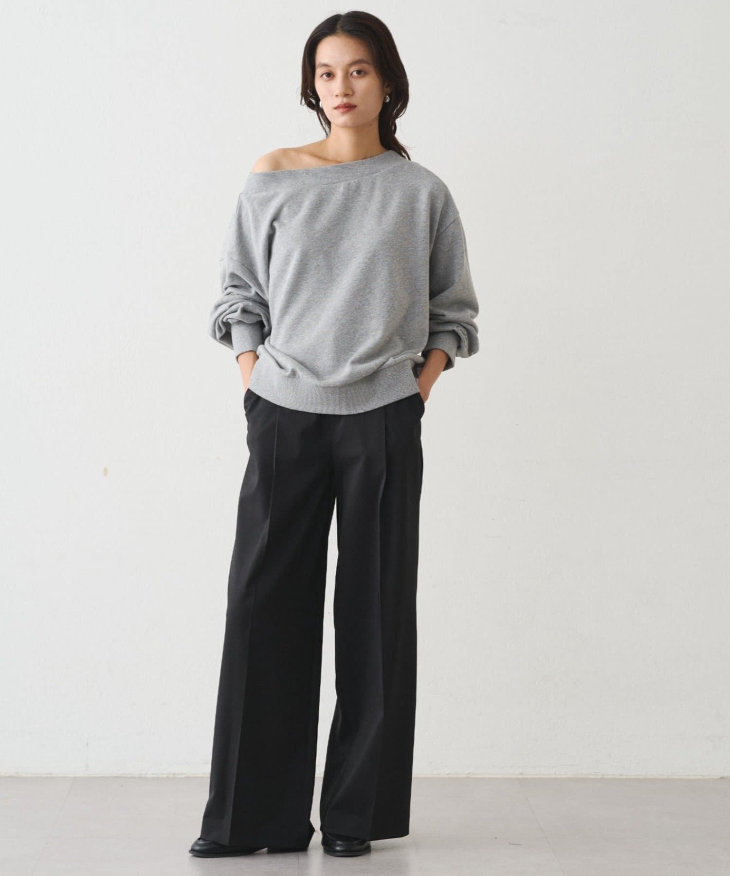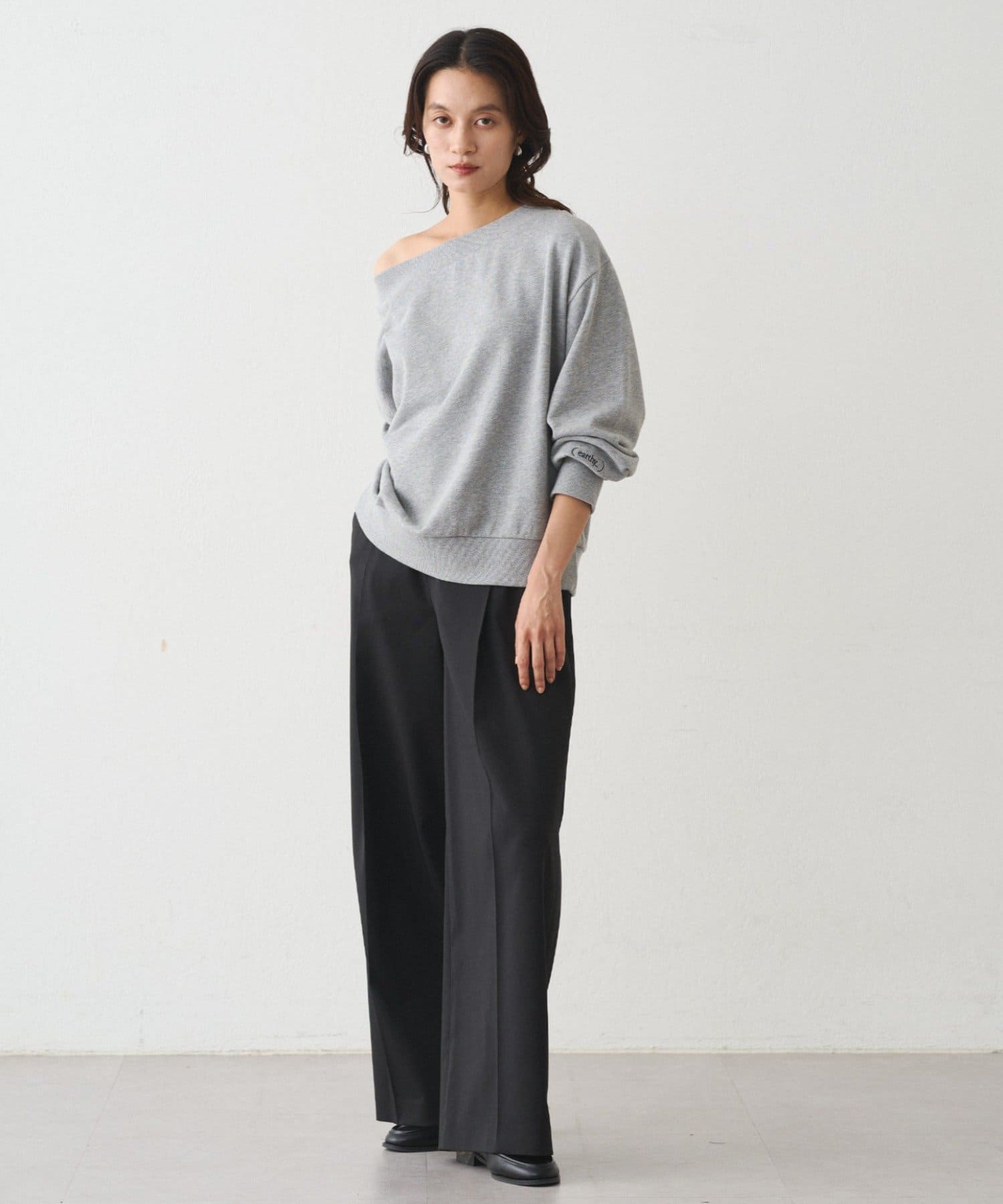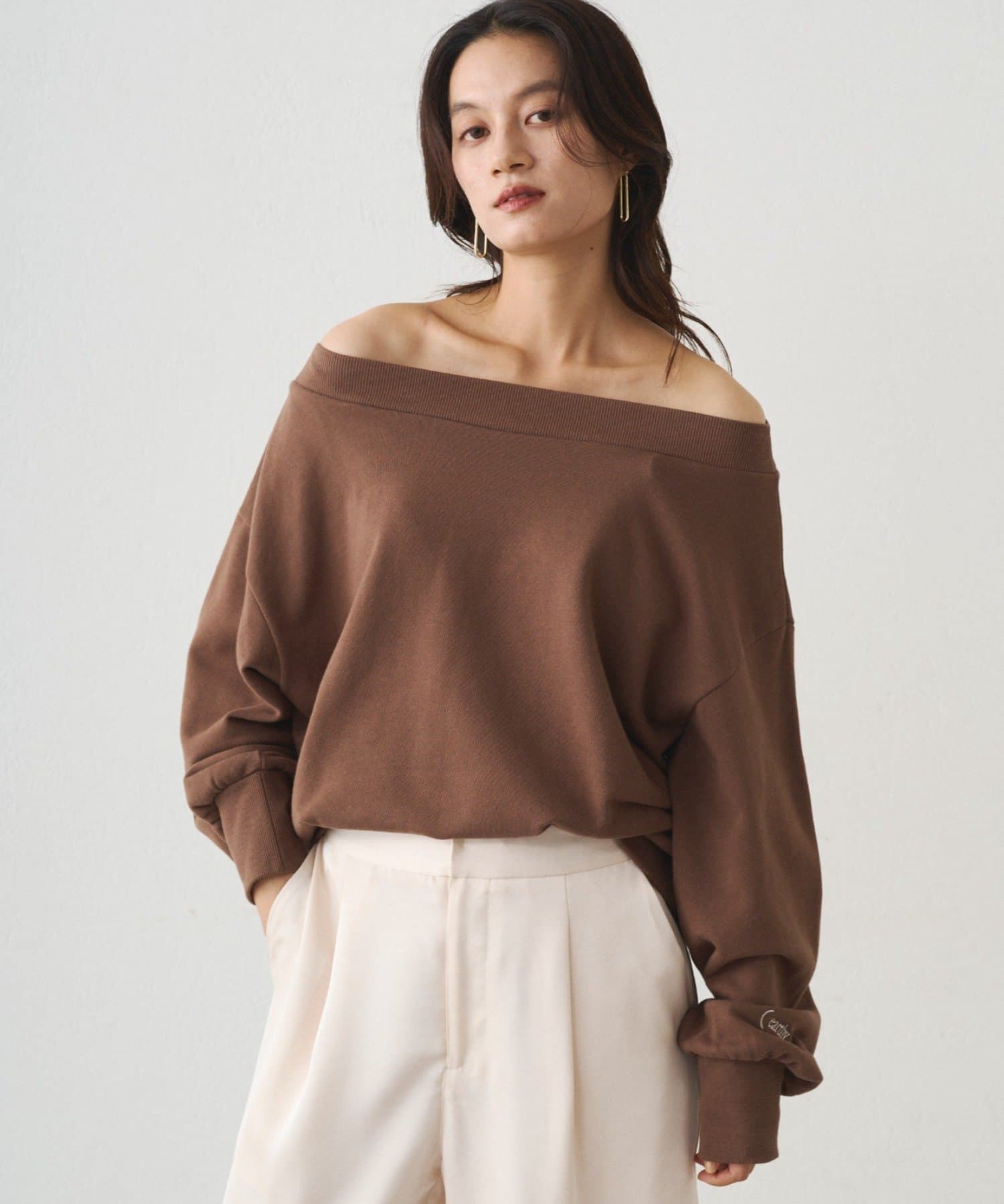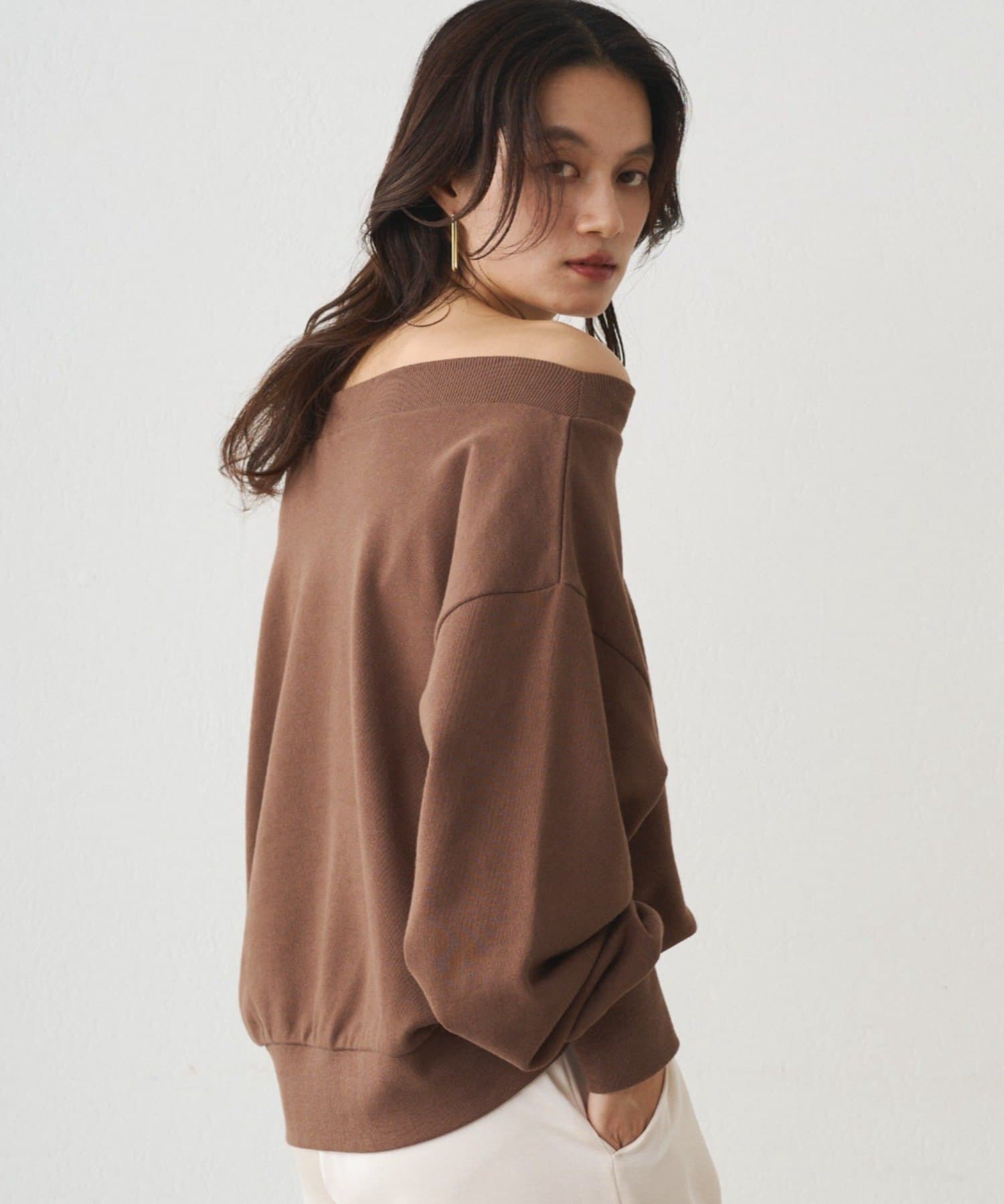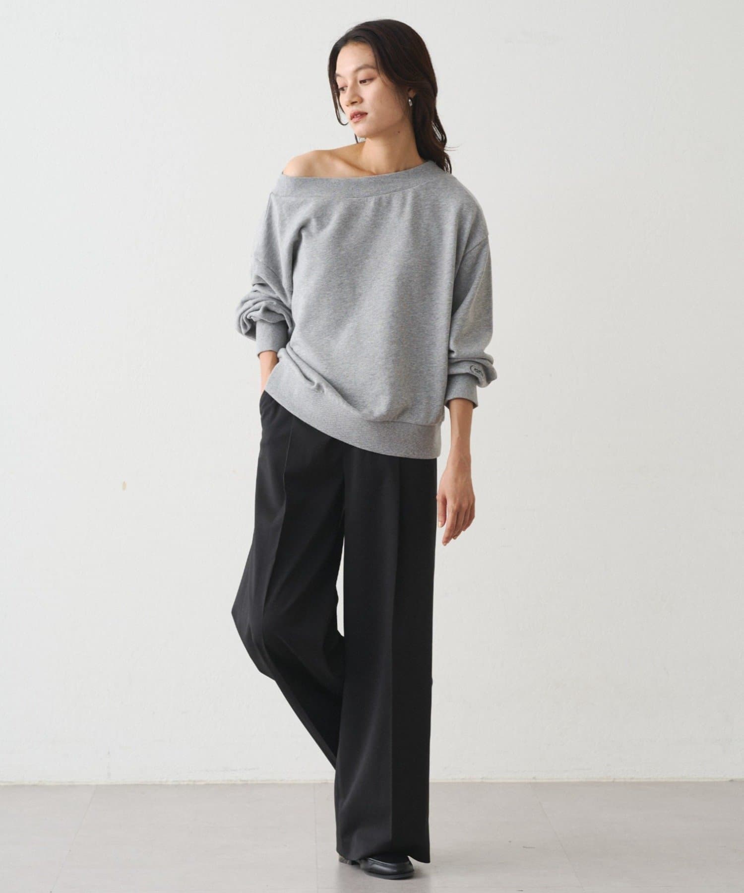 ・ラフな印象のスウェット素材を、大胆なオフショルダーに仕立てることで、抜け感のある大人の女性らしさを演出。