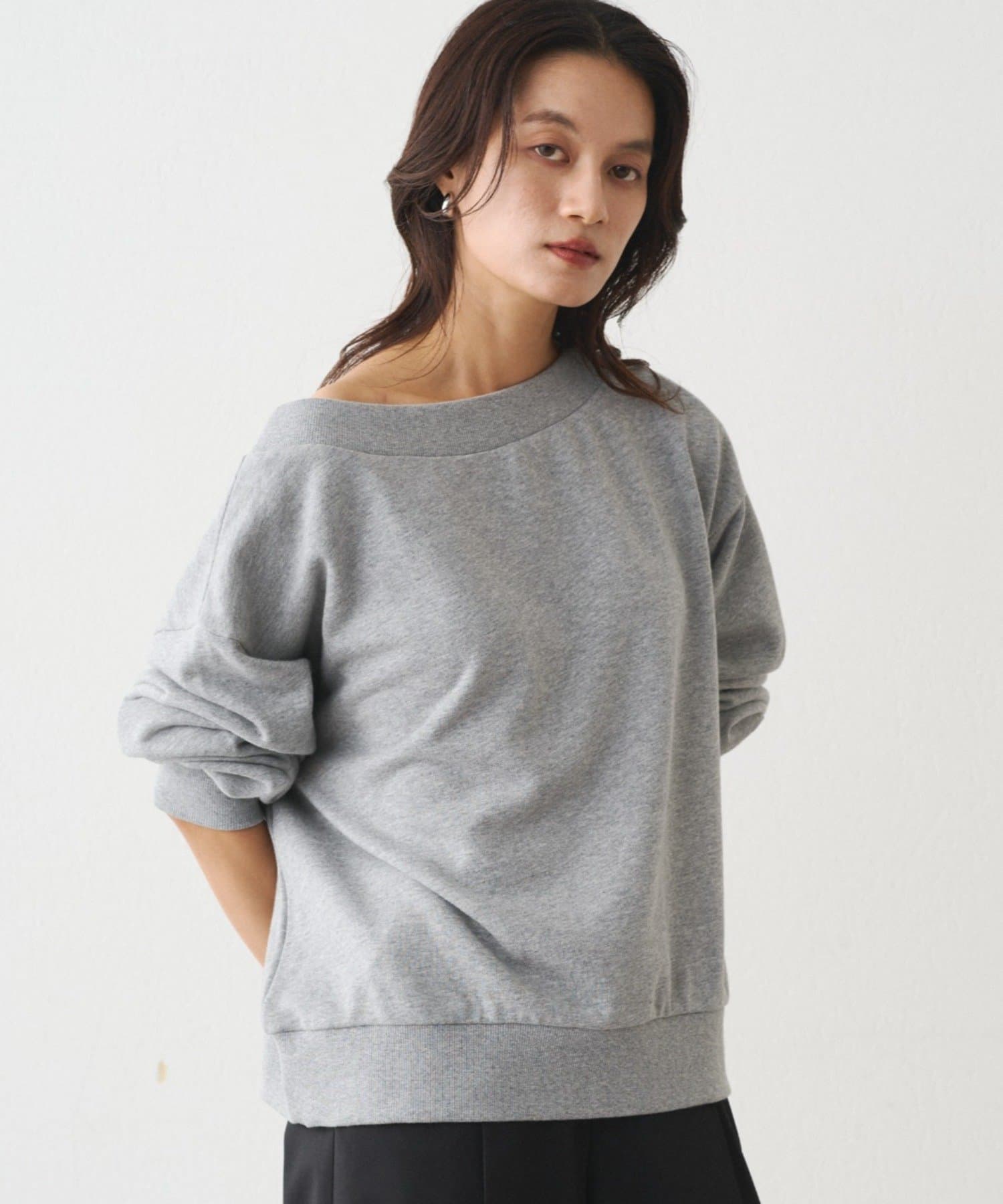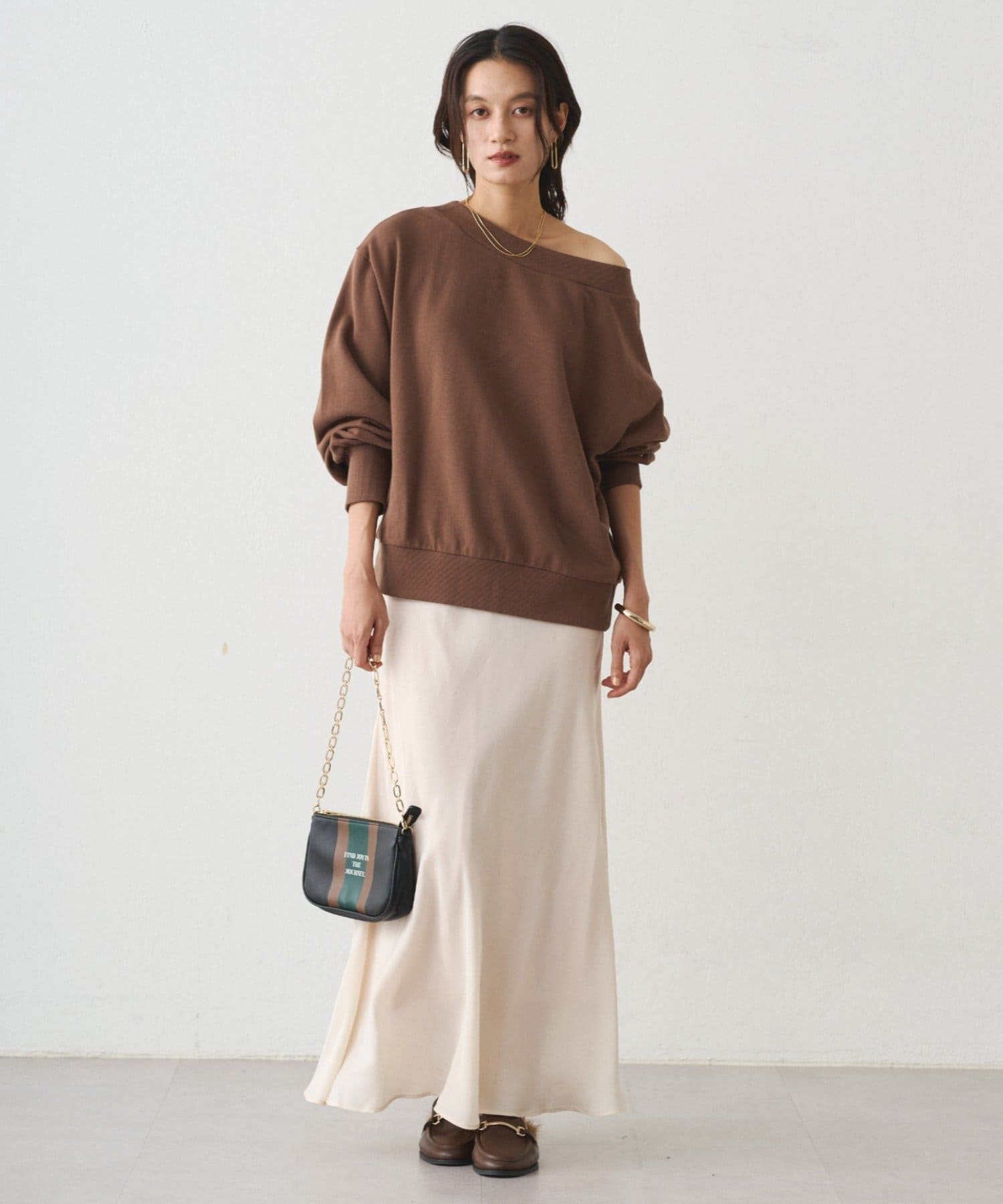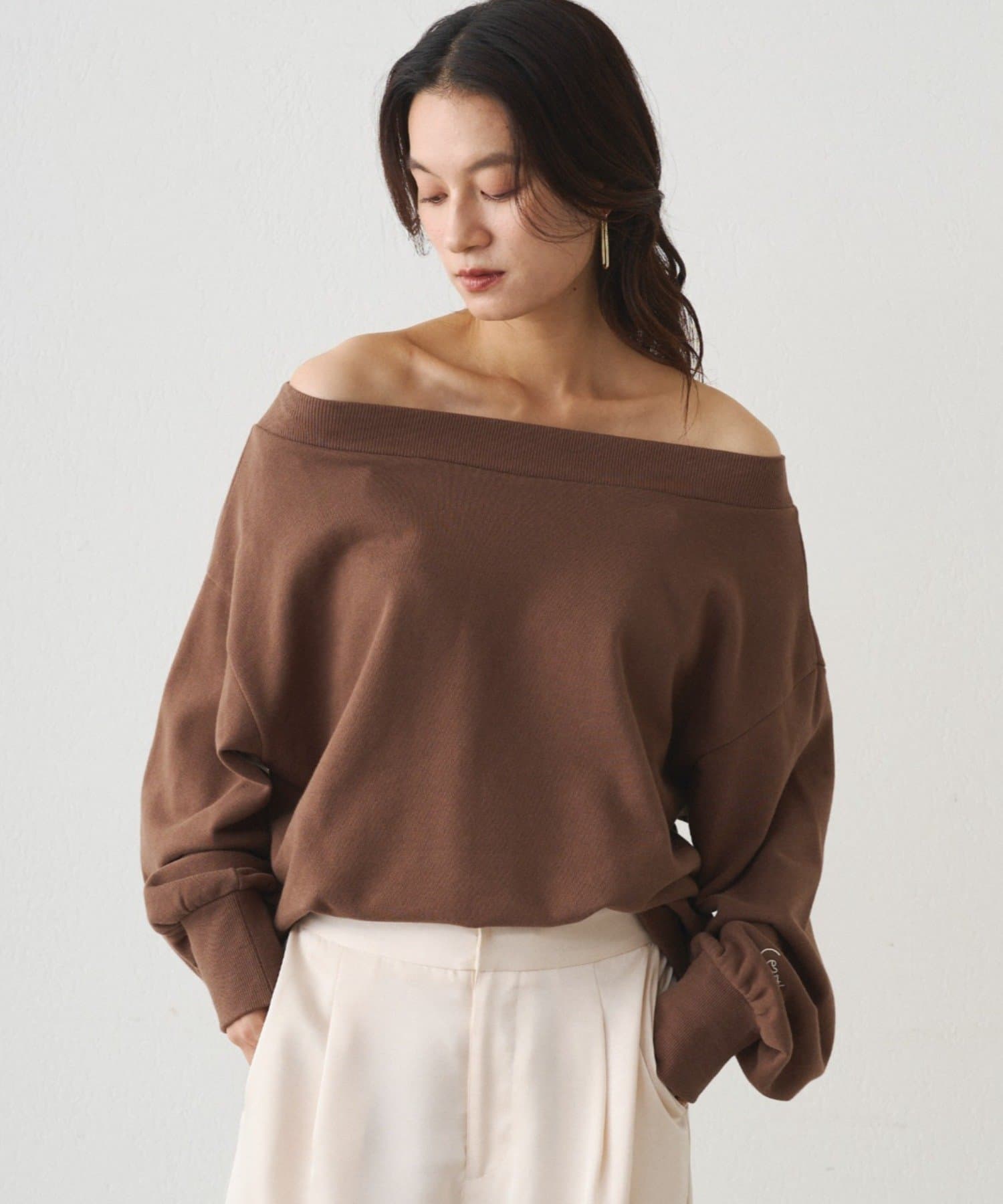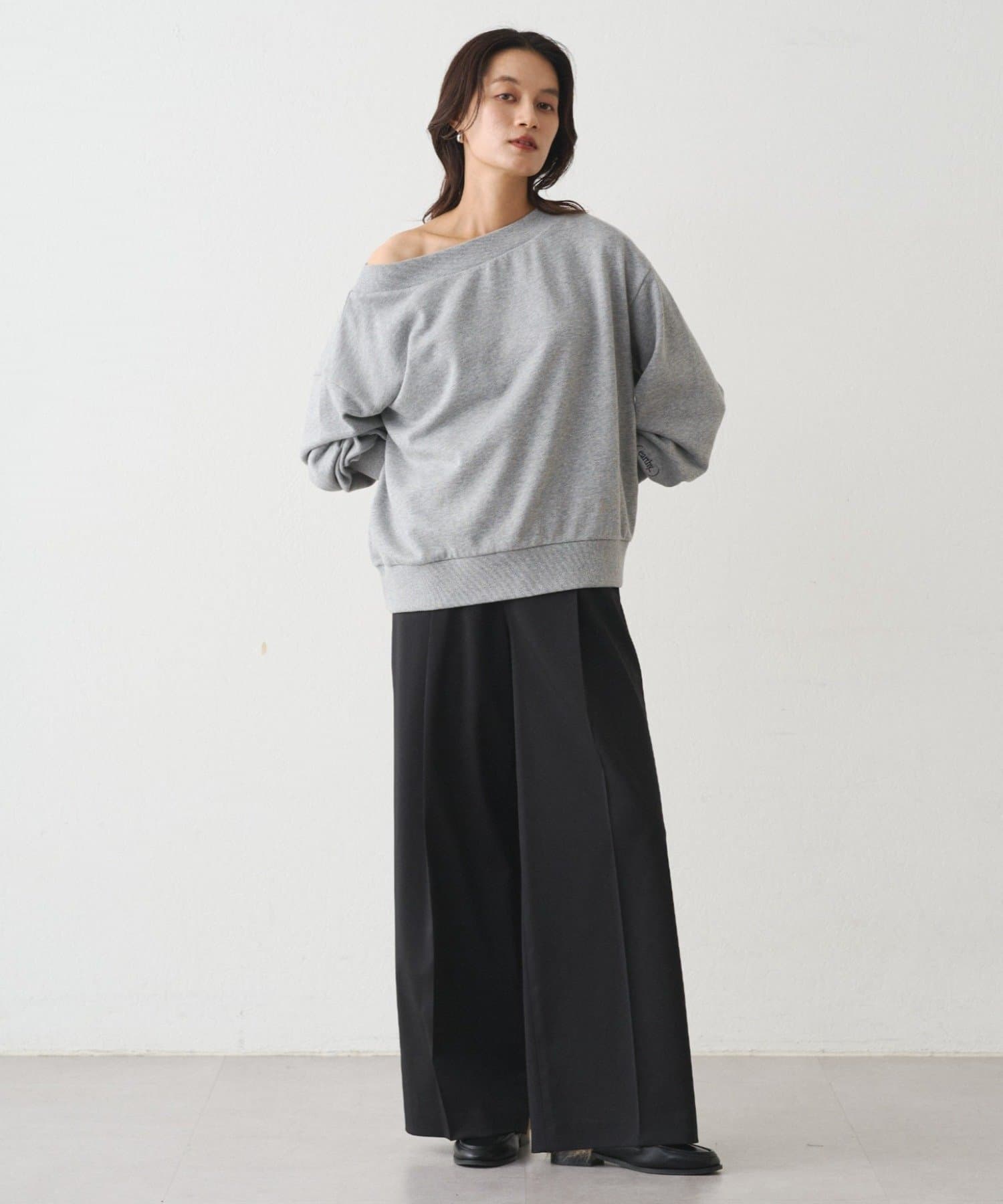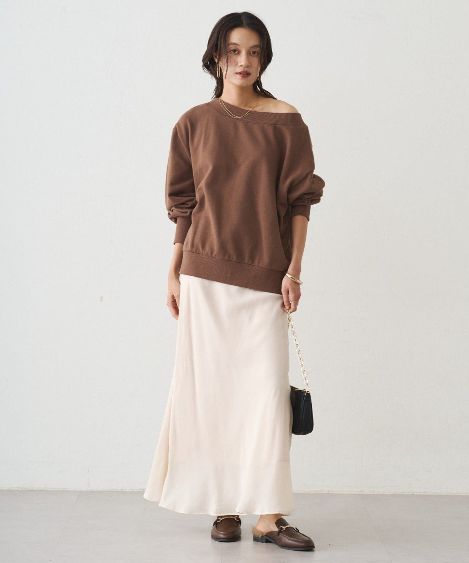 ・ラフな印象のスウェット素材を、大胆なオフショルダーに仕立てることで、抜け感のある大人の女性らしさを演出。