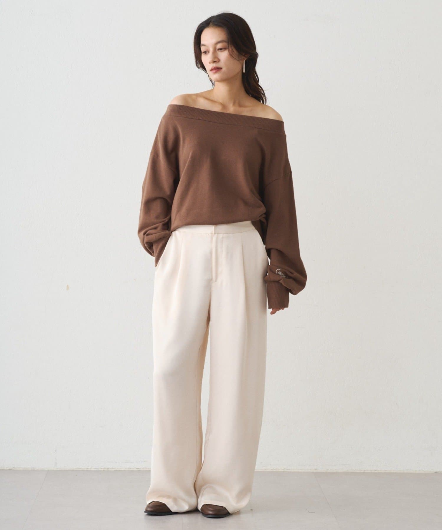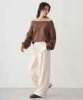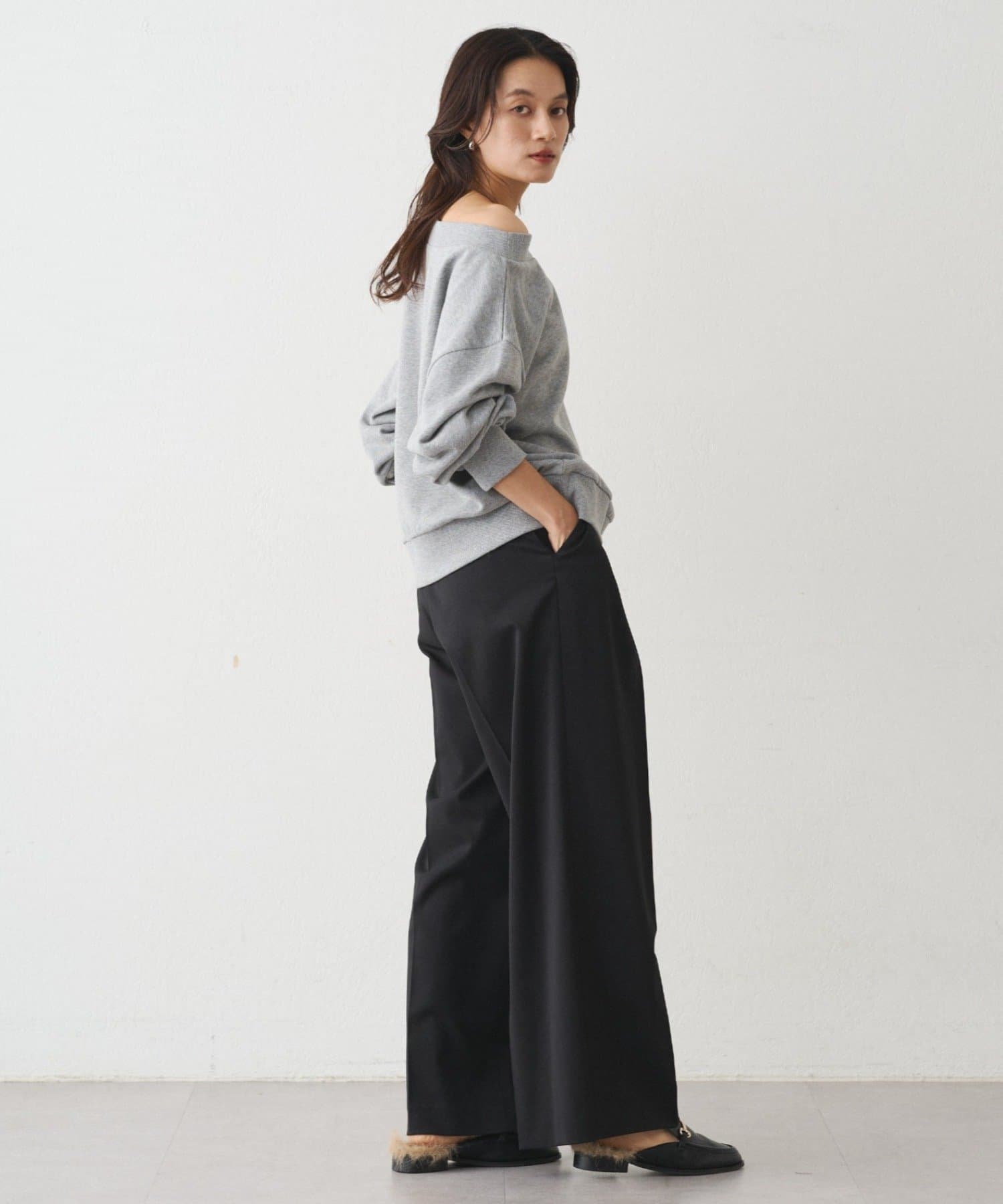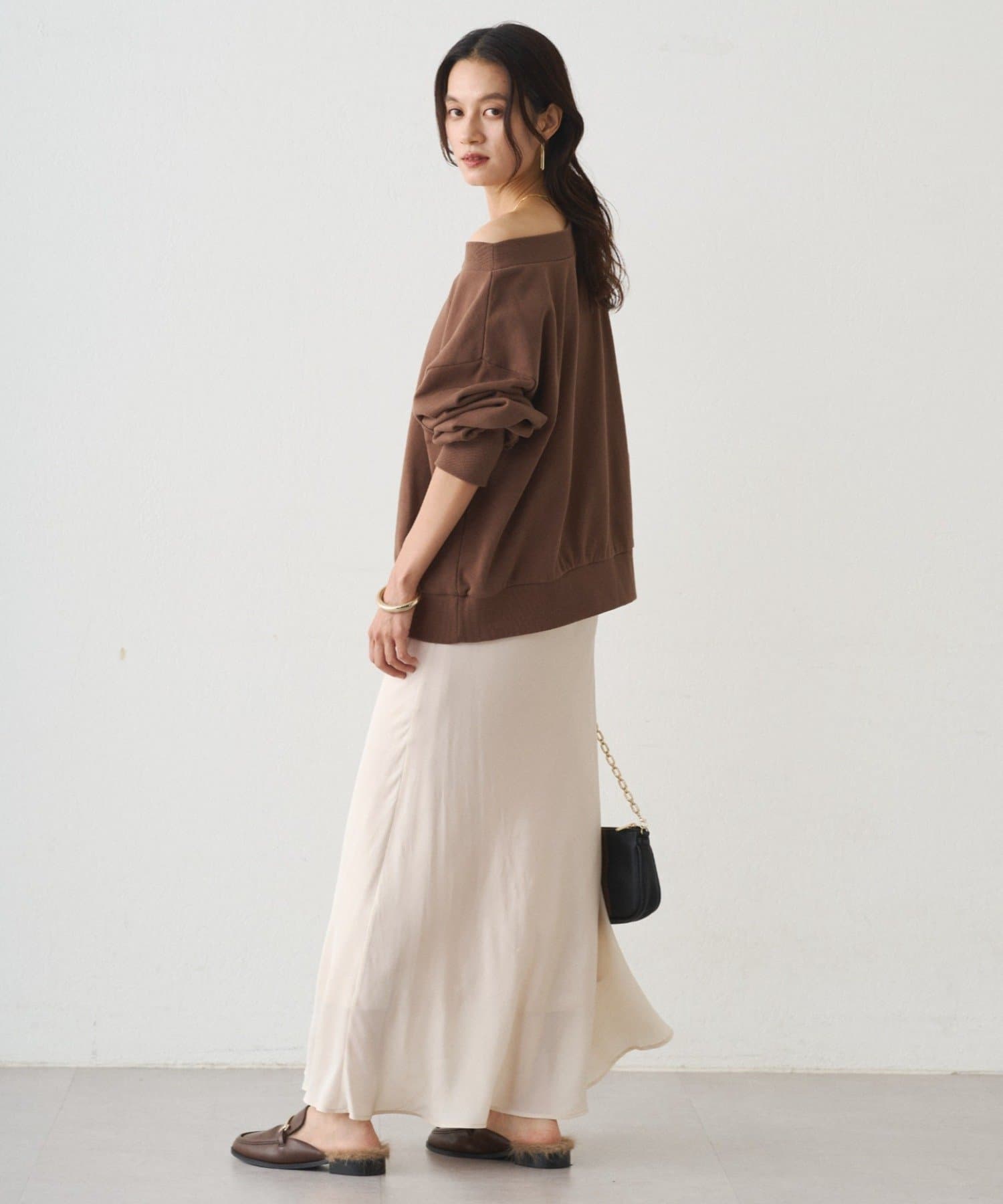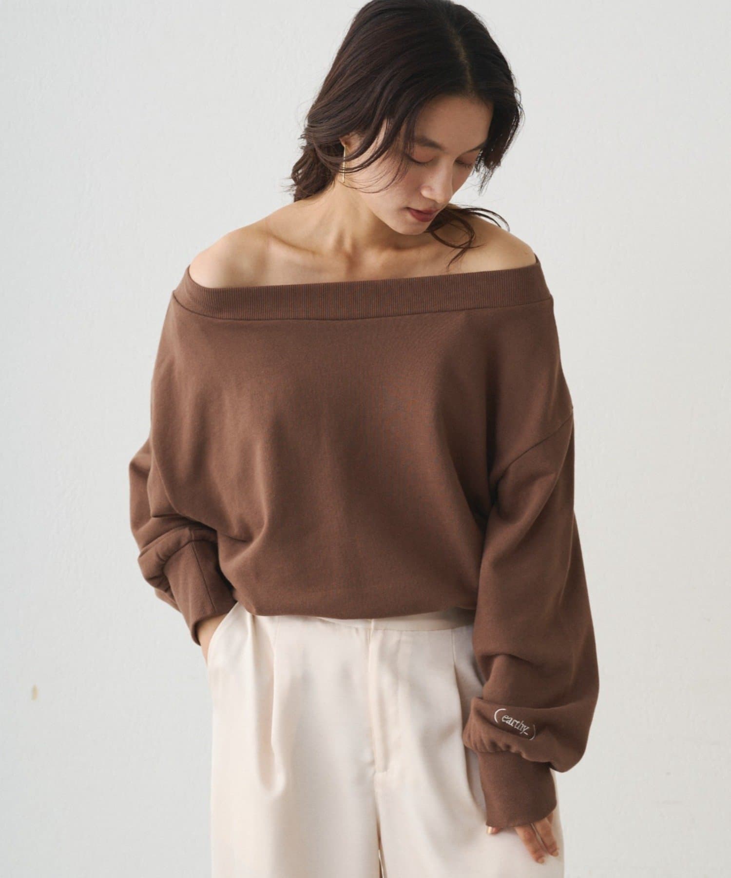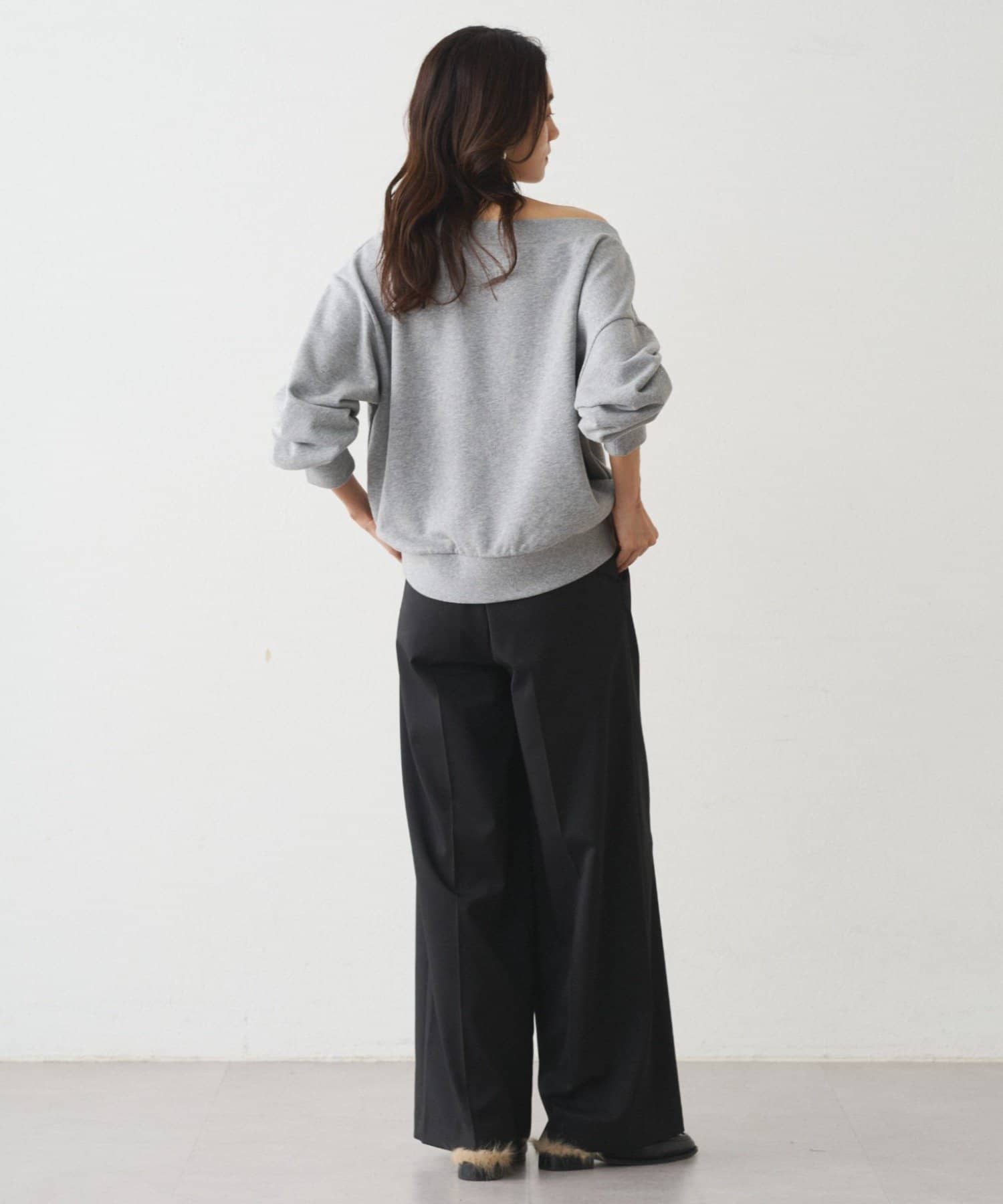 ・ラフな印象のスウェット素材を、大胆なオフショルダーに仕立てることで、抜け感のある大人の女性らしさを演出。