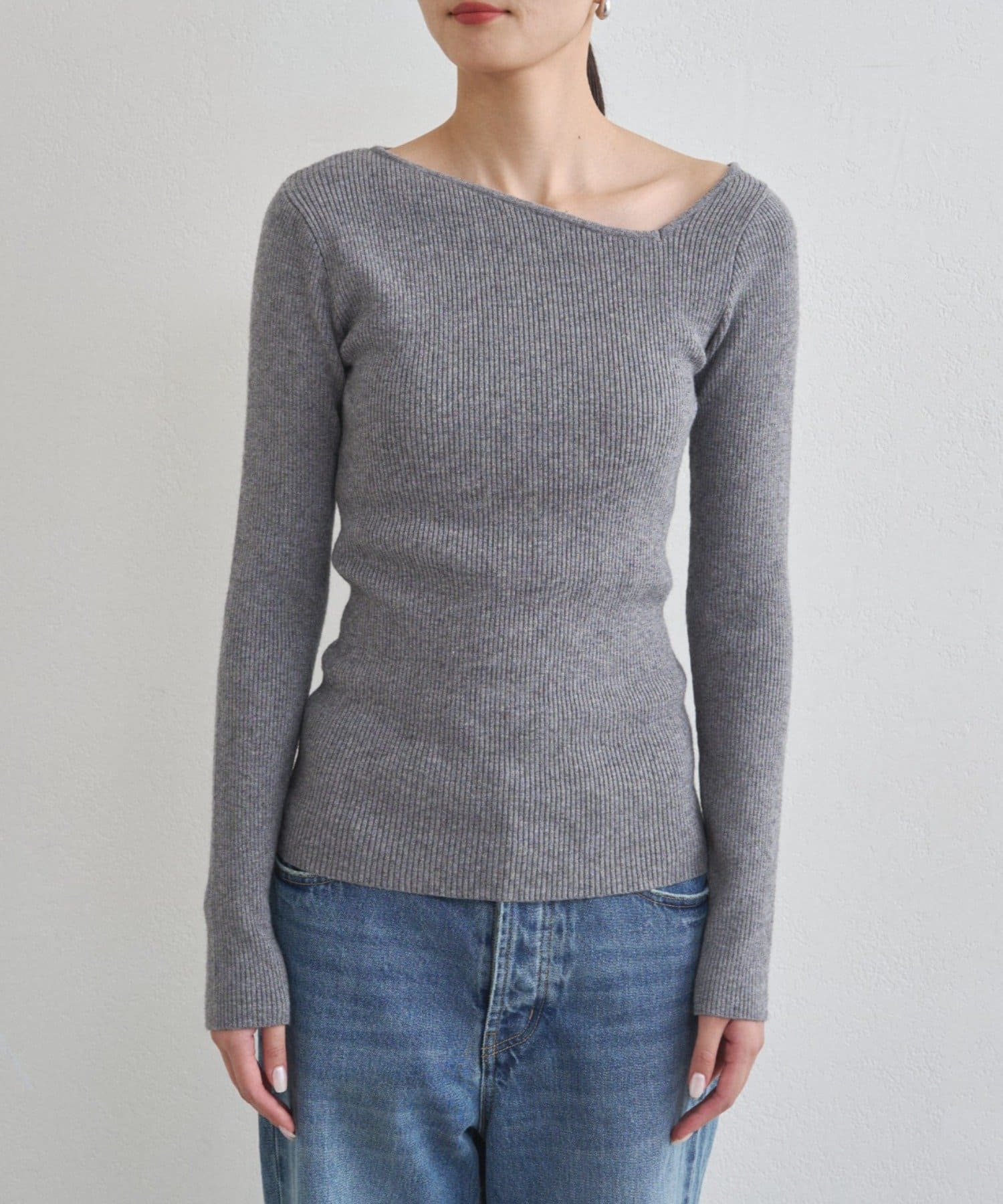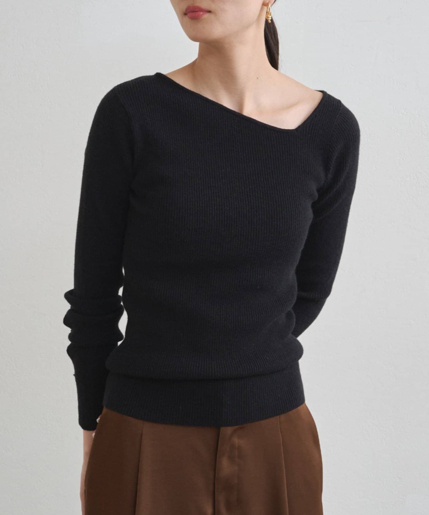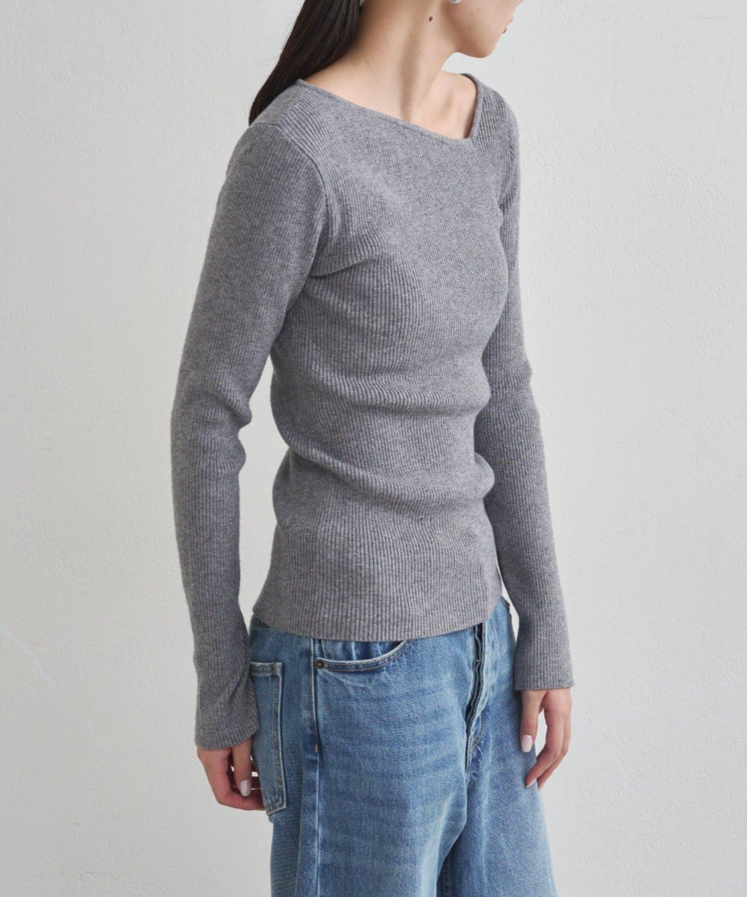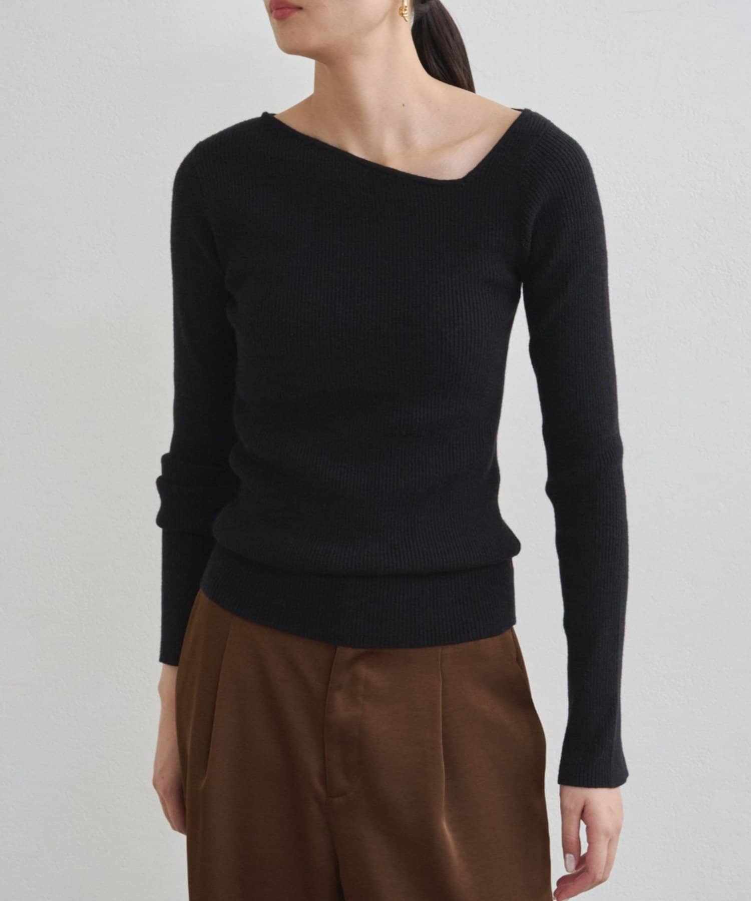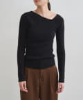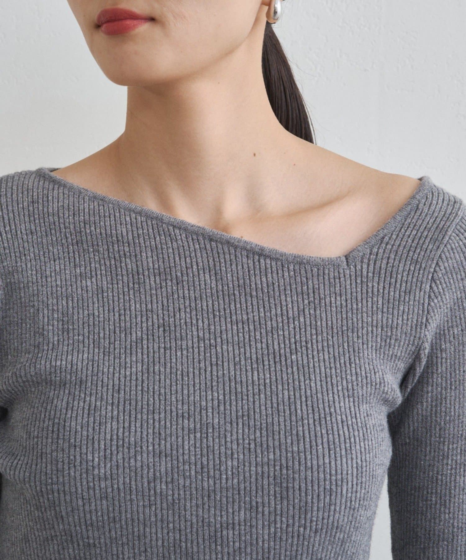 目を惹く首元アシンメトリーデザイン、リブアシメニット