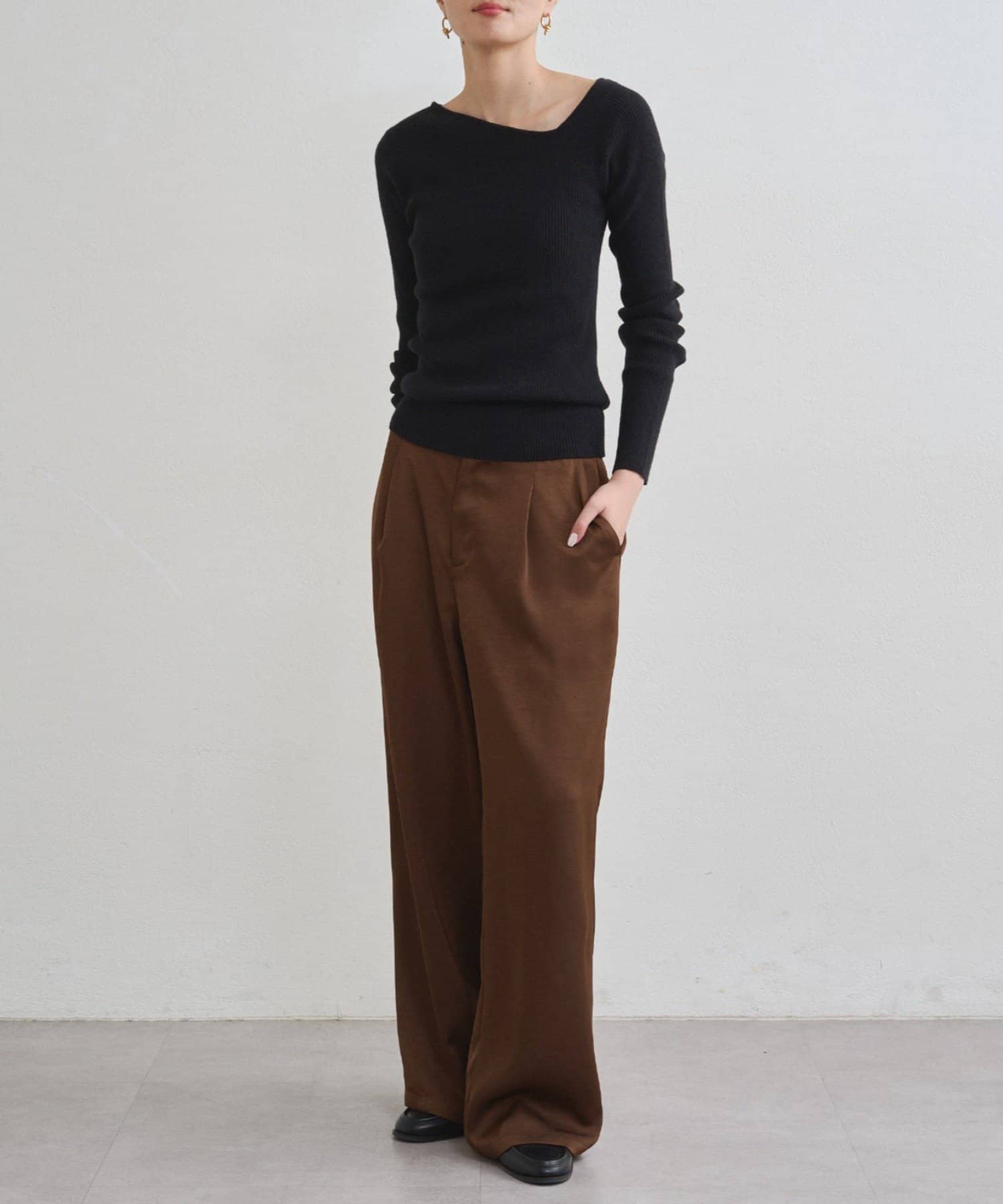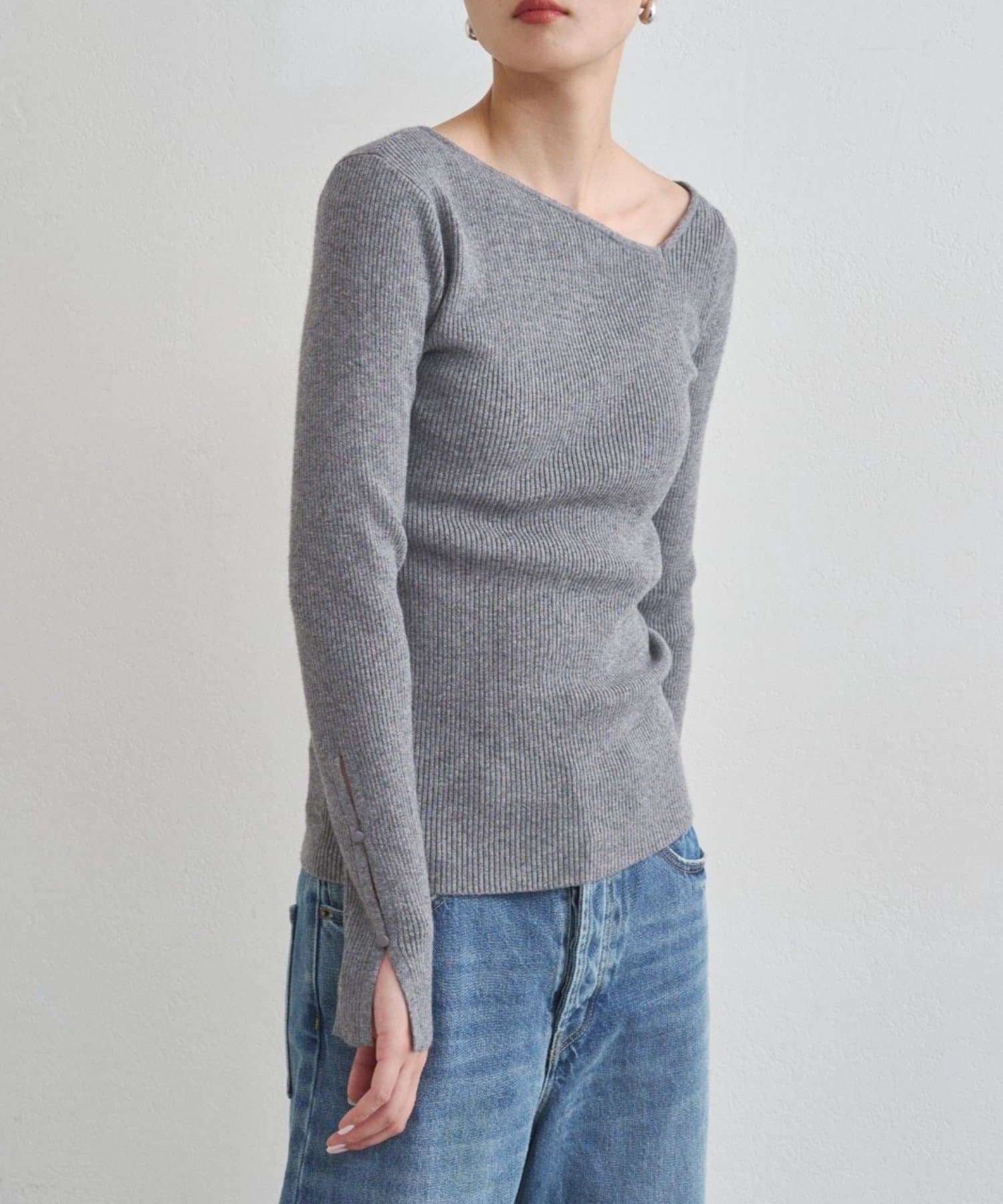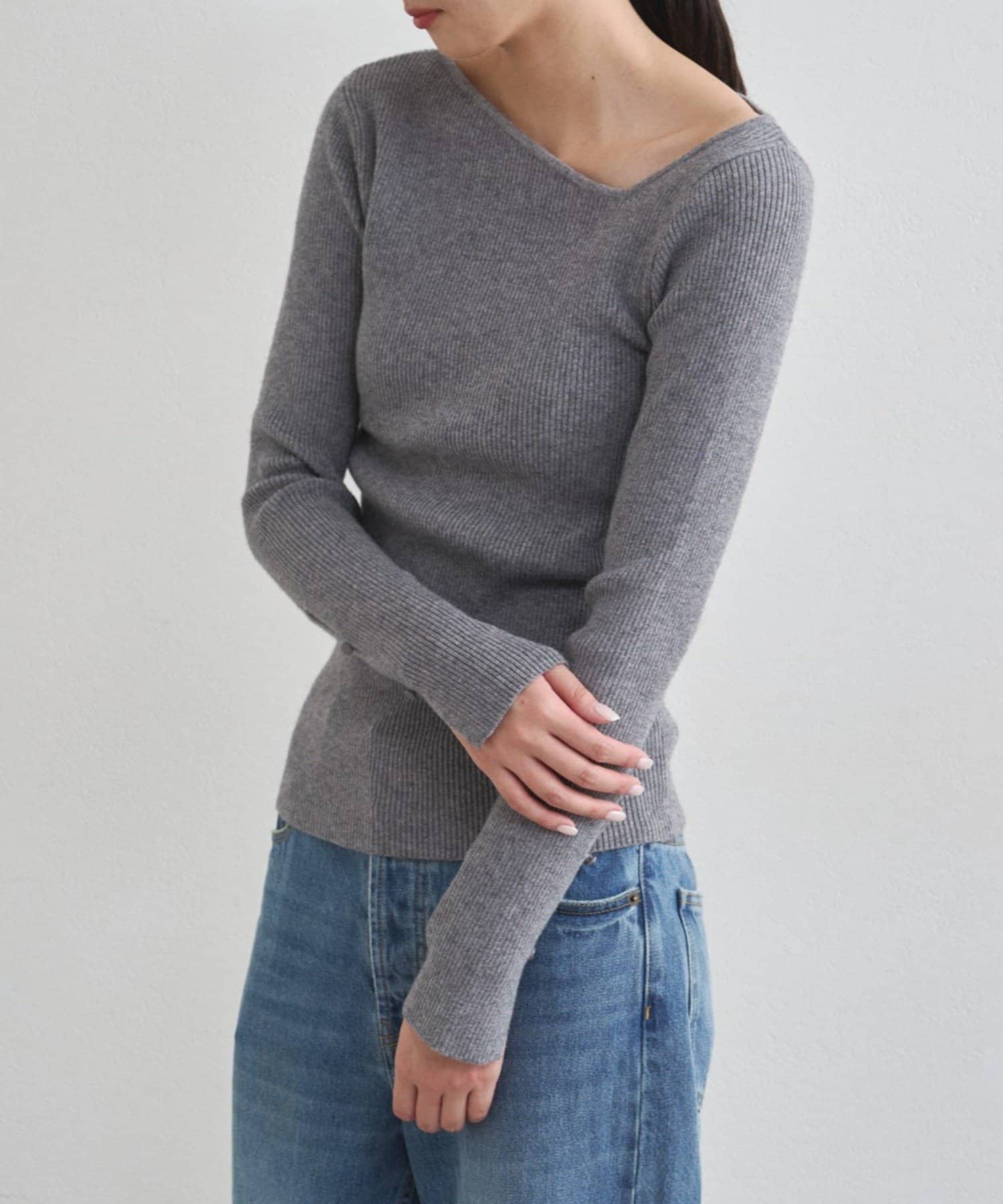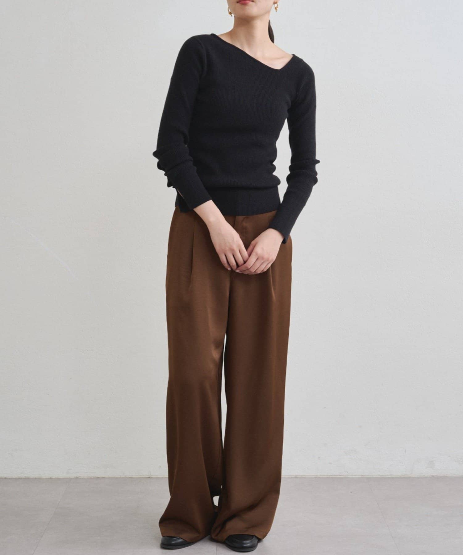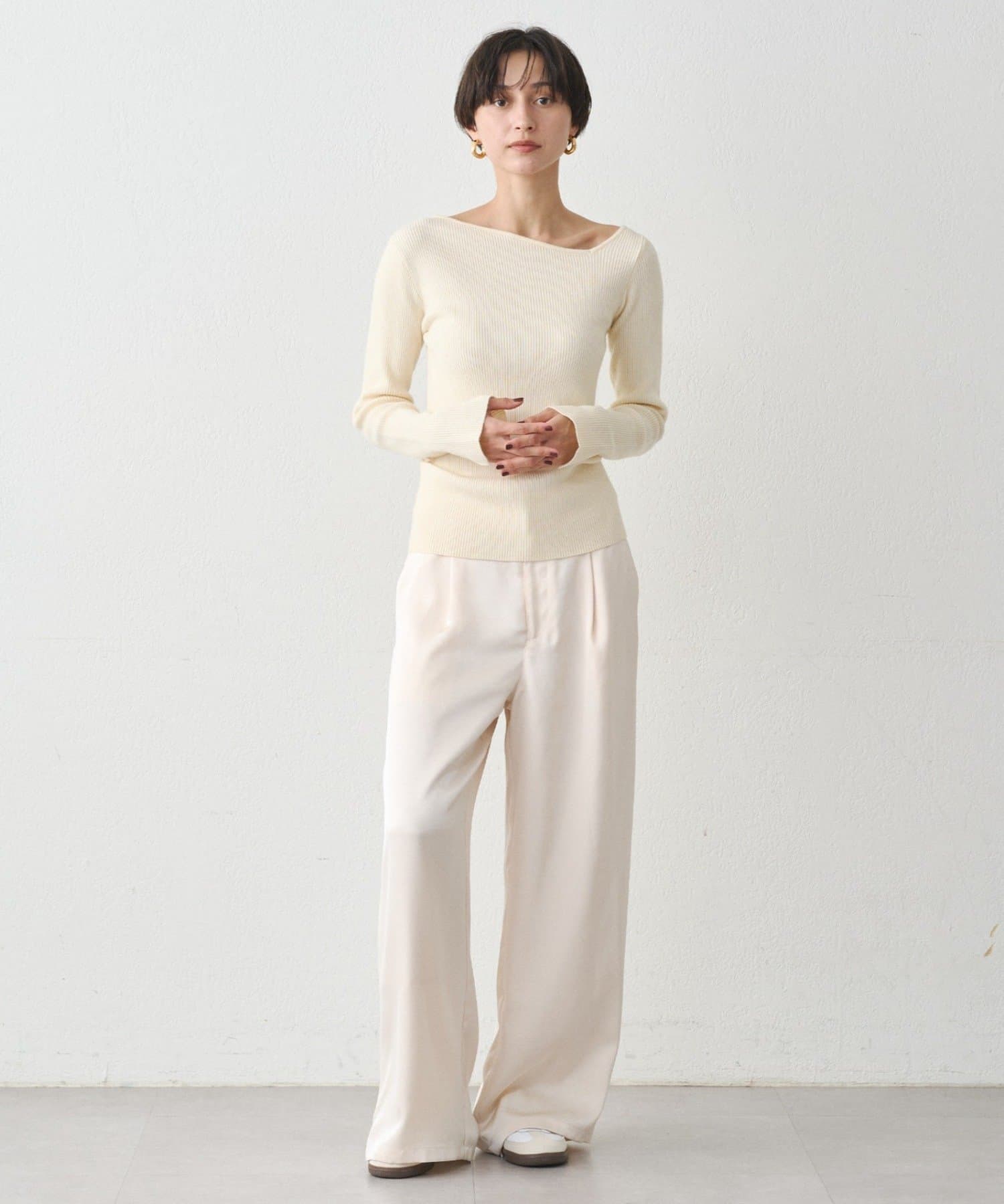 目を惹く首元アシンメトリーデザイン、リブアシメニット