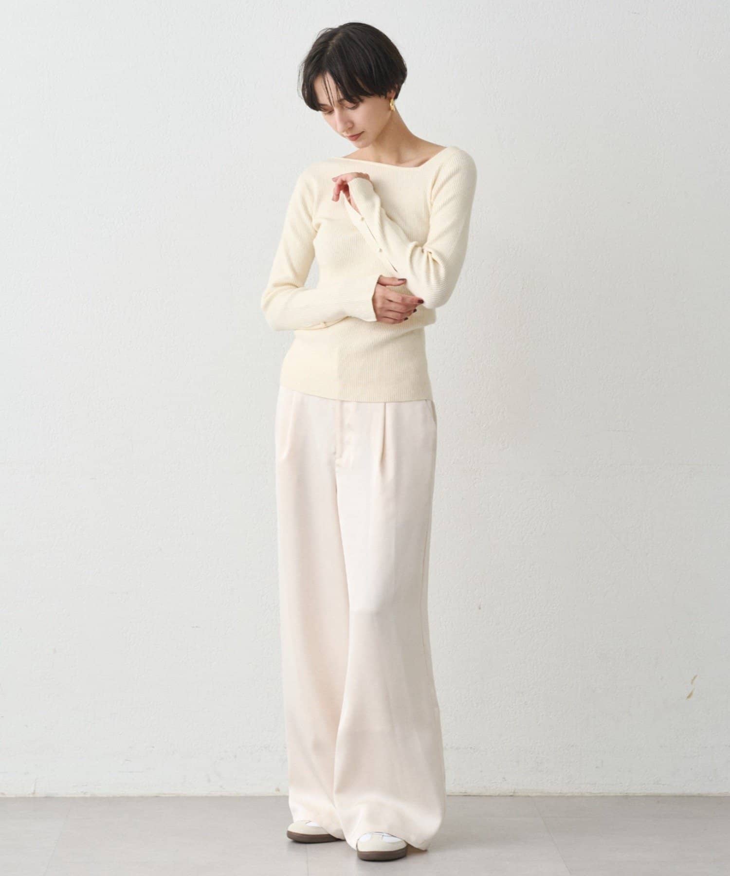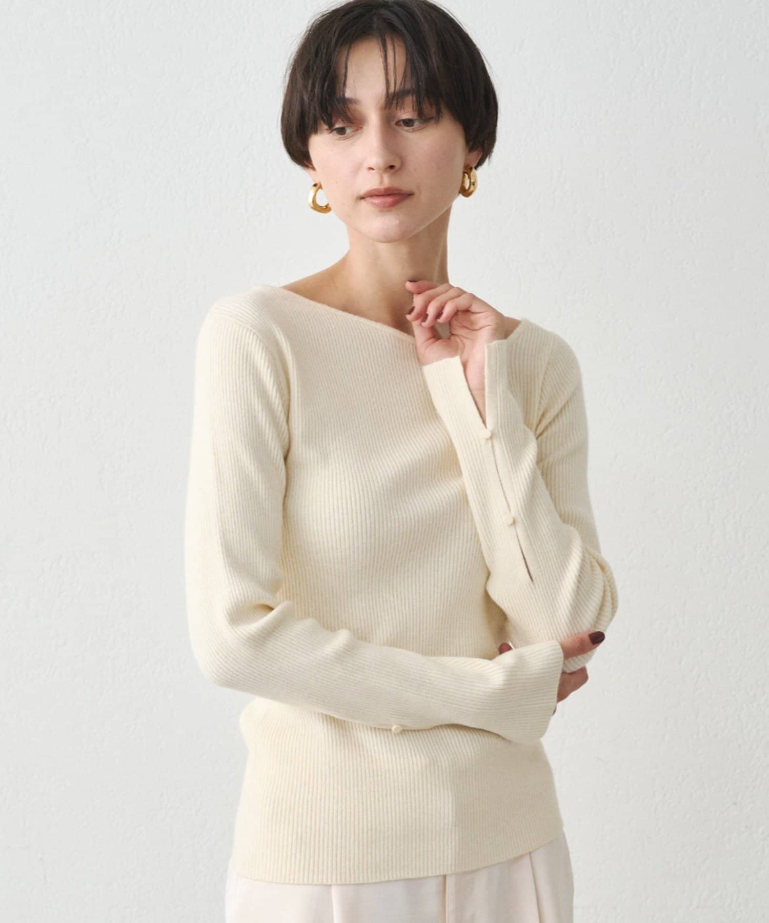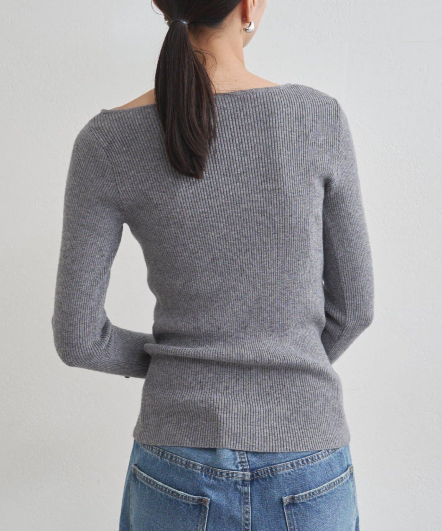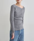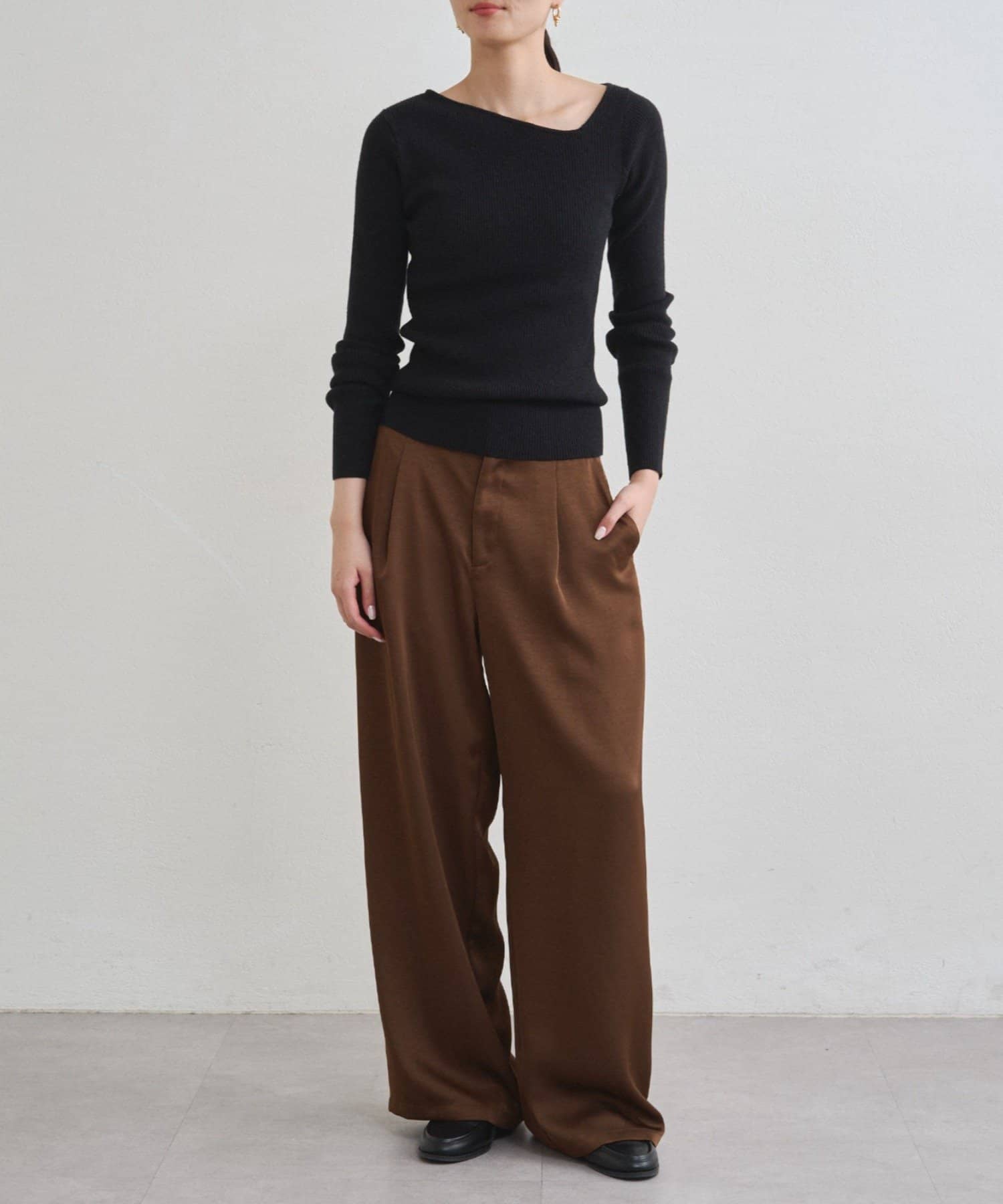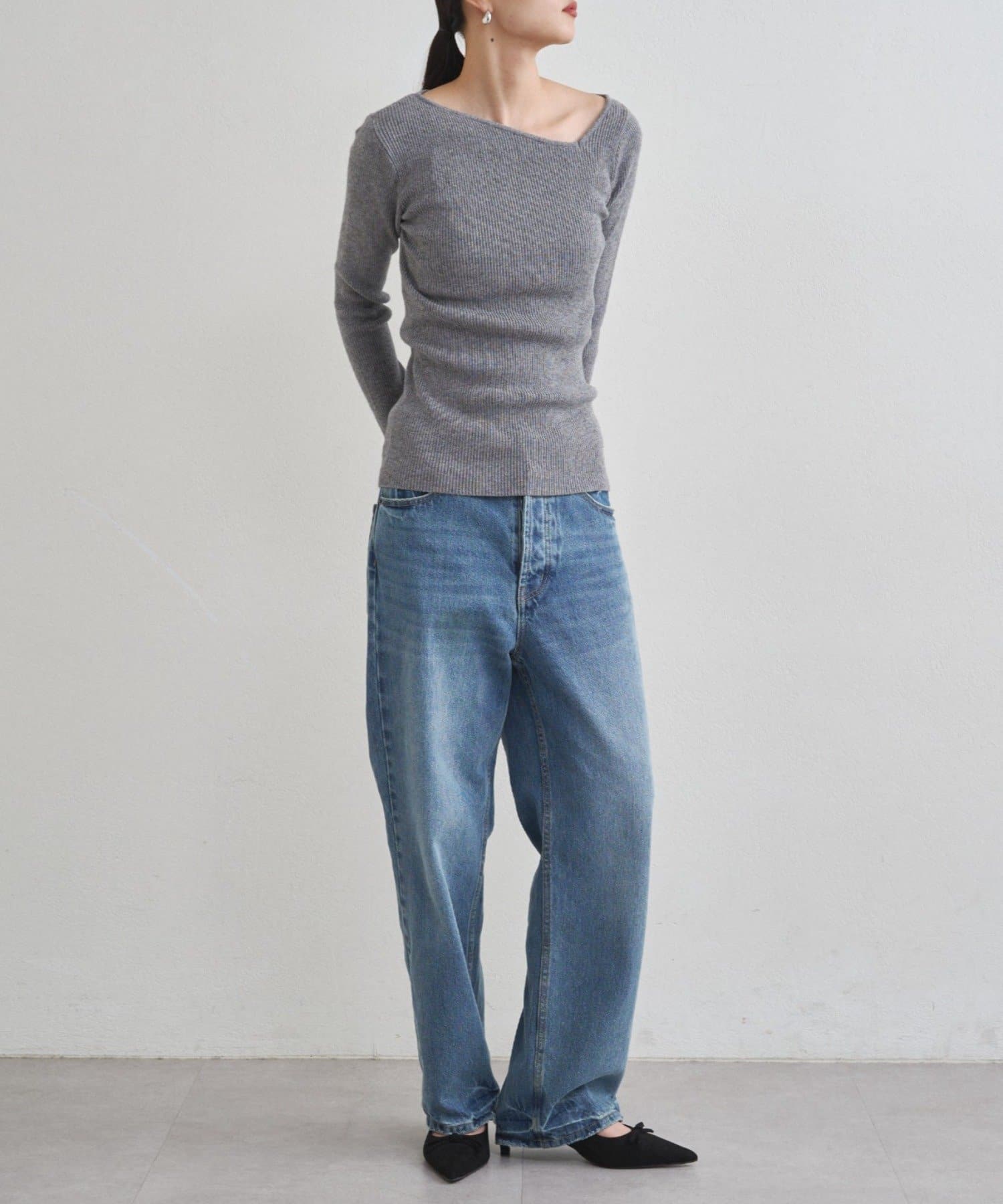 目を惹く首元アシンメトリーデザイン、リブアシメニット