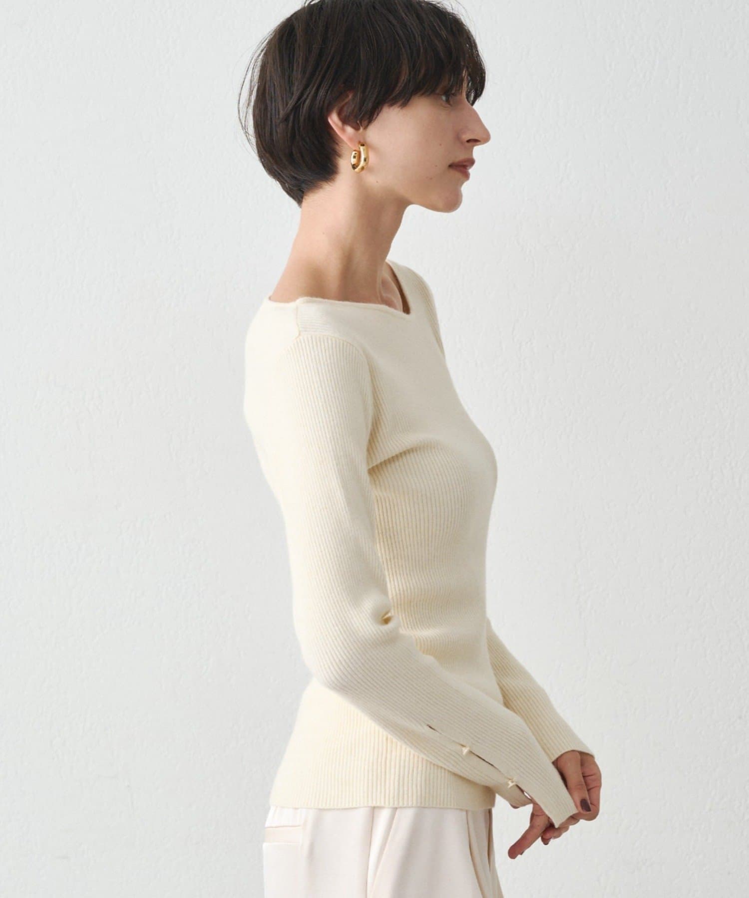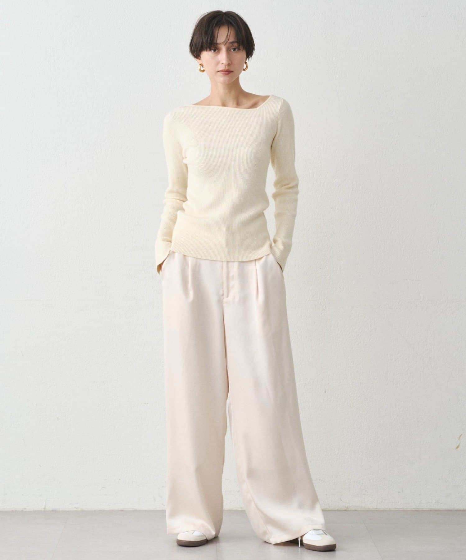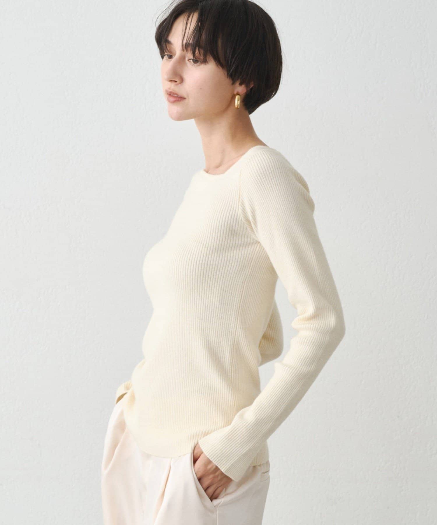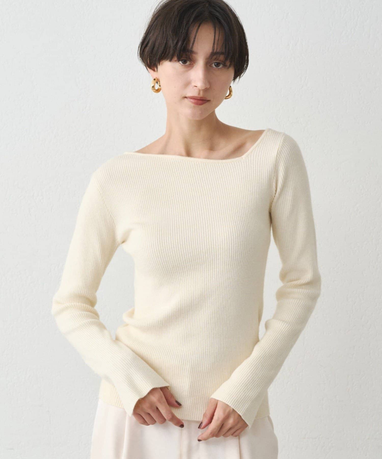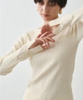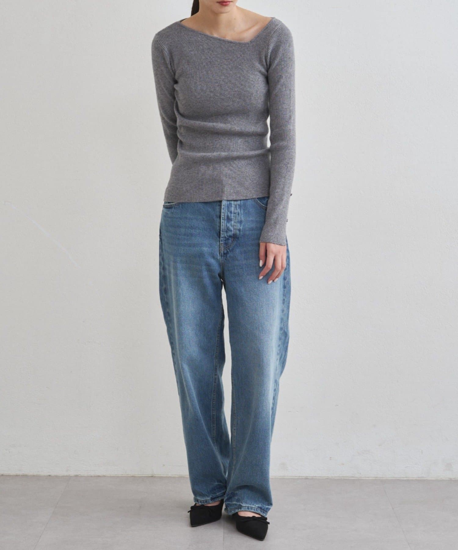 目を惹く首元アシンメトリーデザイン、リブアシメニット